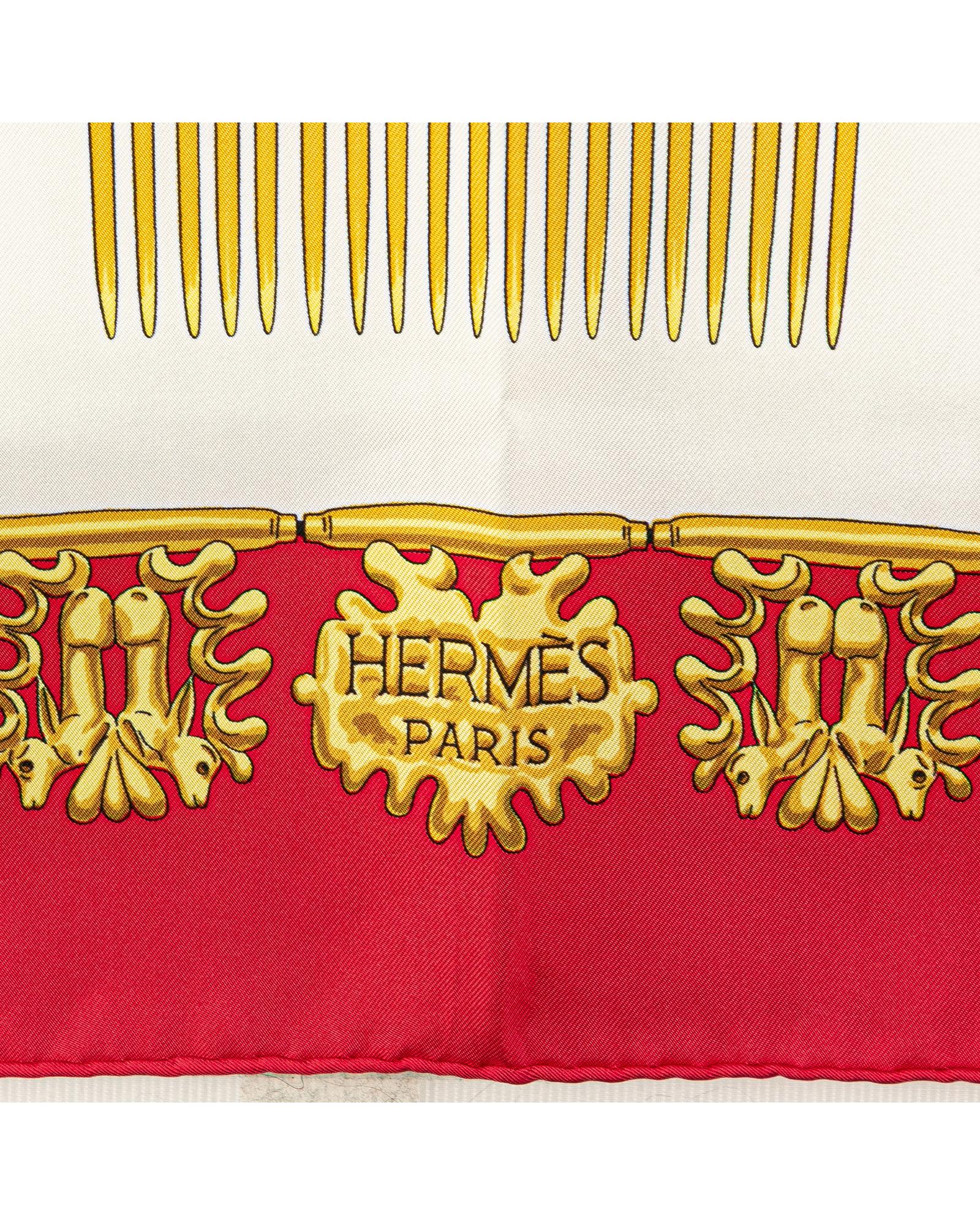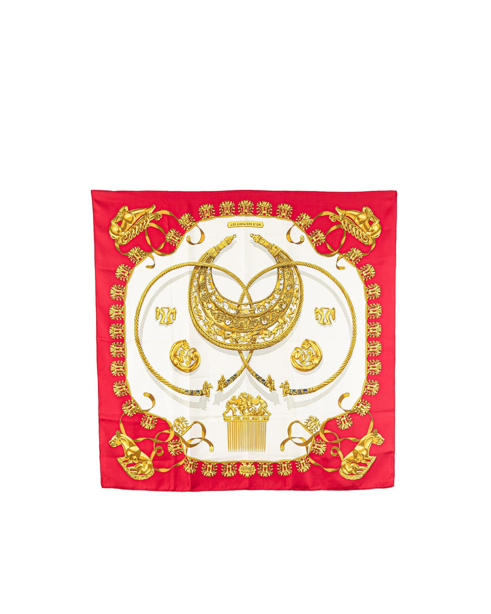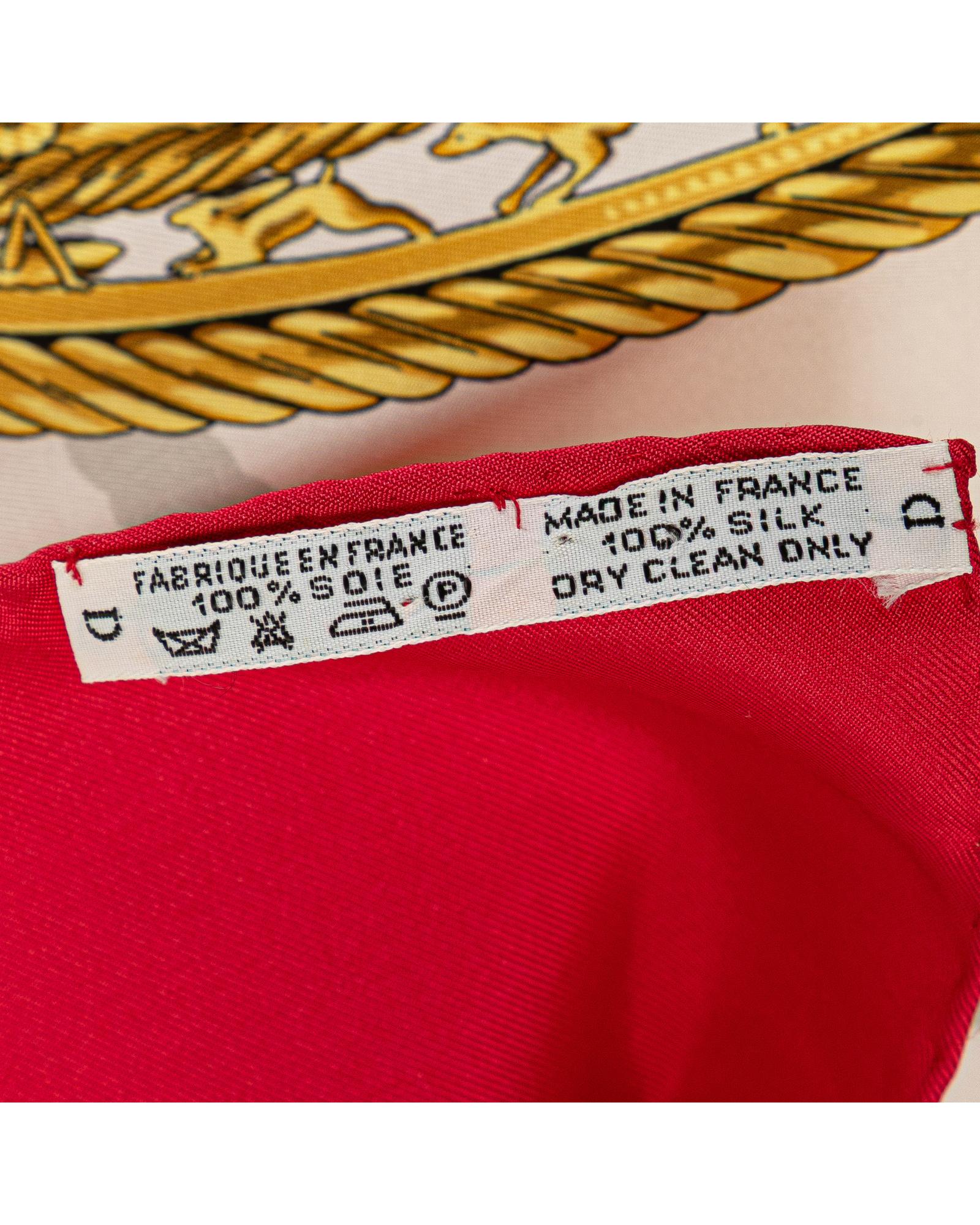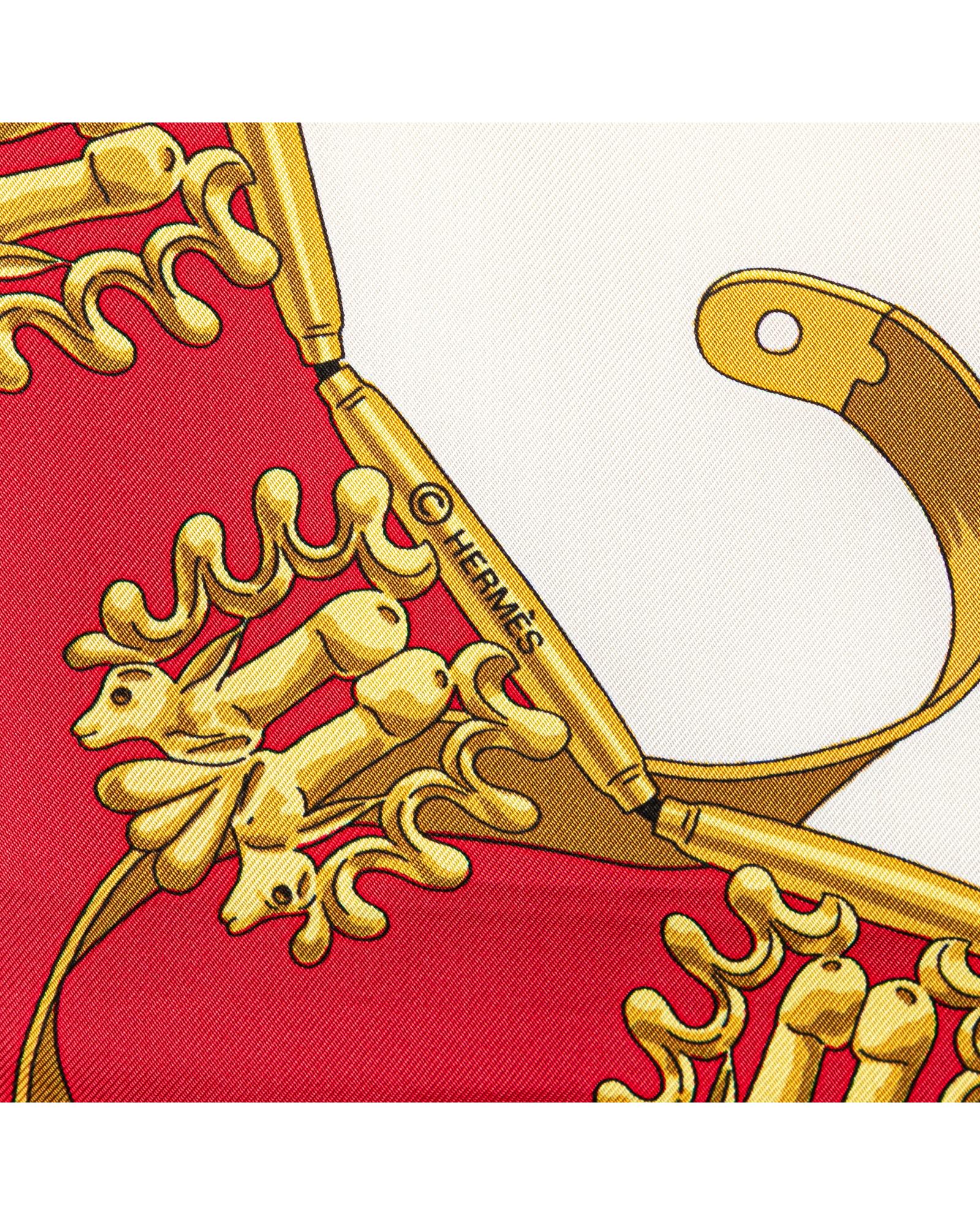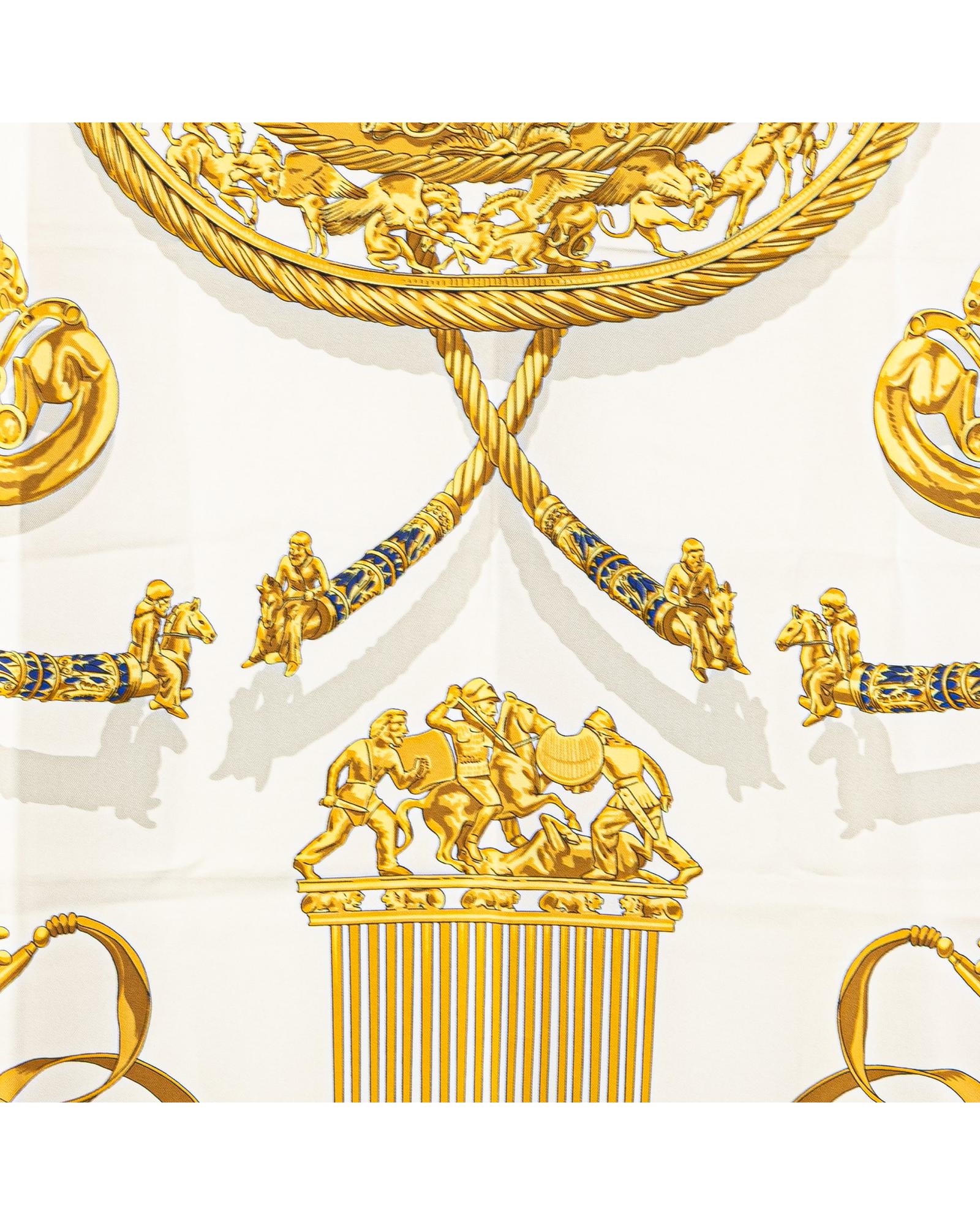 The Les Cavalier d'Or scarf features a print on 100% silk.