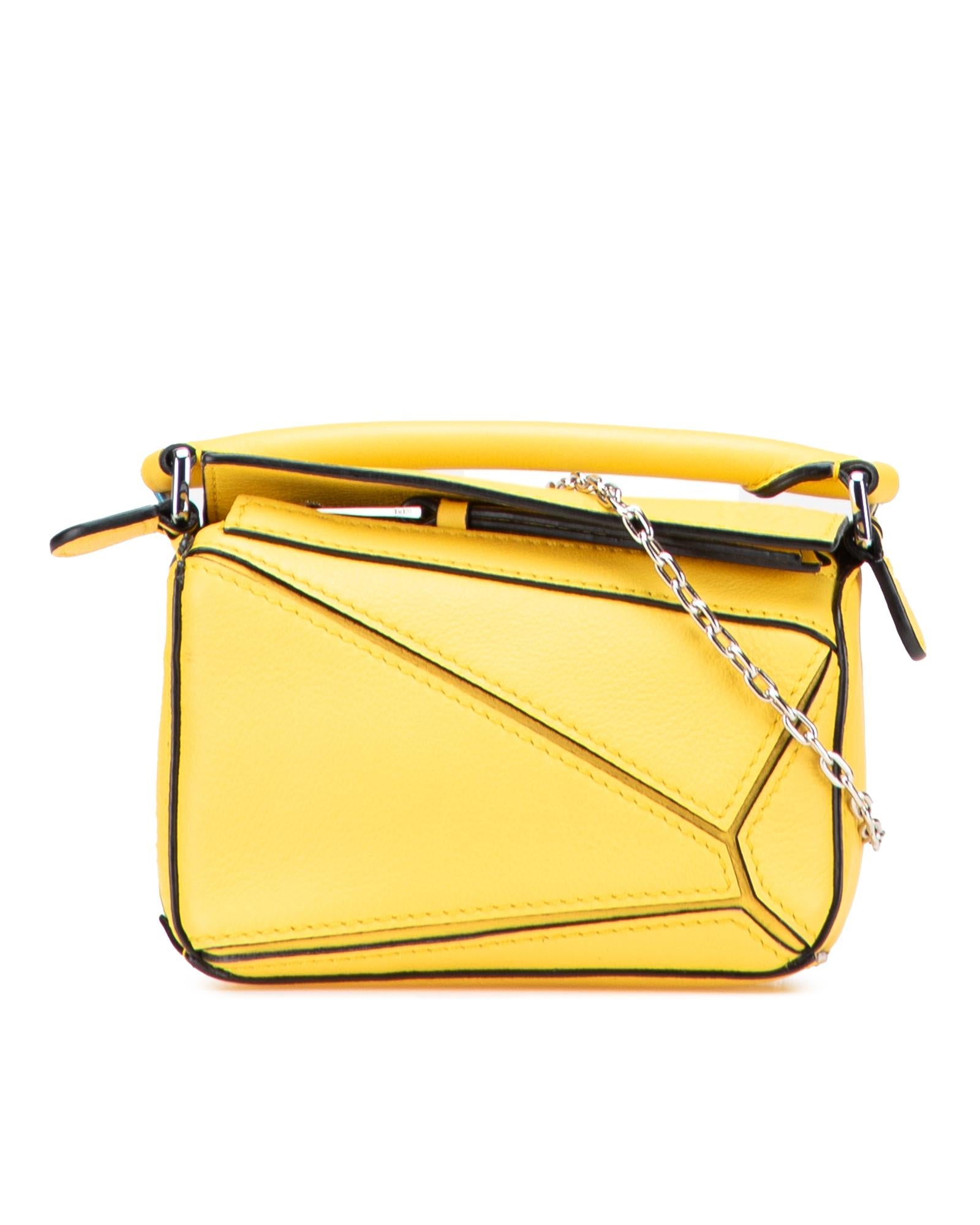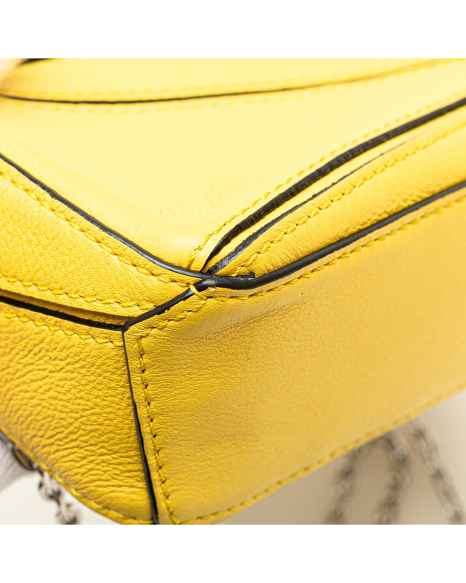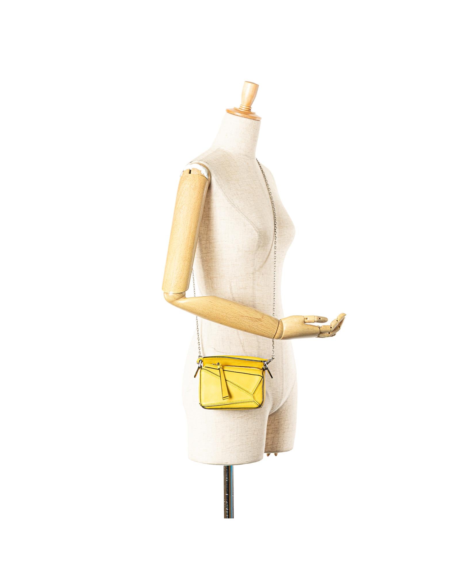 The Puzzle features a leather body a rolled leather top handle a detachable chain strap with leather guard and a top zip closure.