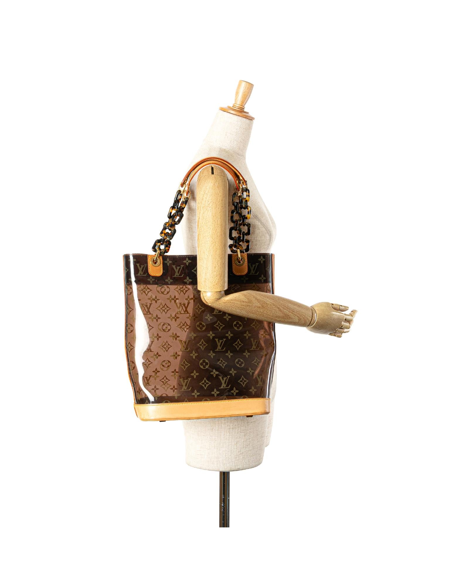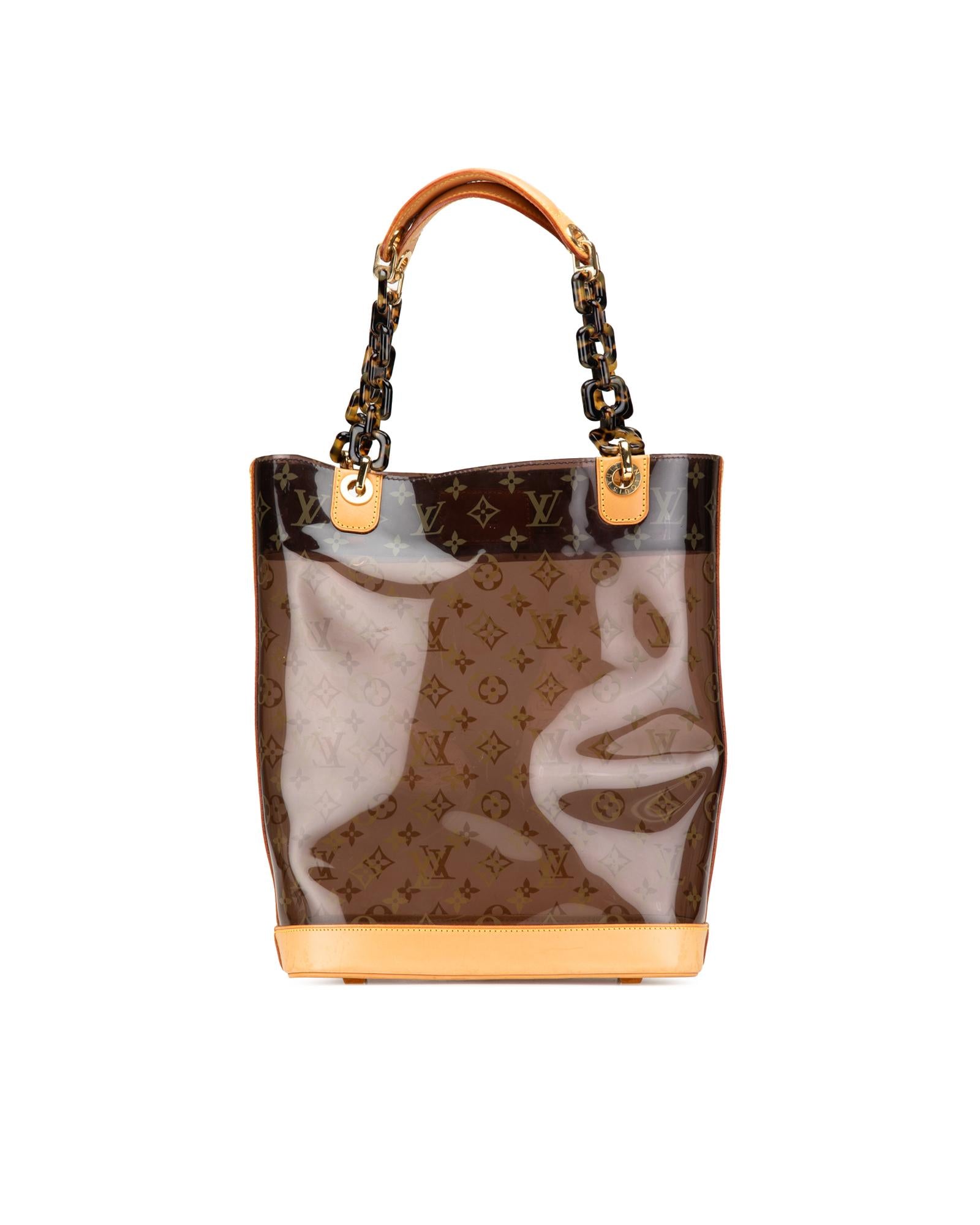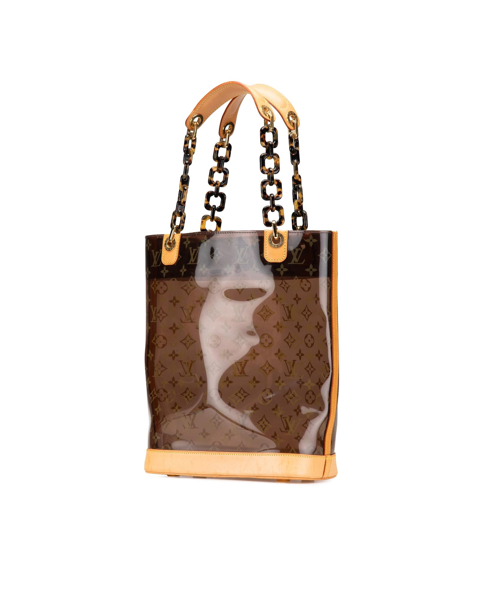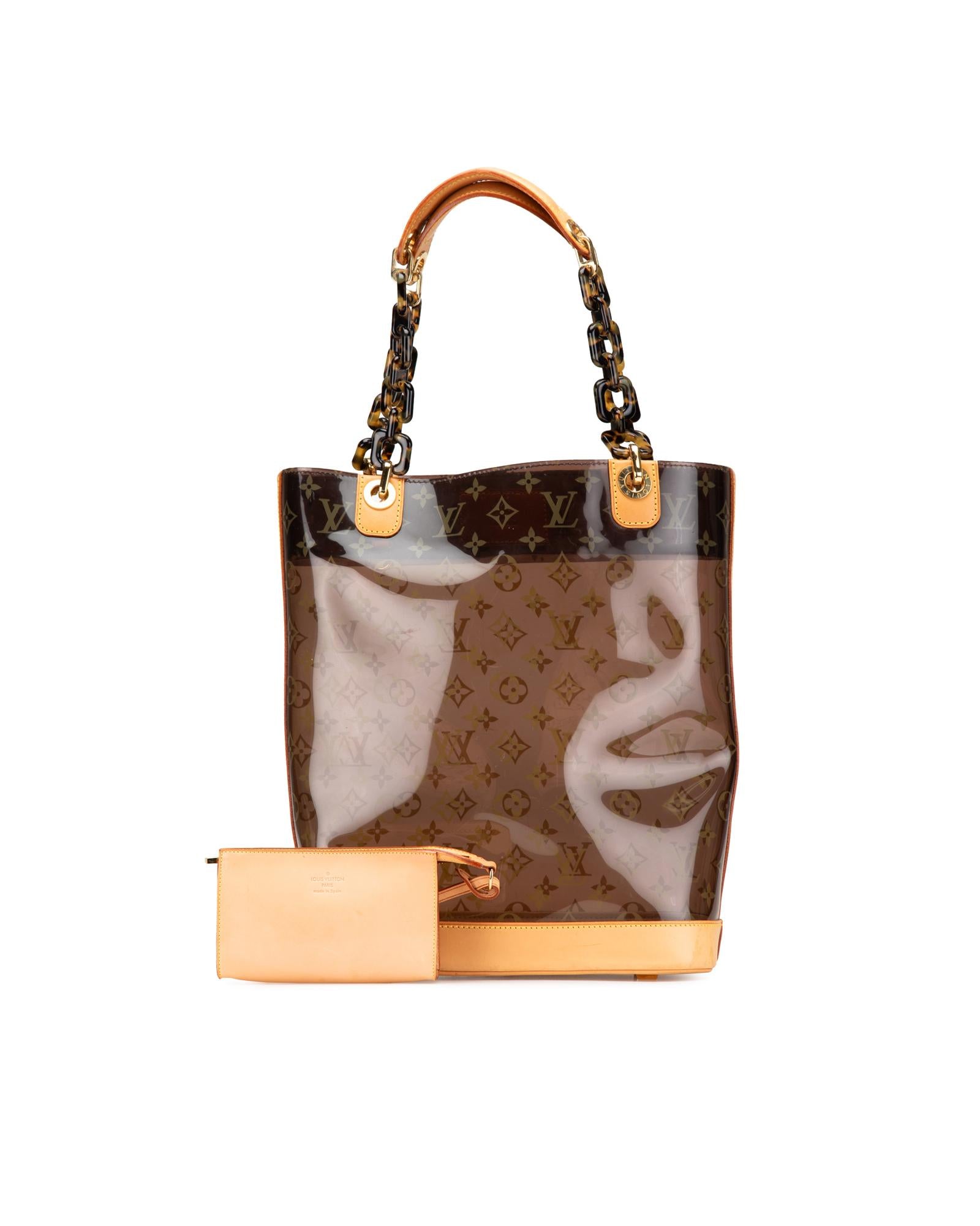 This tote bag features a clear PVC body with leather trim flat vachetta leather and tortoise shell handles an open top and a pouch inclusion.