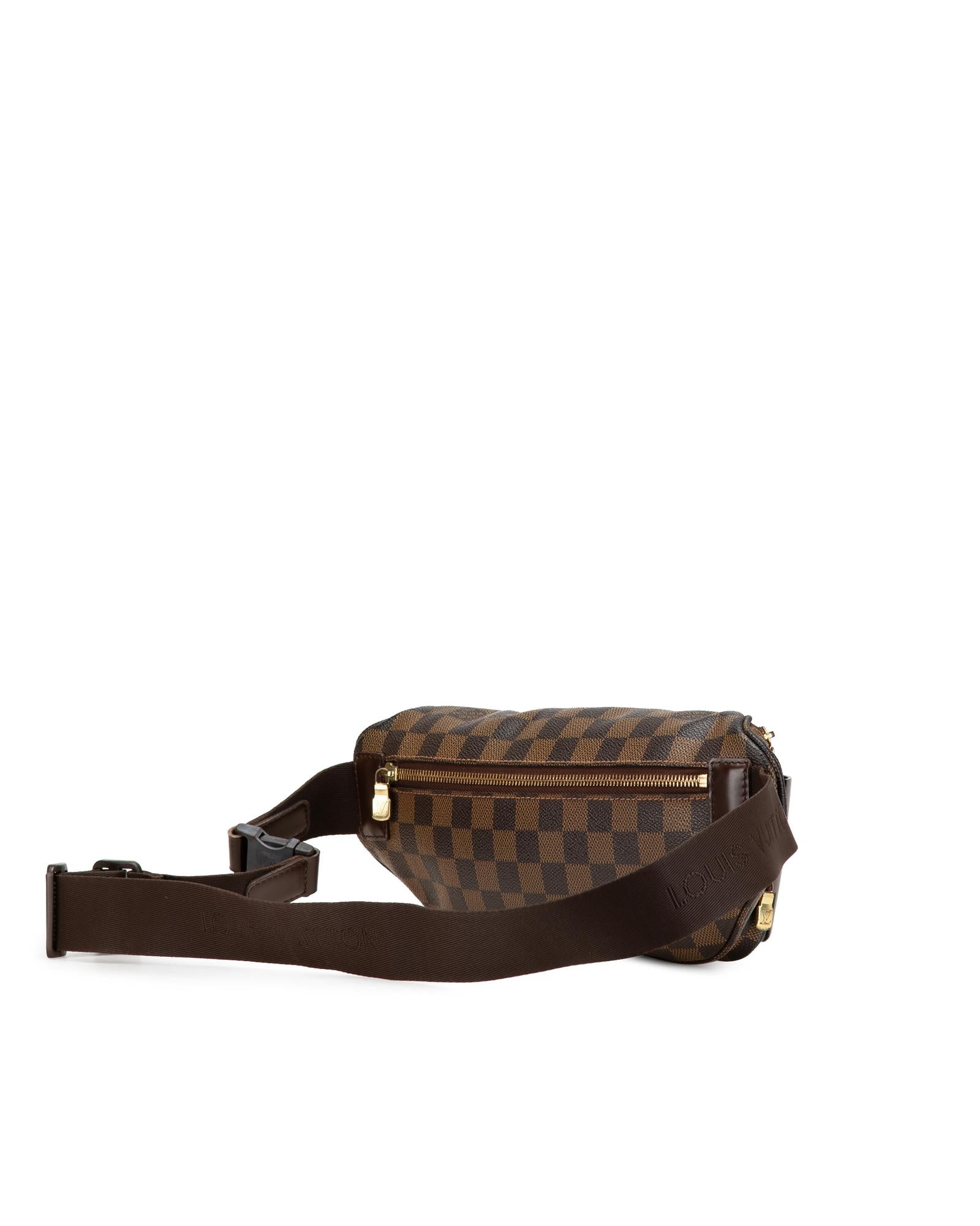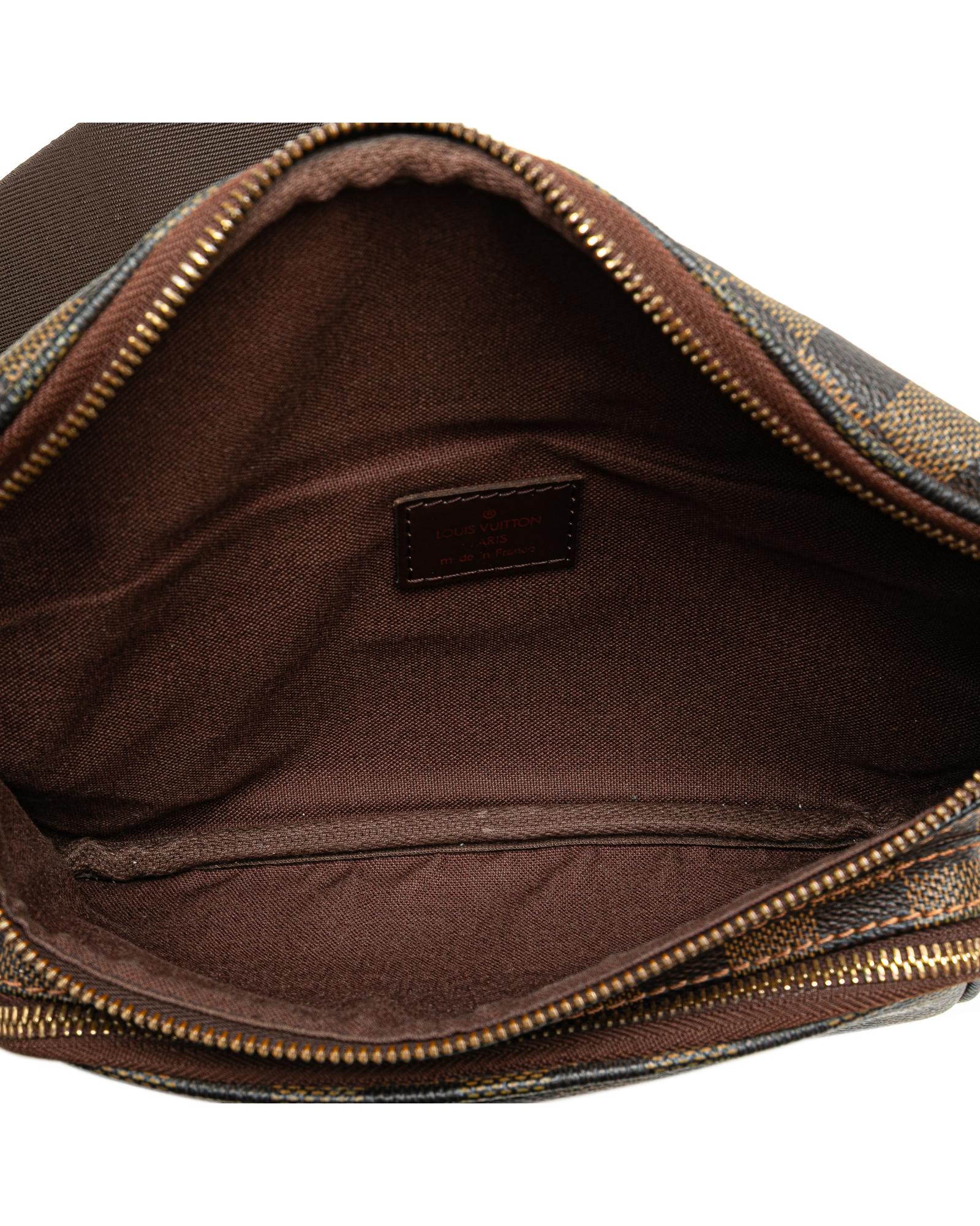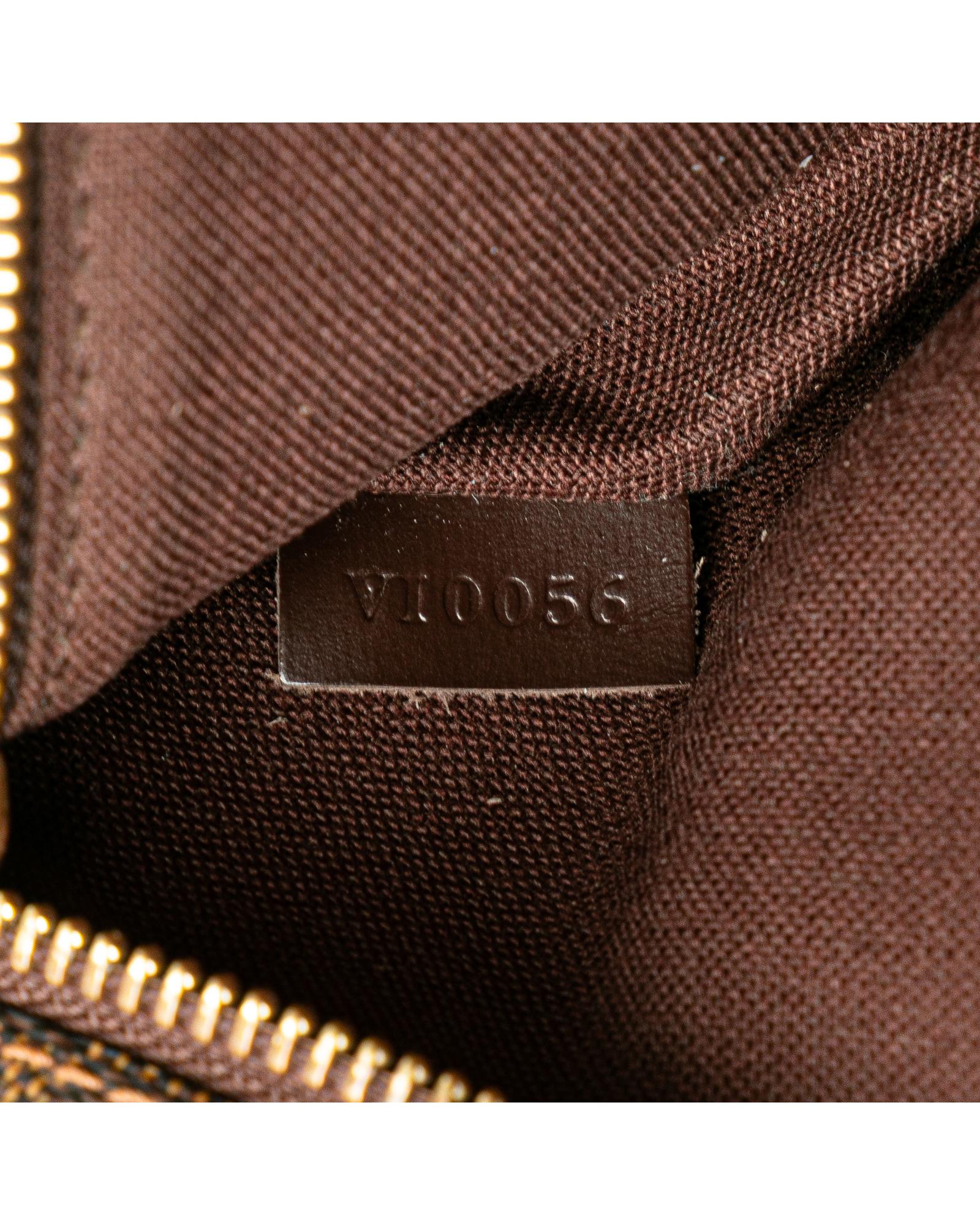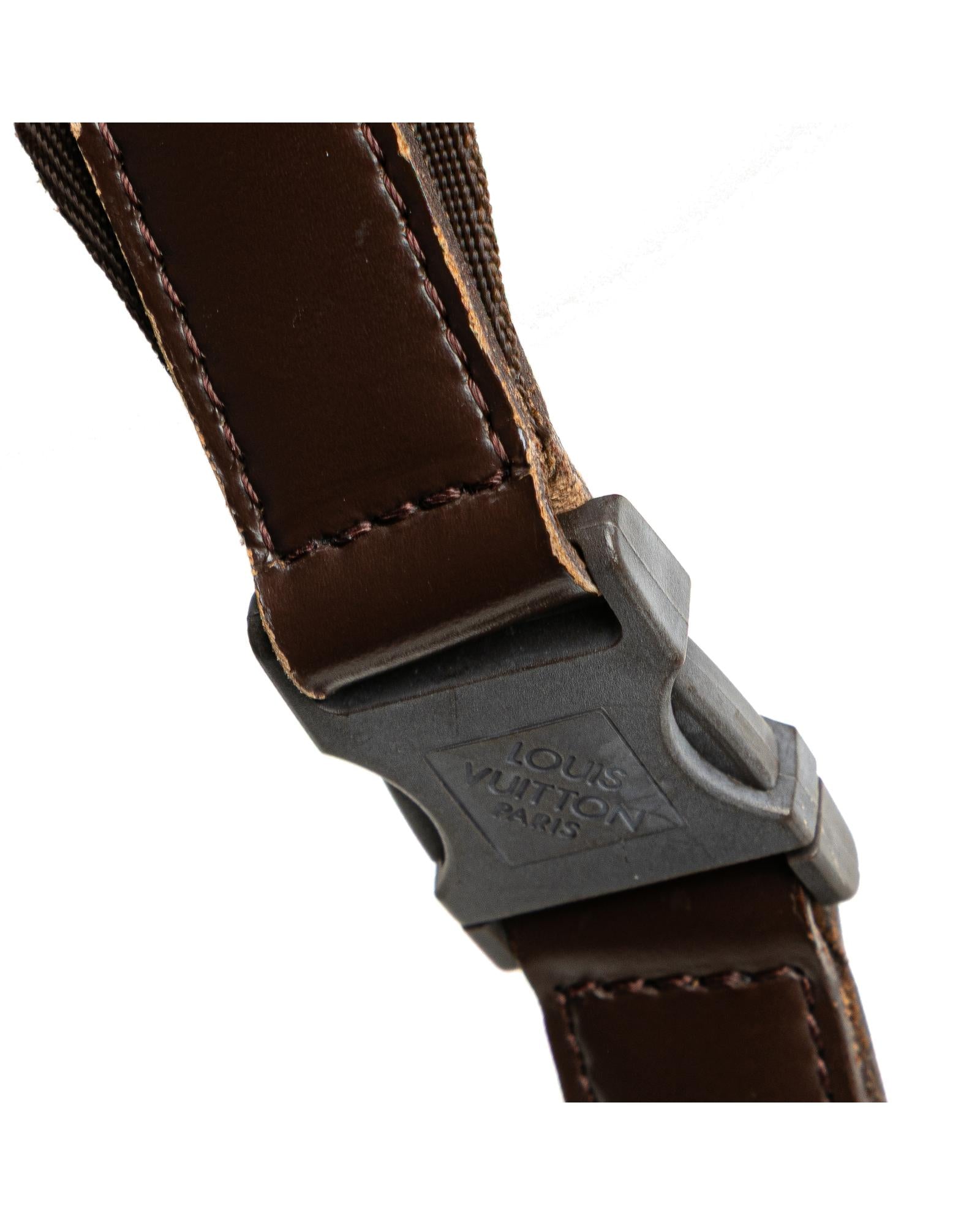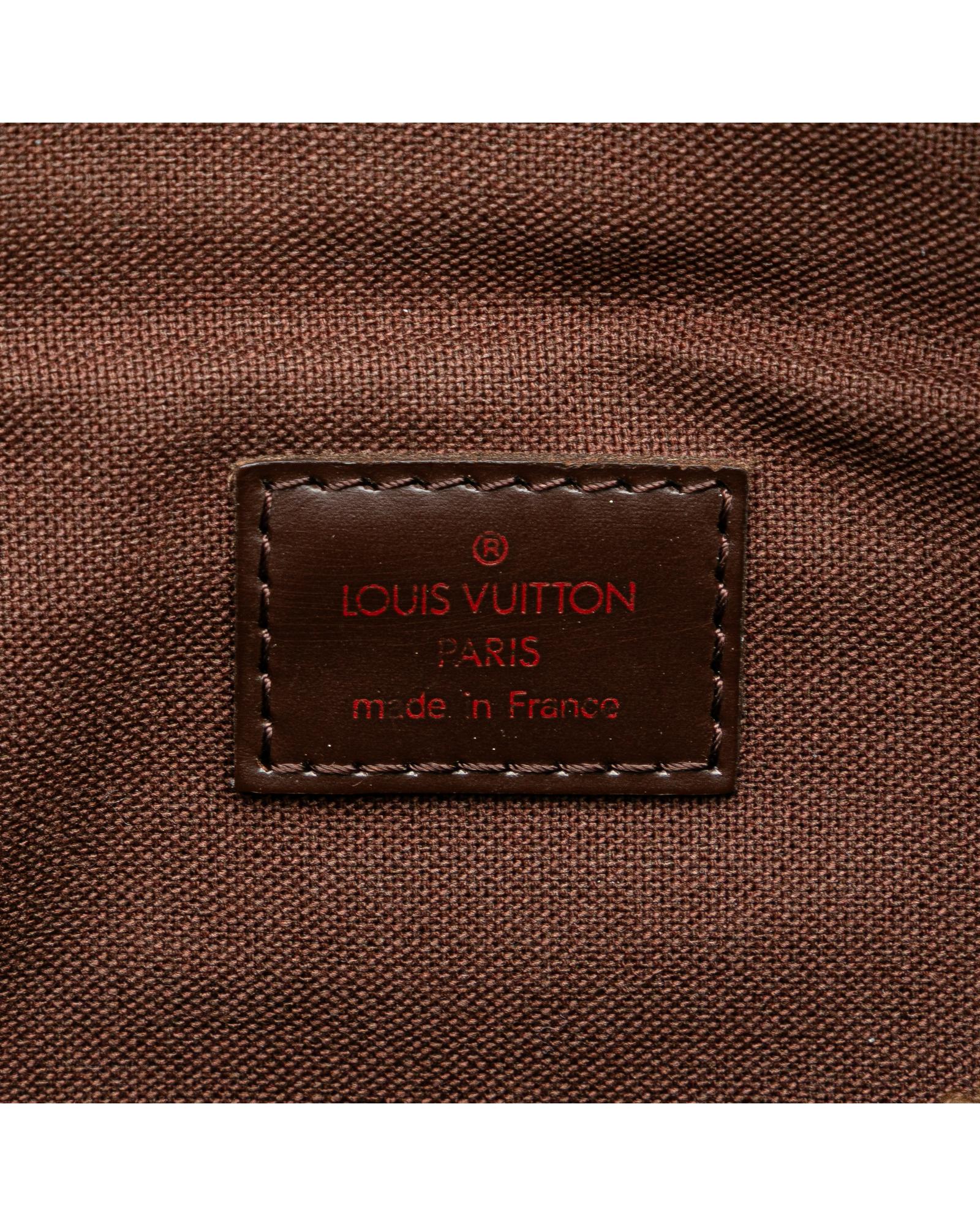 The Melville features a damier ebene canvas body an adjustable flat canvas strap a top zip closure and exterior front and back zip pockets.