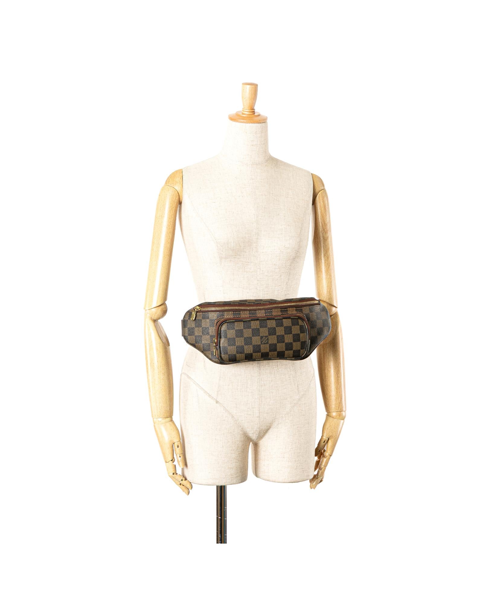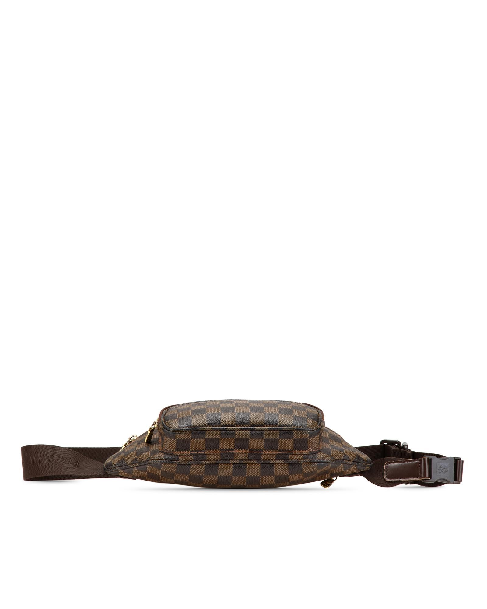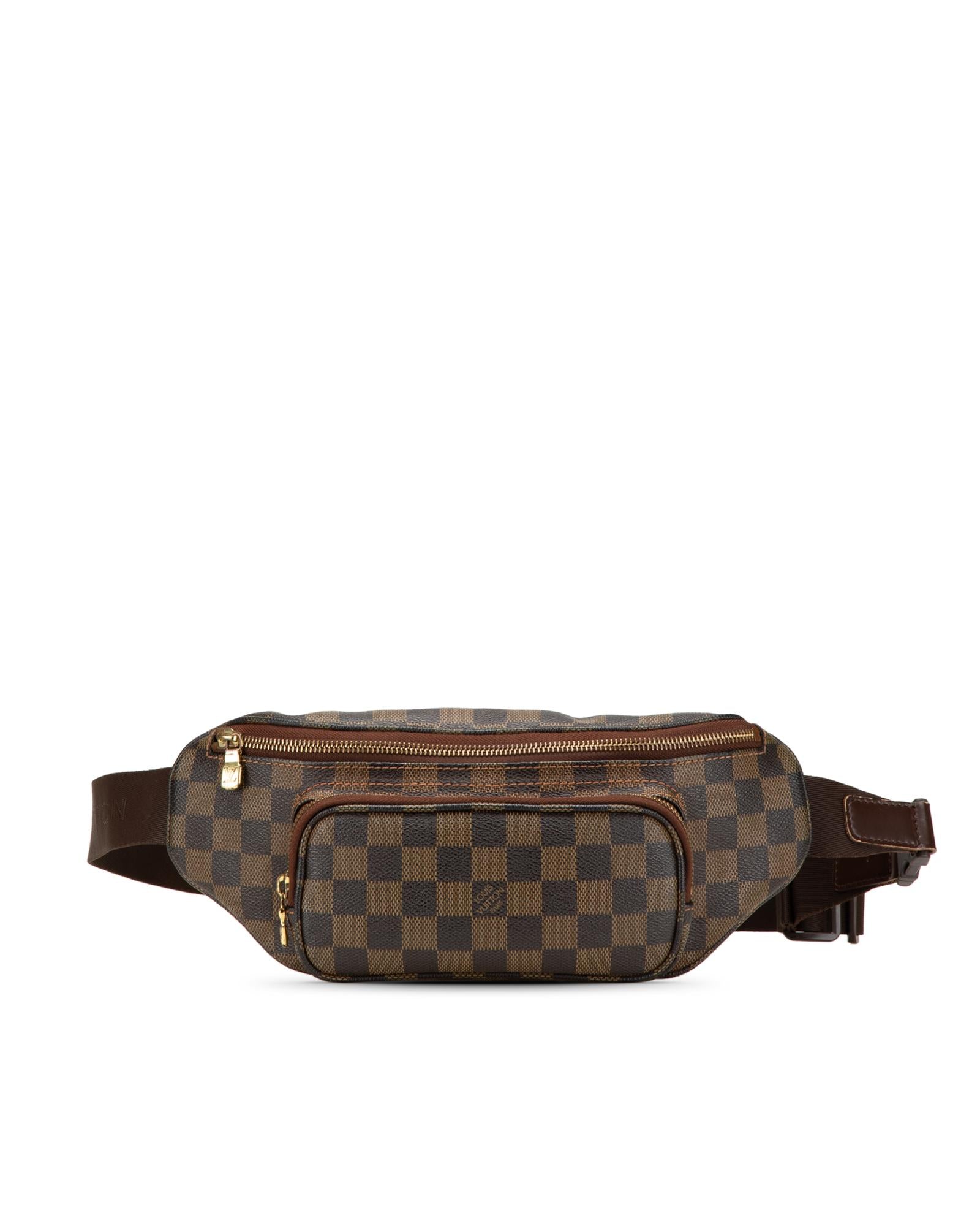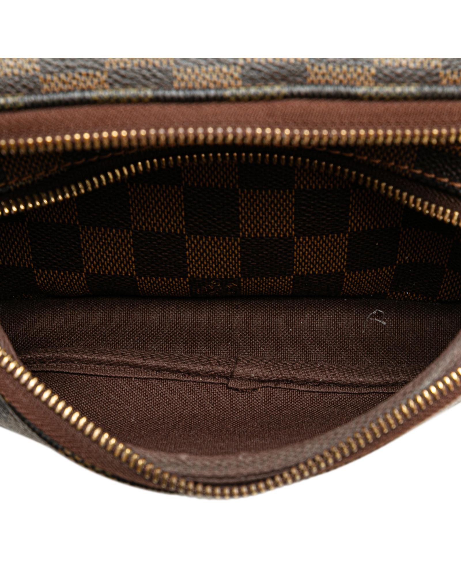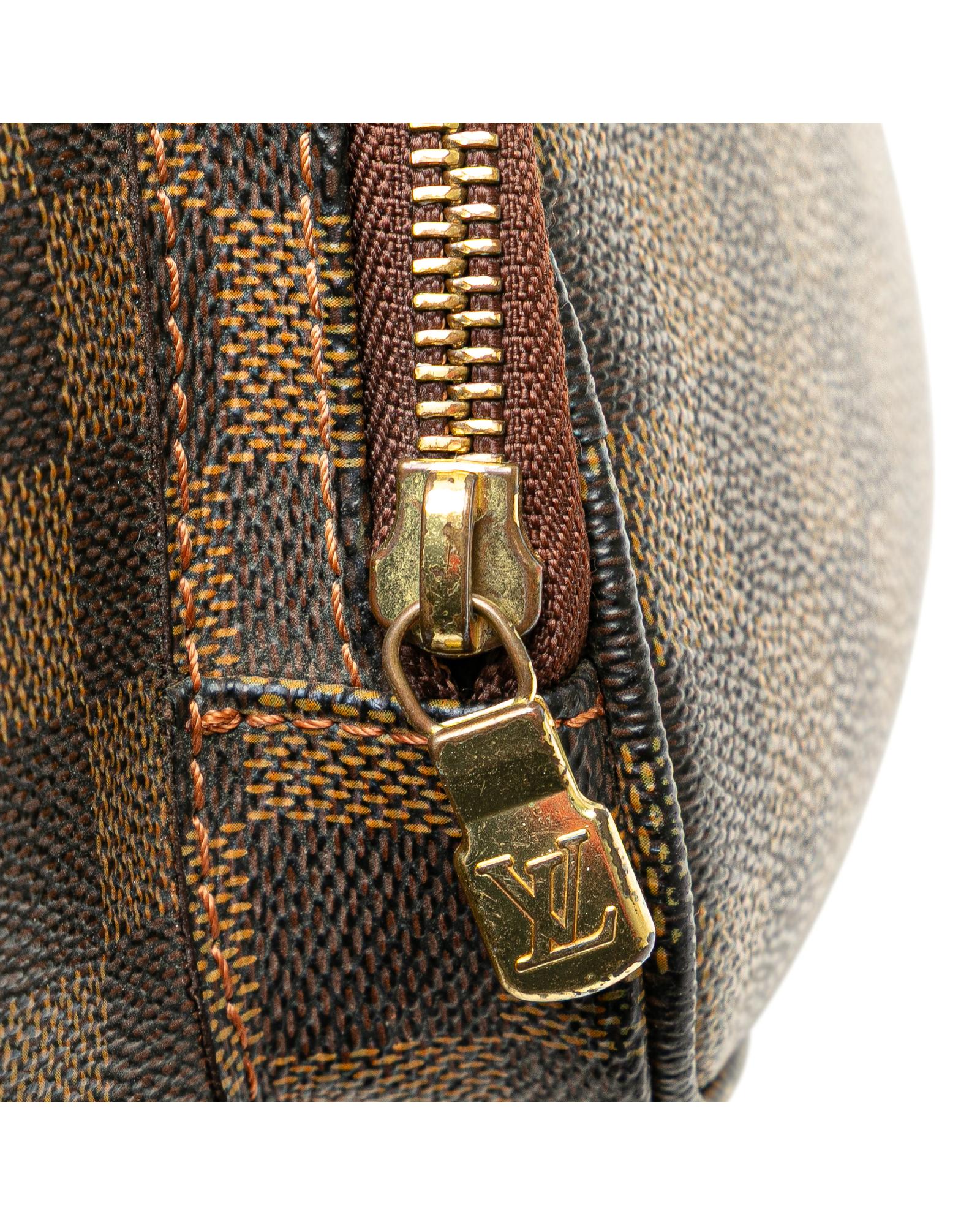 The Melville features a damier ebene canvas body an adjustable flat canvas strap a top zip closure and exterior front and back zip pockets.