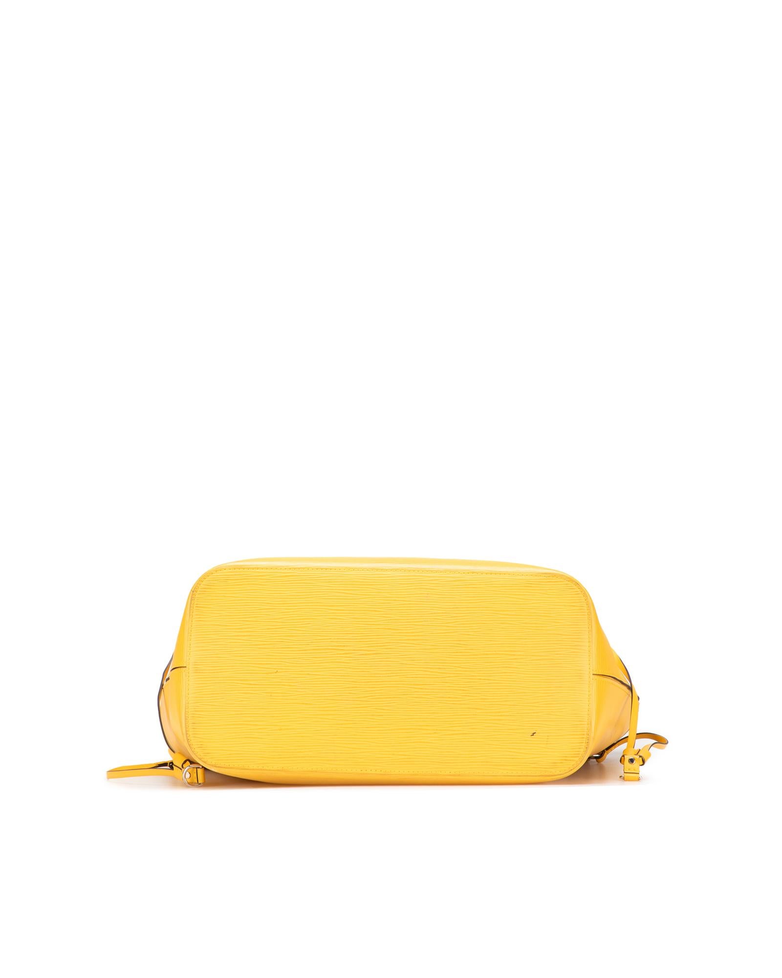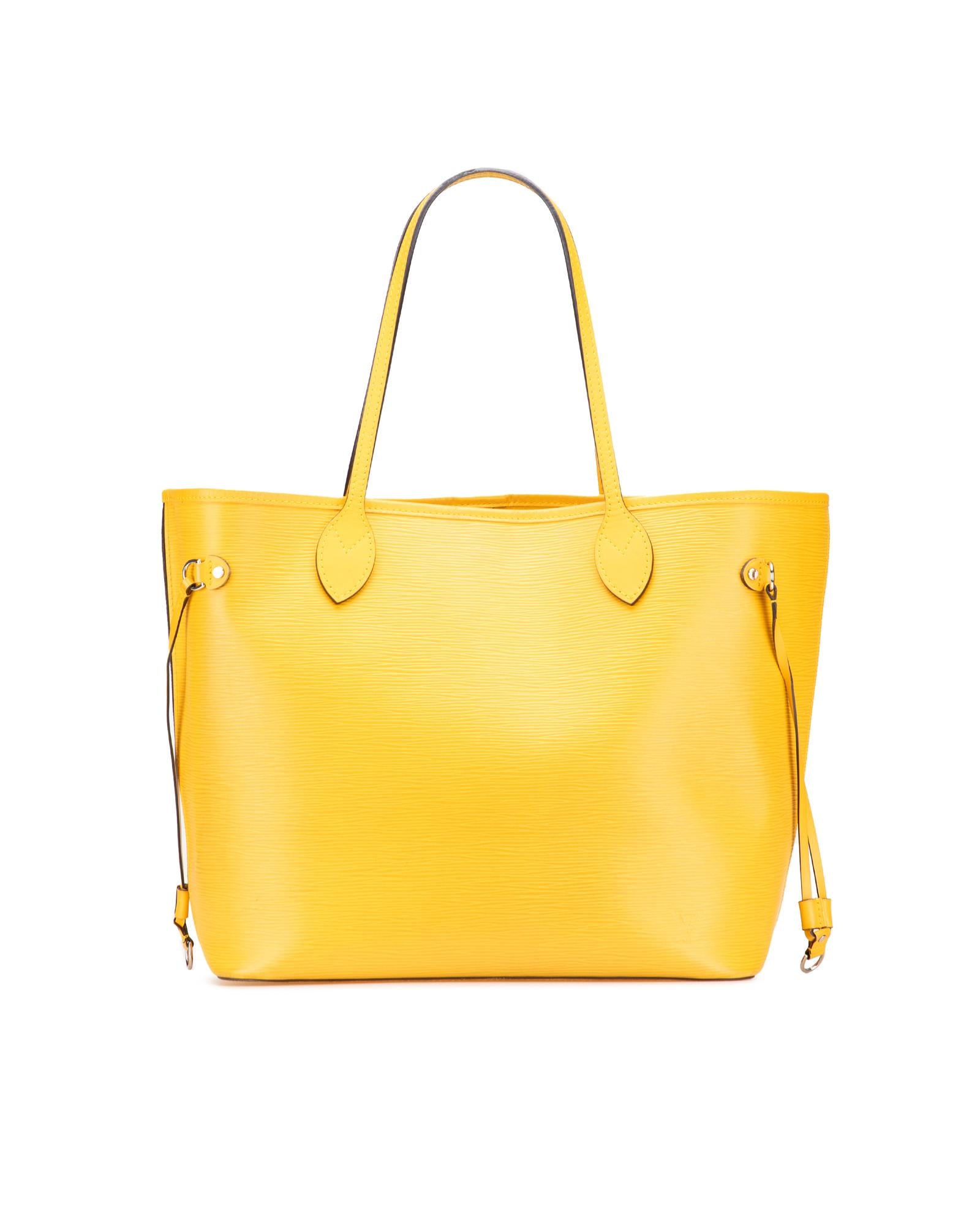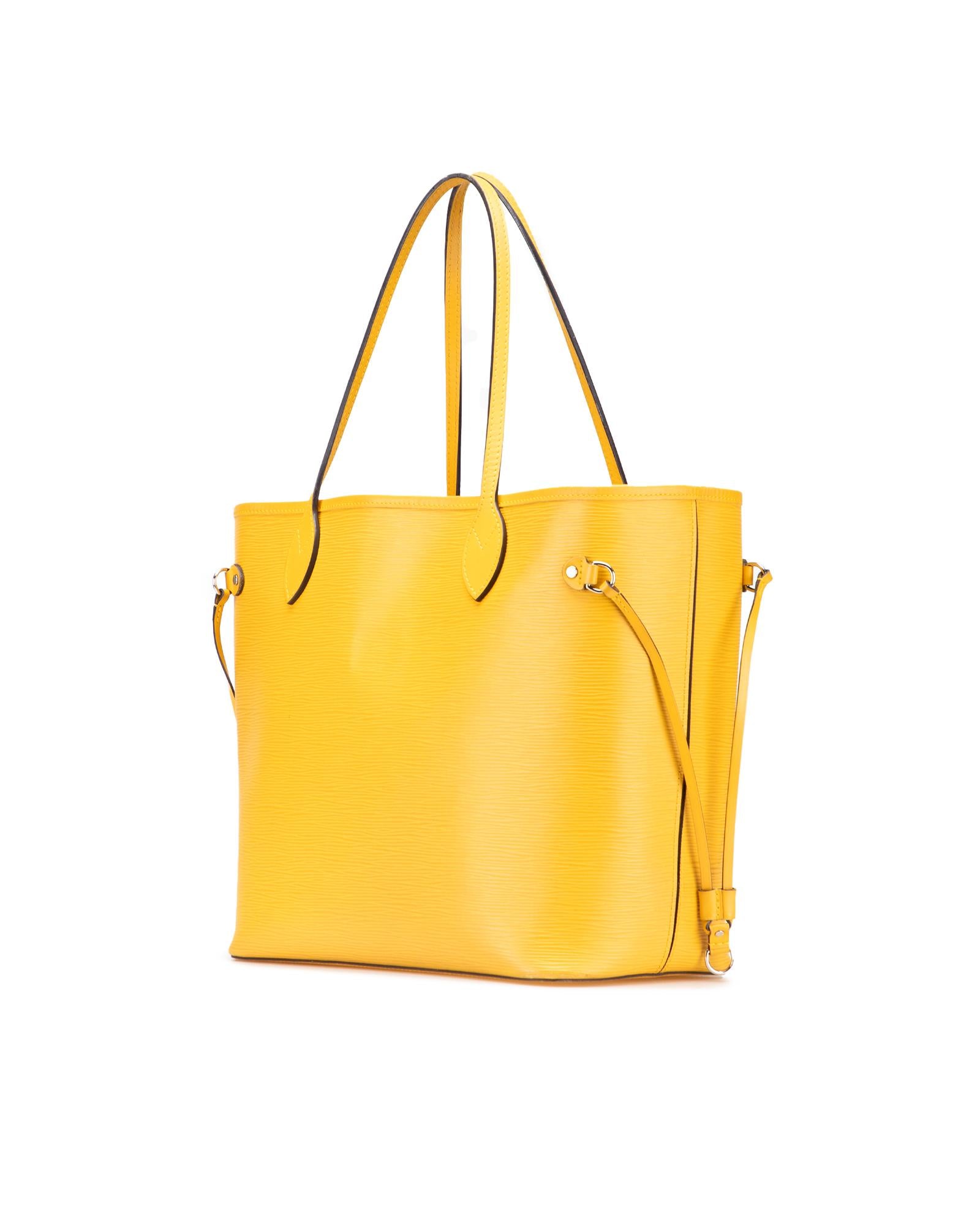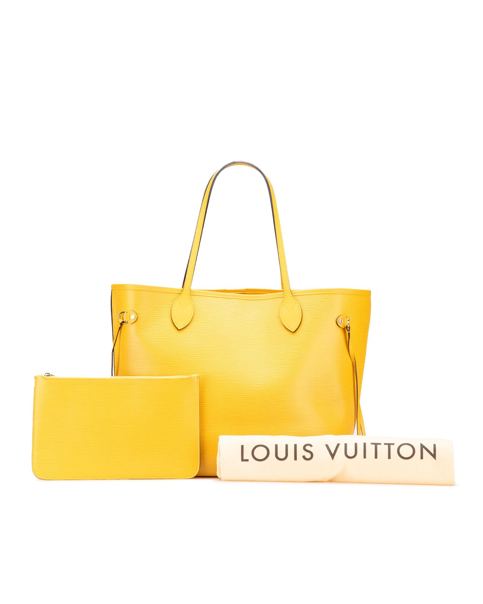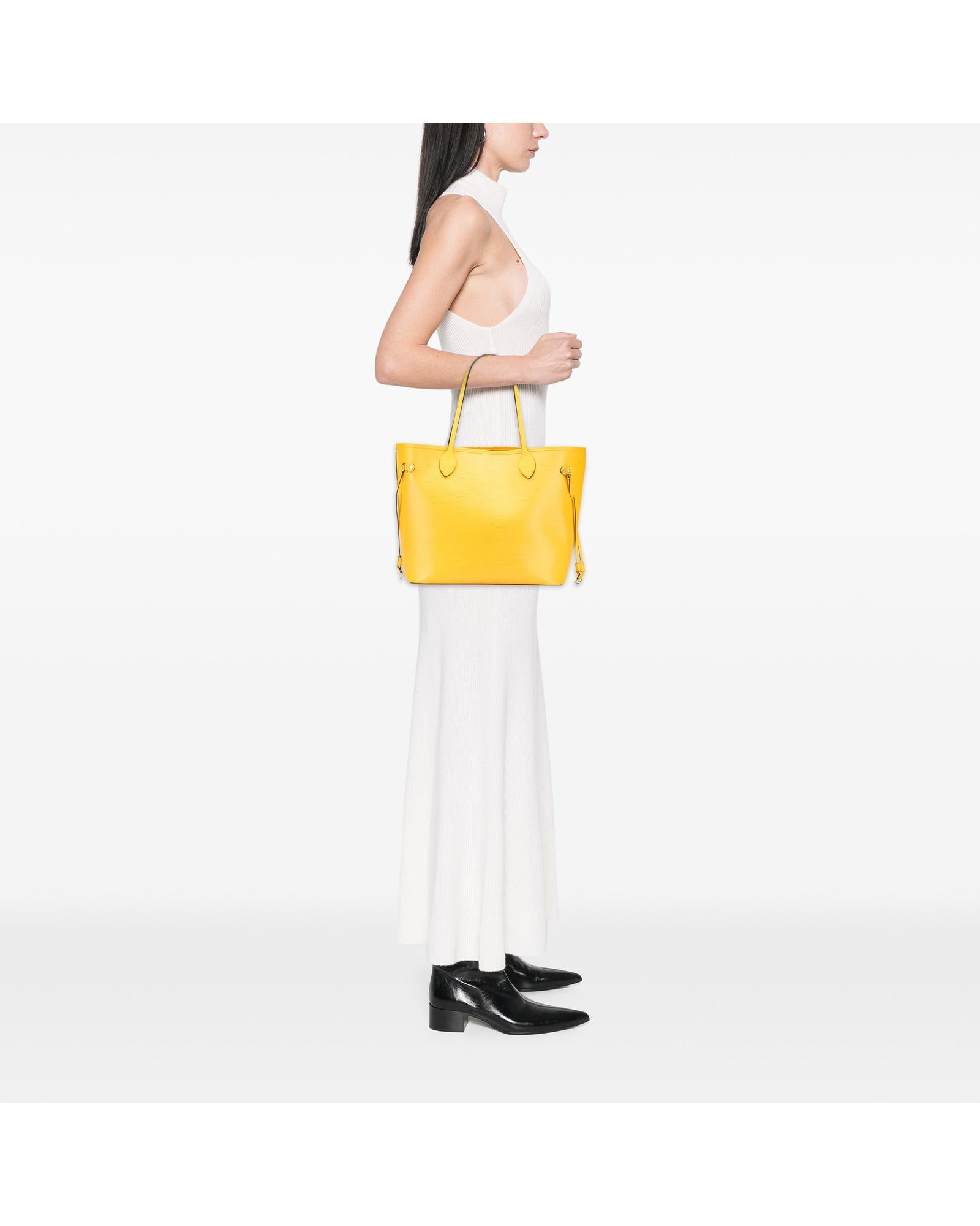 The Neverfull MM features an epi leather body flat leather straps an open top with lobster claw clasp closure and a pouch inclusion.