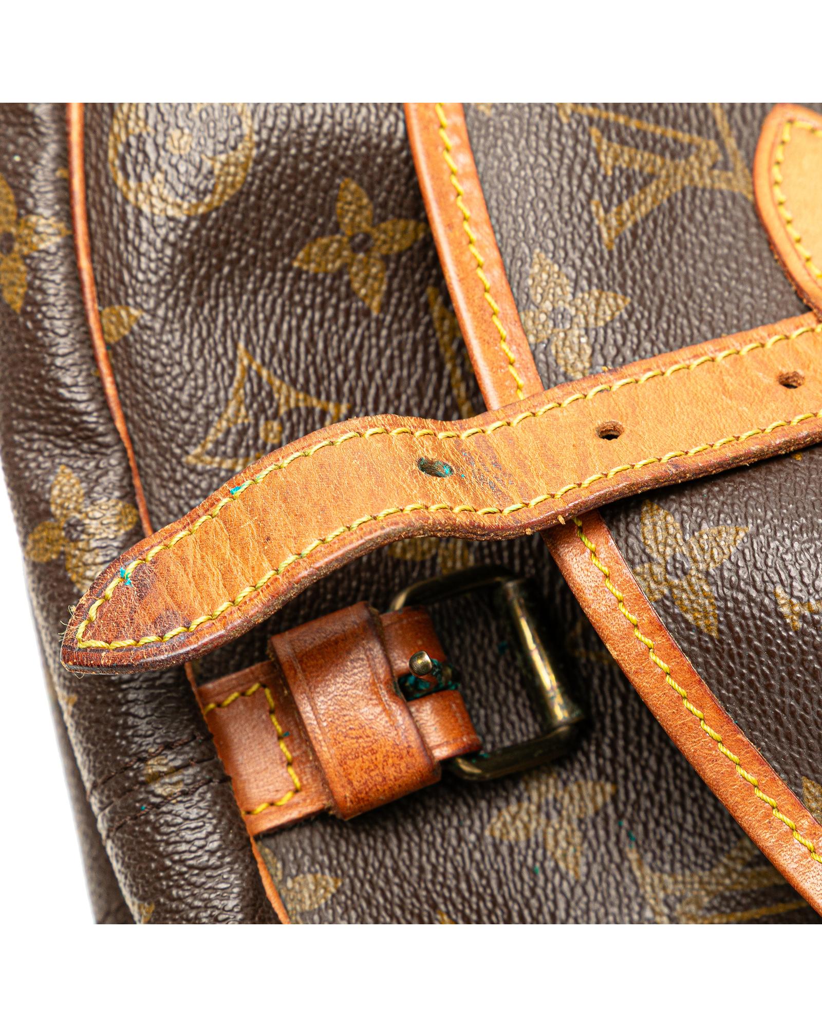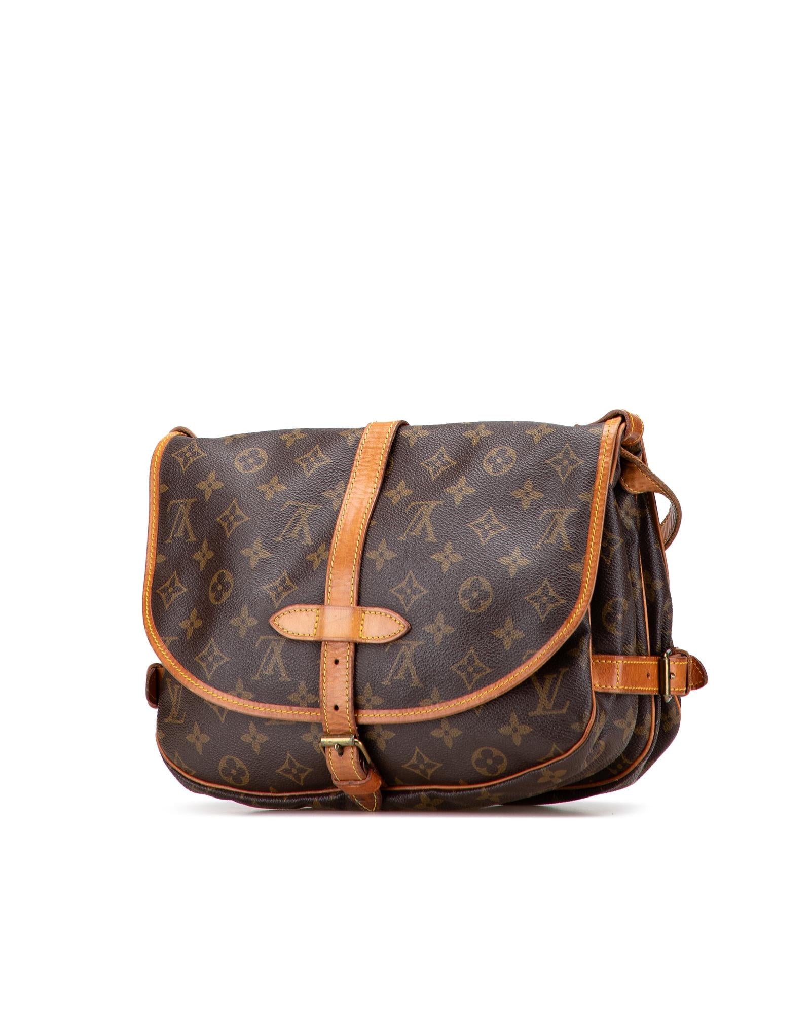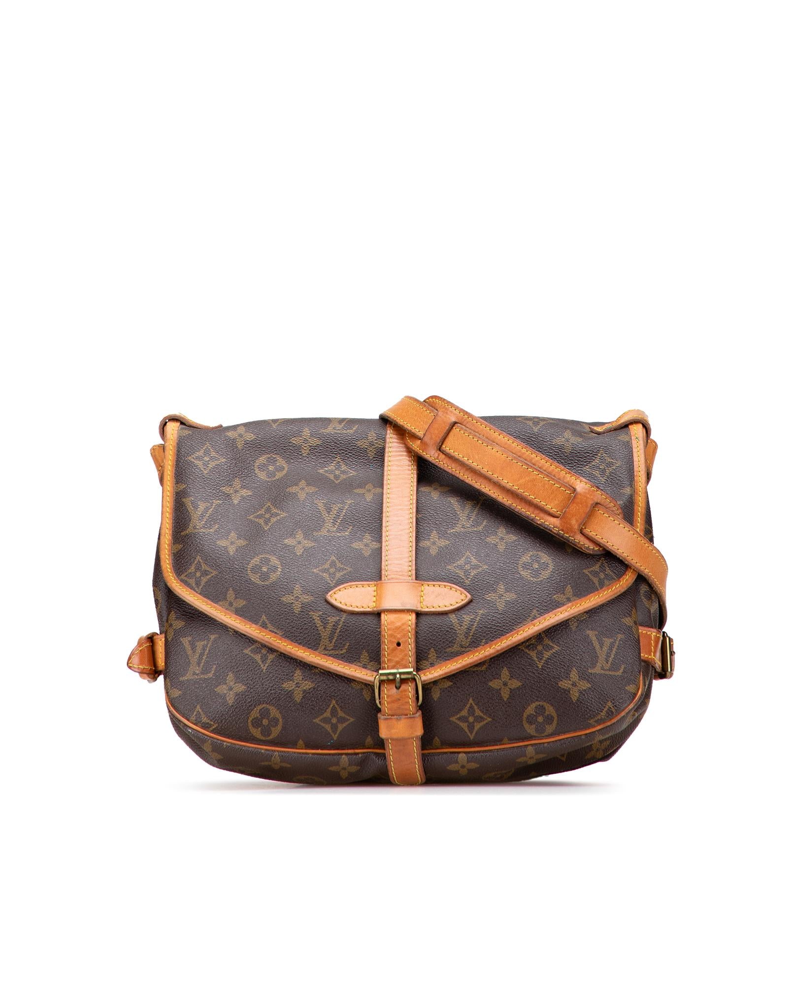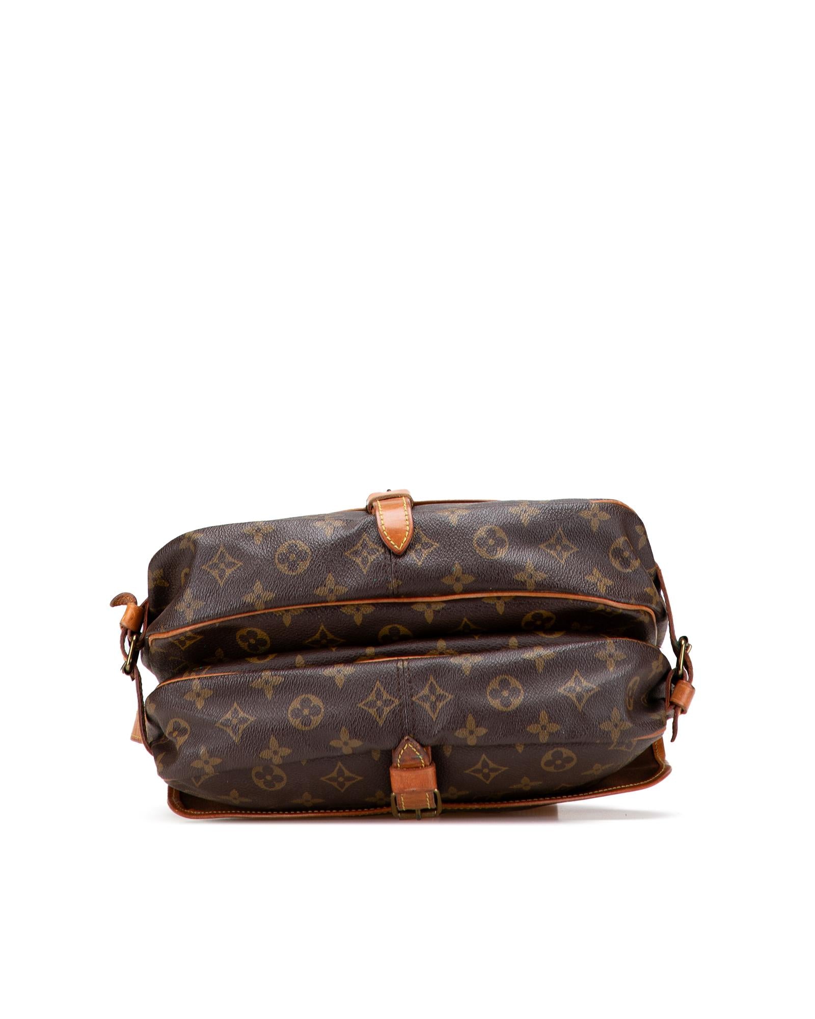 The Saumur 30 features a monogram canvas body with vachetta leather trim a flat adjustable vachetta leather shoulder strap double open compartments with front flaps and belt buckle closures.Brand: Louis Vuitton Vintage