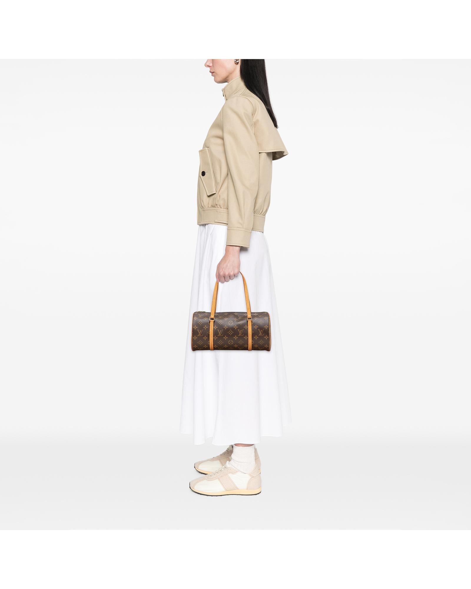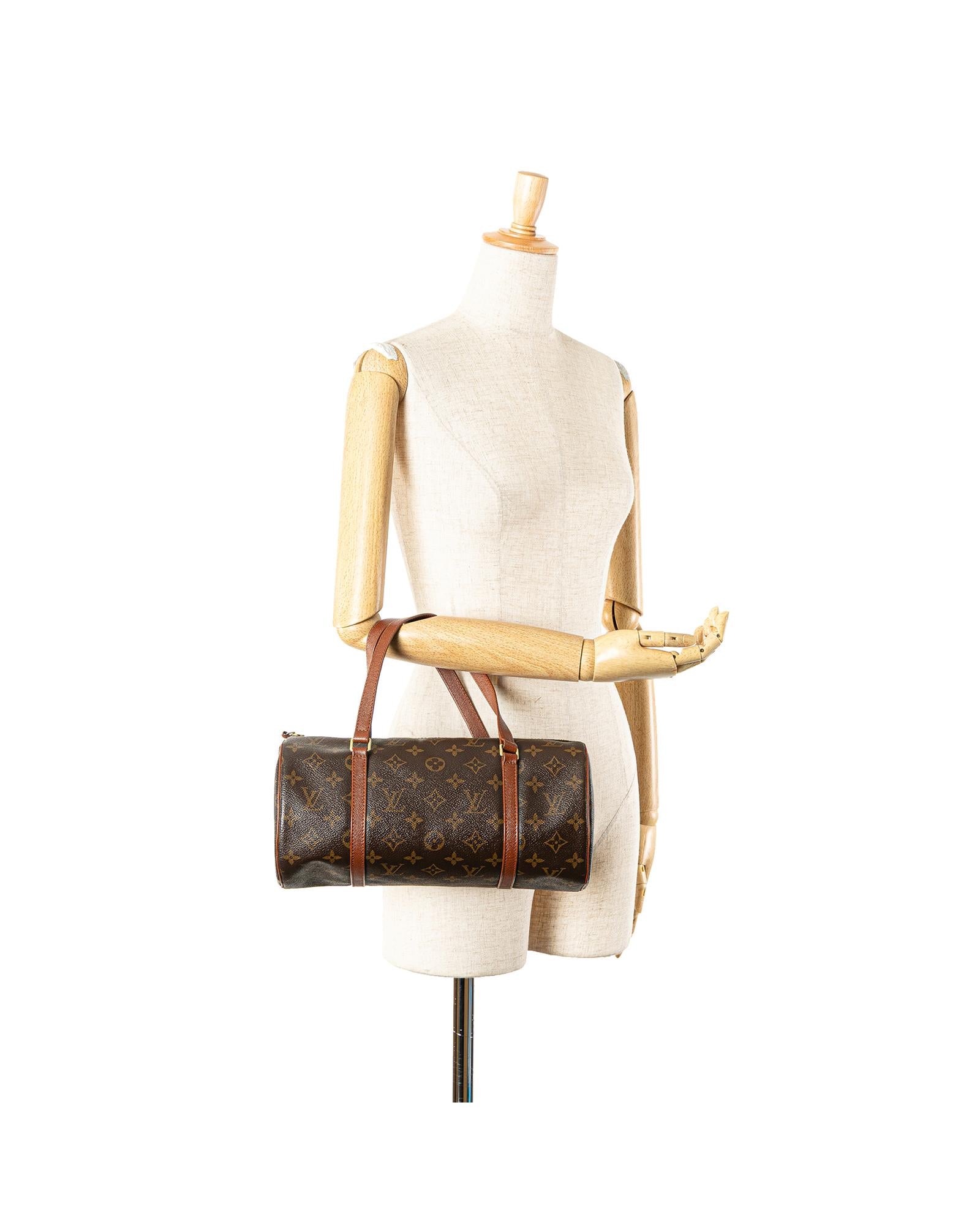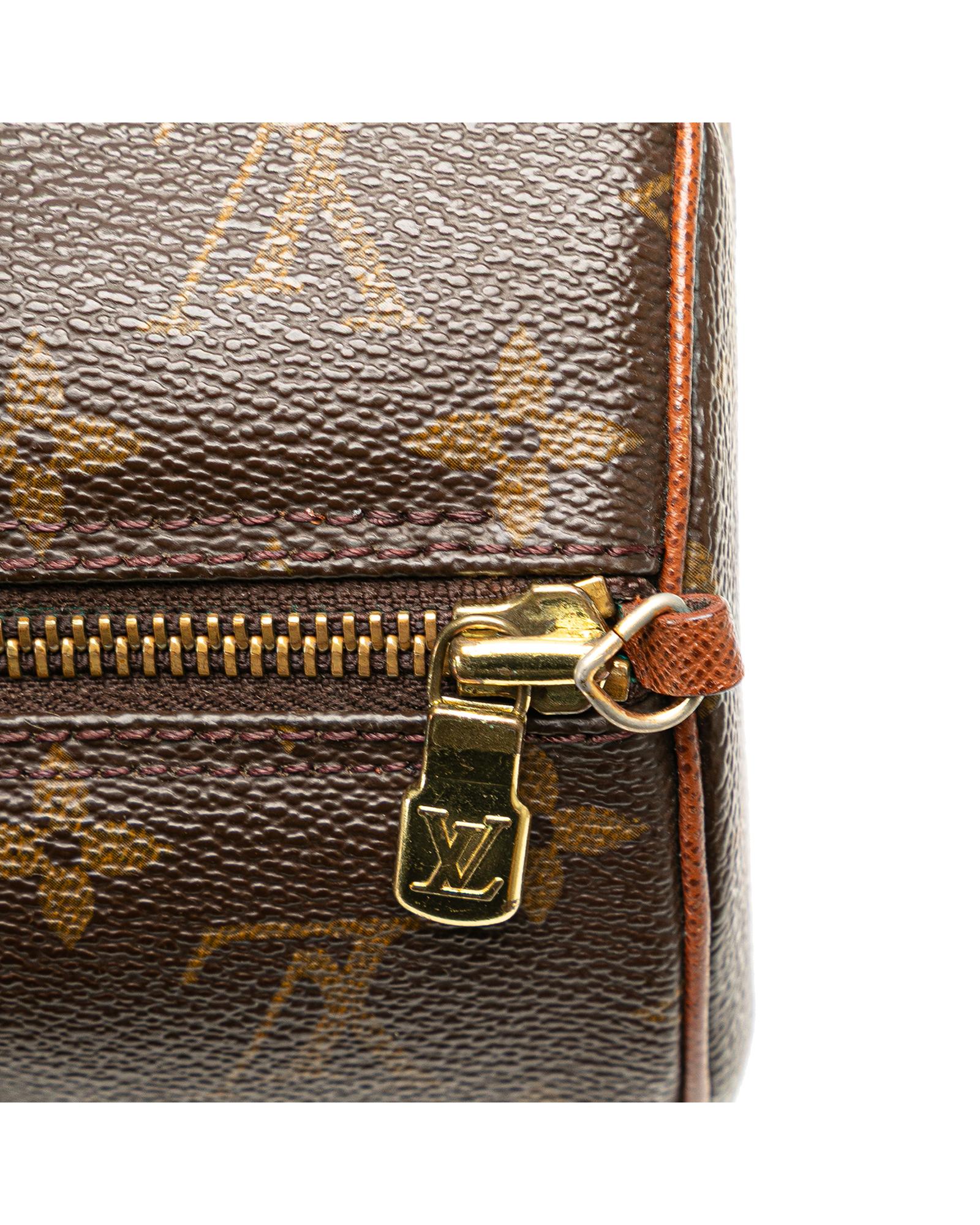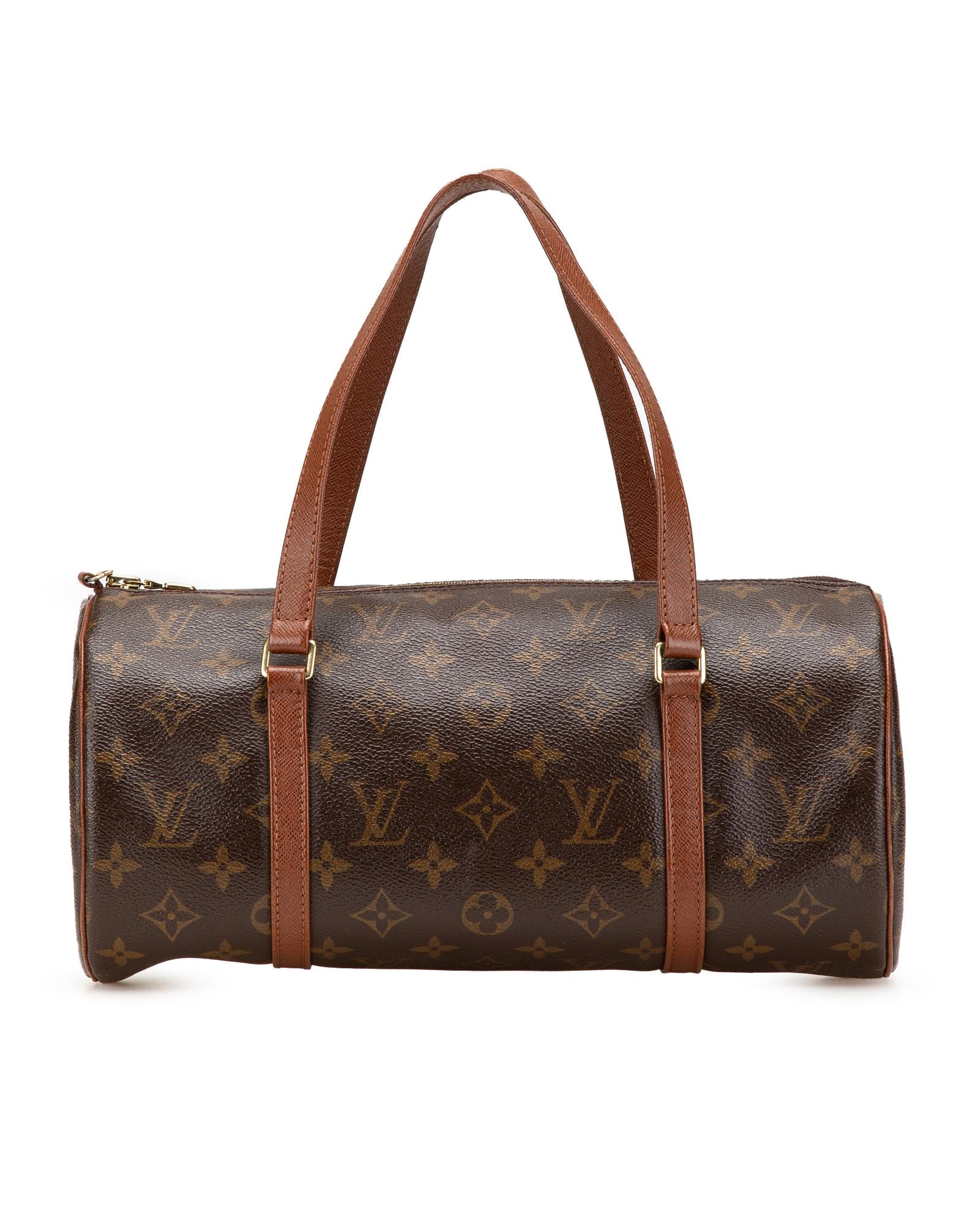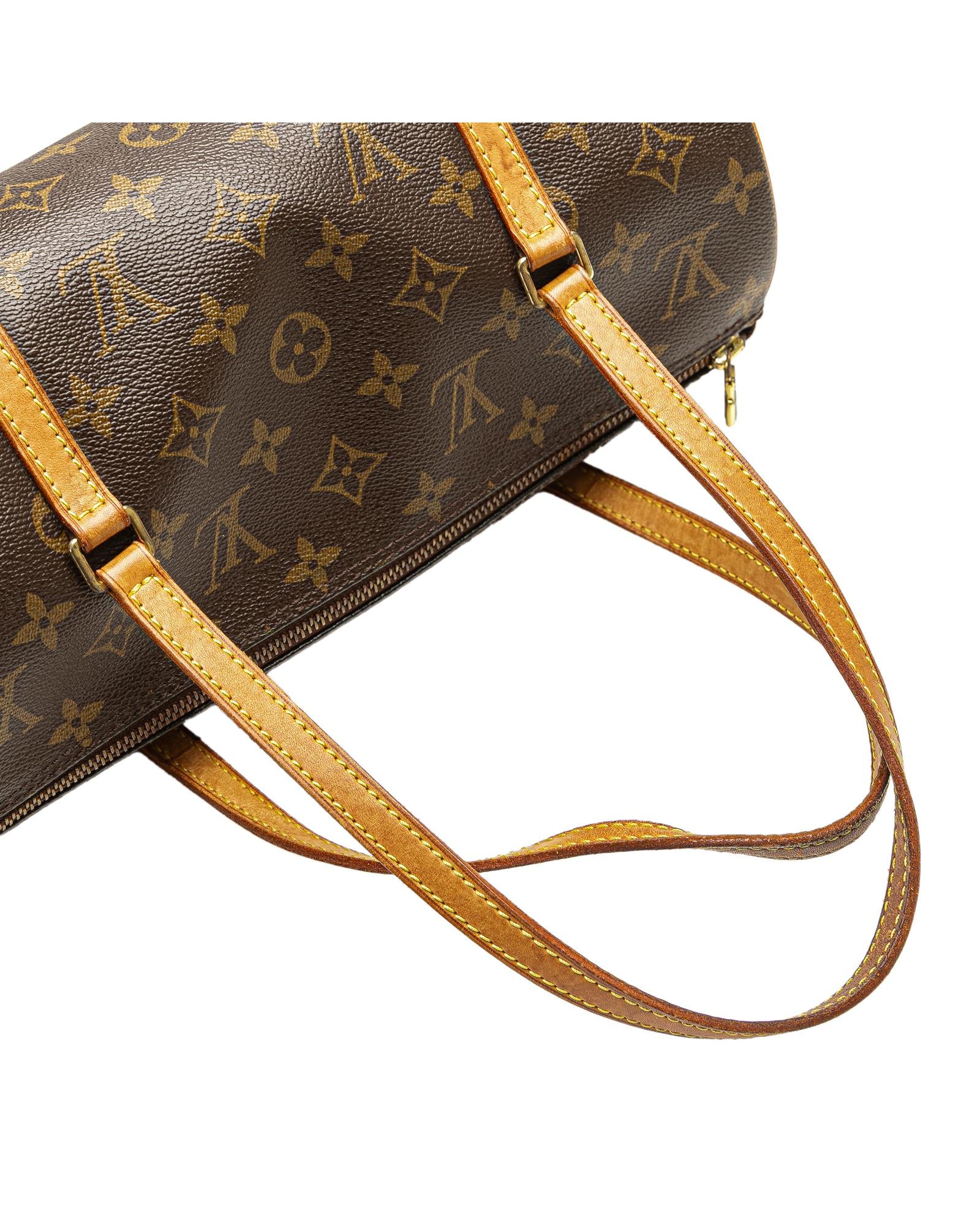 The Papillon 30 features a monogram canvas body with vachetta leather trim flat vachetta leather handles and a top zip closure.