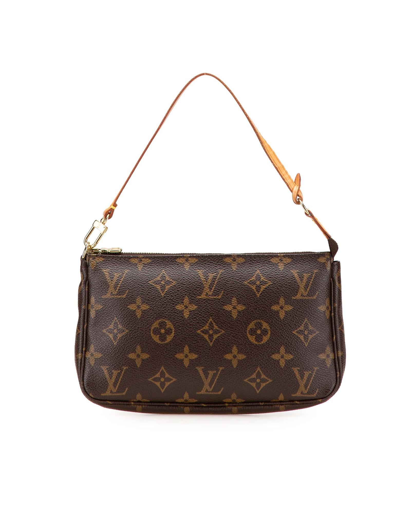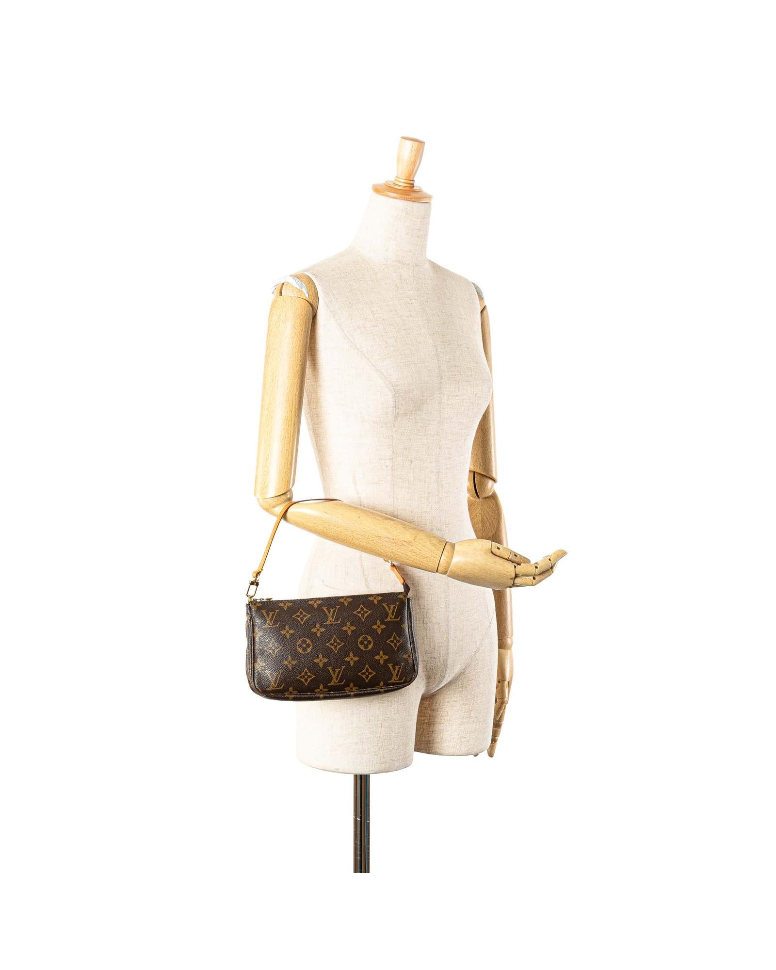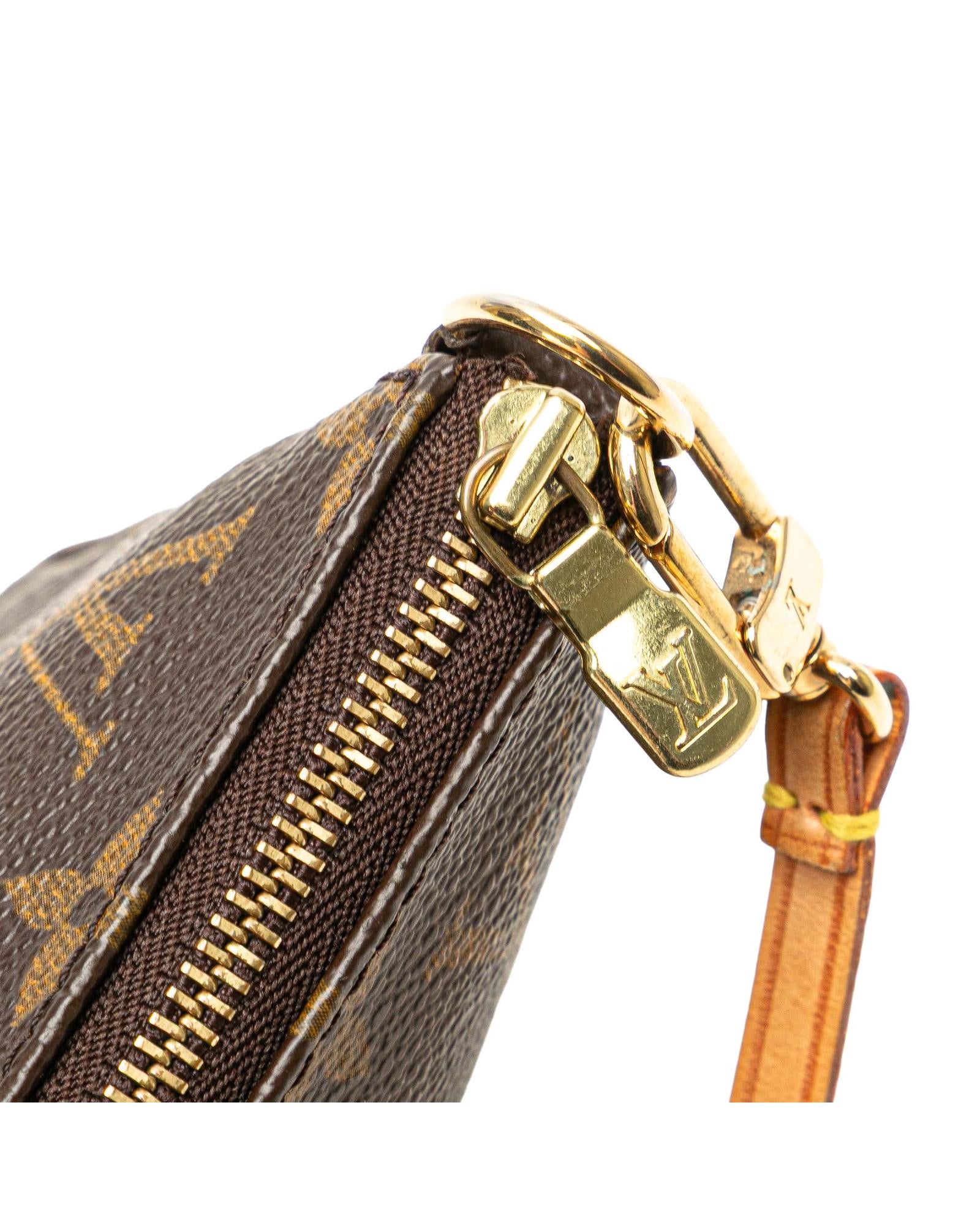 The Pochette Accessoires features a monogram canvas body a flat vachetta leather strap and a top zip closure.Brand: Louis Vuitton Vintage