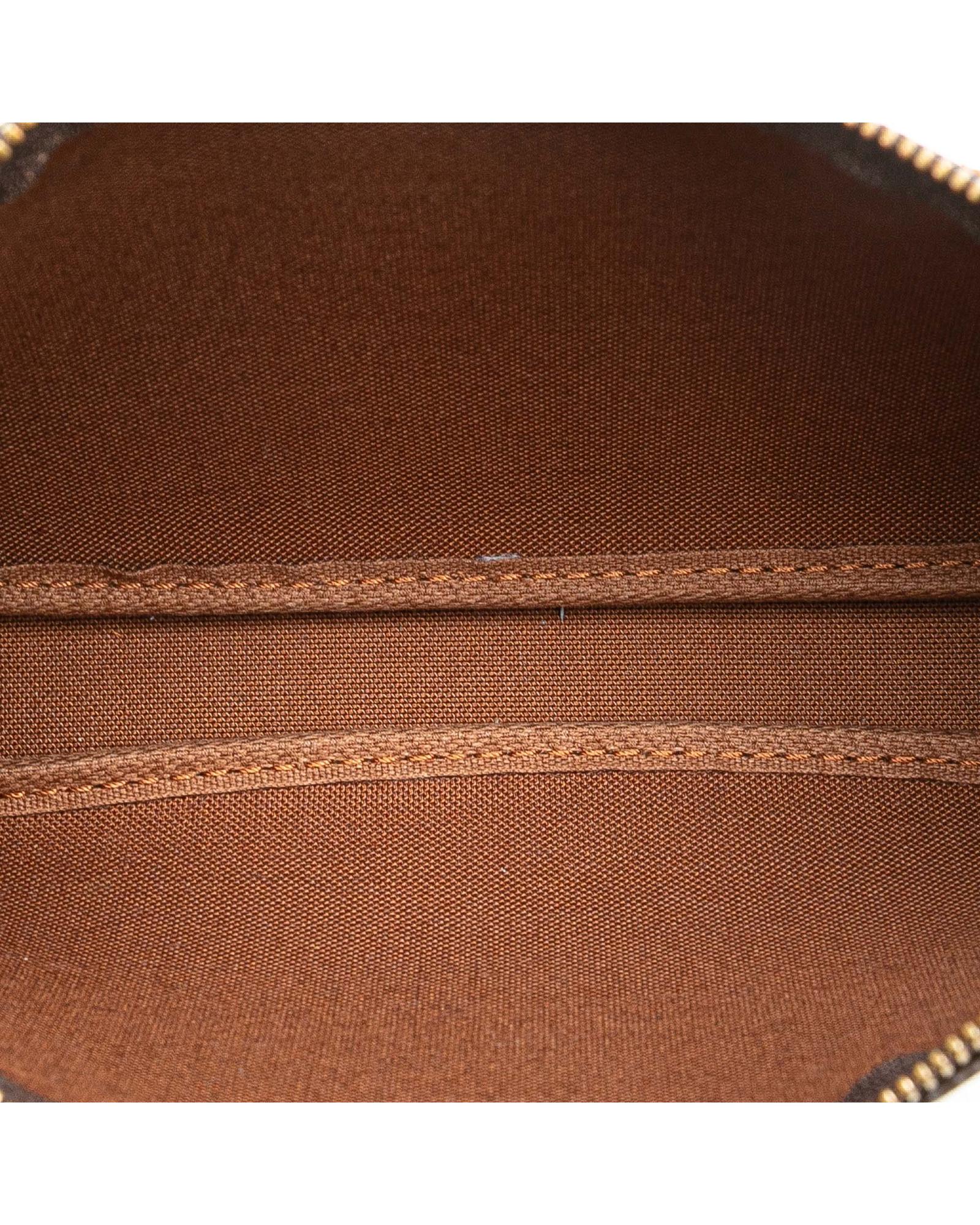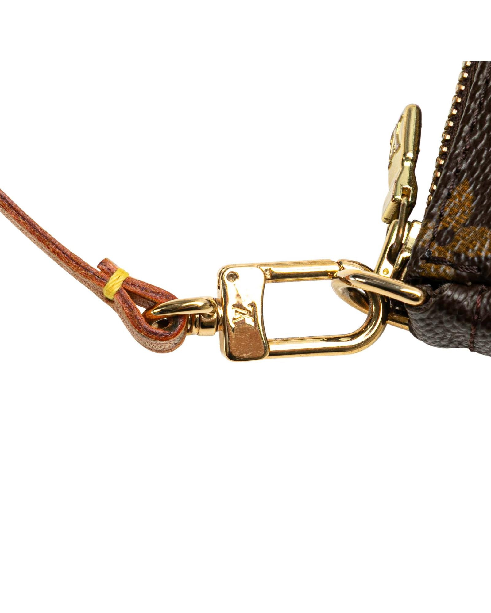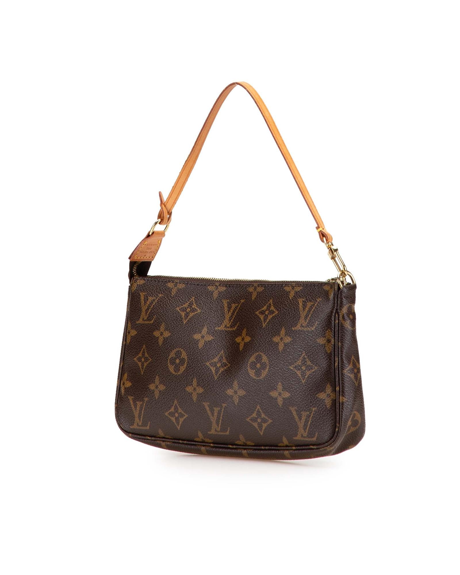 The Pochette Accessoires features a monogram canvas body a flat vachetta leather strap and a top zip closure.Brand: Louis Vuitton Vintage