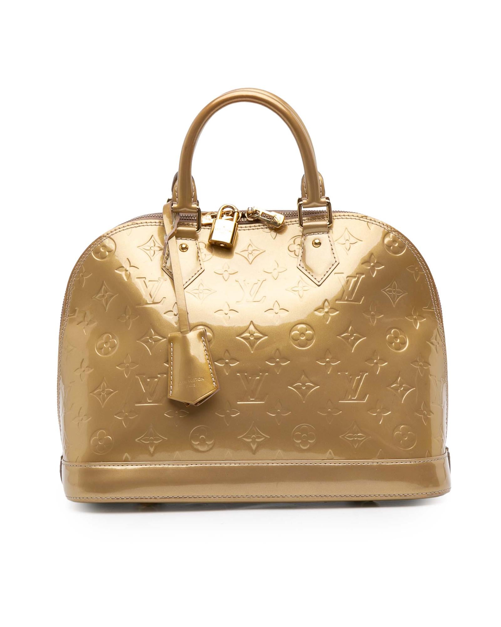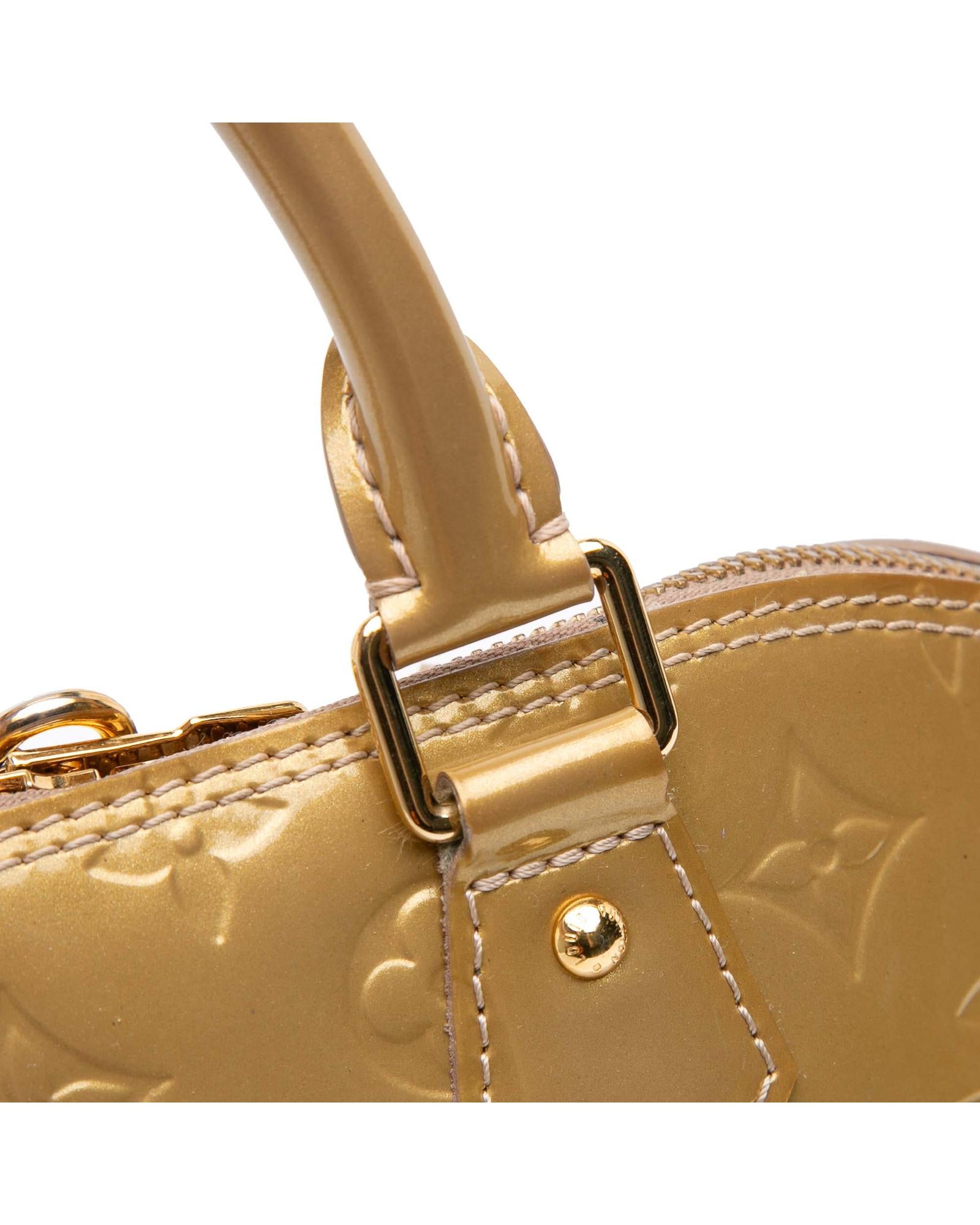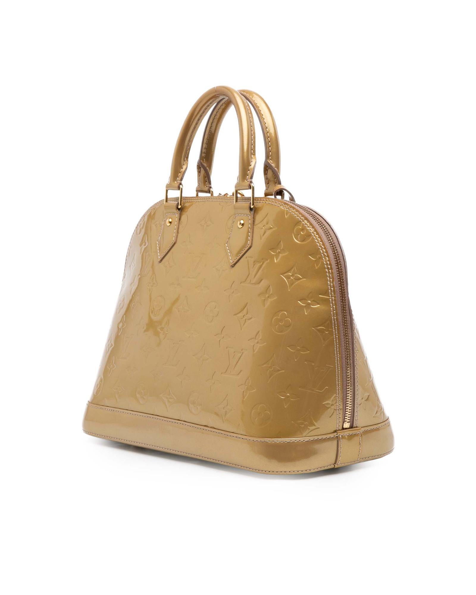 The Alma features a monogram vernis leather body rolled patent leather handles a top zip closure and interior slip pockets.Brand: Louis Vuitton Vintage