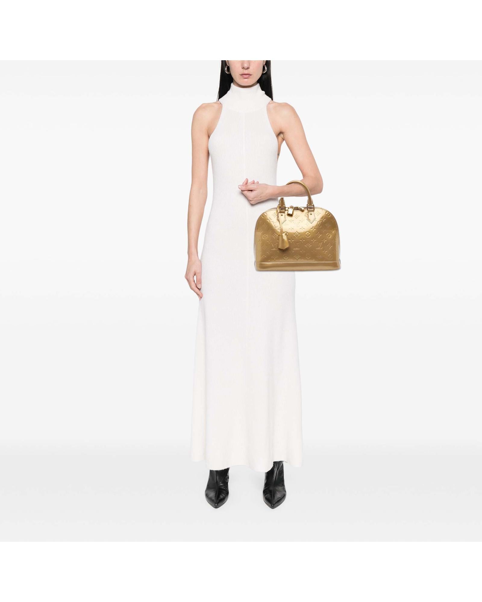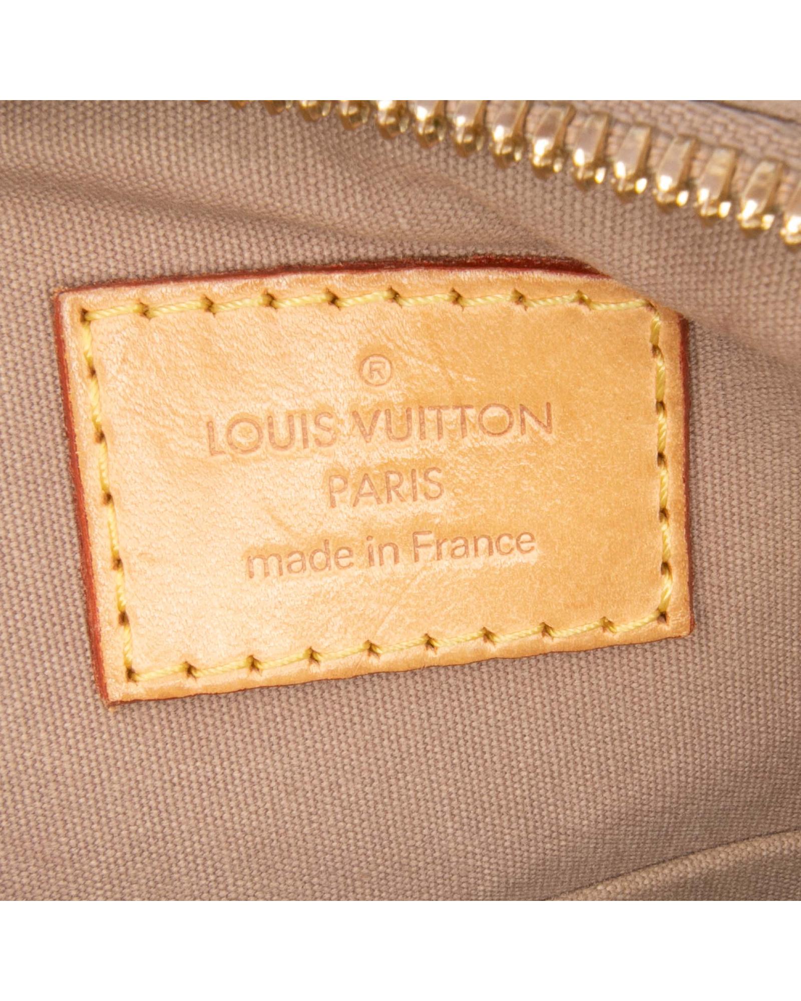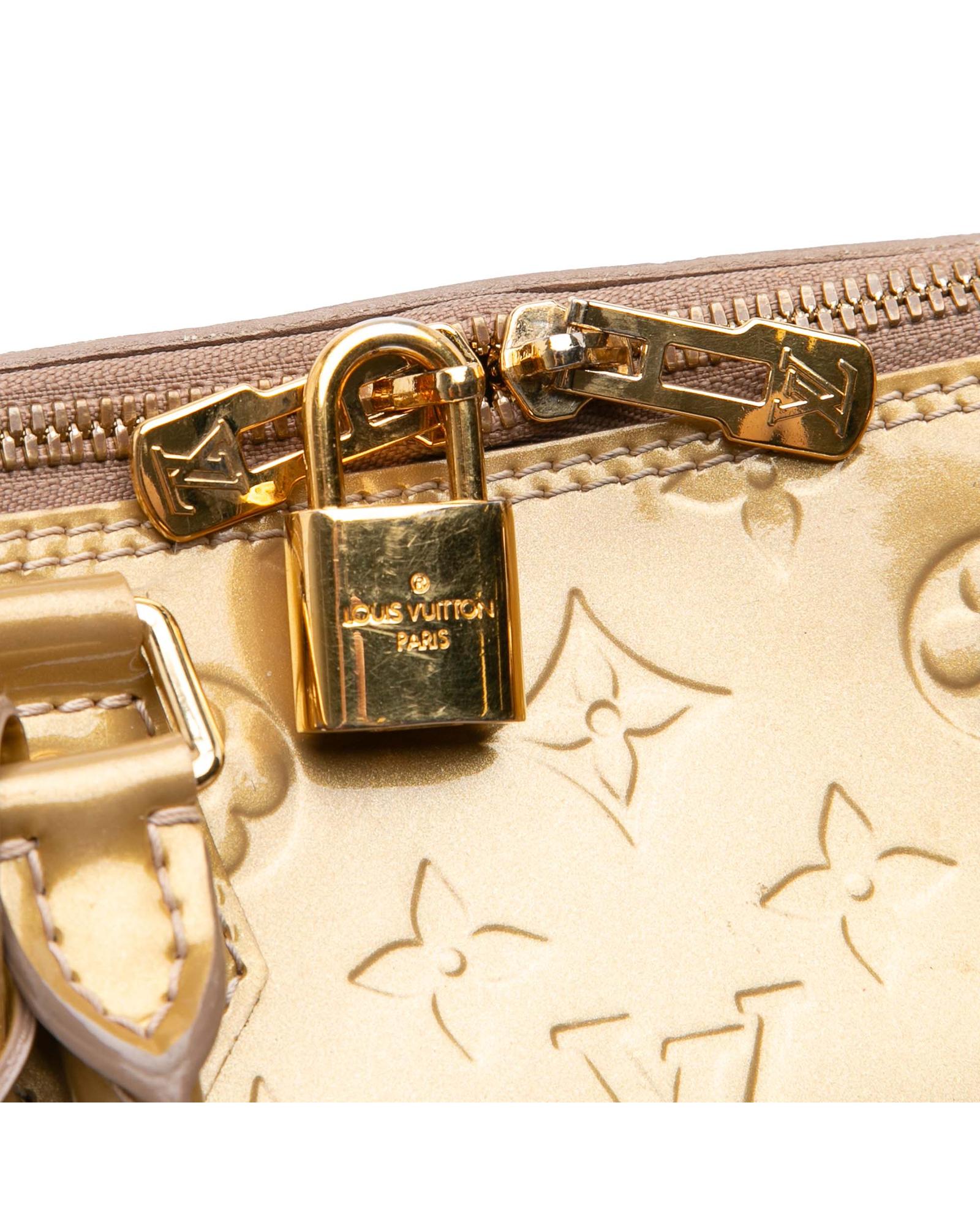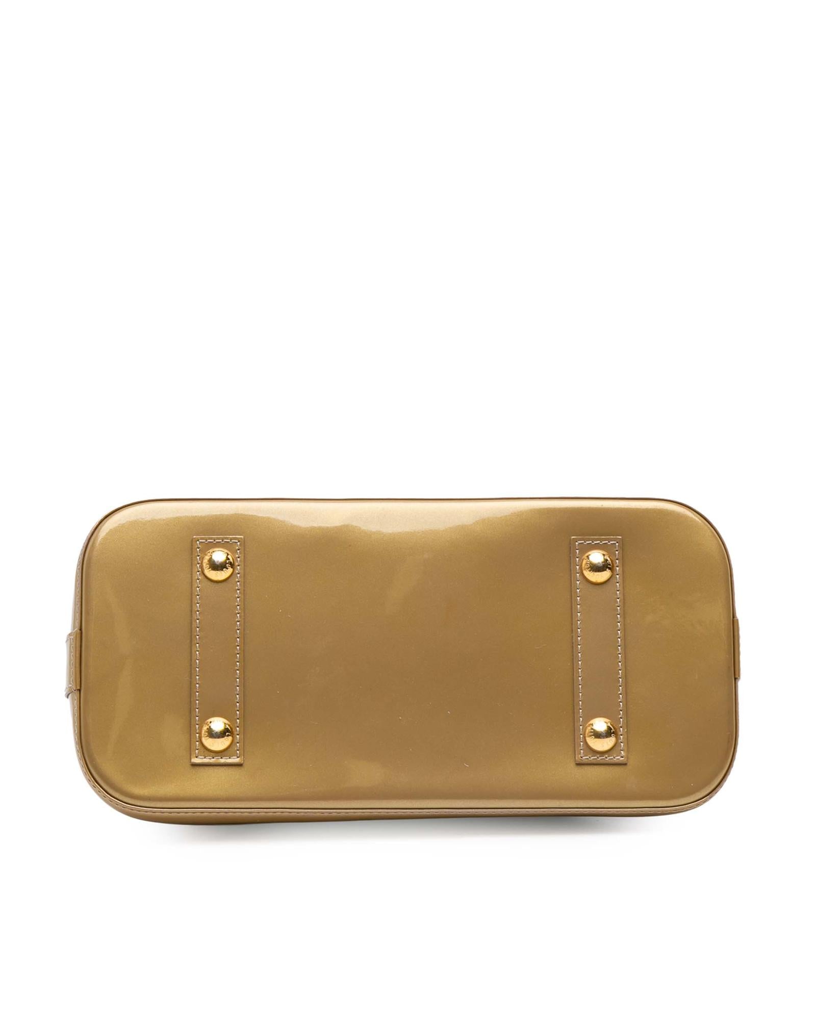 The Alma features a monogram vernis leather body rolled patent leather handles a top zip closure and interior slip pockets.Brand: Louis Vuitton Vintage