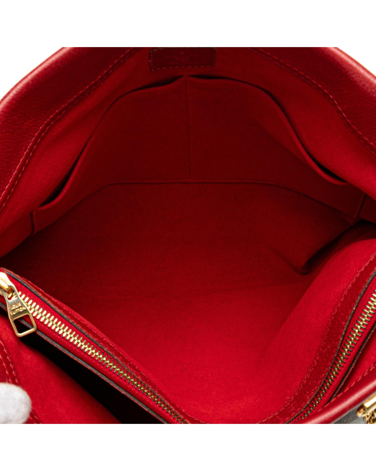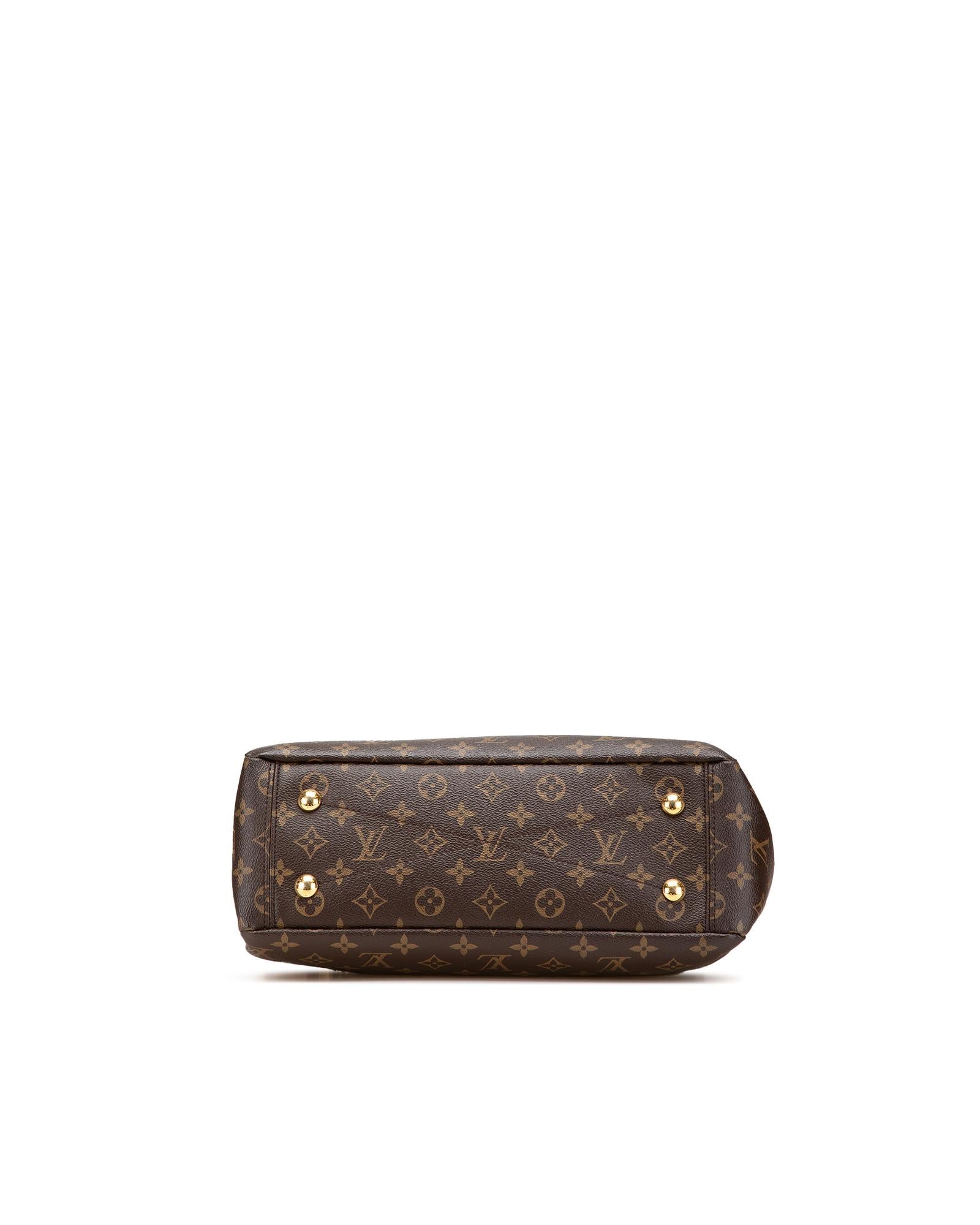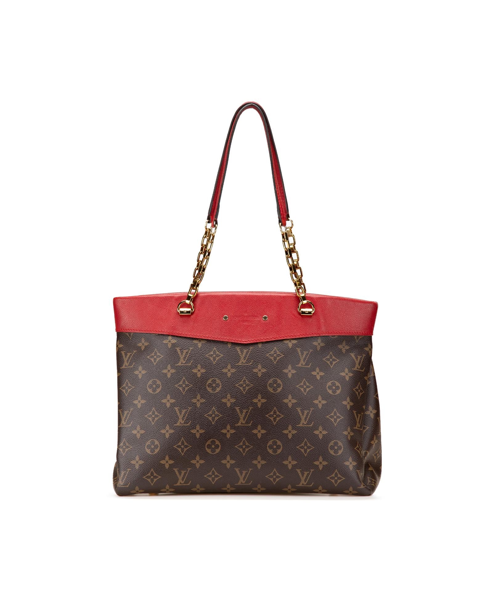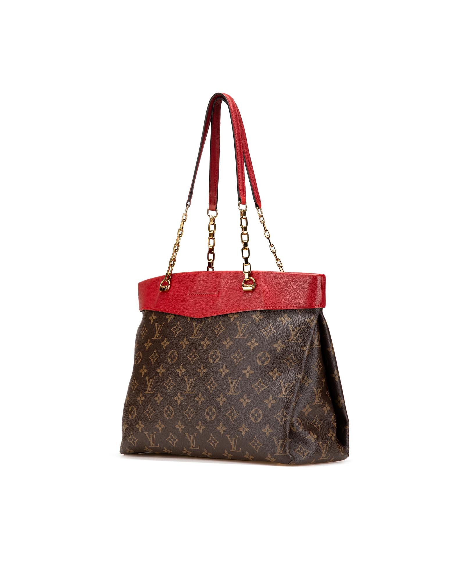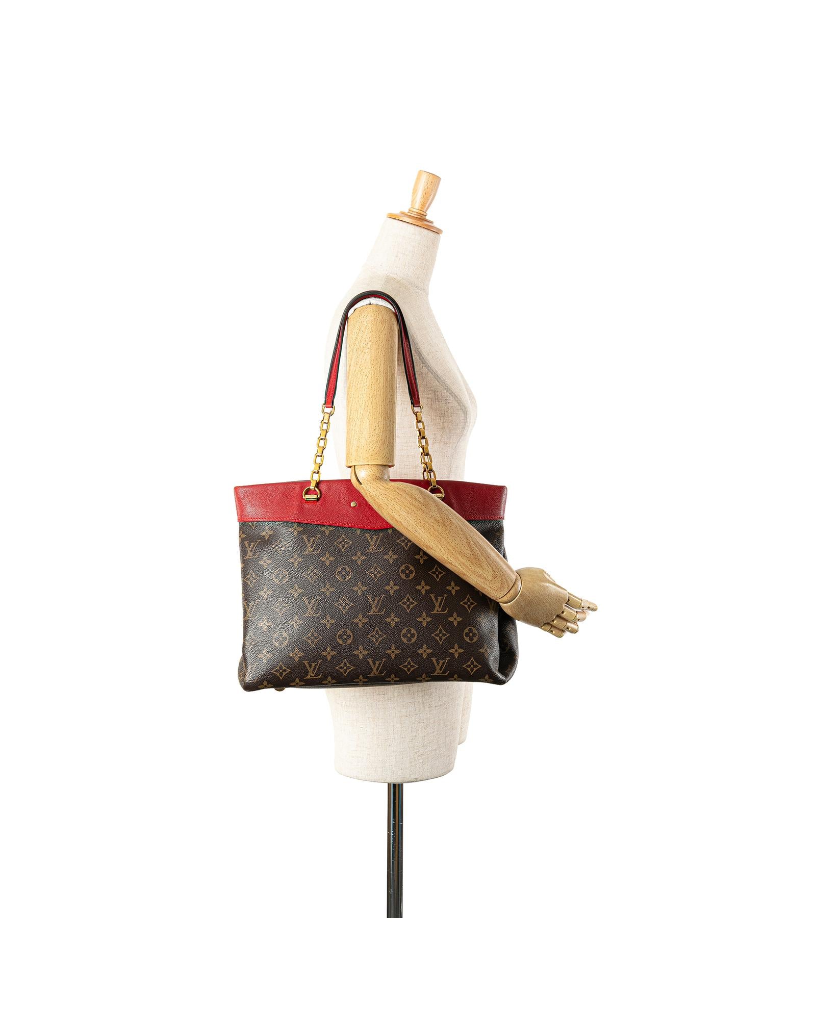 The Pallas Shopper features a monogram canvas body with leather trim chain-links straps with leather guard an open top and interior zip and slip pockets.Brand: Louis Vuitton Vintage