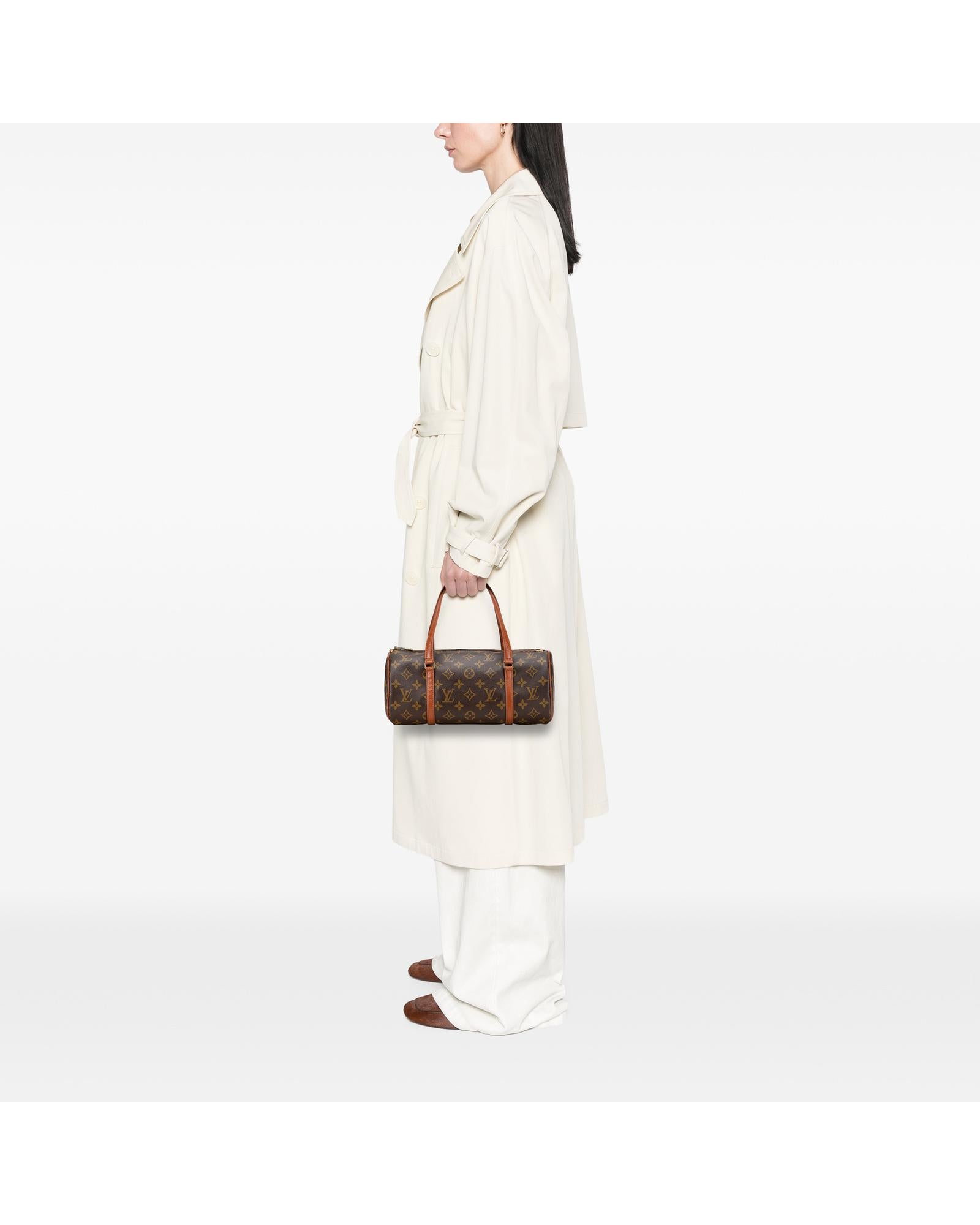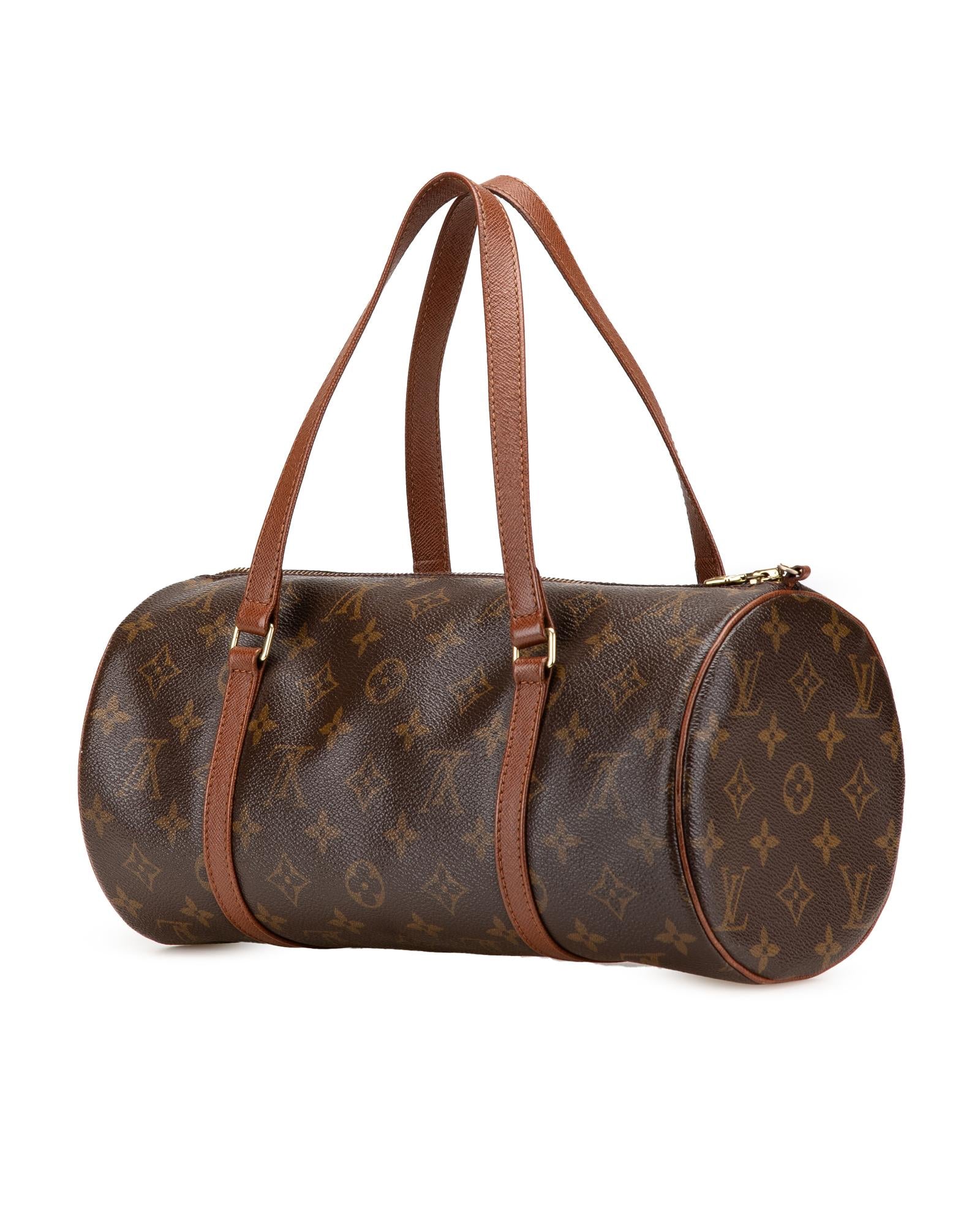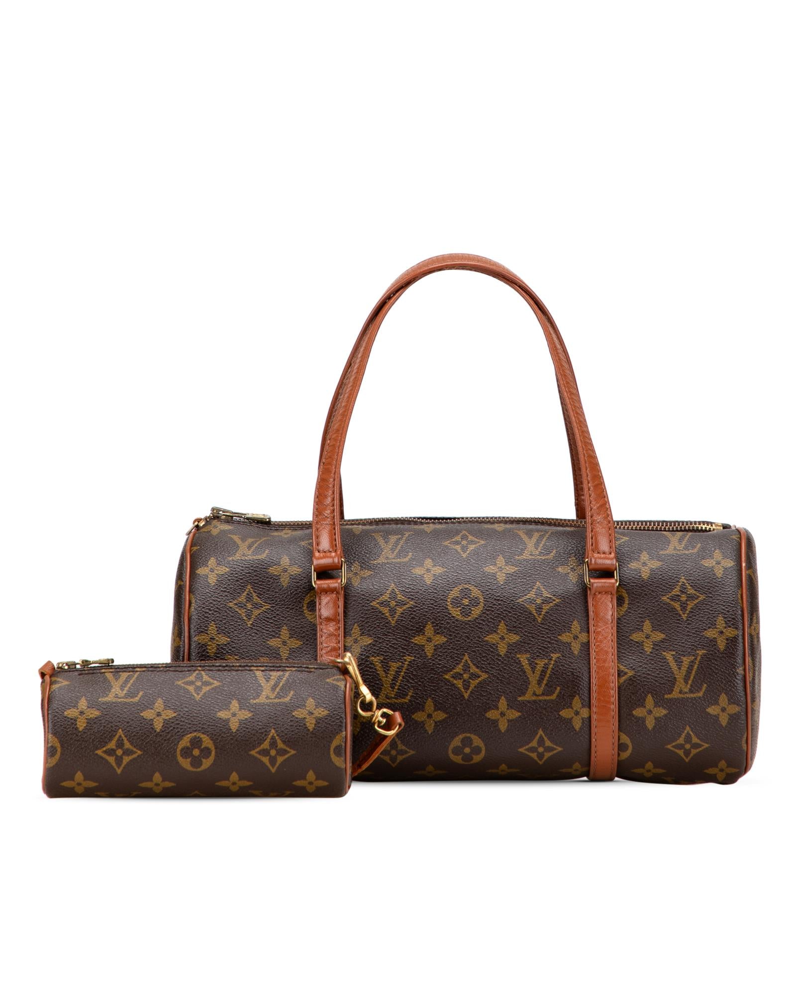 The Papillon 30 features a monogram canvas body with leather trim flat leather handles a top zip closure and a pouch inclusion.