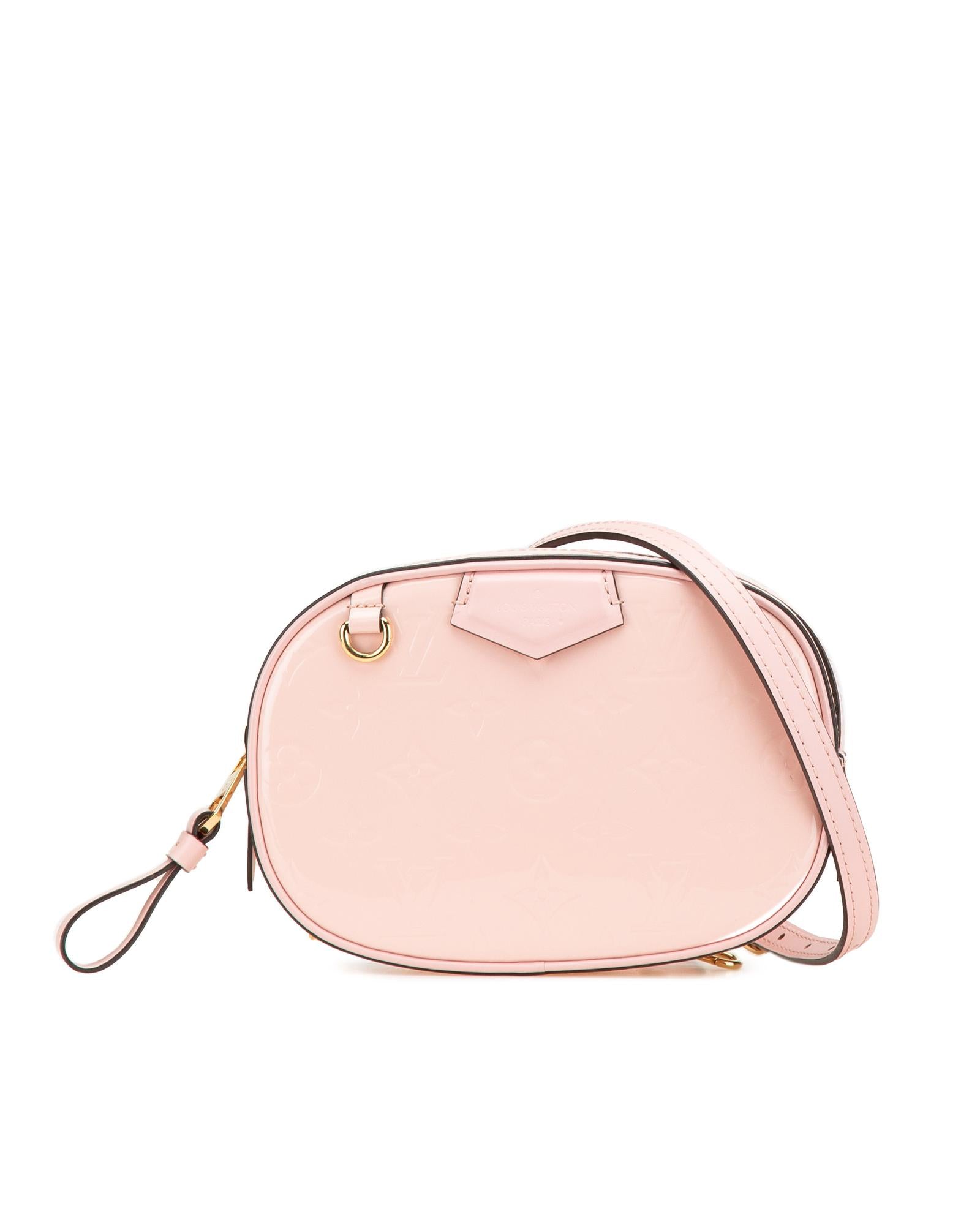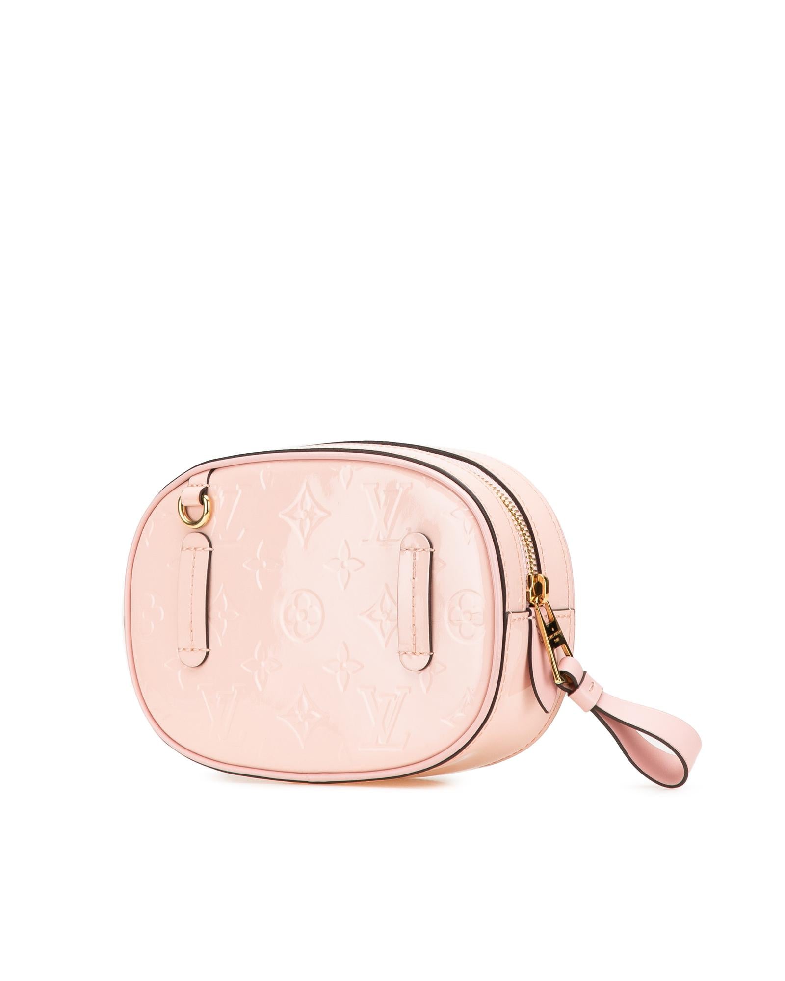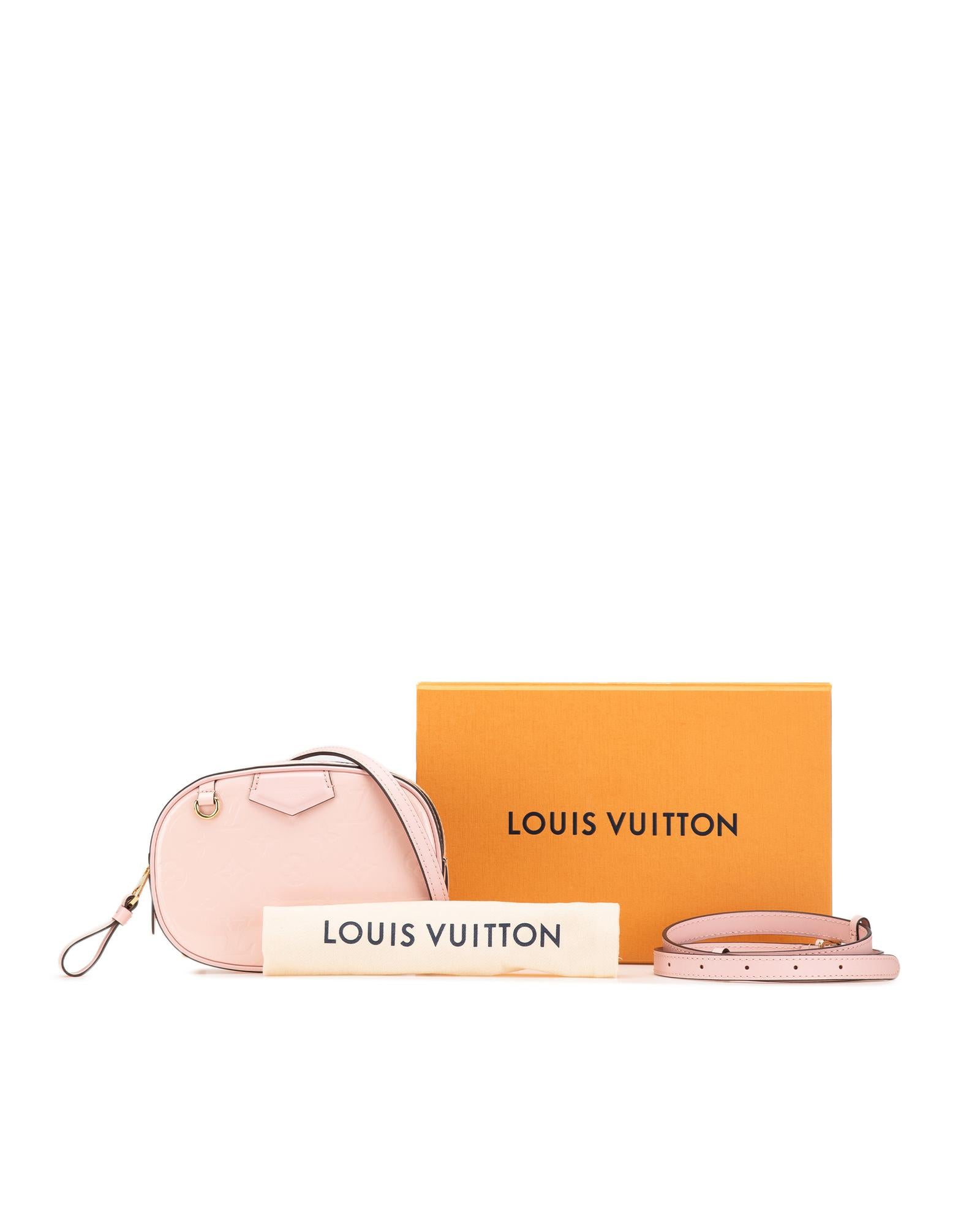This belt bag features a monogram vernis leather body an adjustable and convertible flat leather strap a top zip closure and an interior slip pocket.