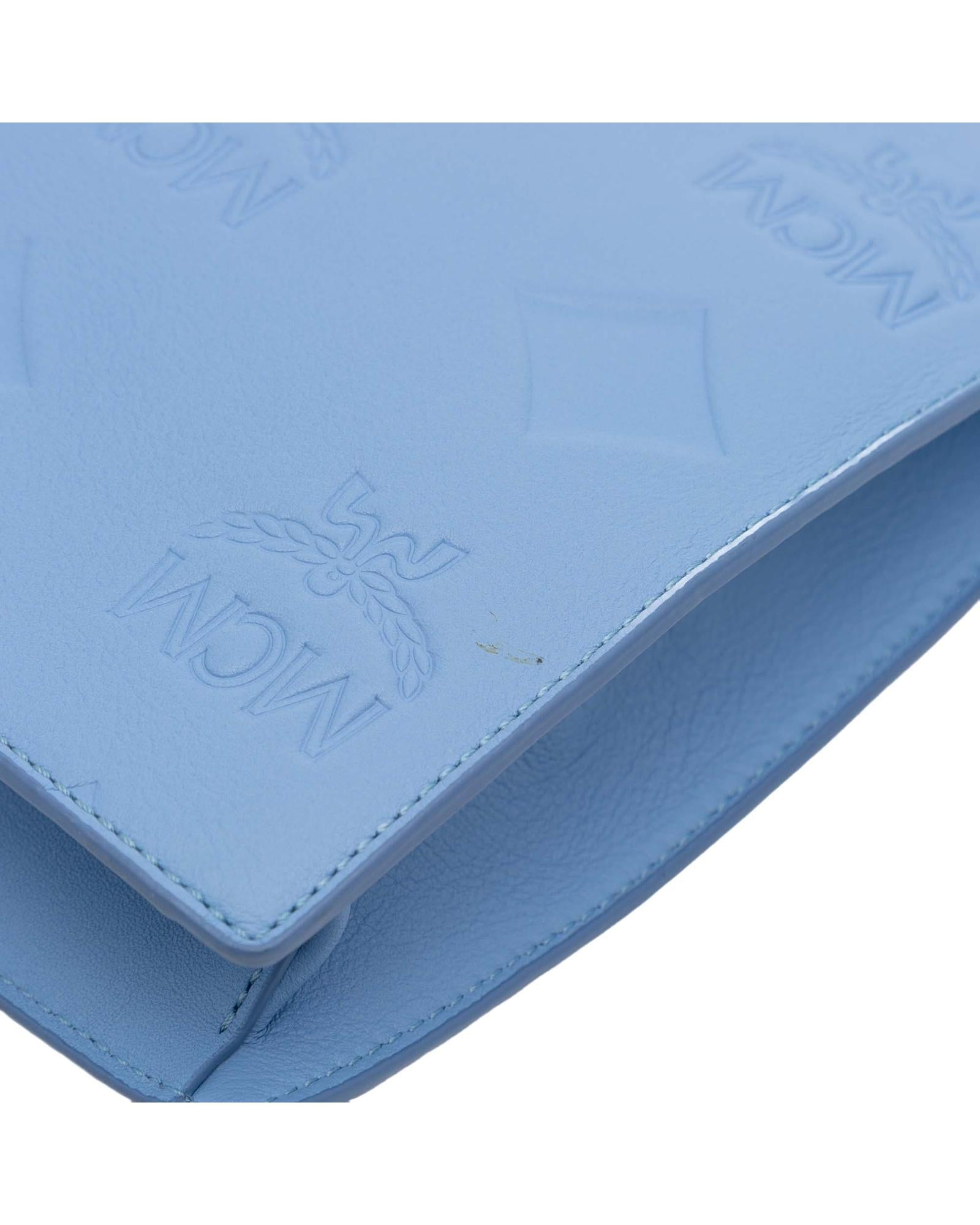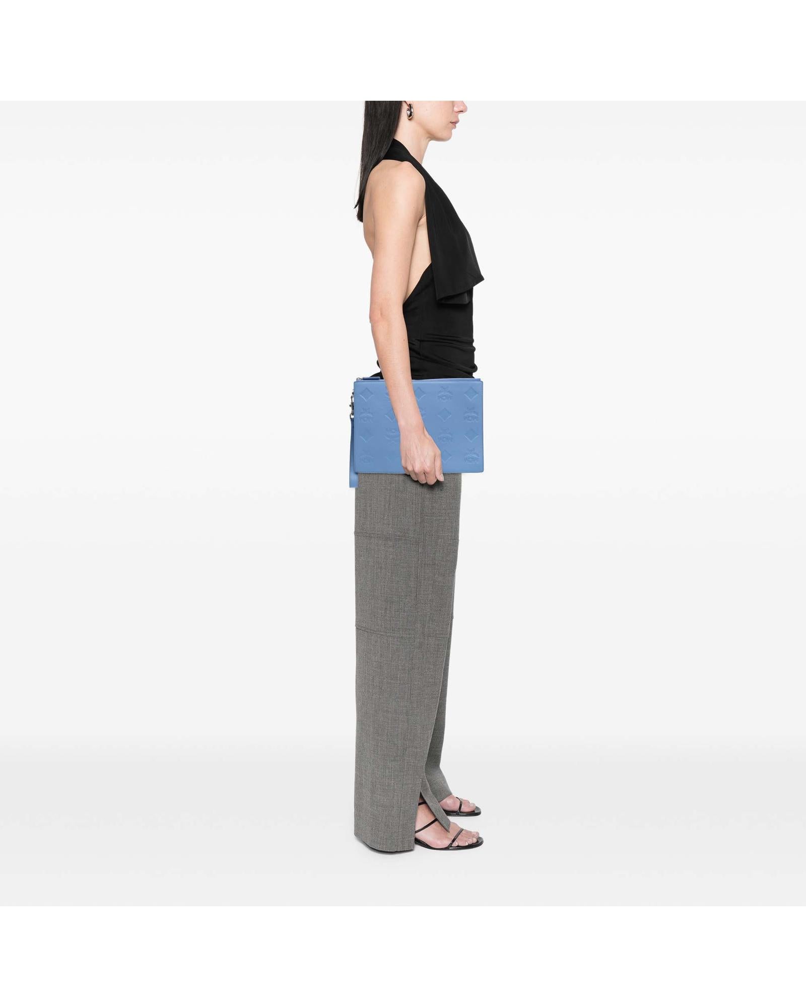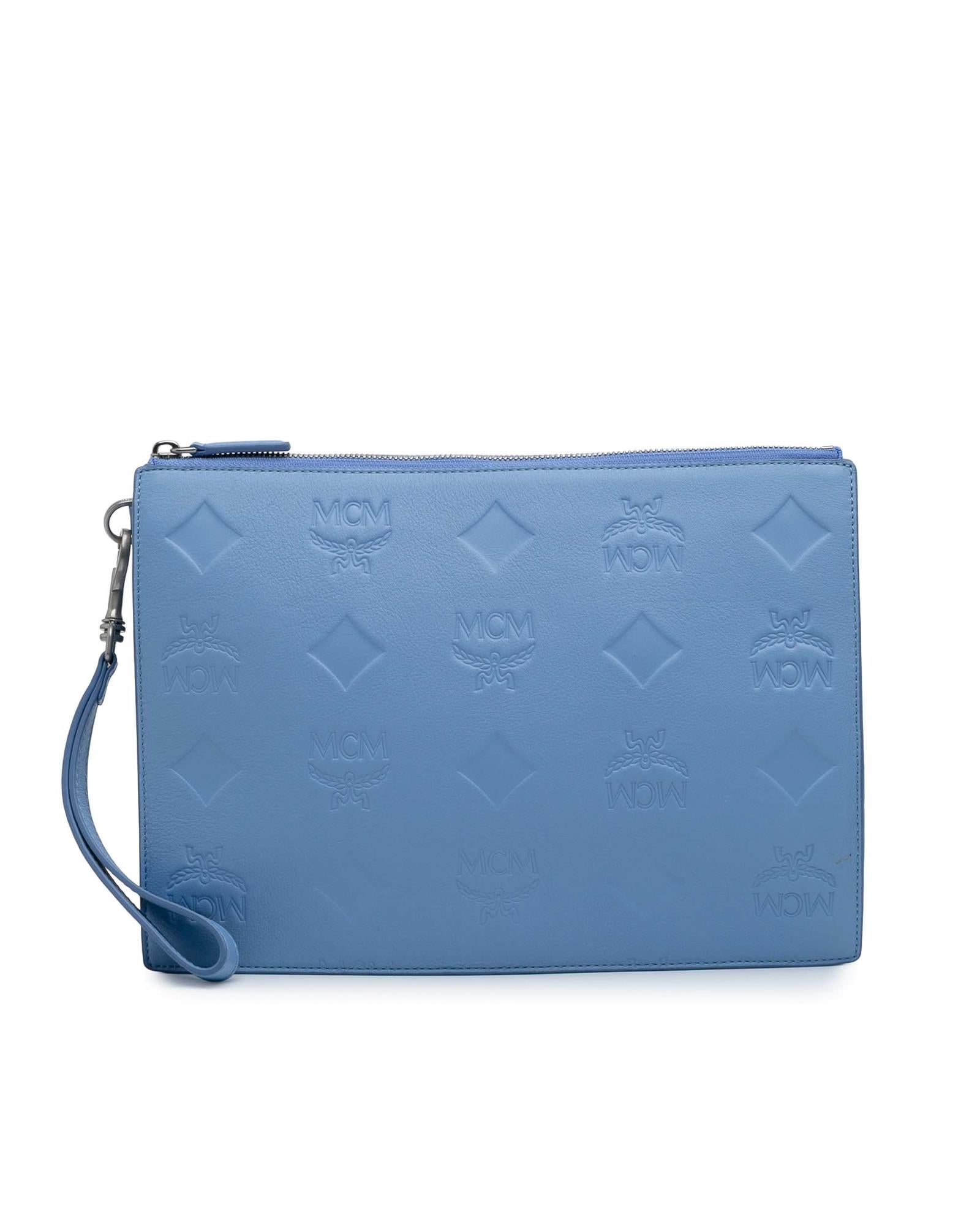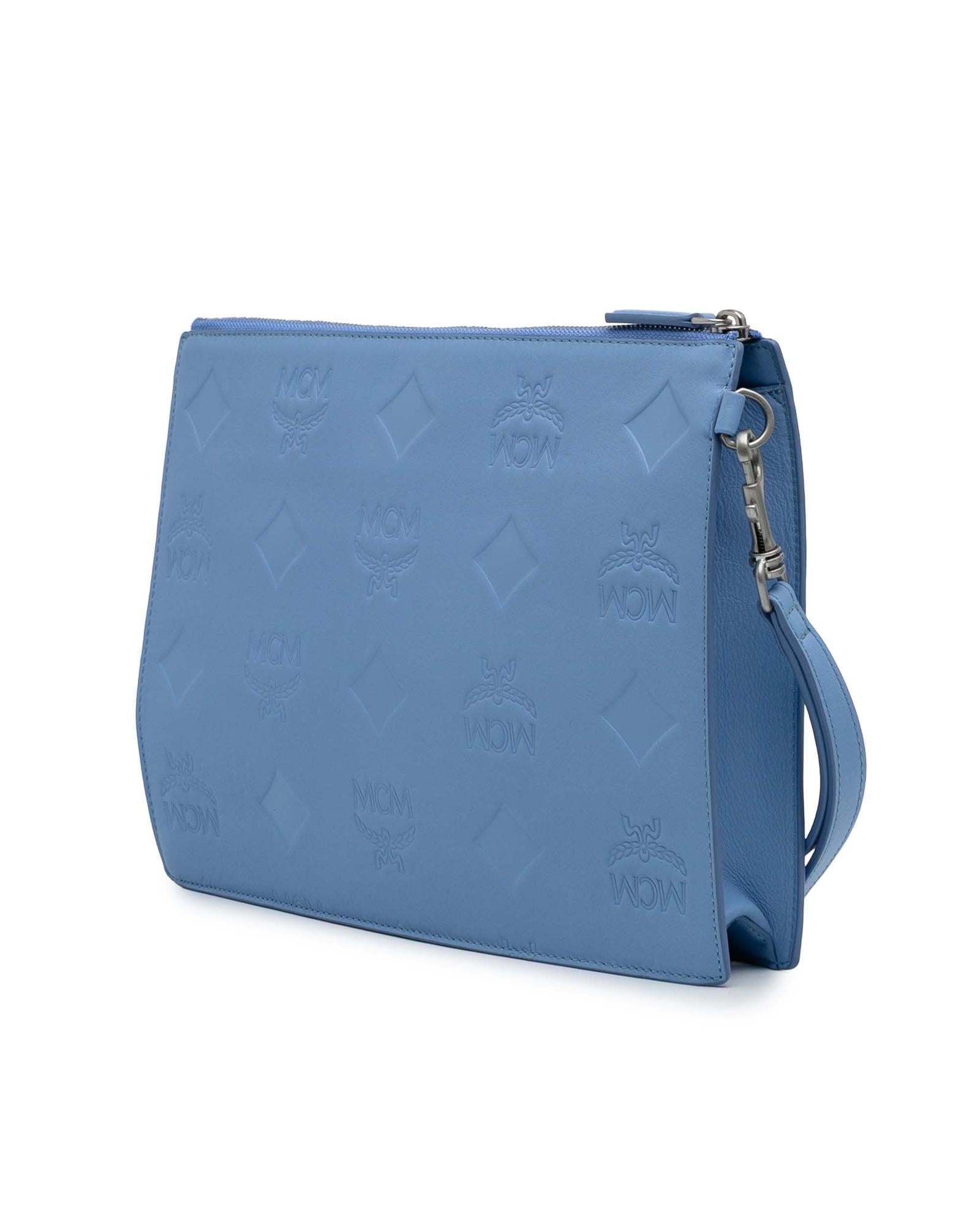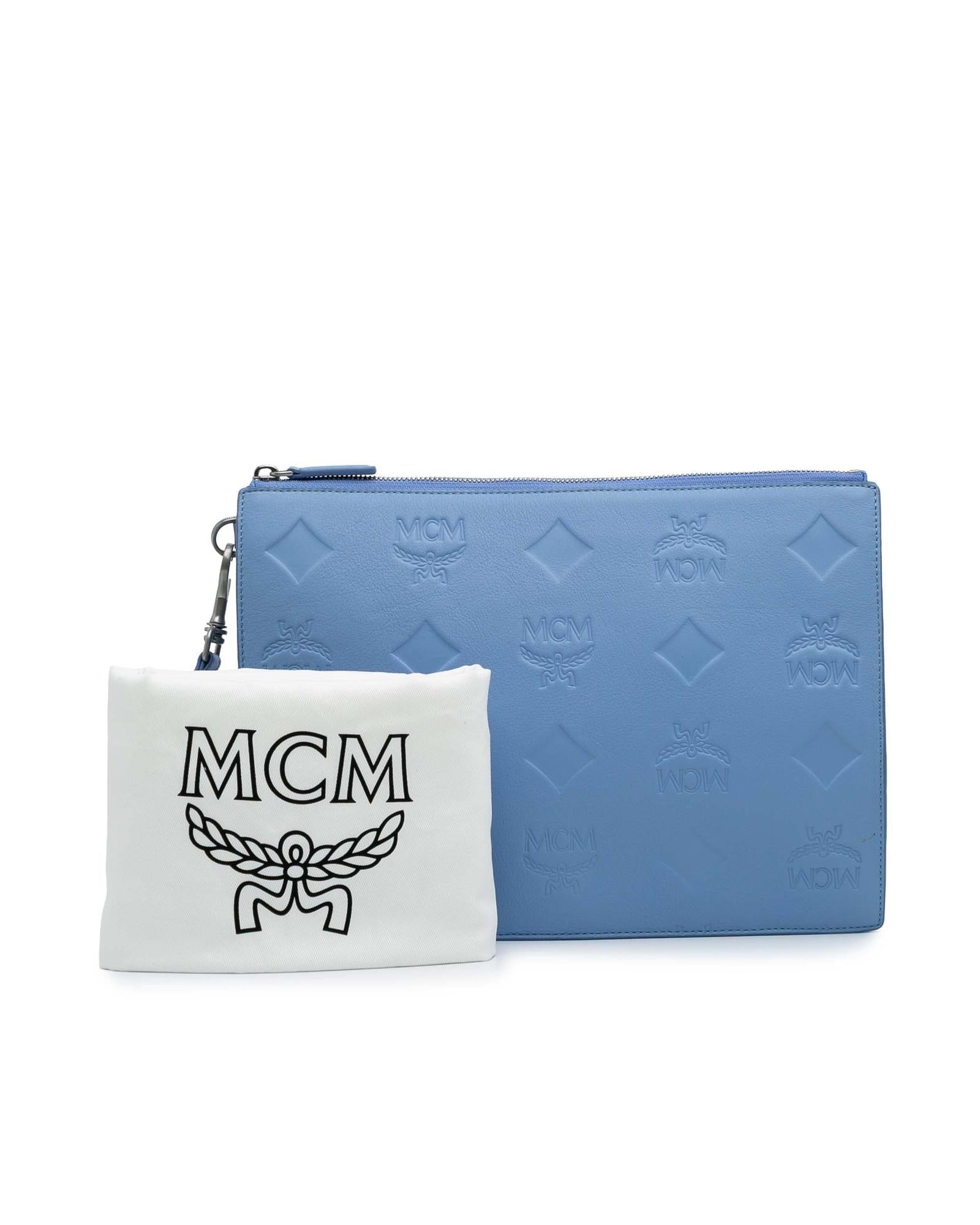 This clutch features a leather body a detachable flat wrist strap a top zip closure and an interior zip pocket.Brand: MCM