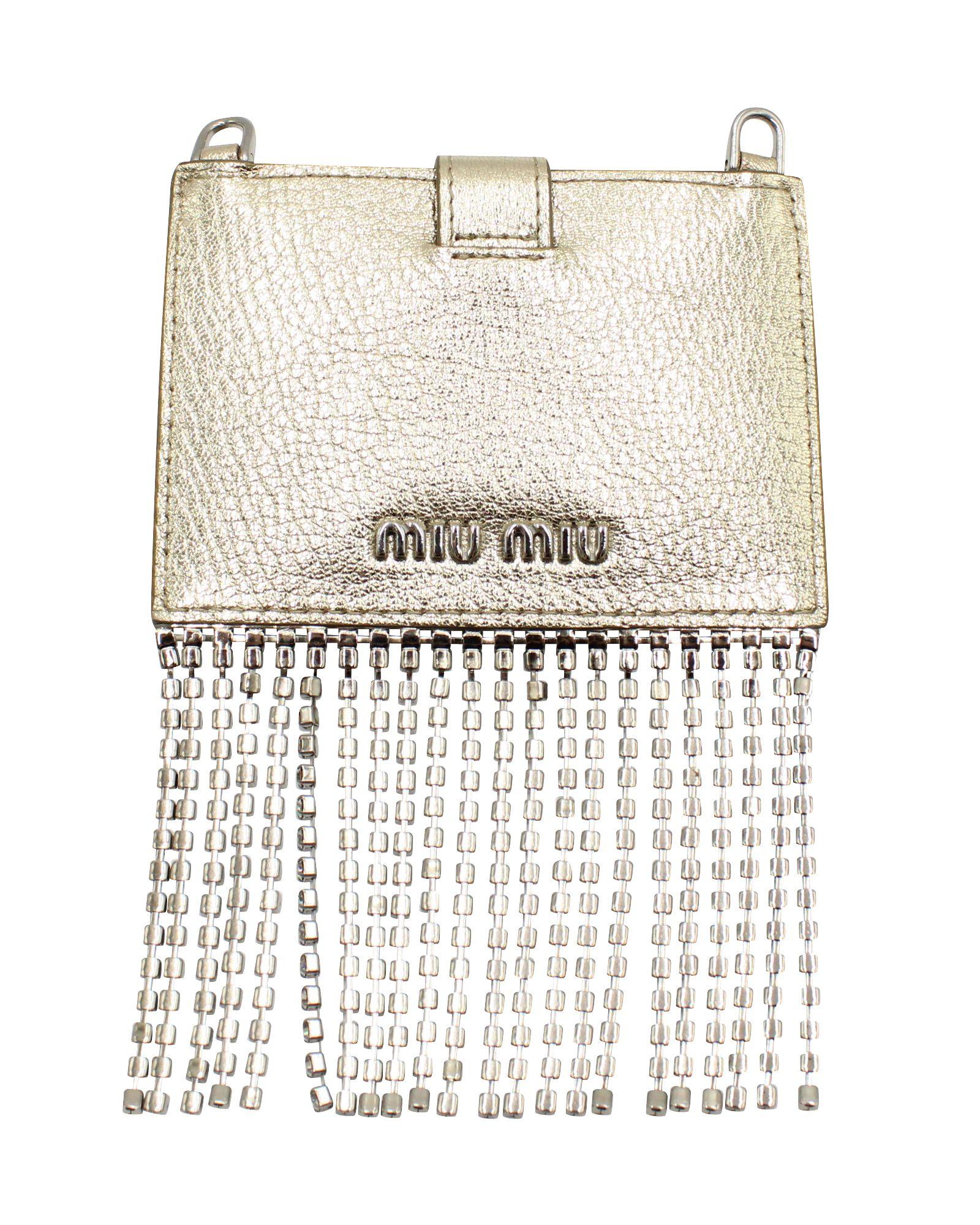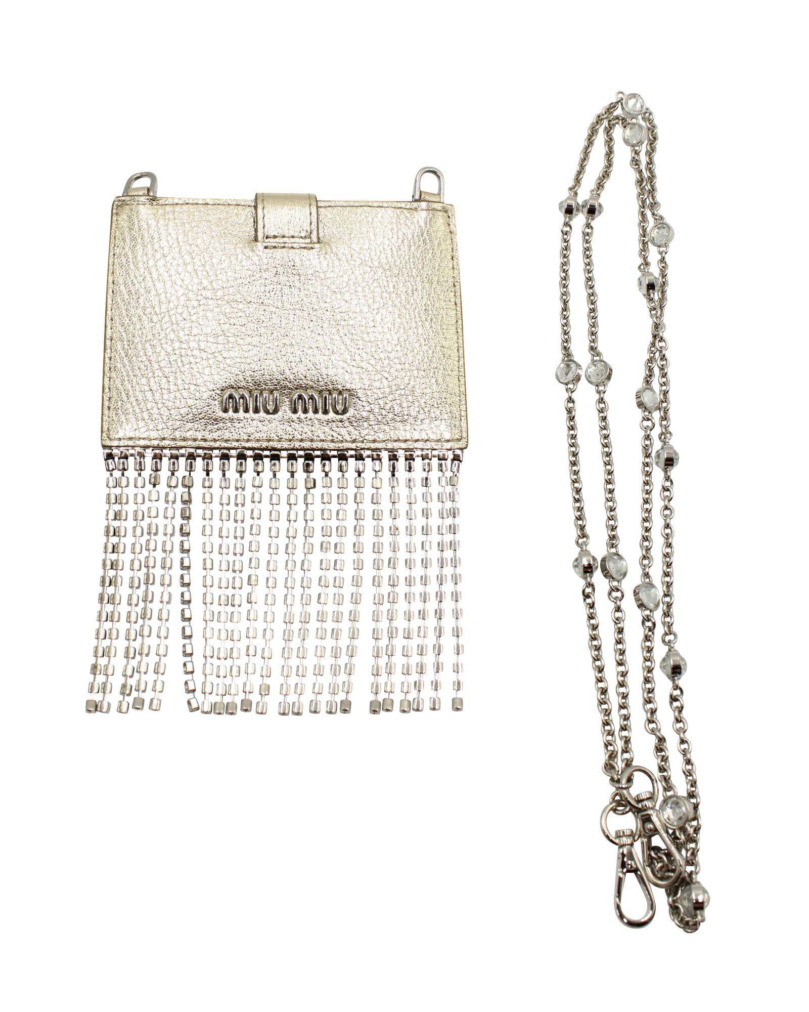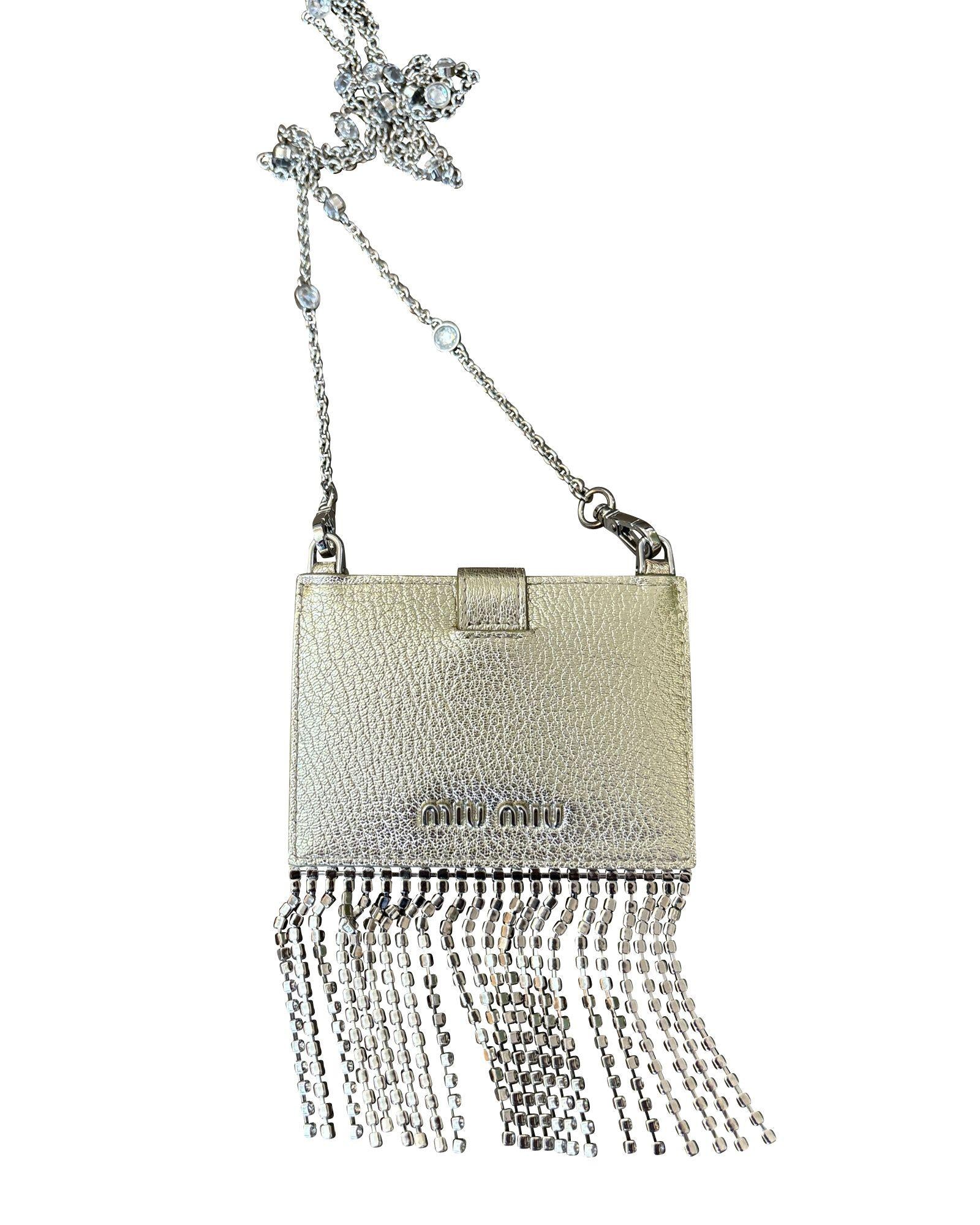 - Luxurious Miu Miu Madras Card Holder with Crystal Fringe in Silver Goatskin Leather Made from high