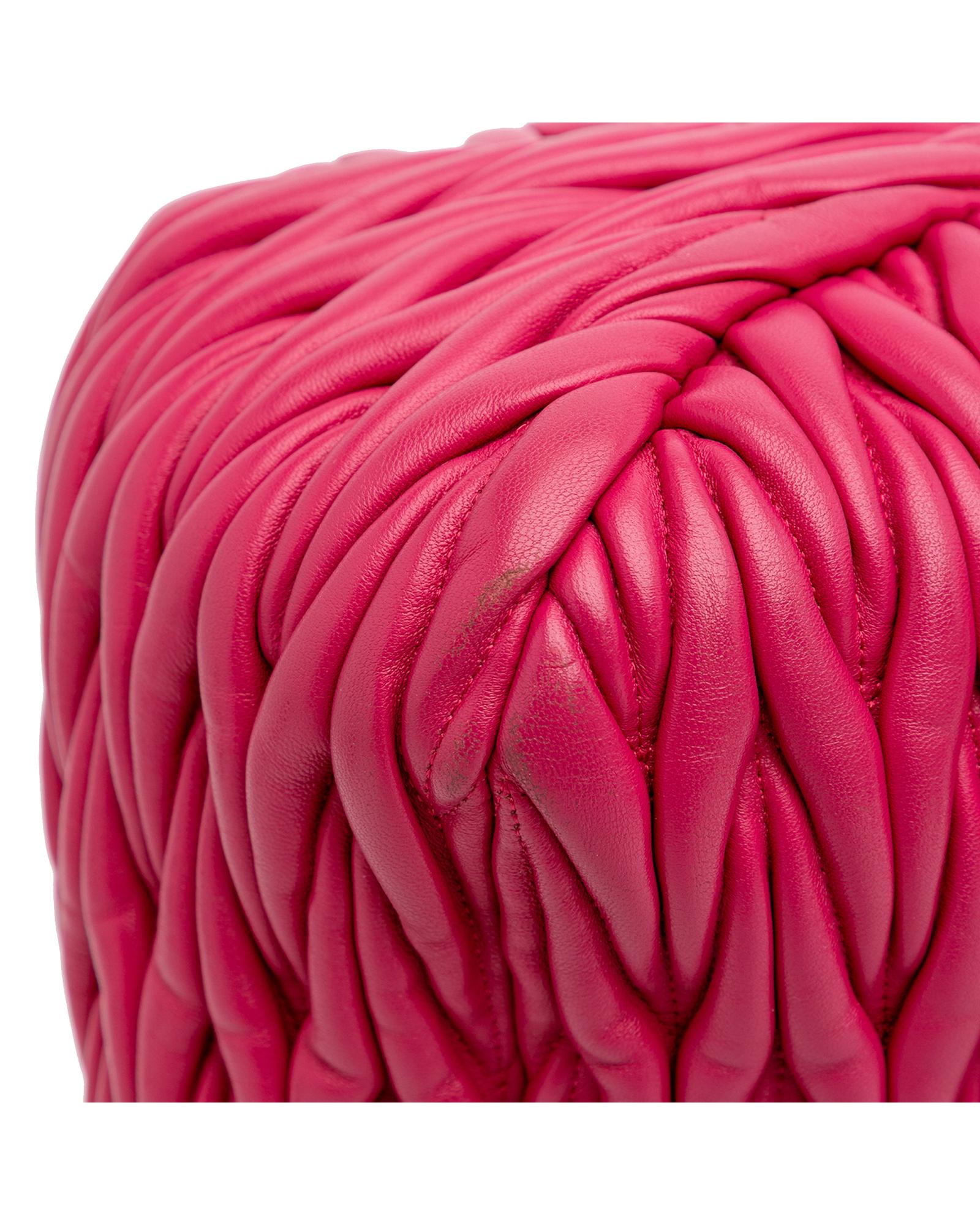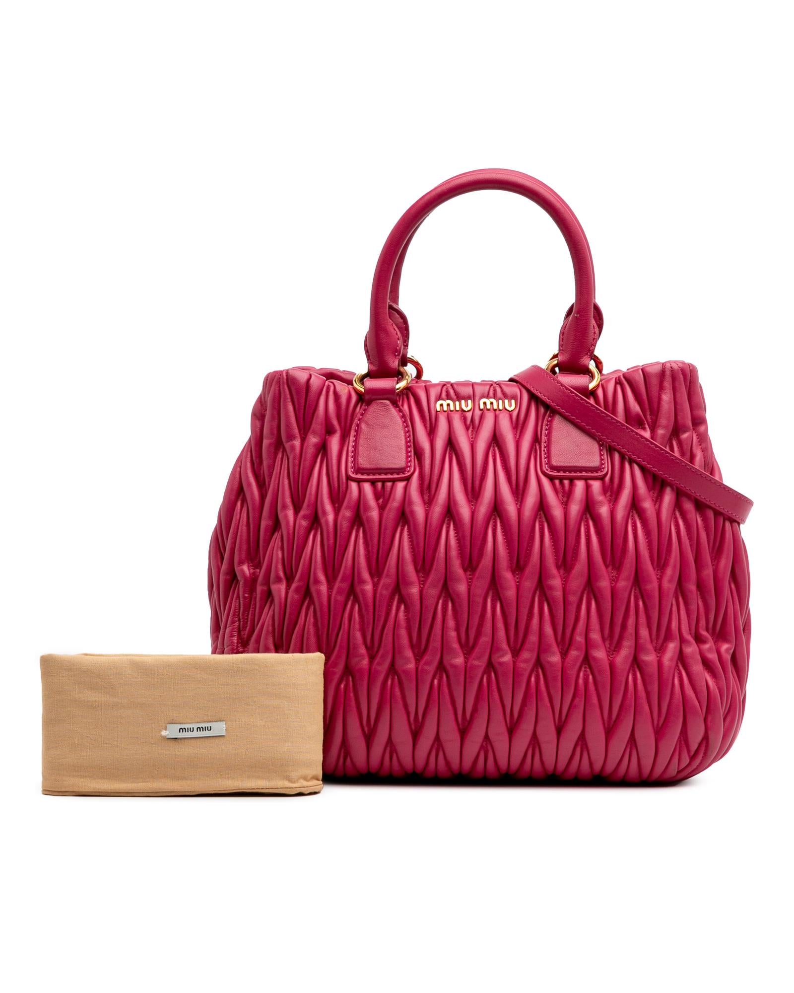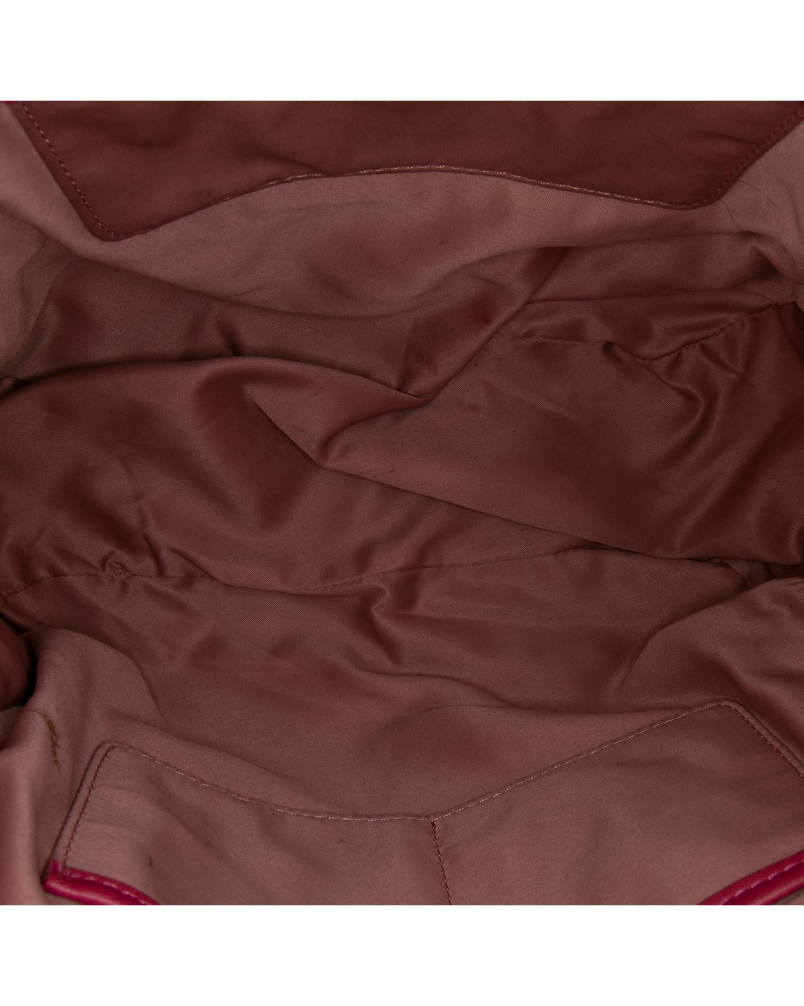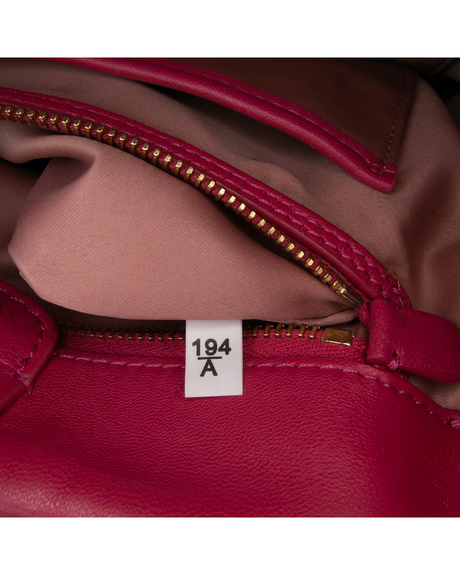 This satchel features a gathered nappa leather body rolled leather handles a detachable flat leather shoulder strap an open top with a snap button closure and interior zip and slip pockets. The bottom was repainted.