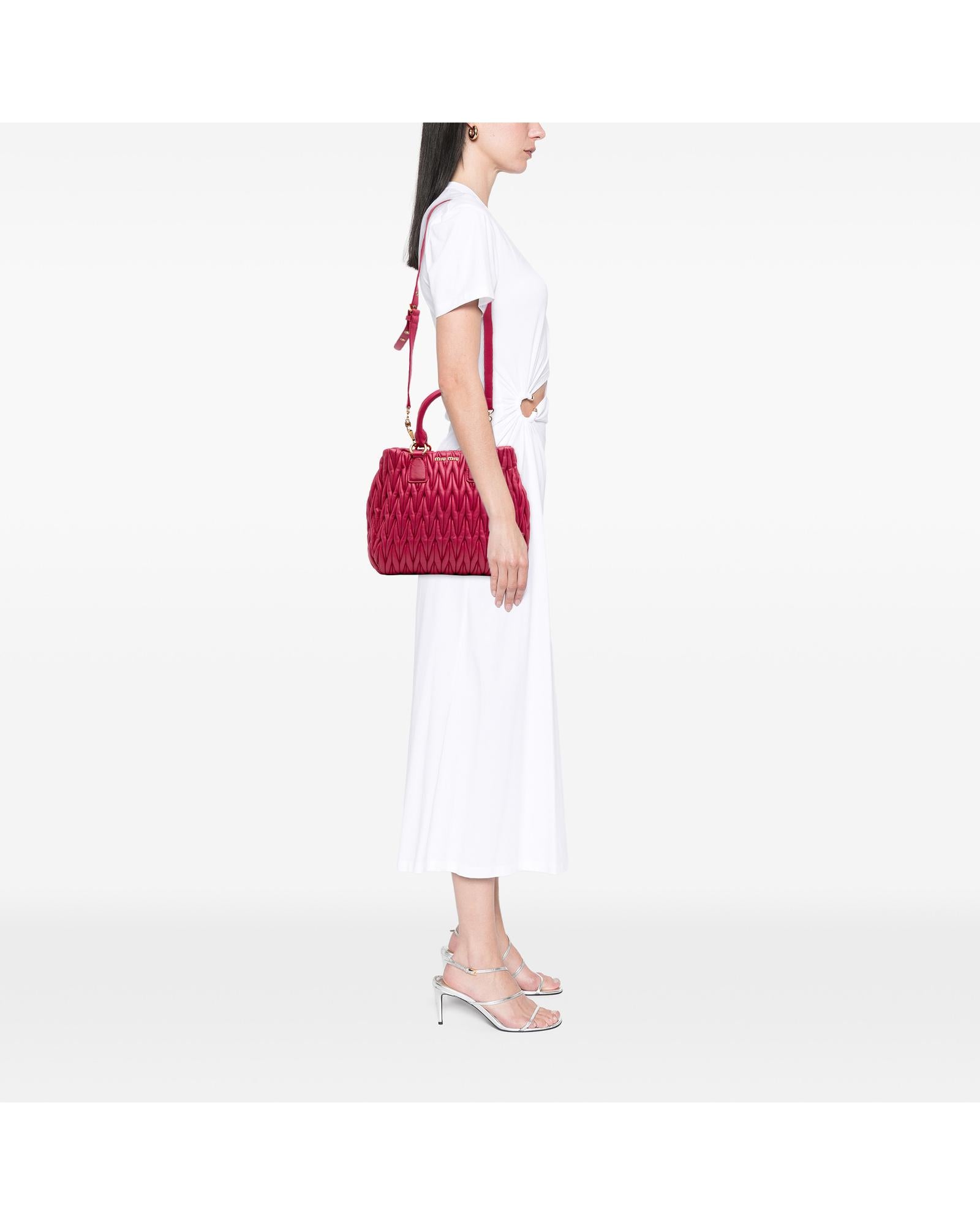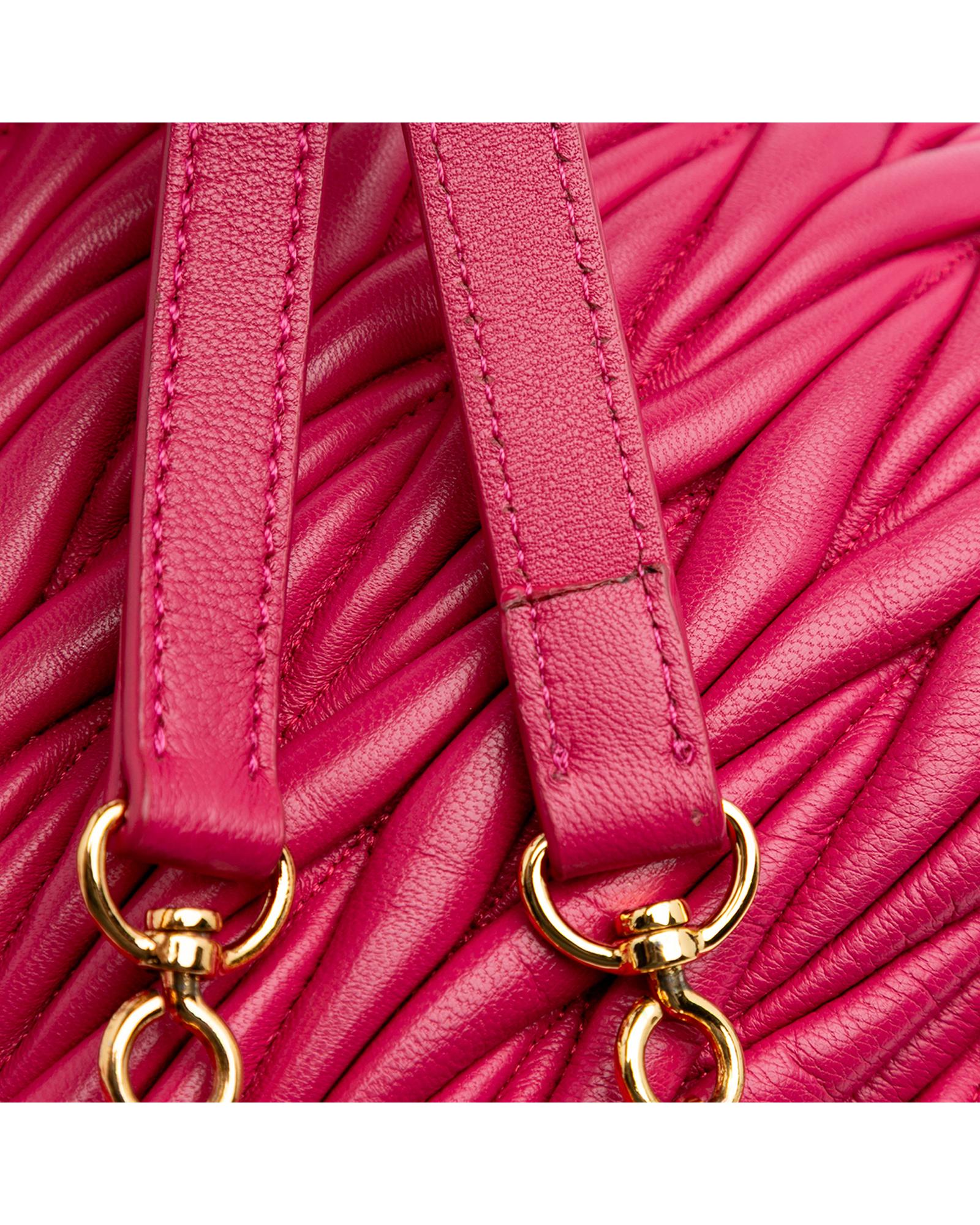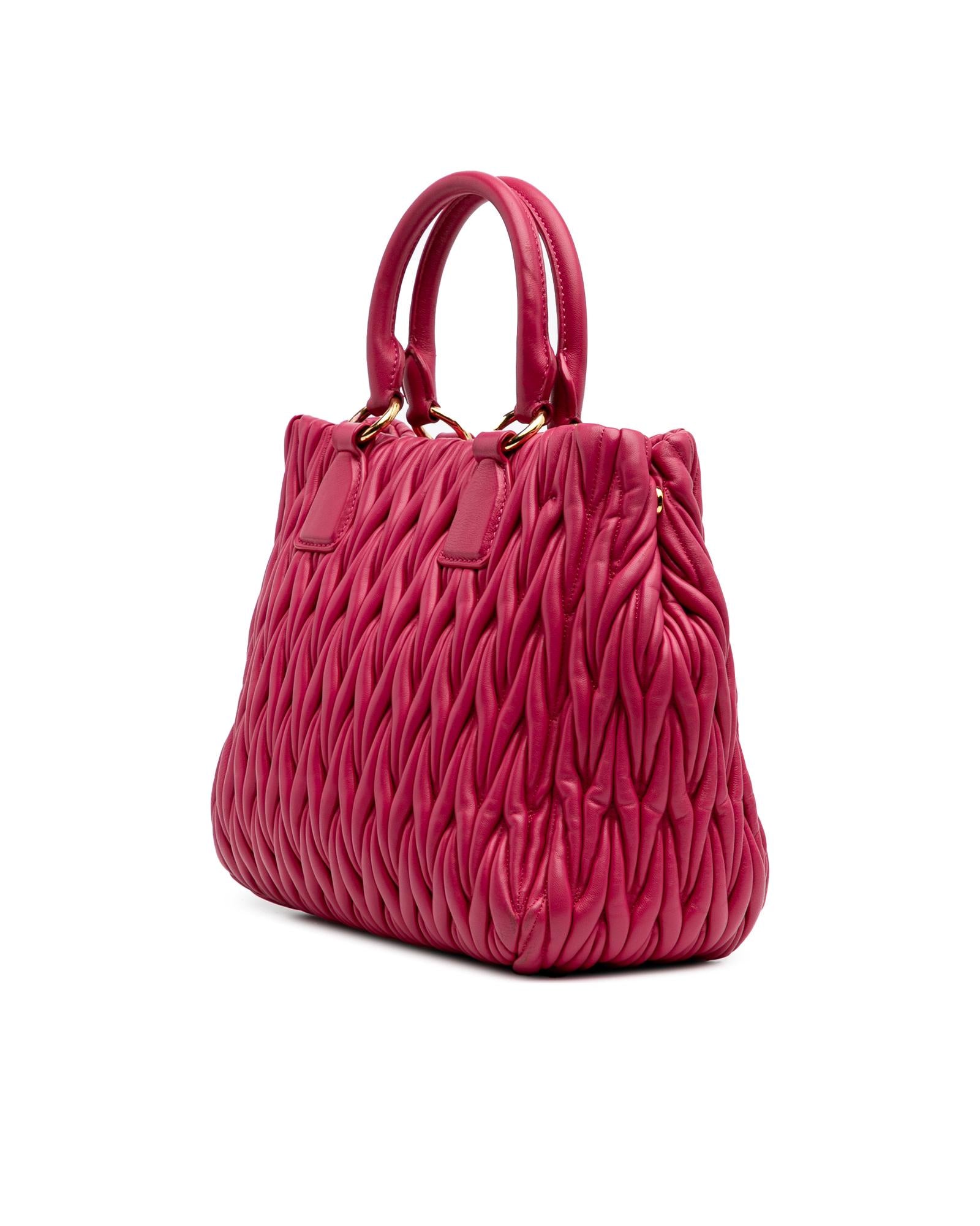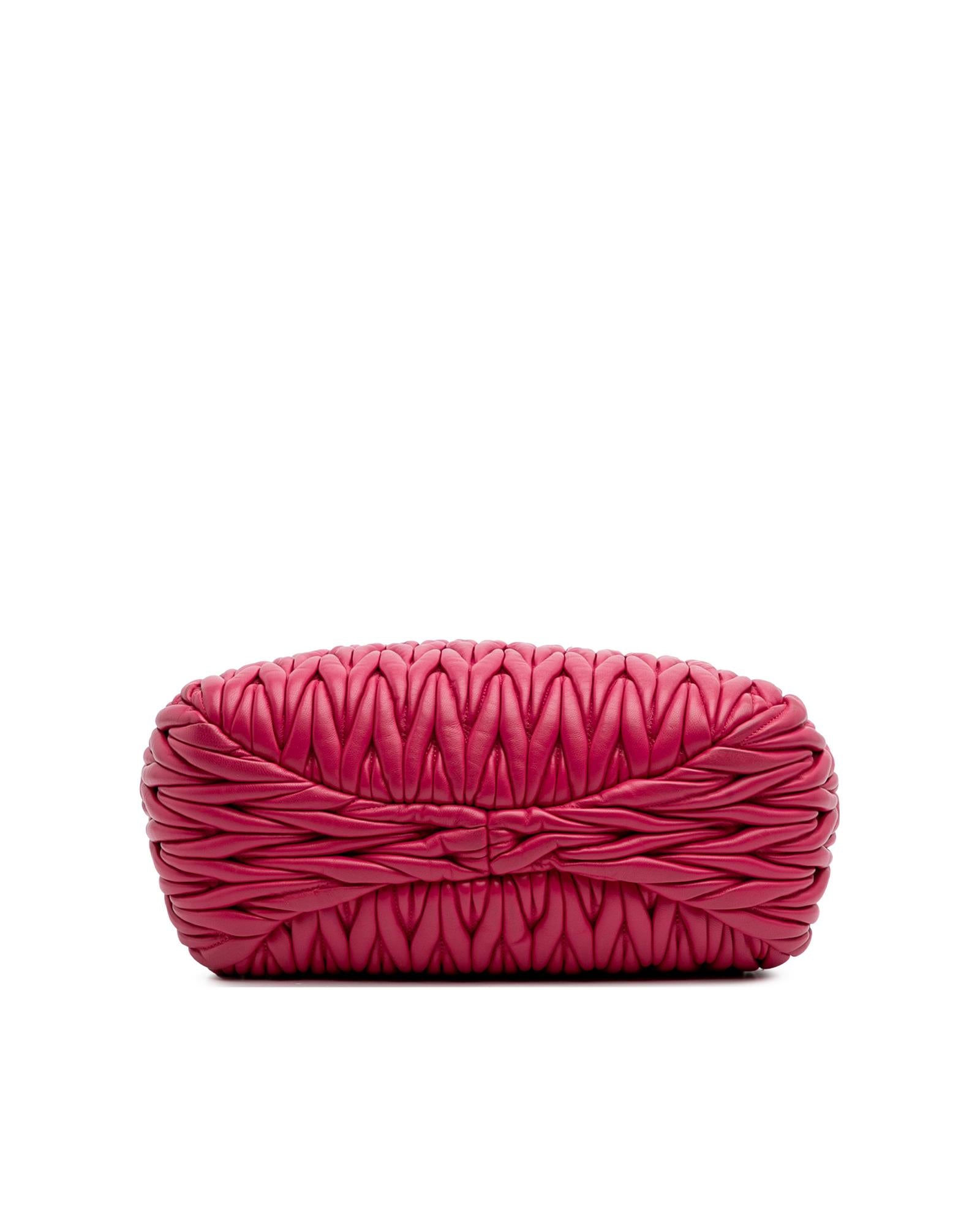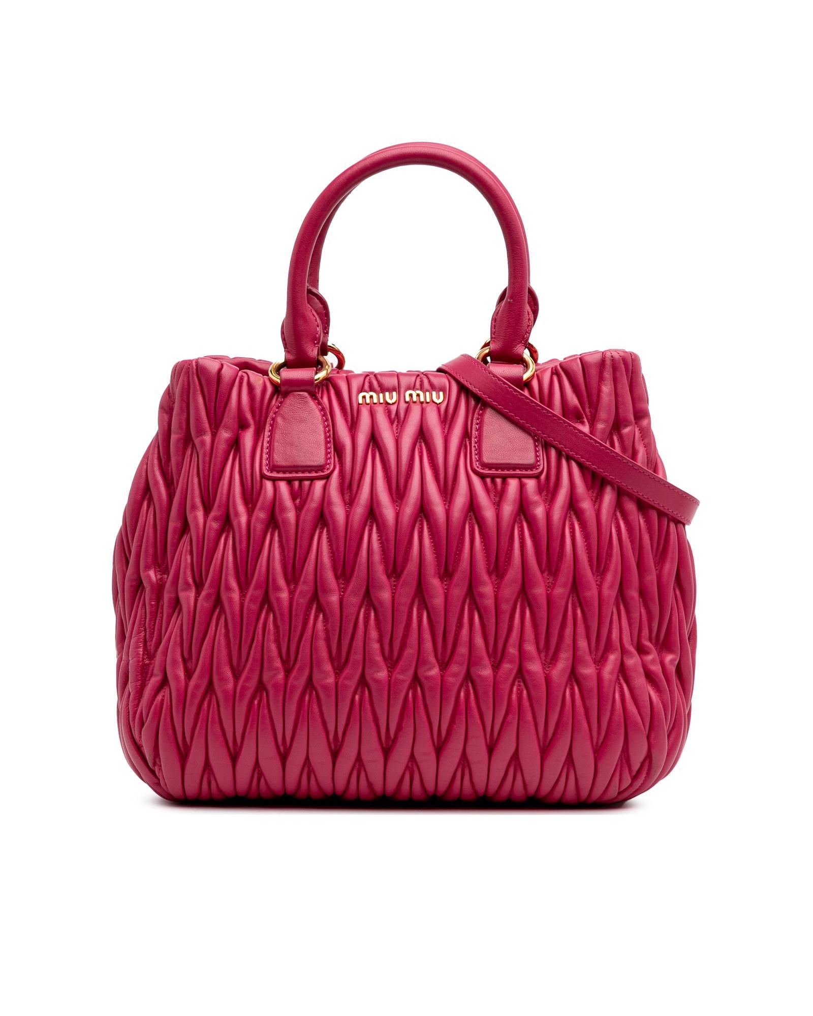 This satchel features a gathered nappa leather body rolled leather handles a detachable flat leather shoulder strap an open top with a snap button closure and interior zip and slip pockets. The bottom was repainted.