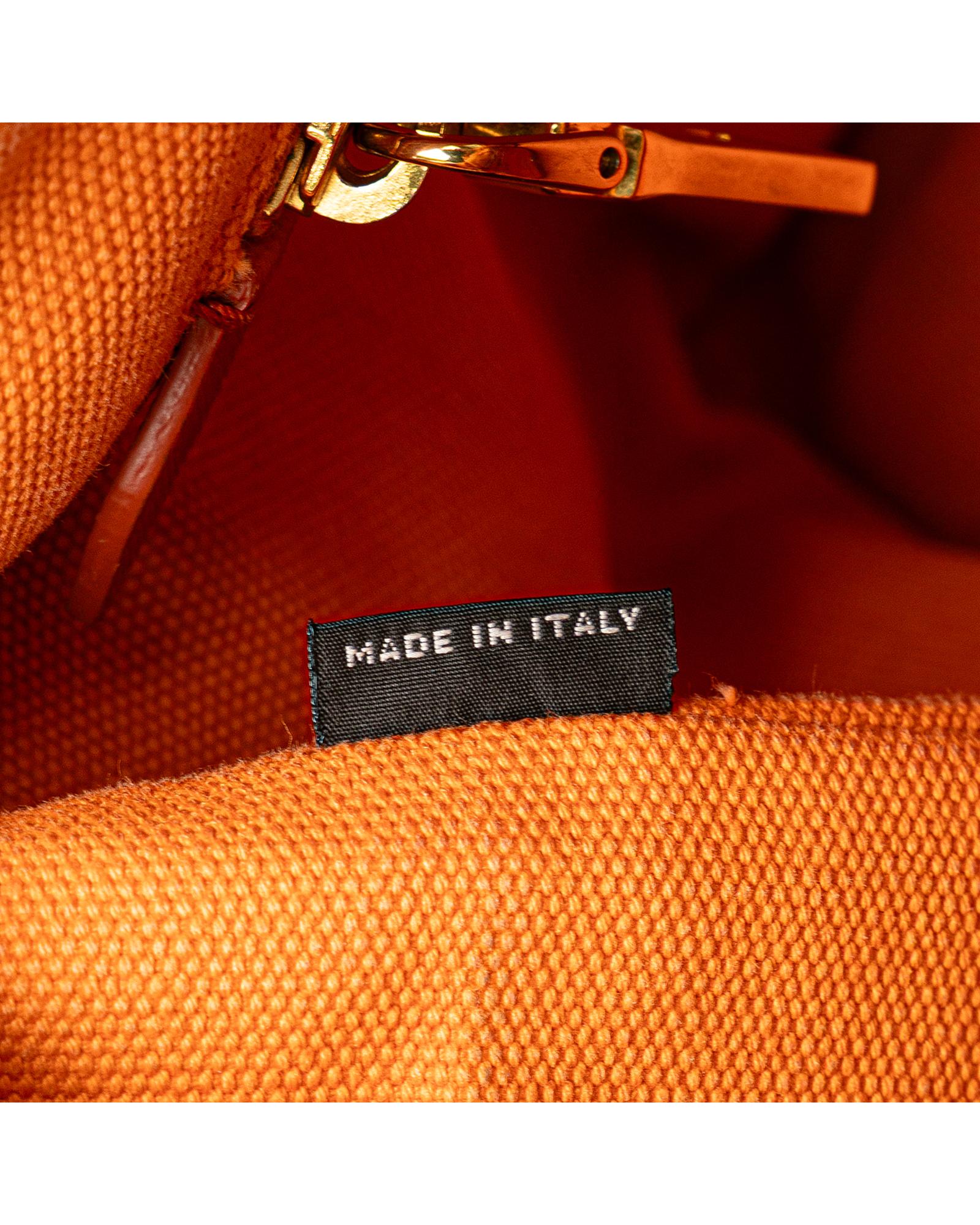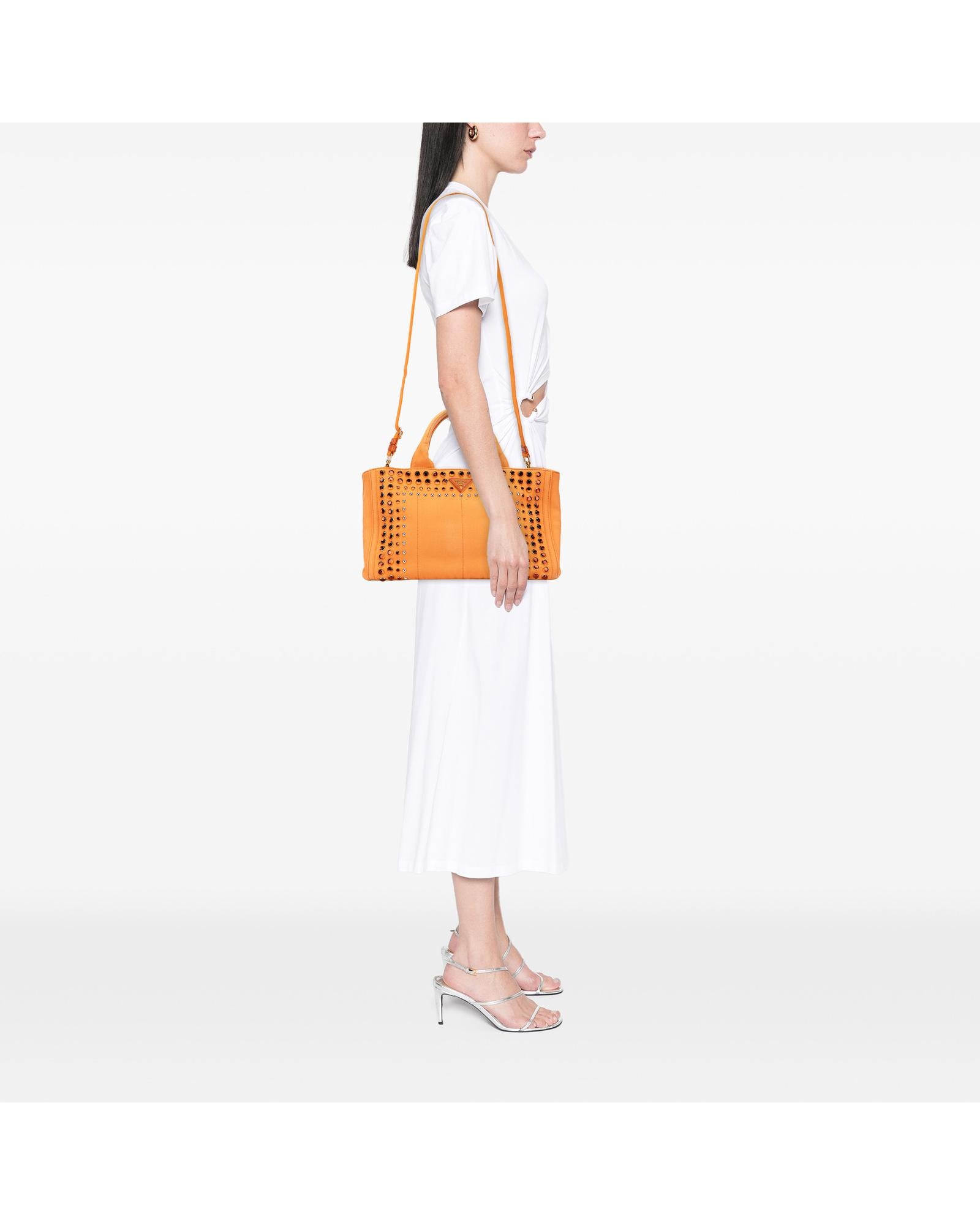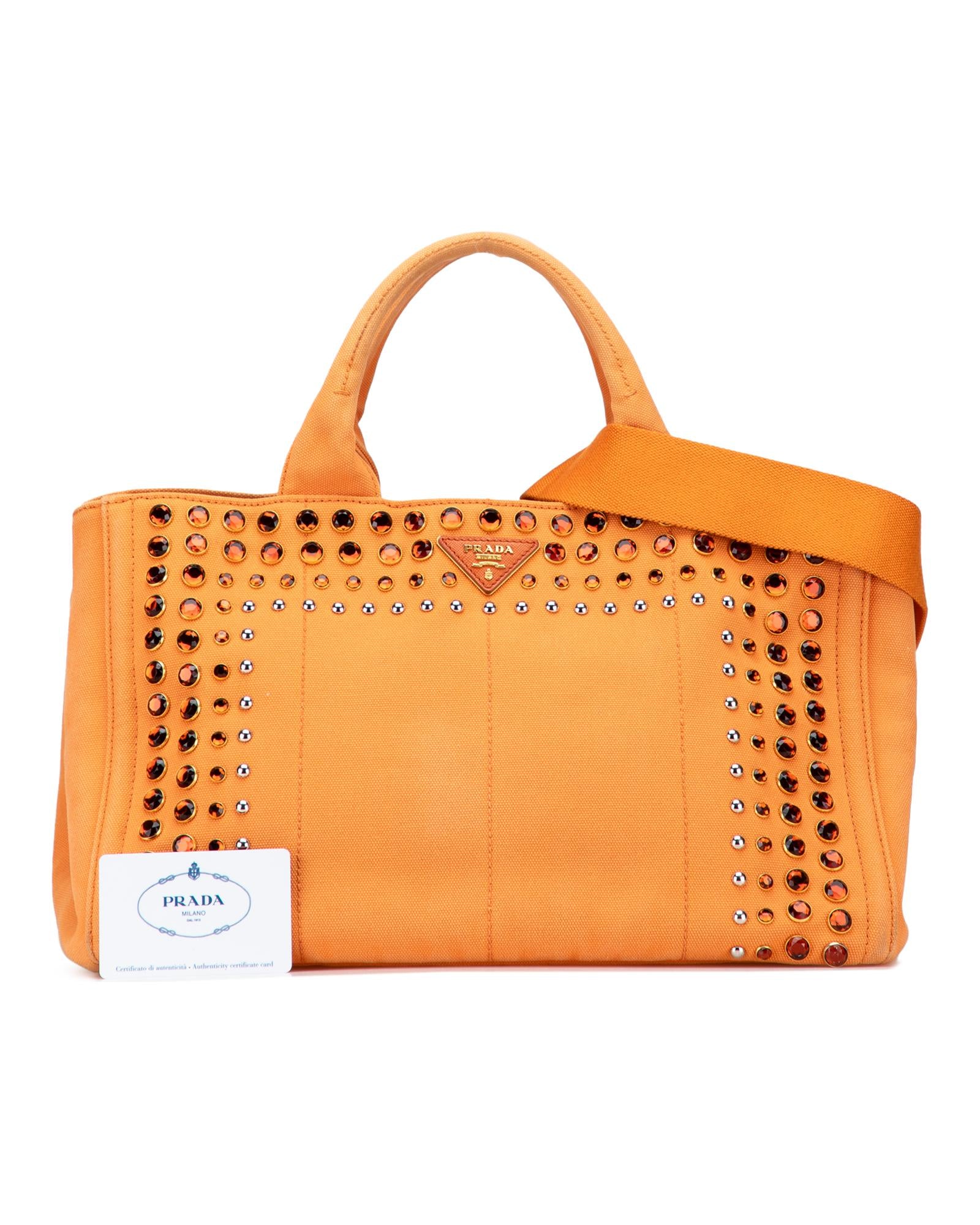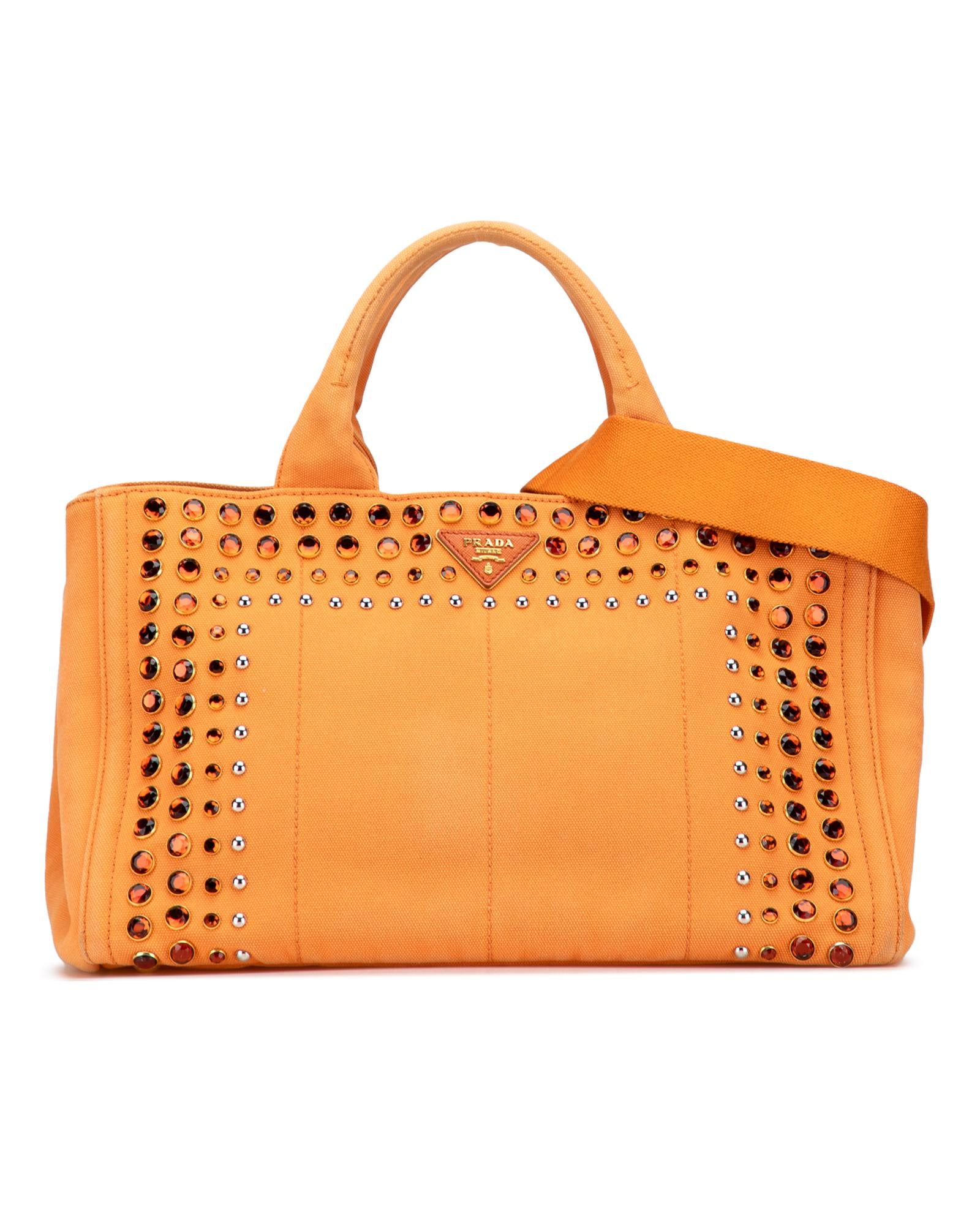 This satchel features a studded canvas body rolled top handles a detachable and adjustable flat shoulder strap an open top and interior zip and slip pockets.Brand: Prada Vintage