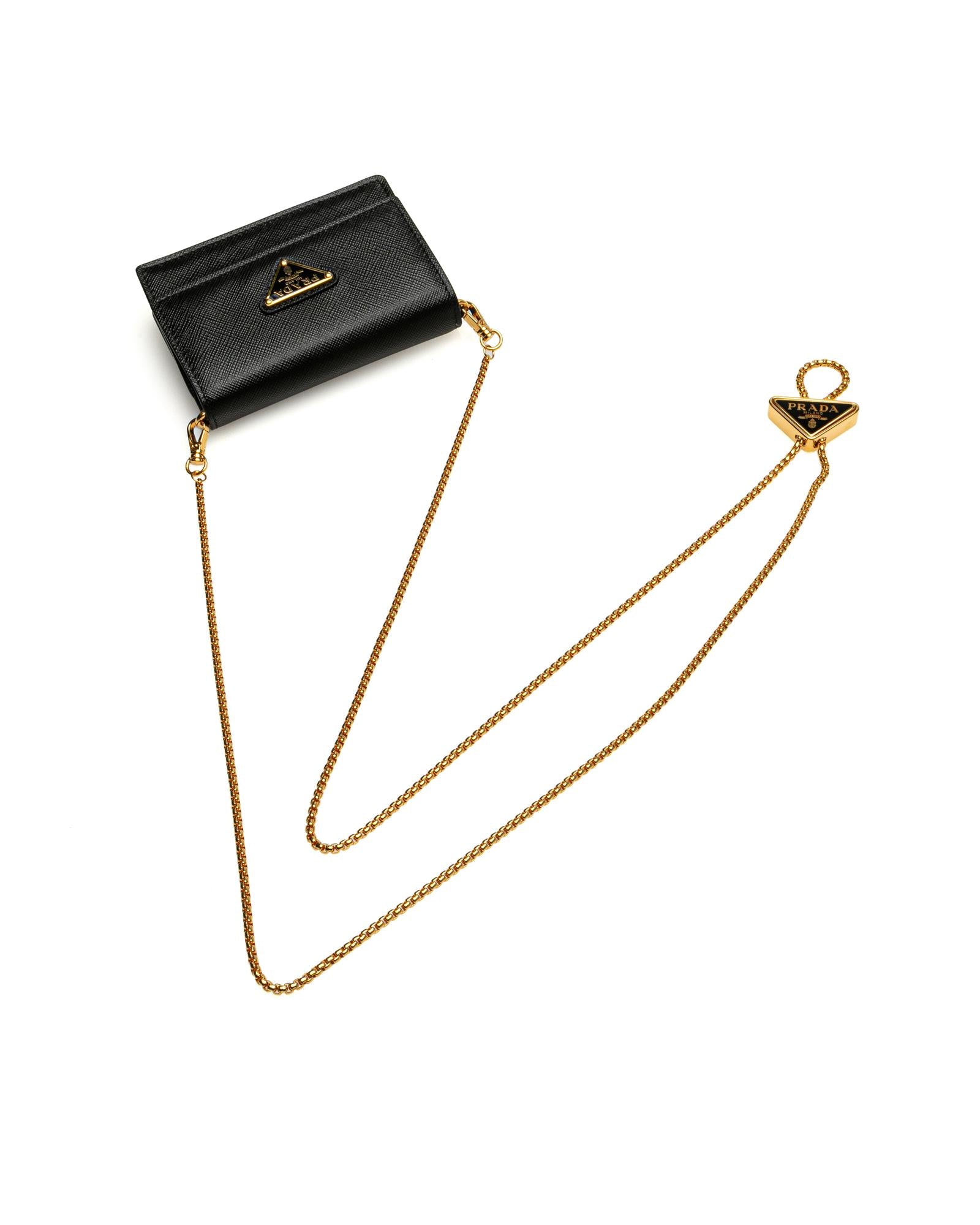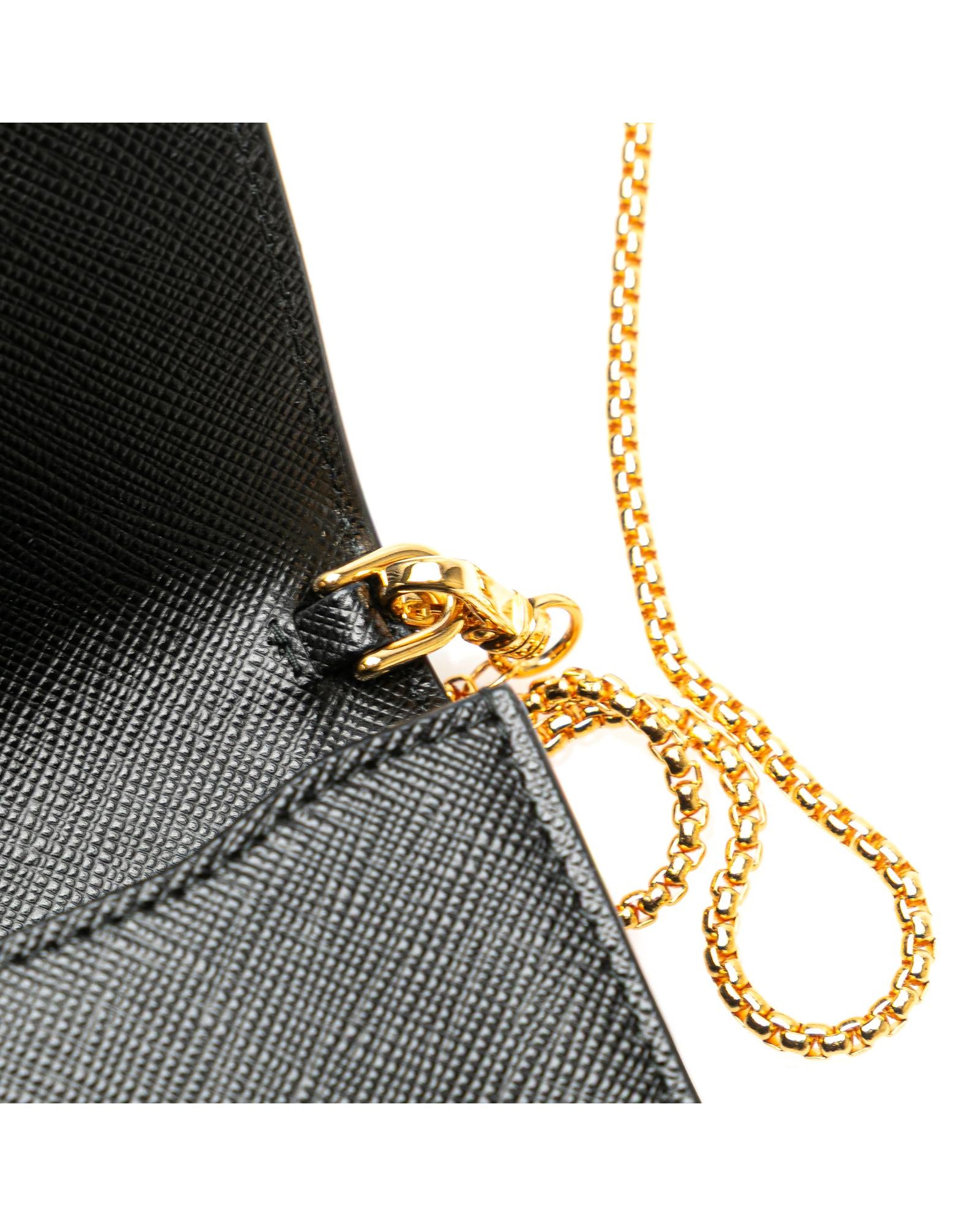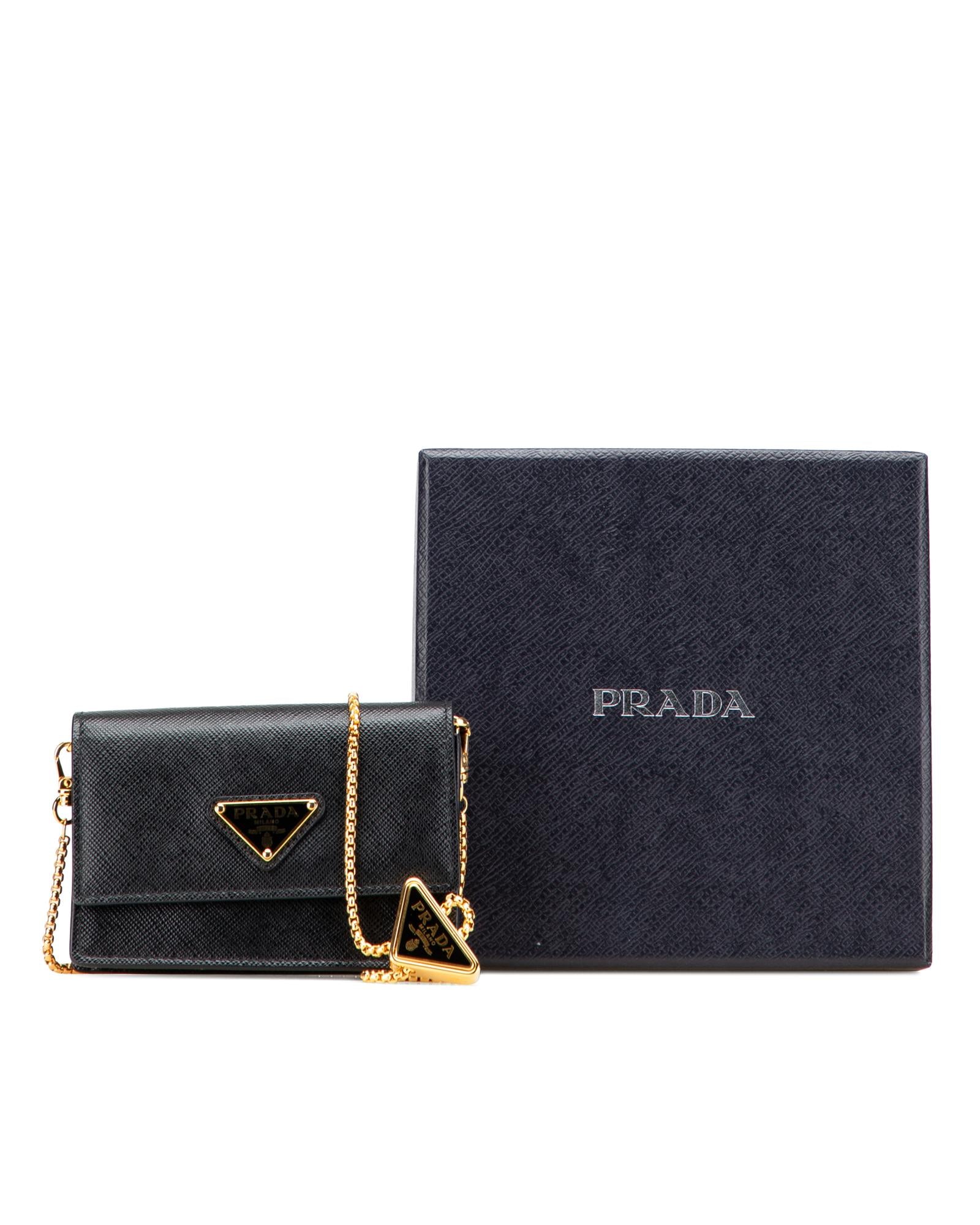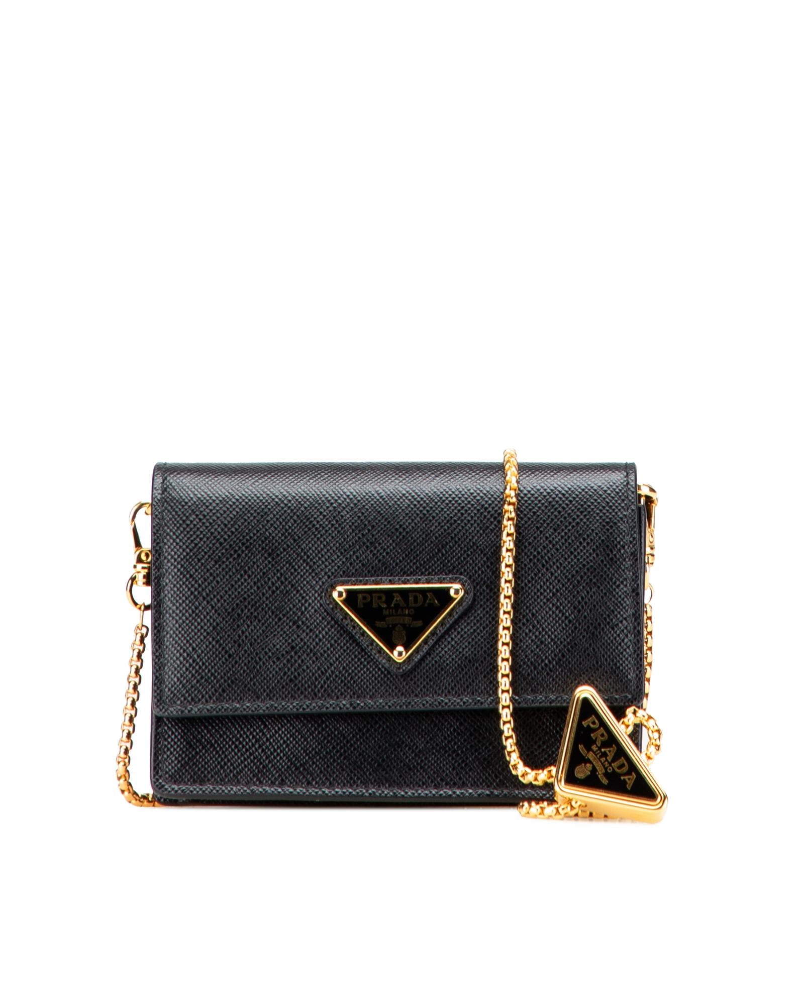 This crossbody features a saffiano leather body a curb chain strap with logo details a front flap with snap button closures and interior card slots.Brand: Prada Vintage