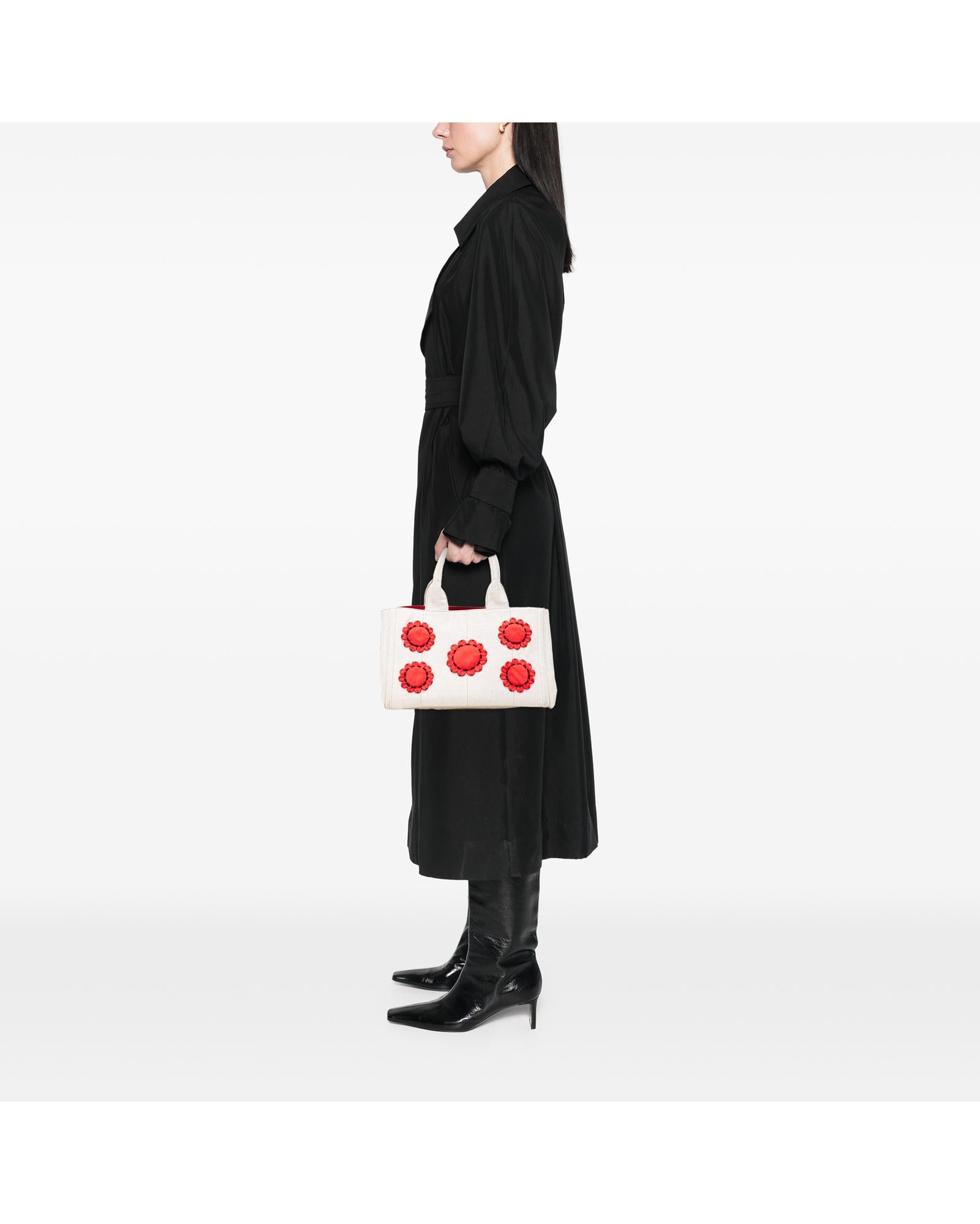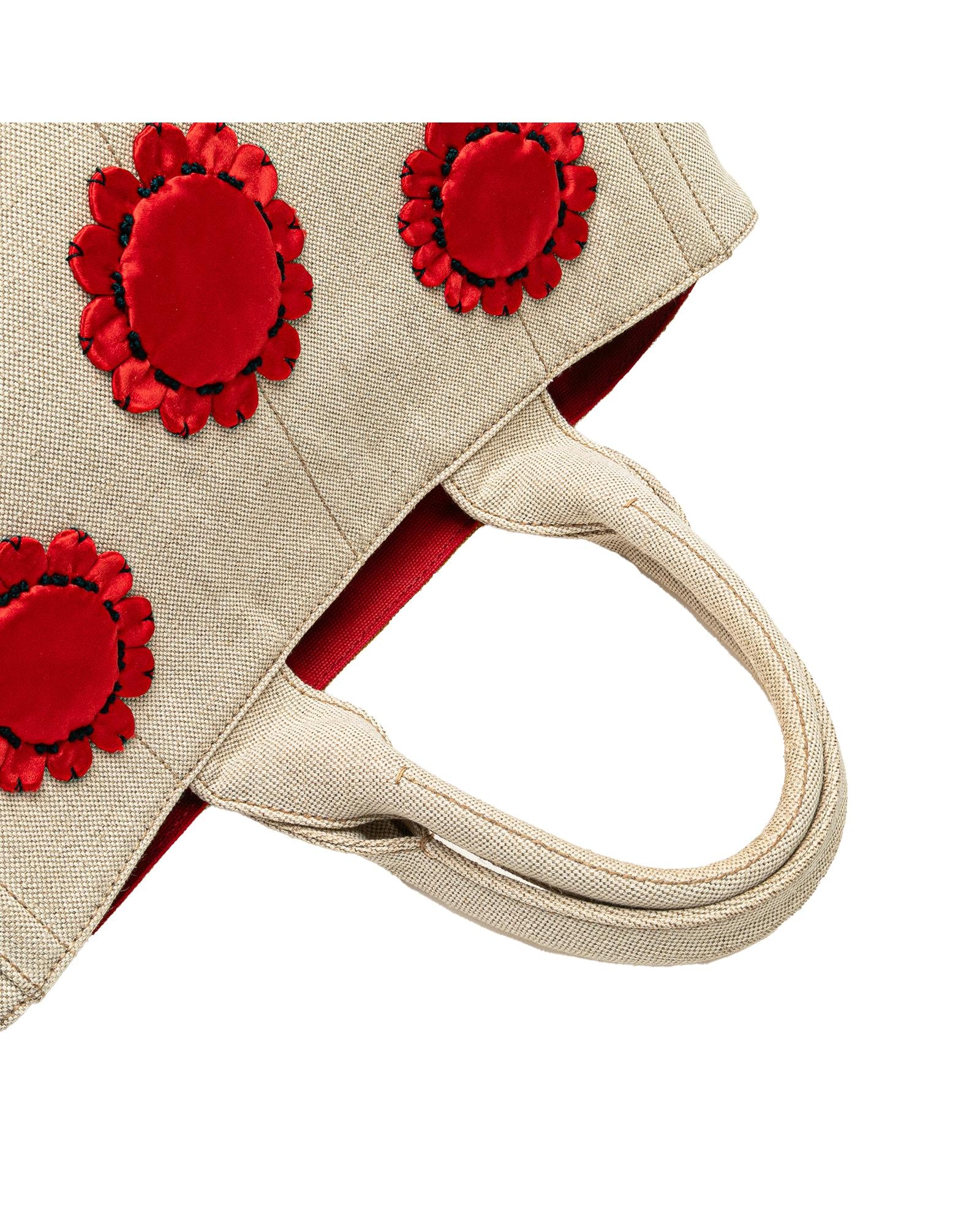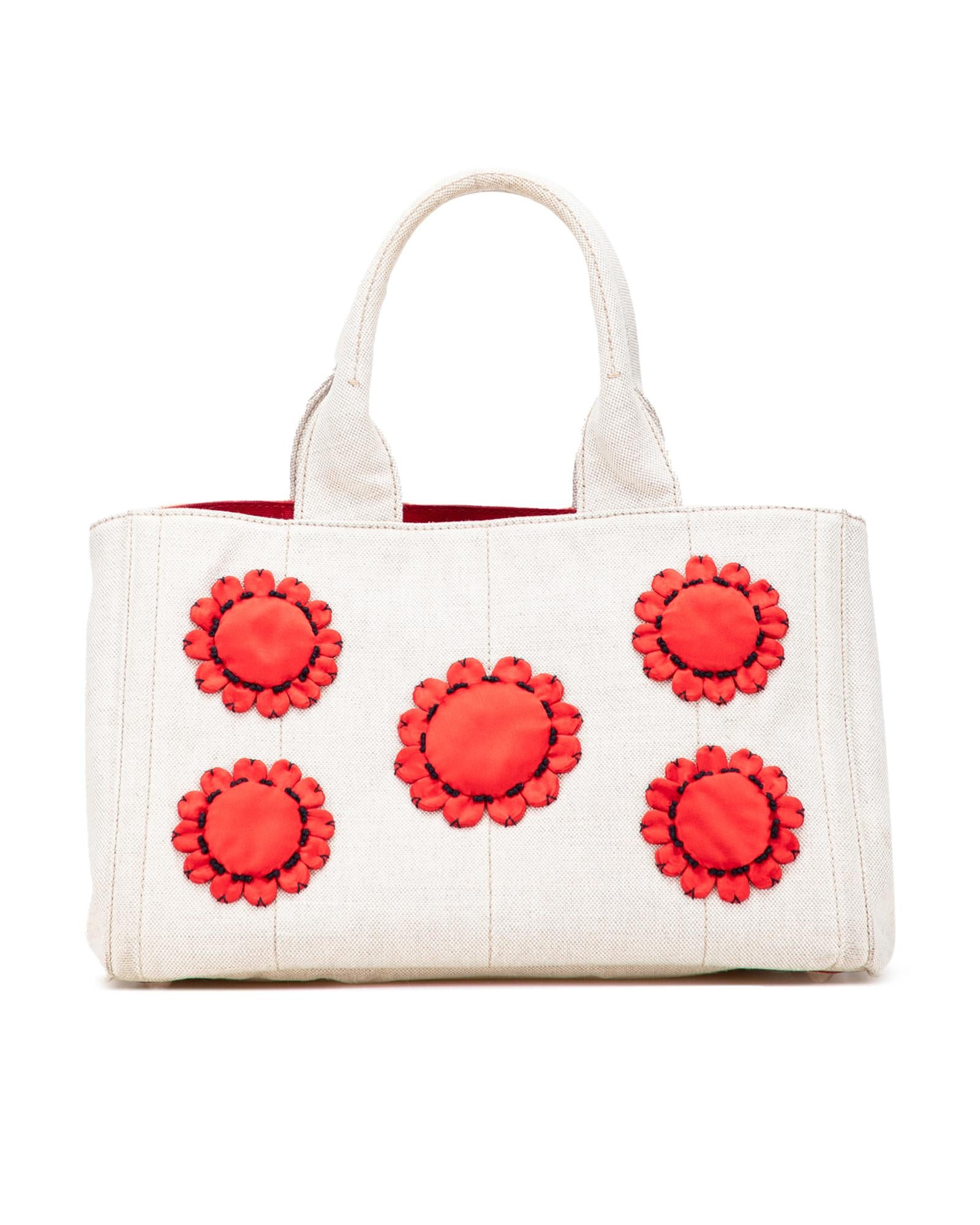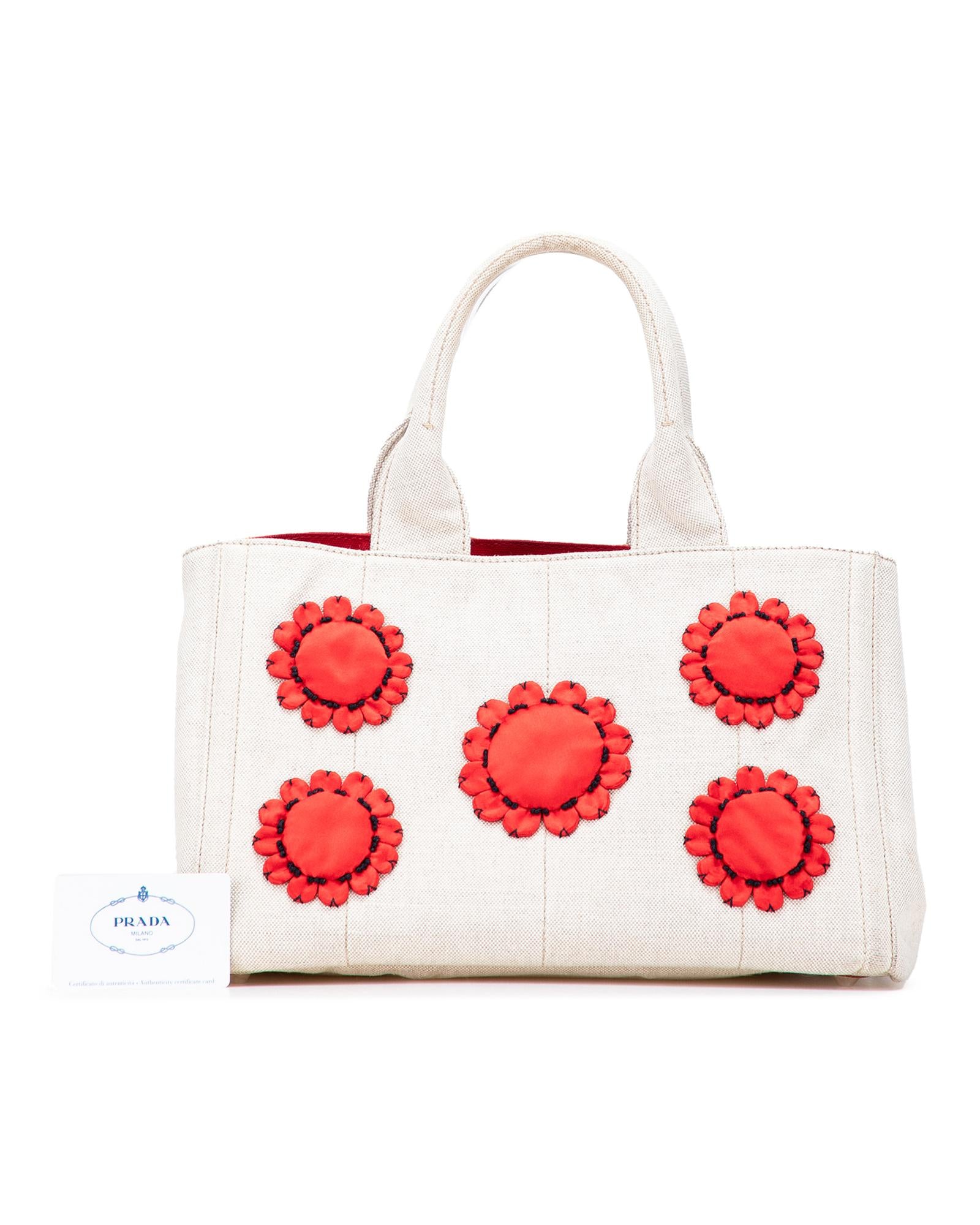 This tote features a canvas body with satin floral details rolled handles an open top and interior zip and slip pockets.Brand: Prada Vintage
