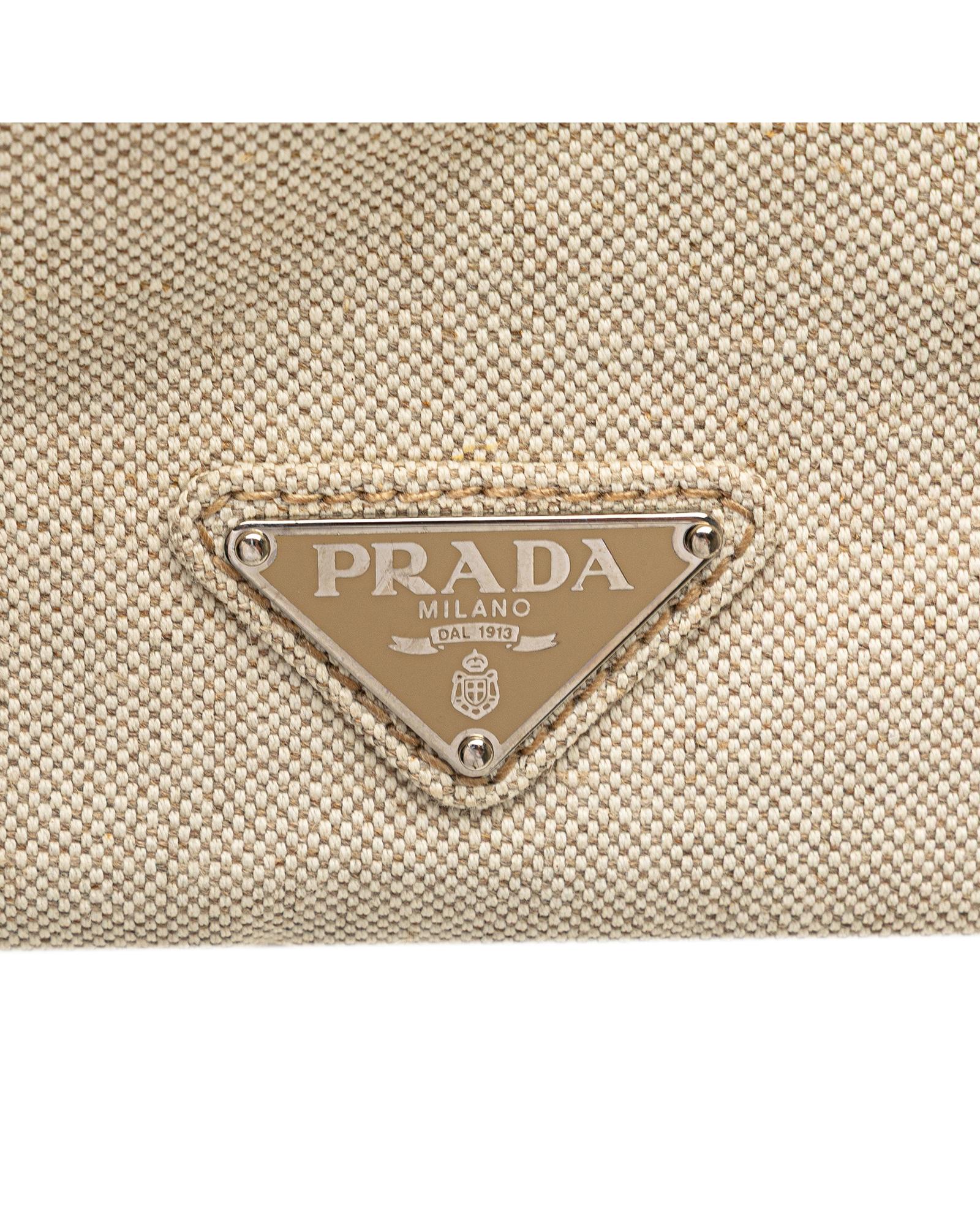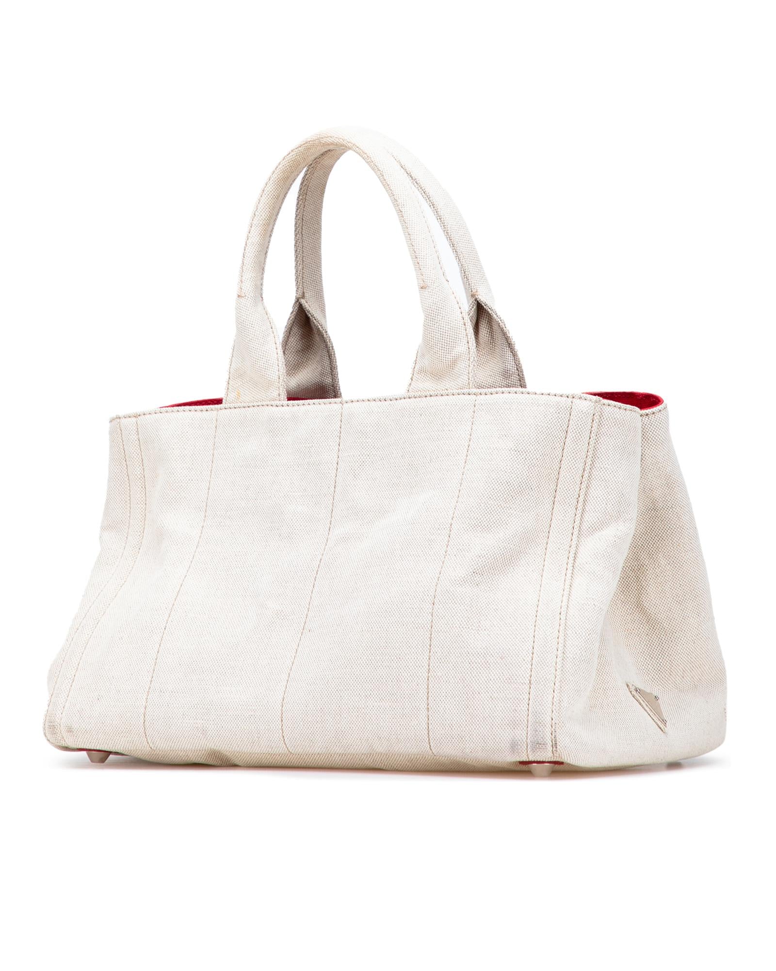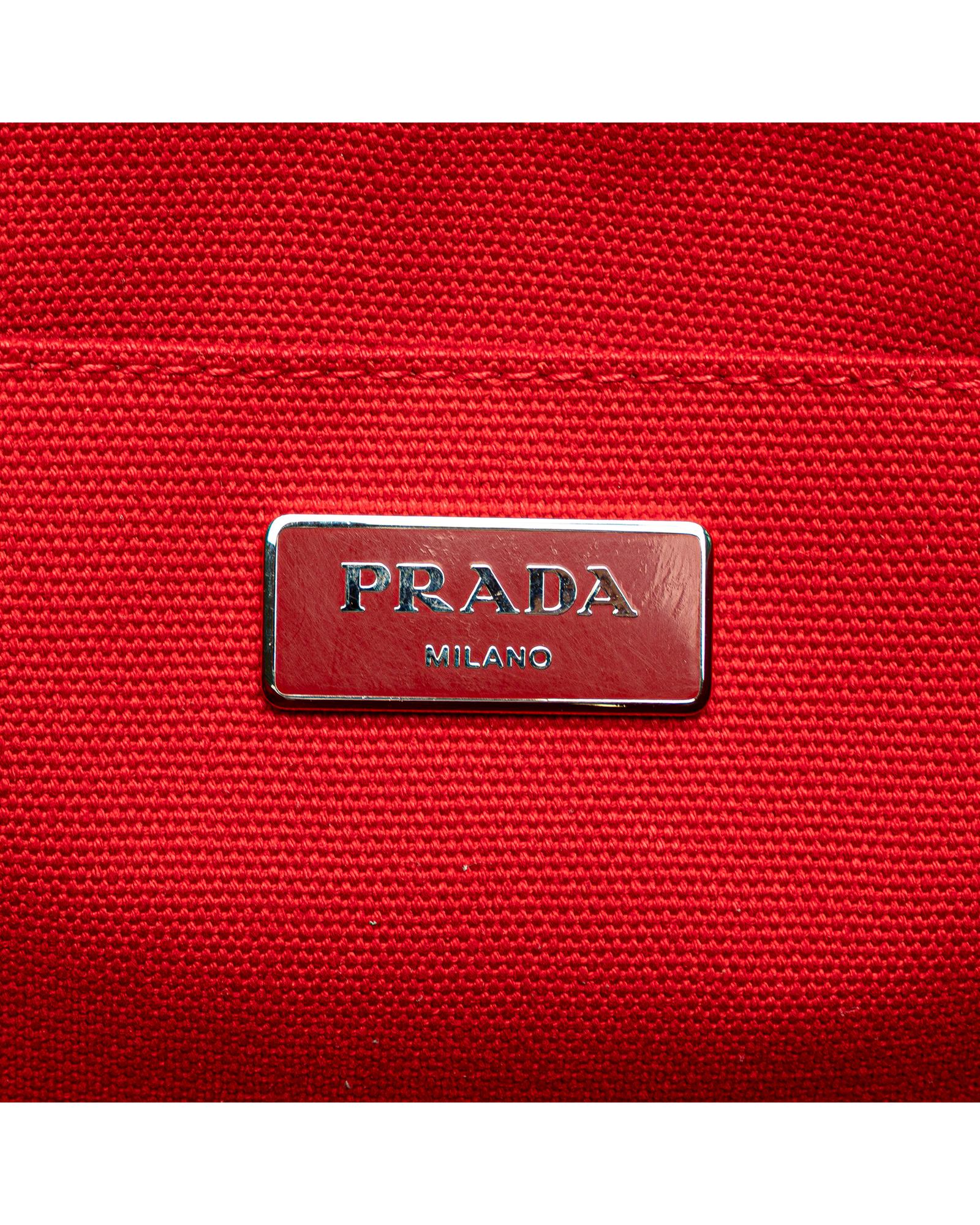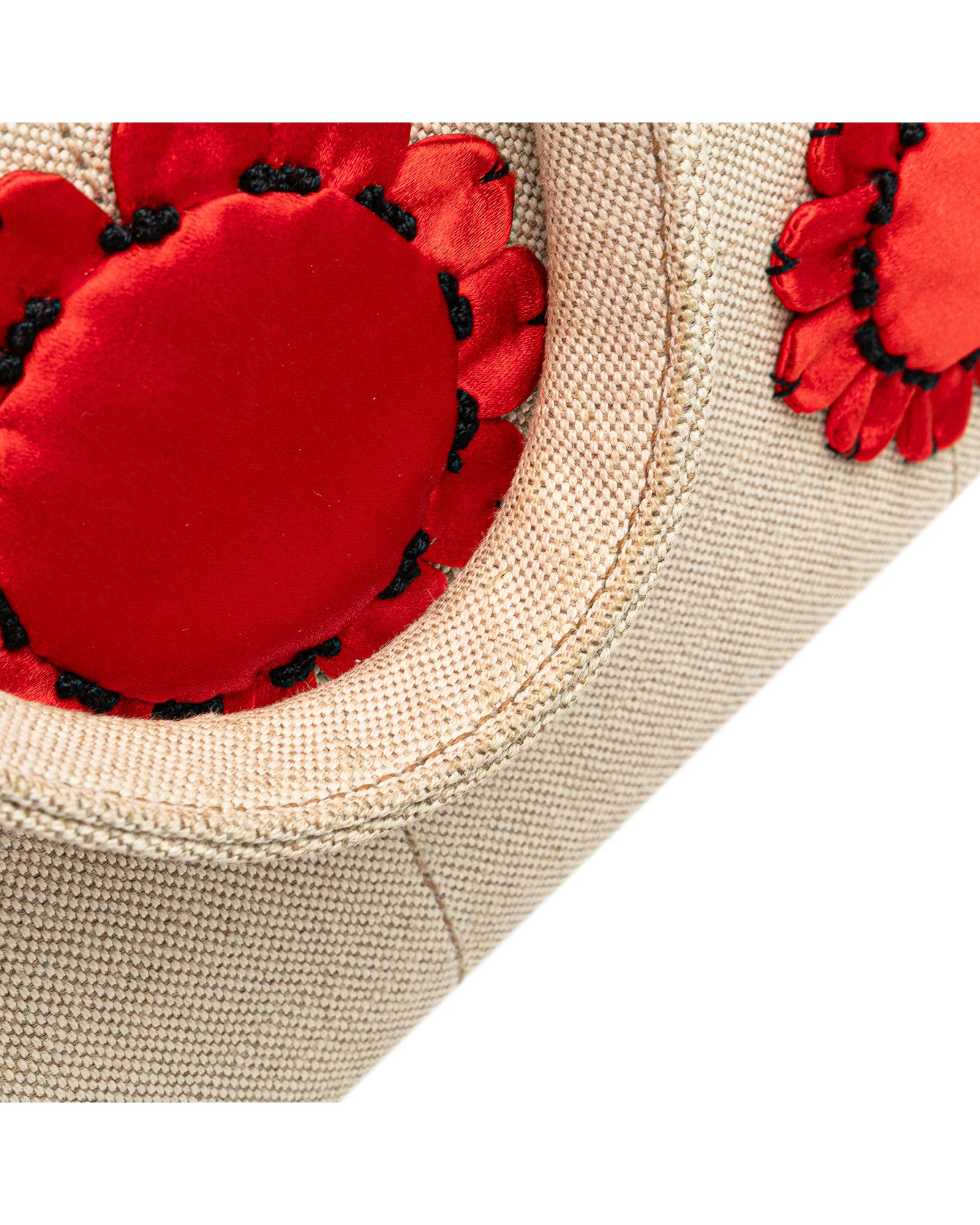 This tote features a canvas body with satin floral details rolled handles an open top and interior zip and slip pockets.Brand: Prada Vintage