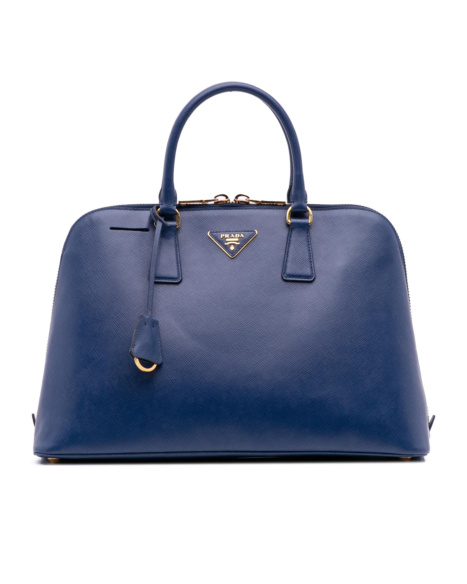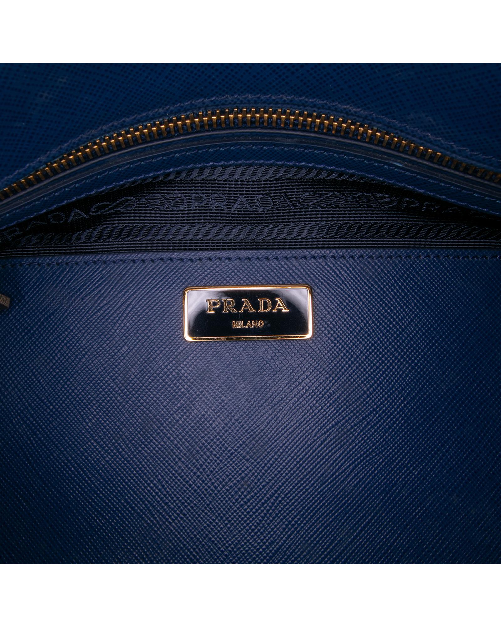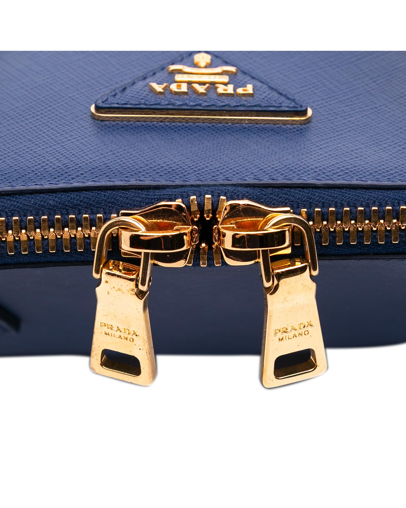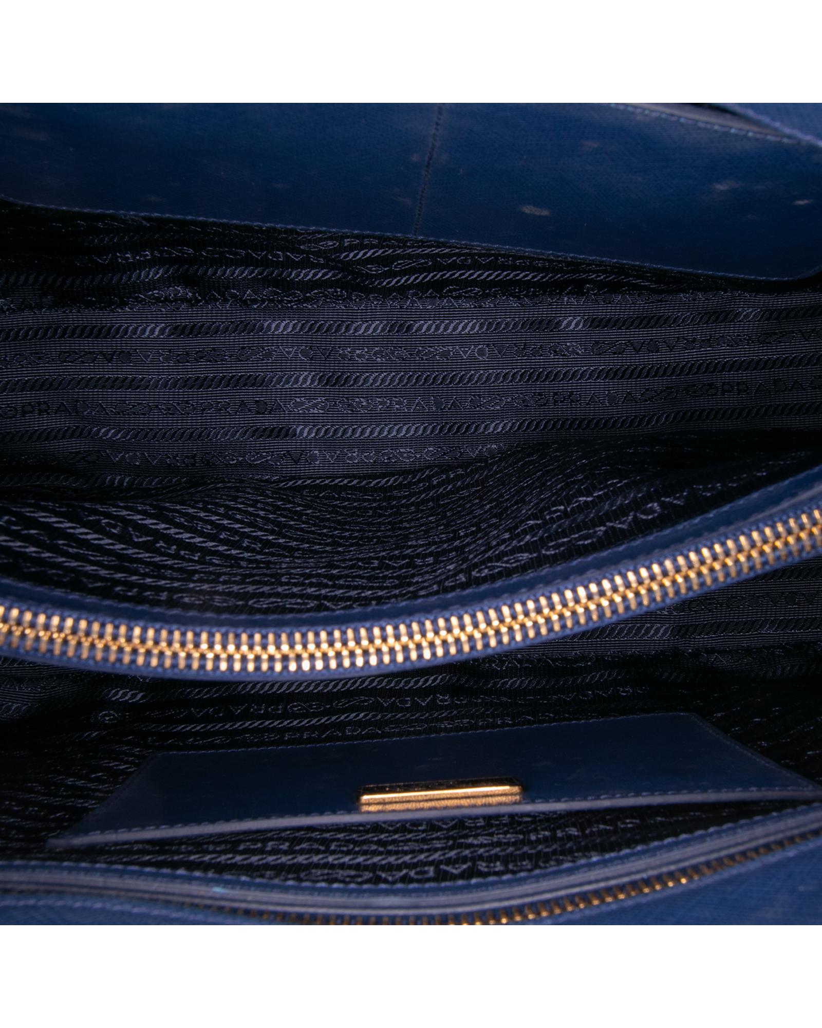 The Promenade features a saffiano leather body rolled leather handles a double zip around closure an interior center zip compartment and interior zip and slip pockets.
