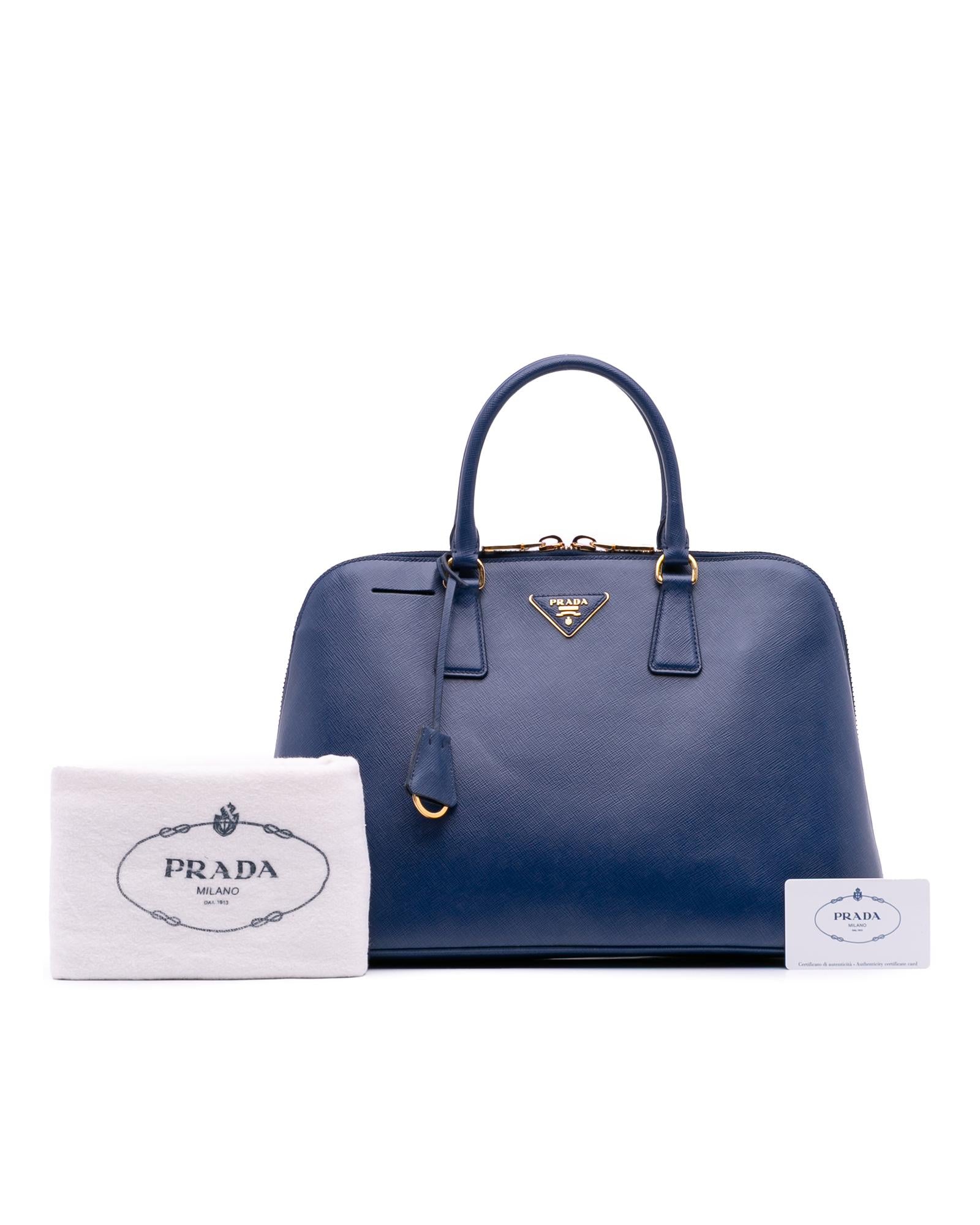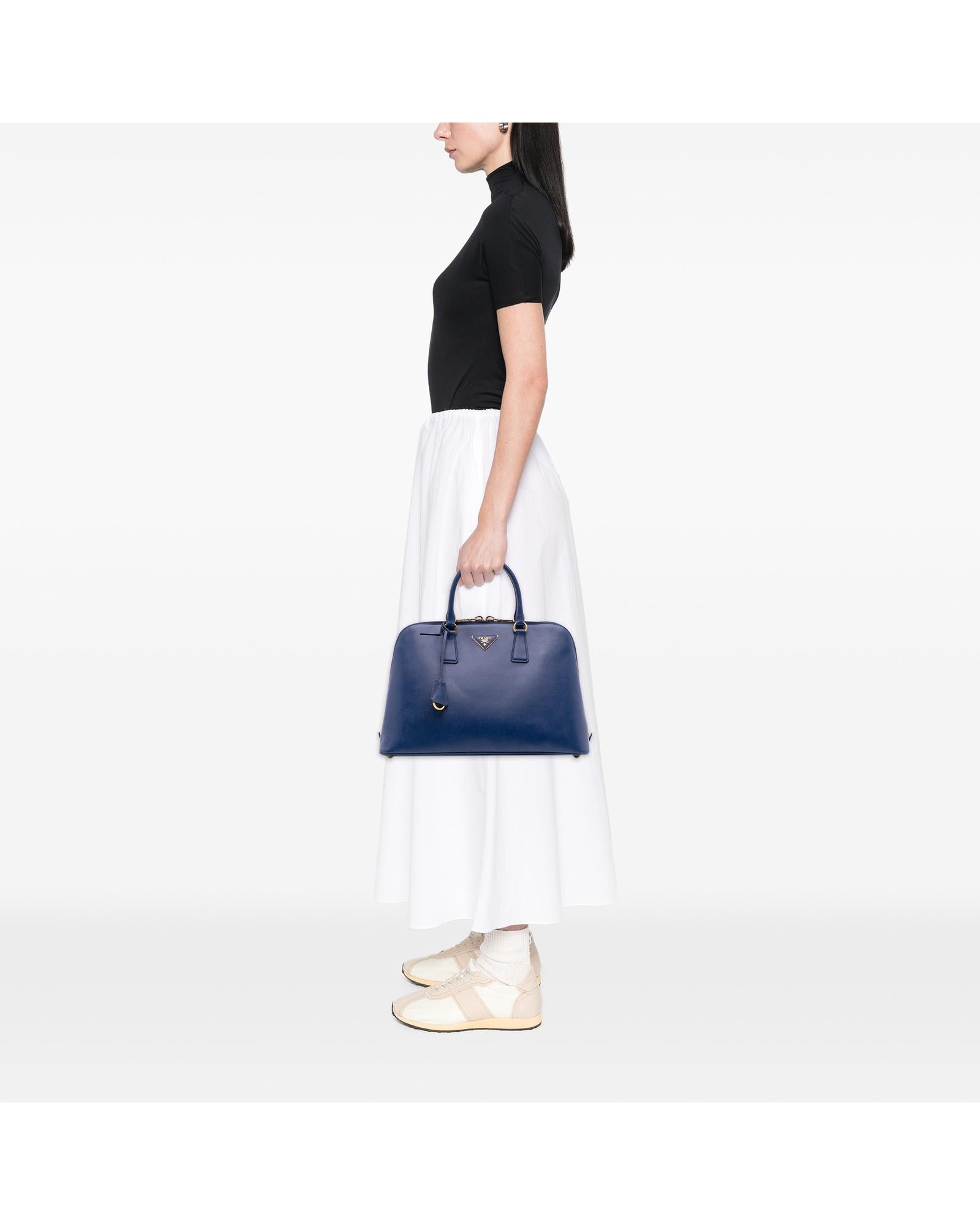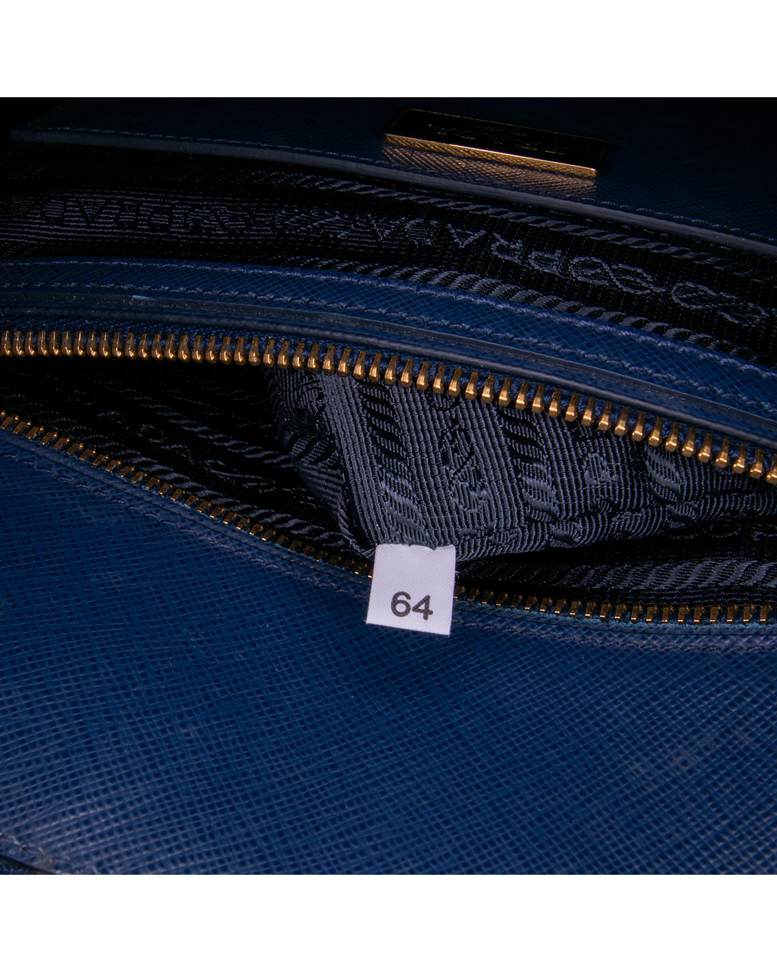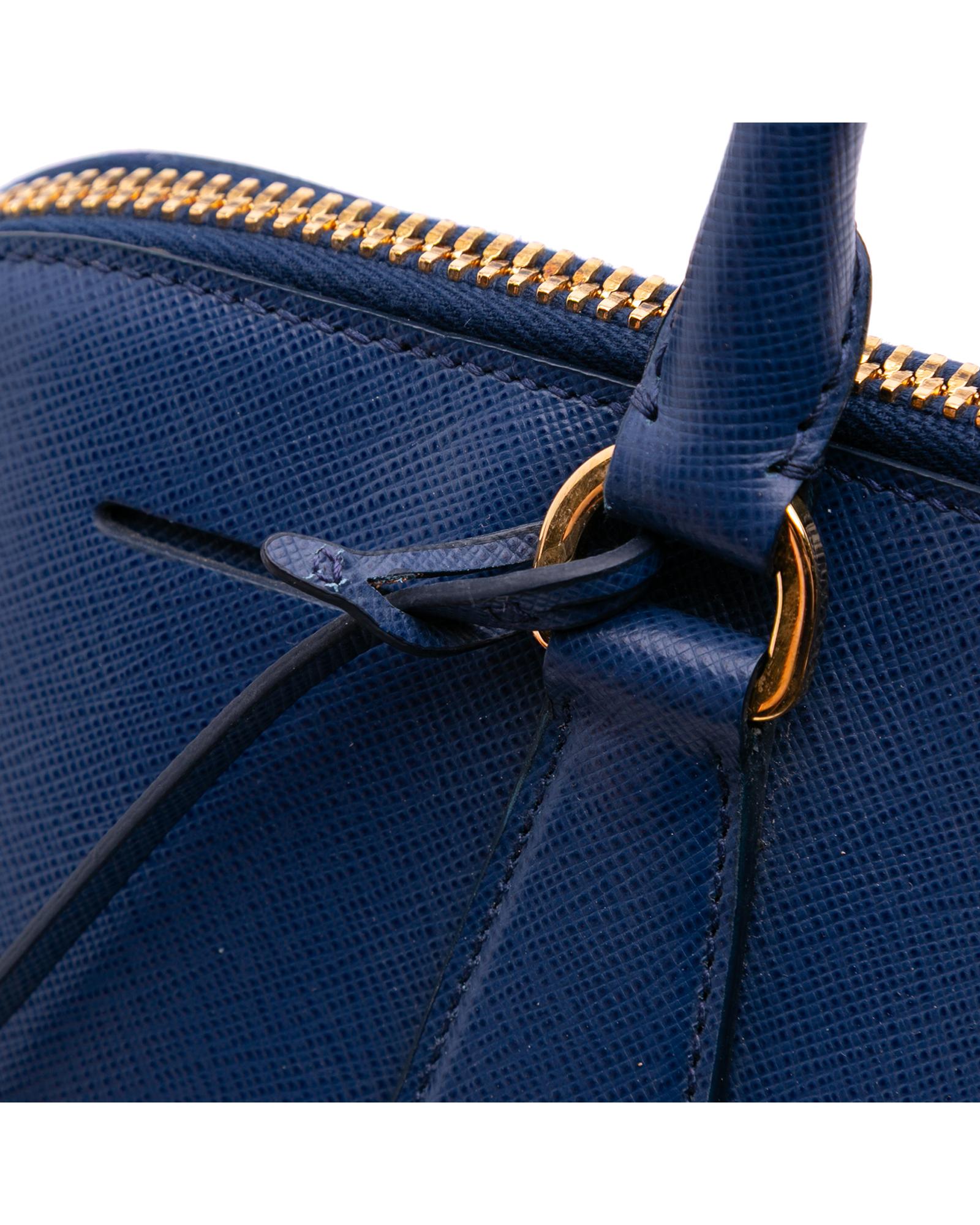 The Promenade features a saffiano leather body rolled leather handles a double zip around closure an interior center zip compartment and interior zip and slip pockets.