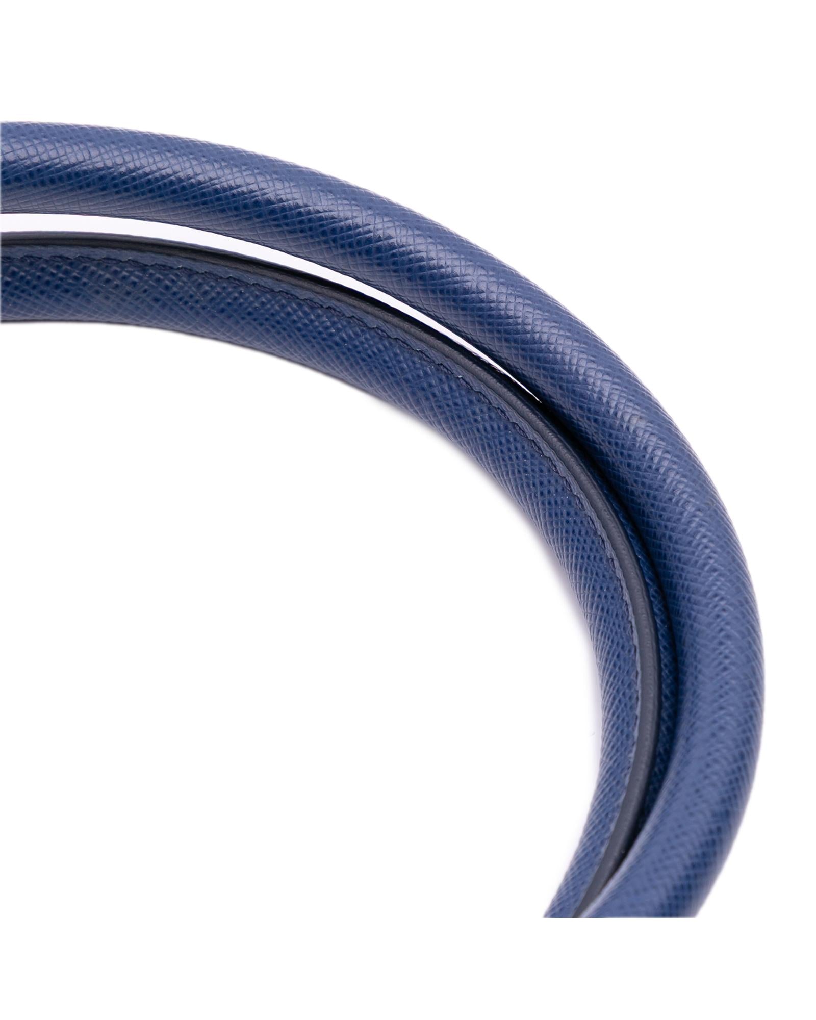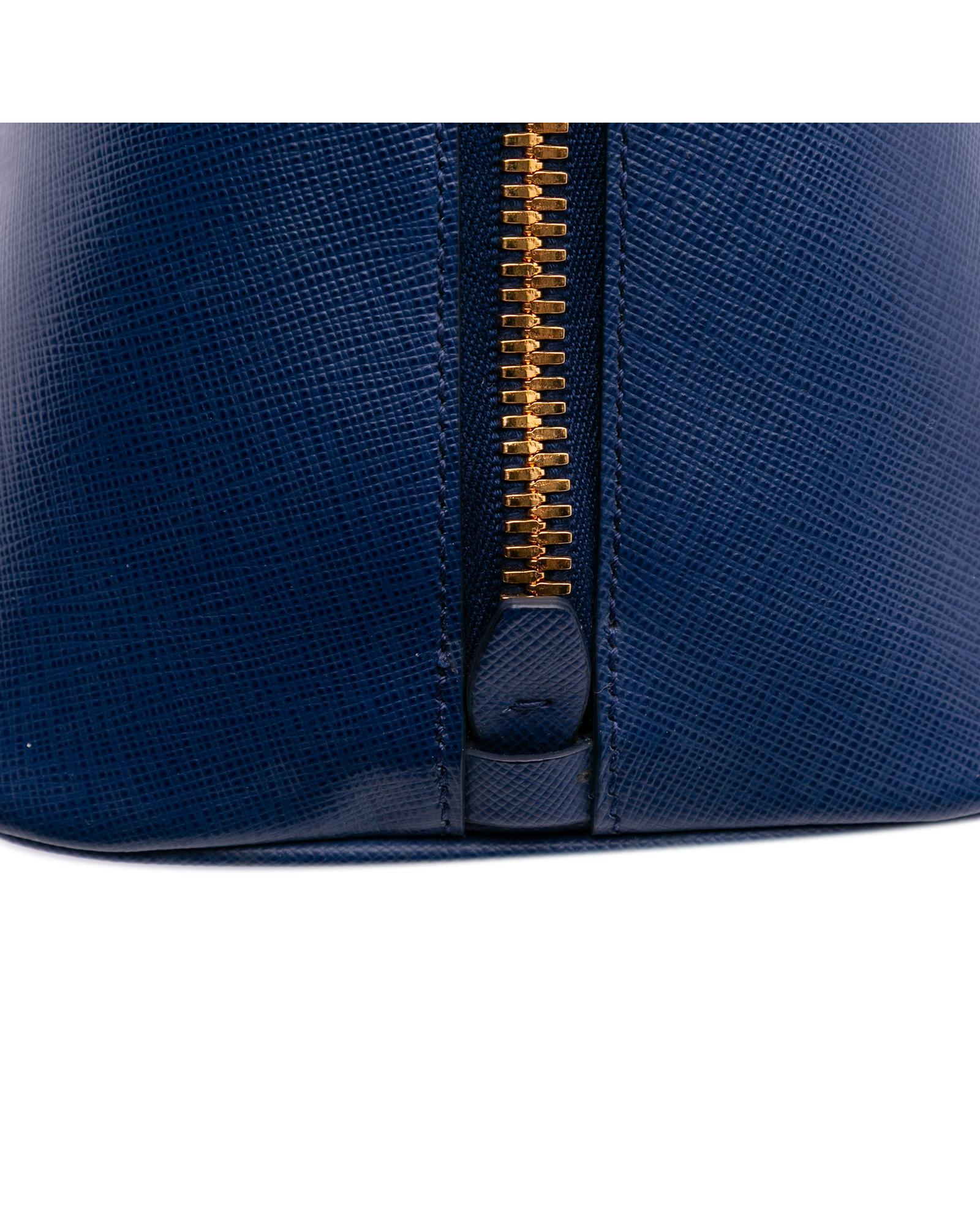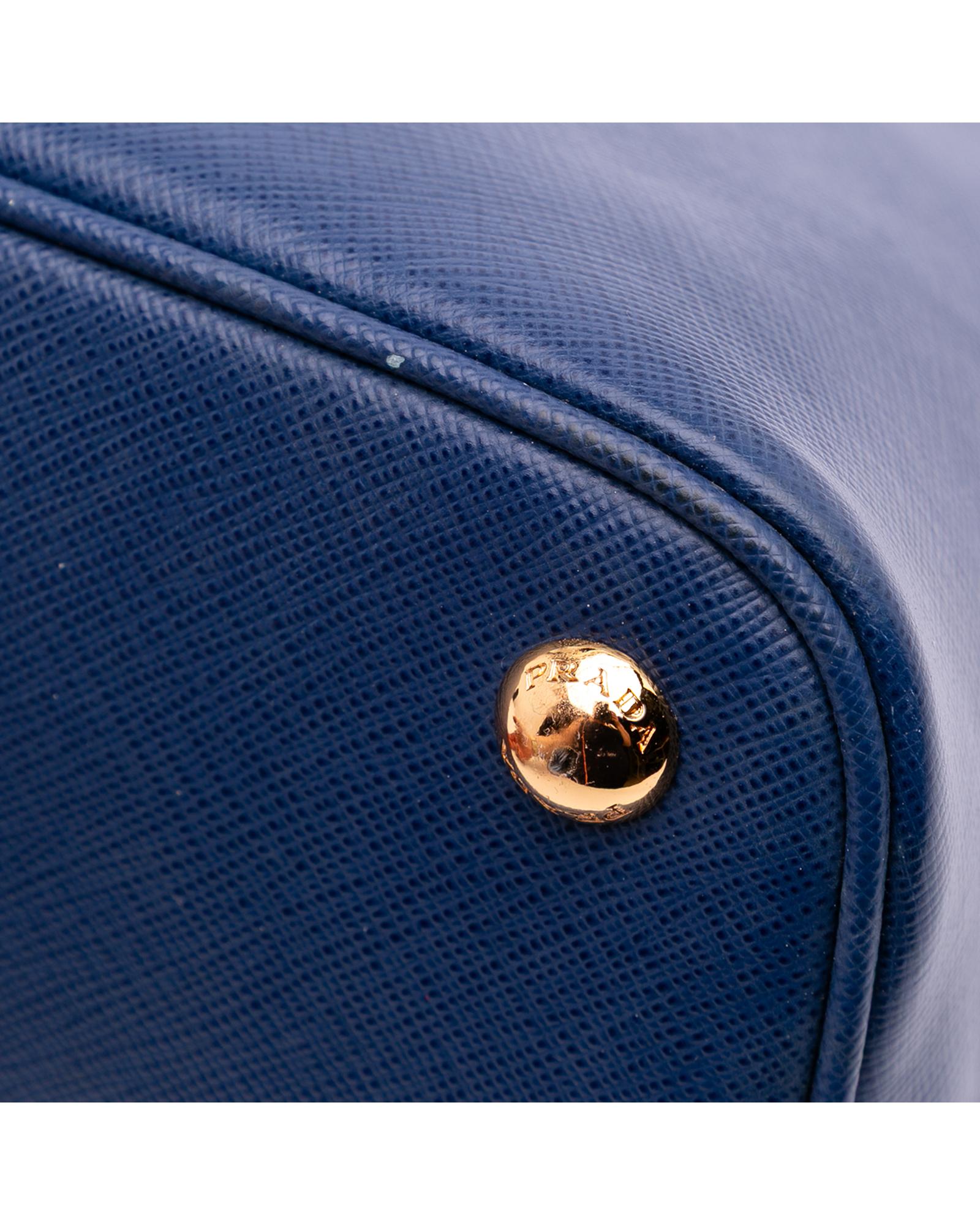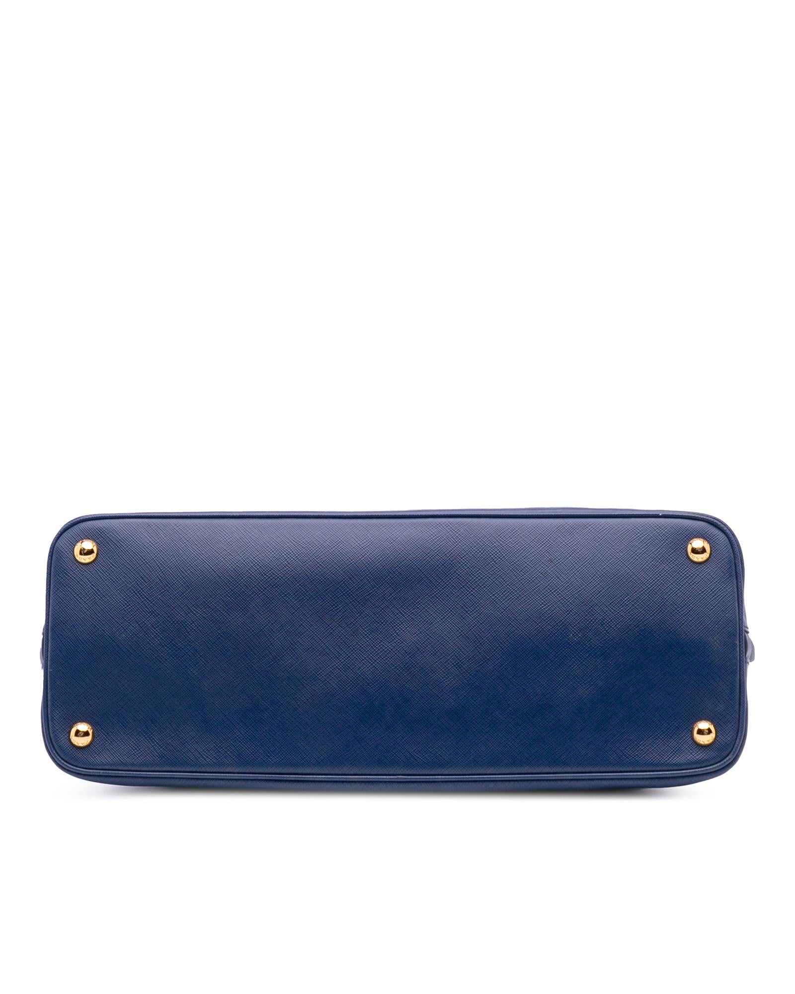 The Promenade features a saffiano leather body rolled leather handles a double zip around closure an interior center zip compartment and interior zip and slip pockets.