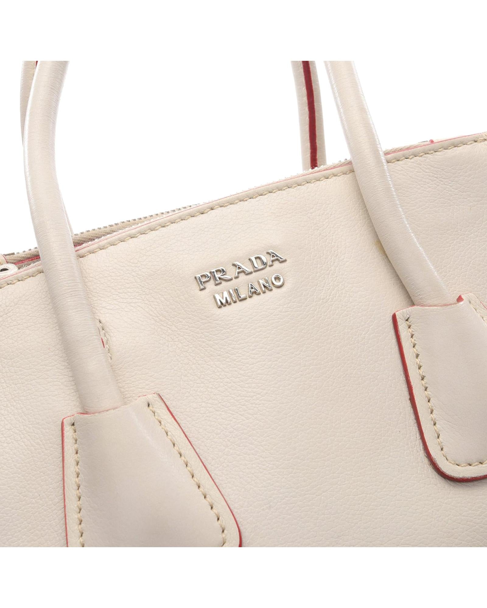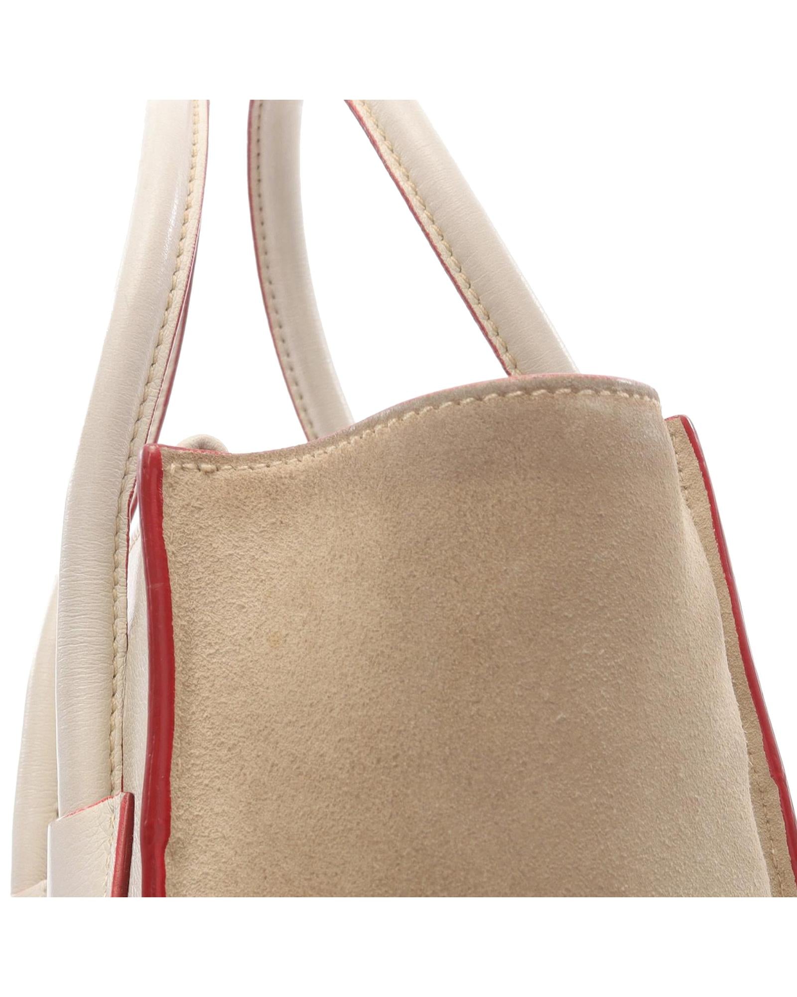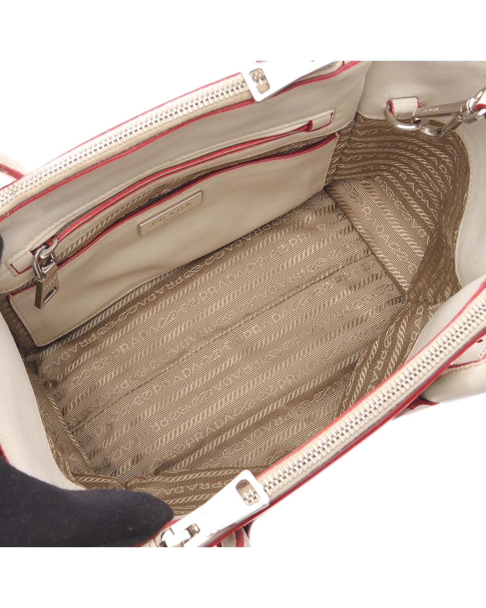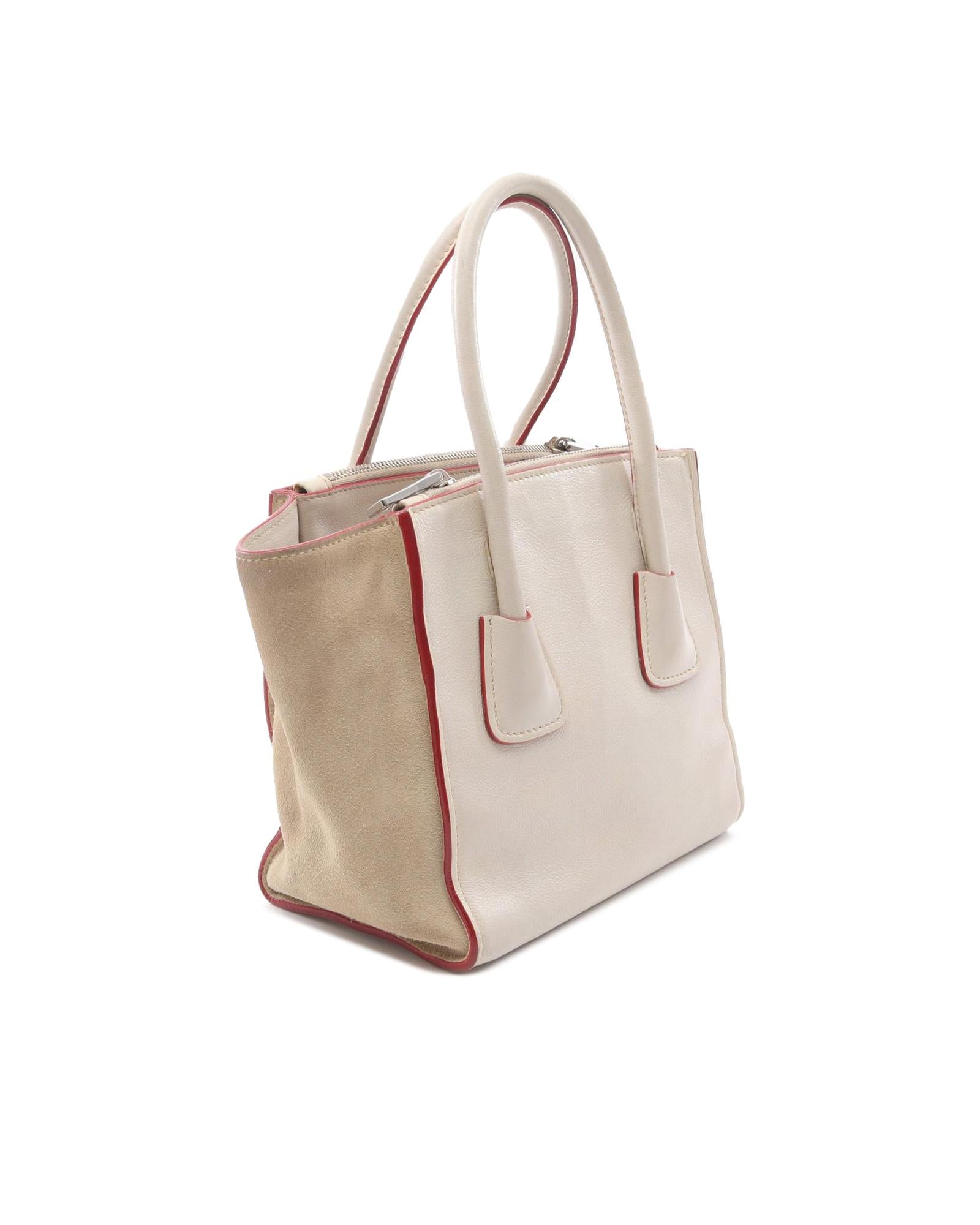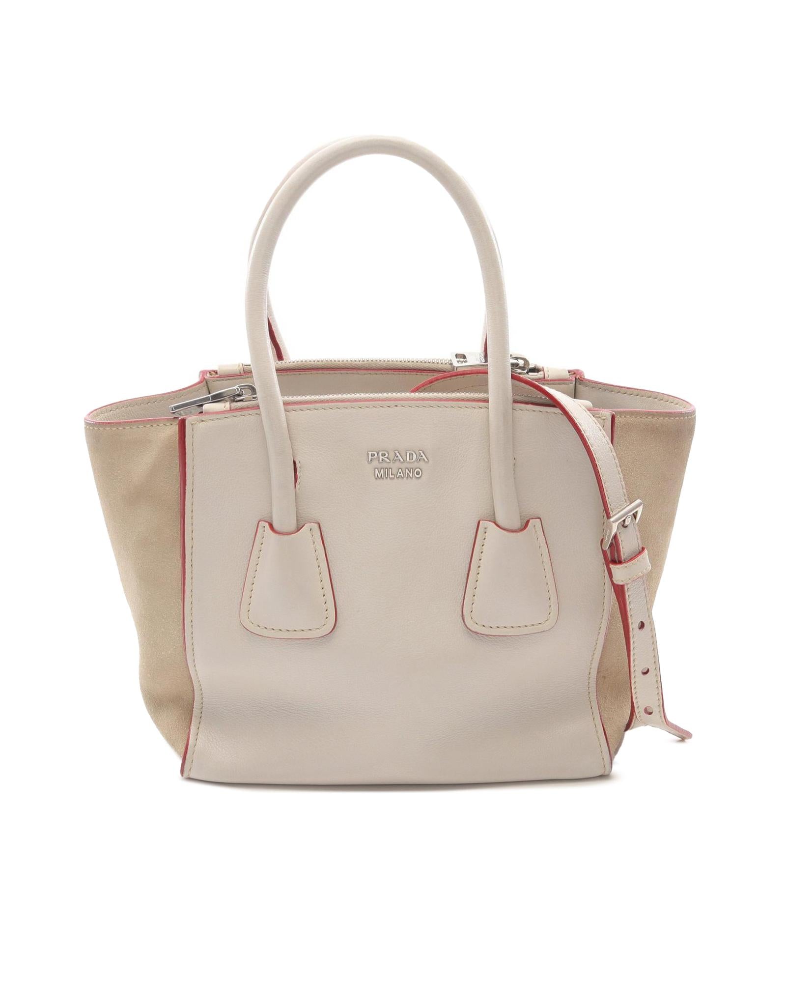 The Twin Pocket satchel features a calfskin body with suede leather trim rolled leather handles a detachable flat leather strap an open top dual zip compartments and interior zip and slip pockets.Brand: Prada Vintage
