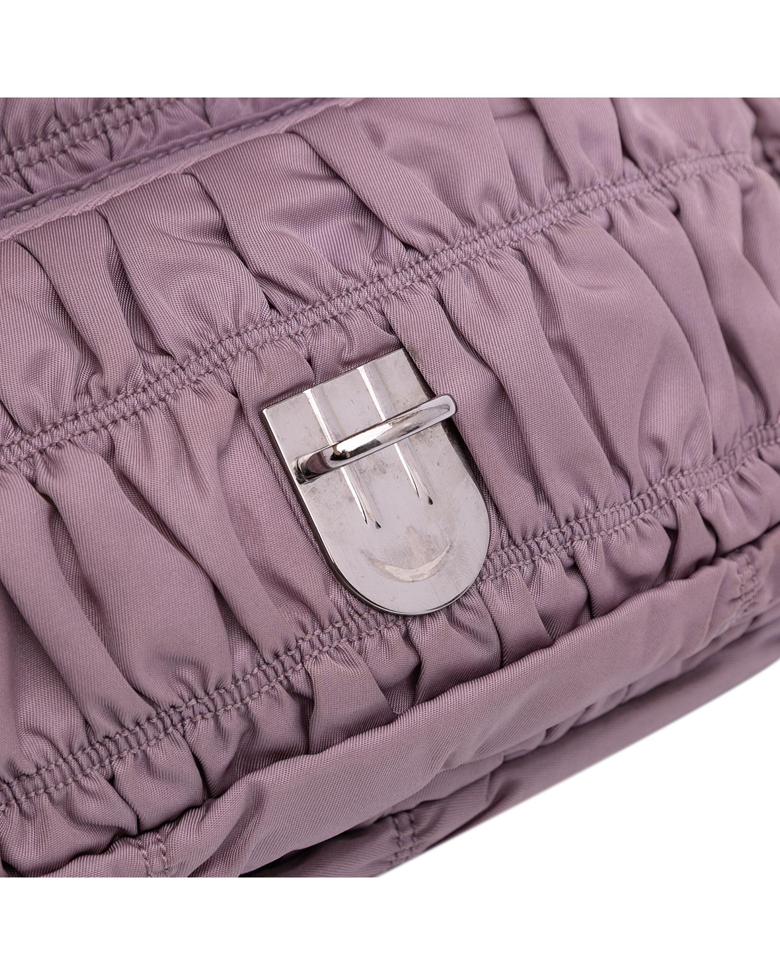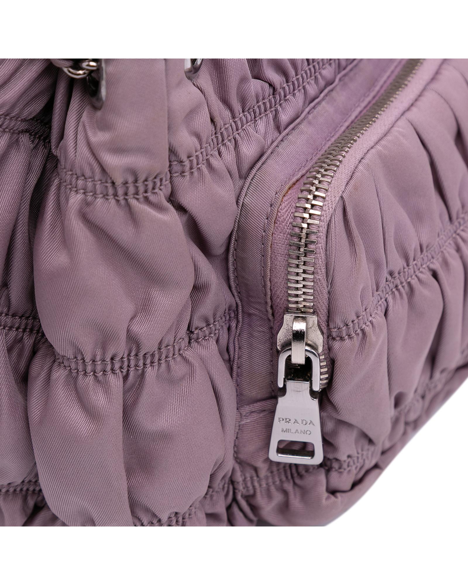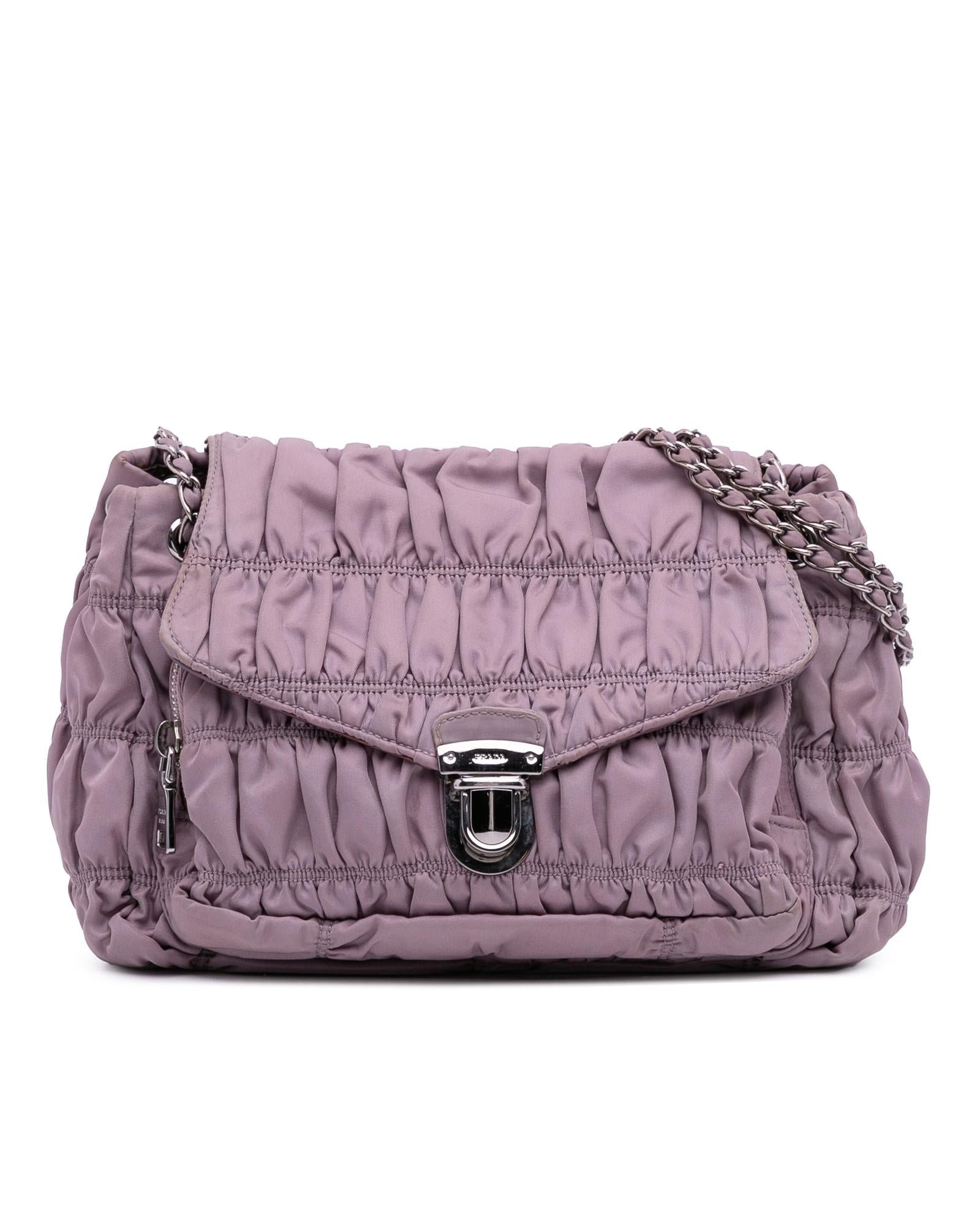 This shoulder bag features a gathered nylon body nylon woven chain link straps a front flap with a push lock closure an exterior front zip pocket and interior zip and slip pockets.Brand: Prada Vintage