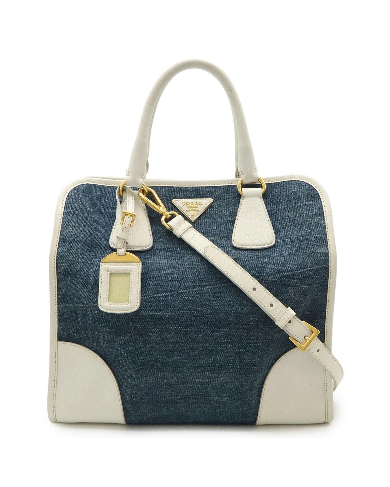 Brand: Prada Model: Triangle Logo Color: Blue Material: Denim - Jeans Inclusions: Name tag Shoulder strap Dimensions: W 32.5 cm x H 30.5 cm x D 17 cm Serial number: None Condition: B - good condition. Outside condition : Slight sun damage slight glue residue Inside condition :  Slight glue residue Handle condition : Slight crease Corner condition : Rubbing Metal fittings condition : Slight scratches reference (SKU): 1752516627116720