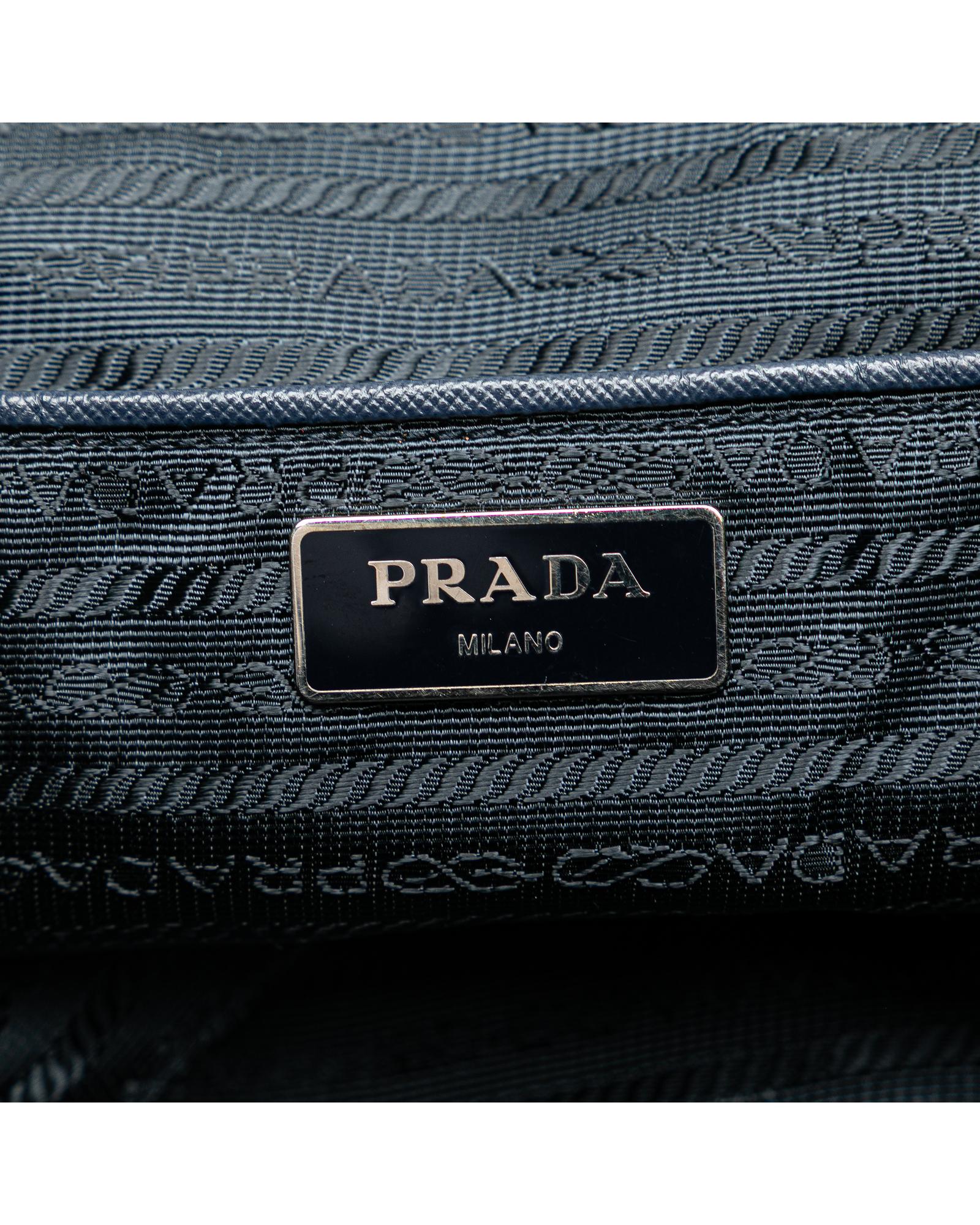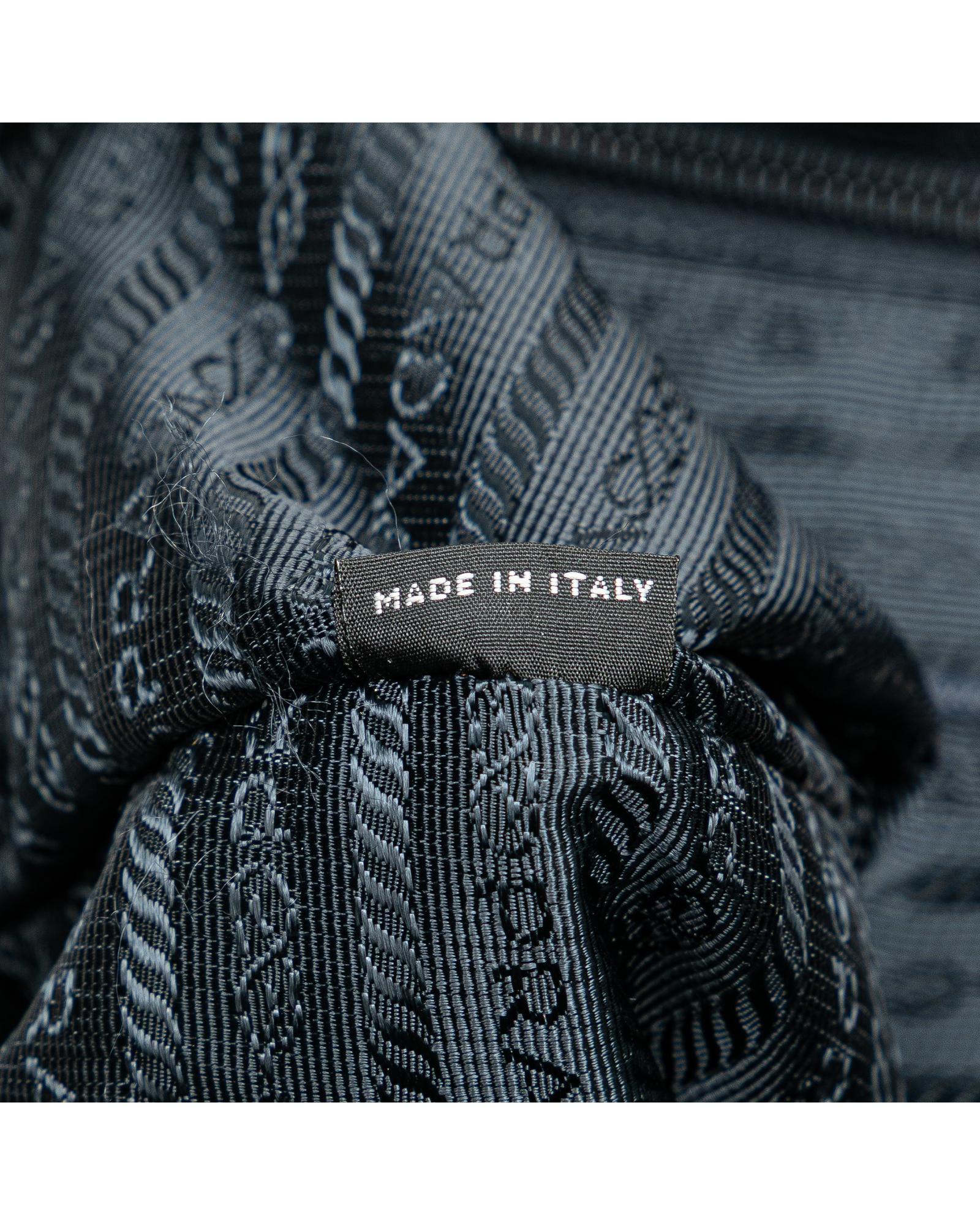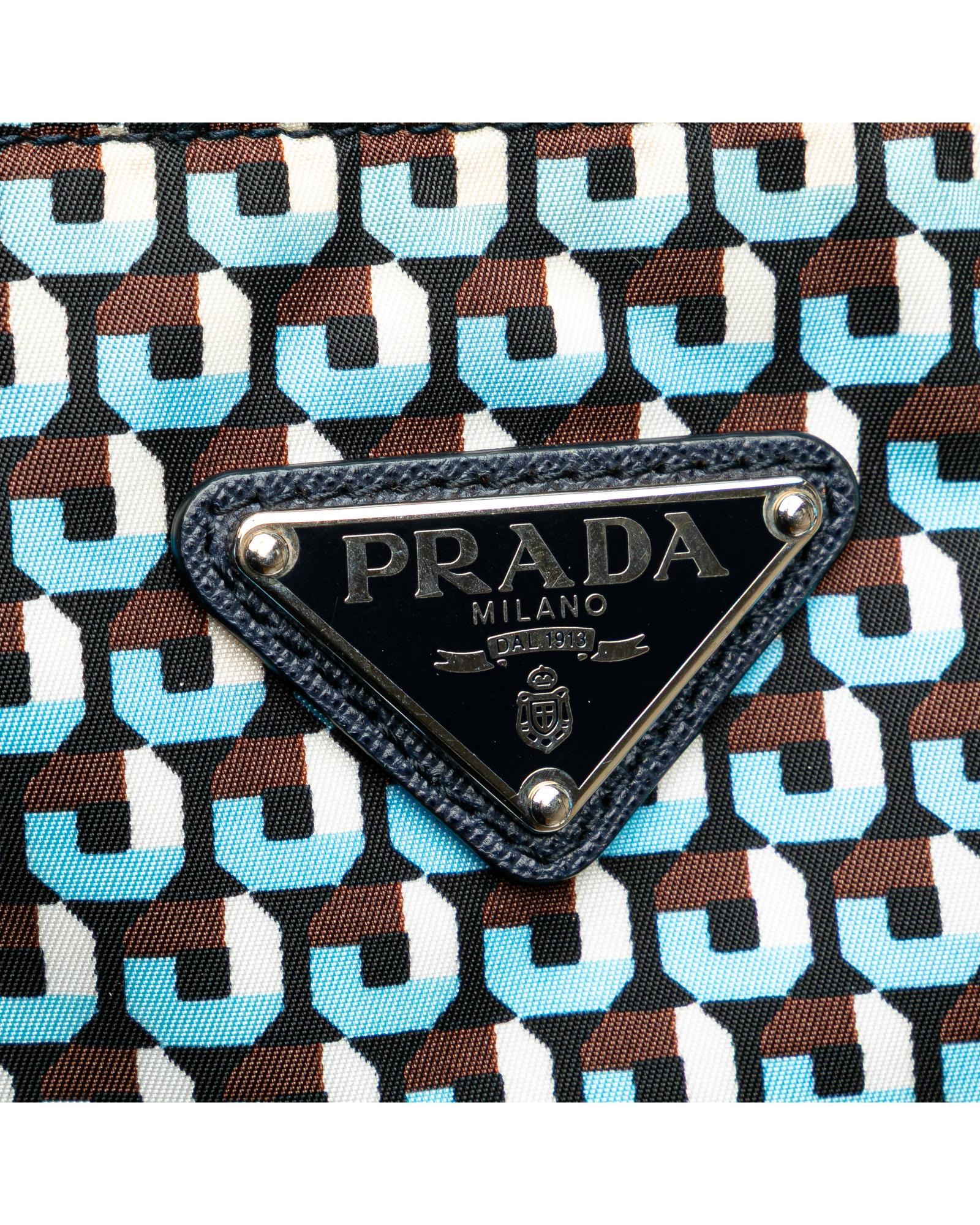 This satchel features a printed nylon body flat leather handles detachable flat strap a top zip closure and an interior zip pocket.Brand: Prada Vintage