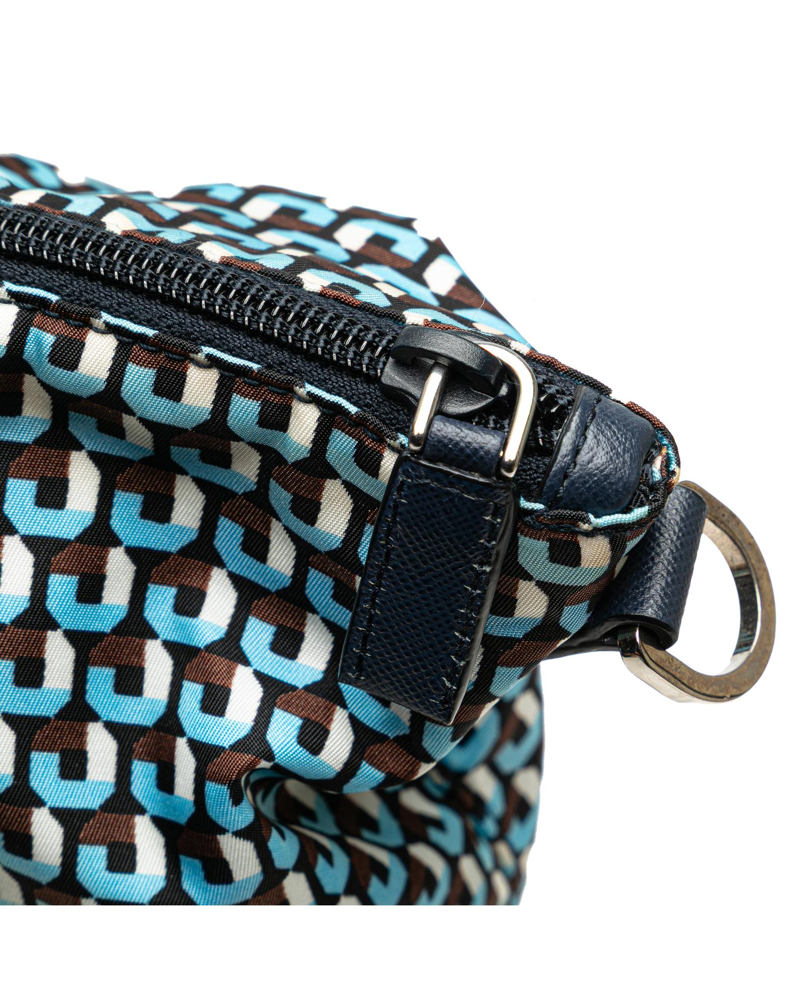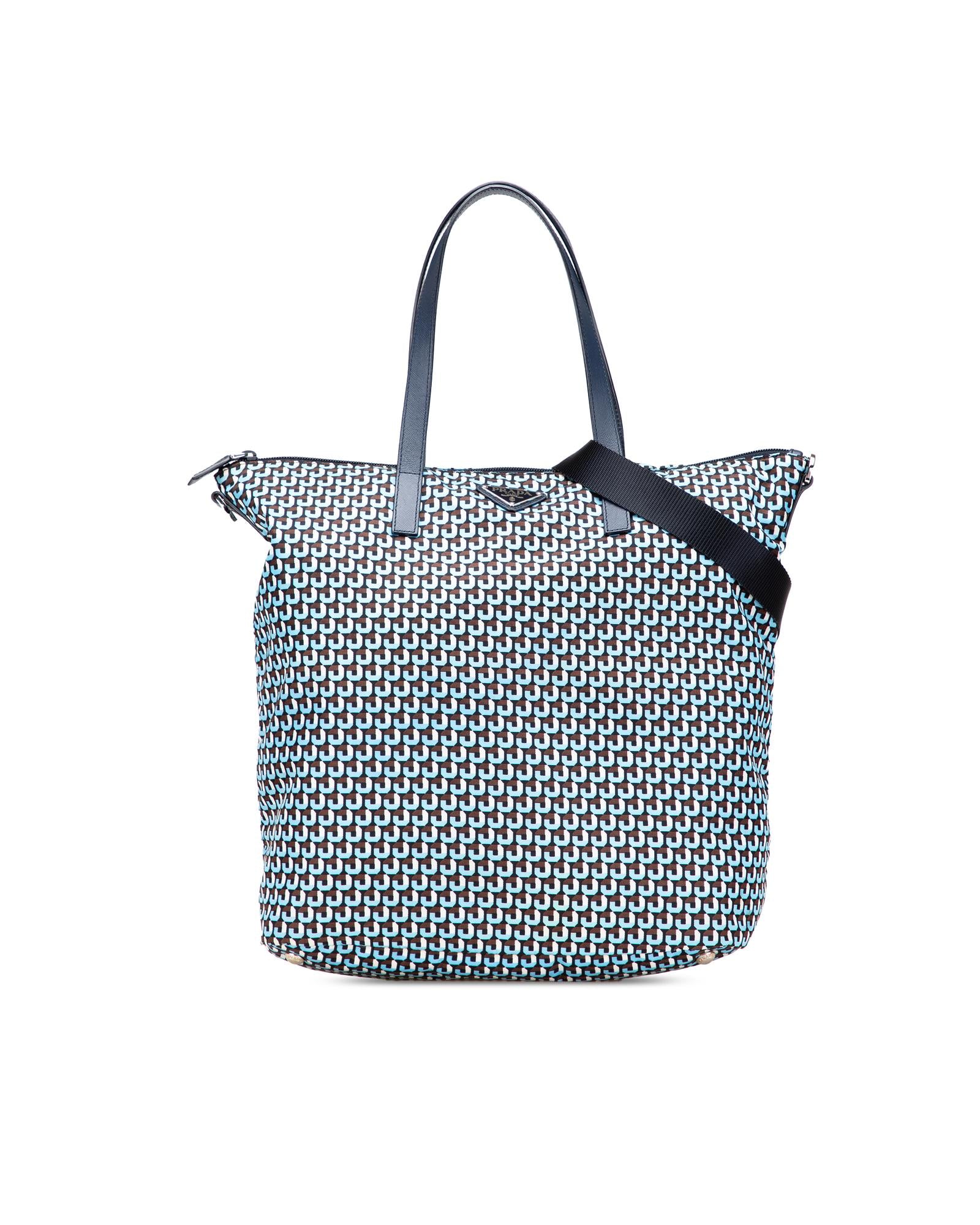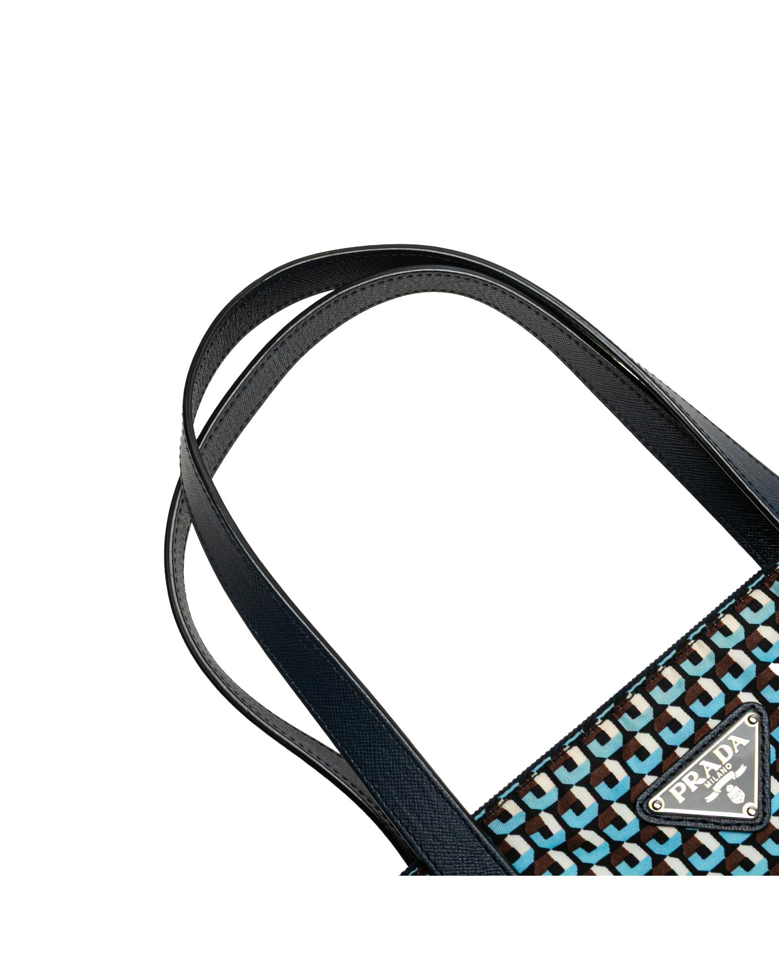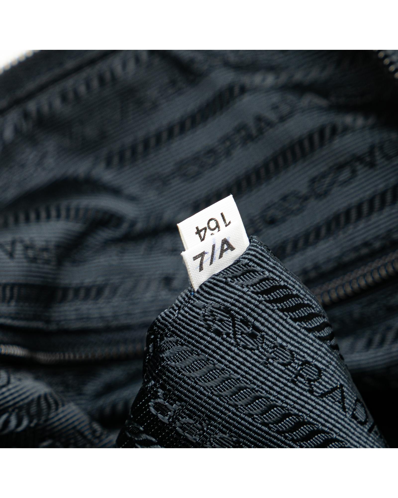 This satchel features a printed nylon body flat leather handles detachable flat strap a top zip closure and an interior zip pocket.Brand: Prada Vintage