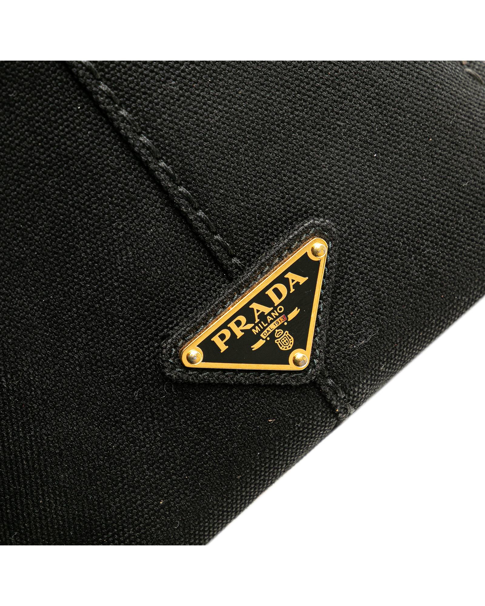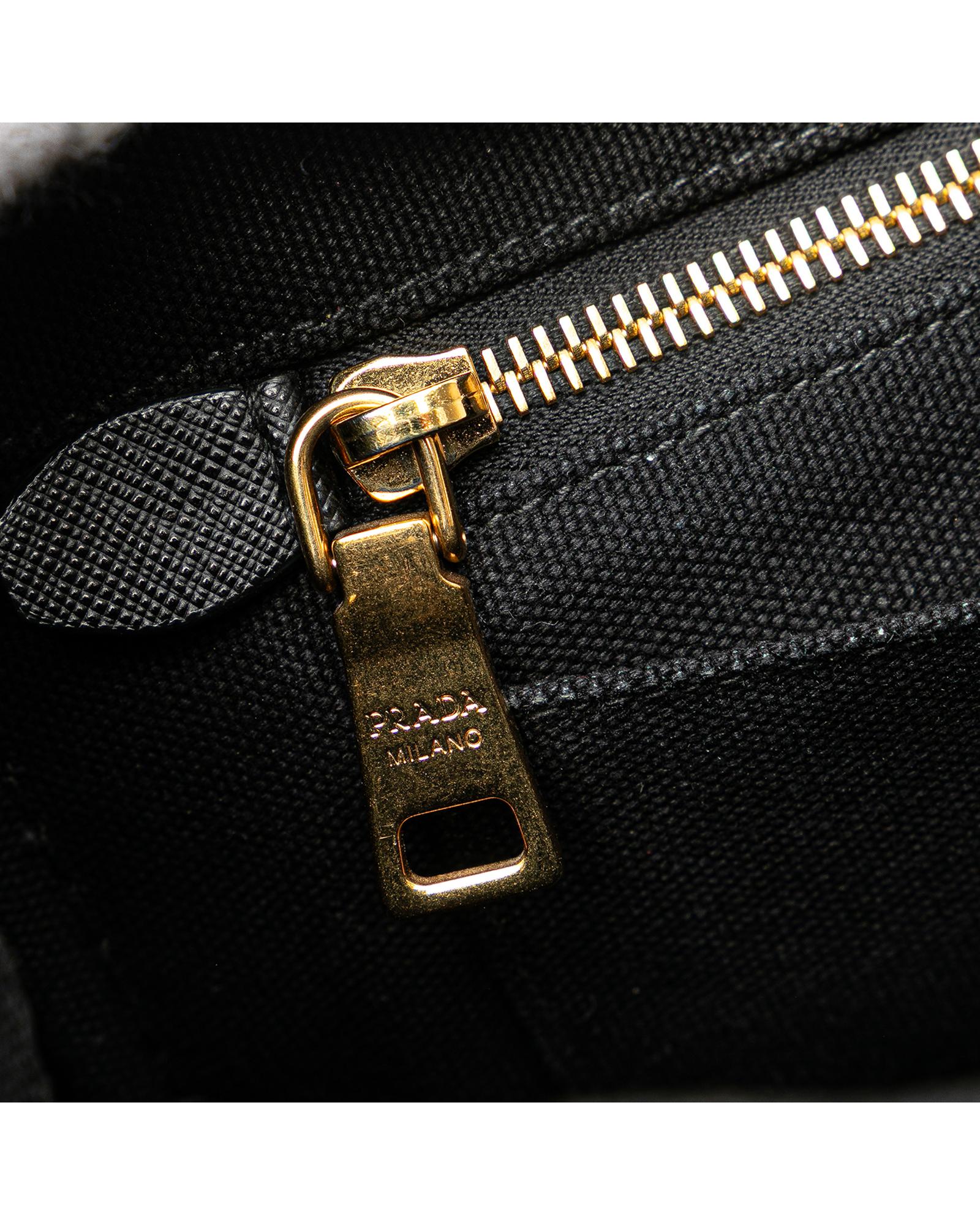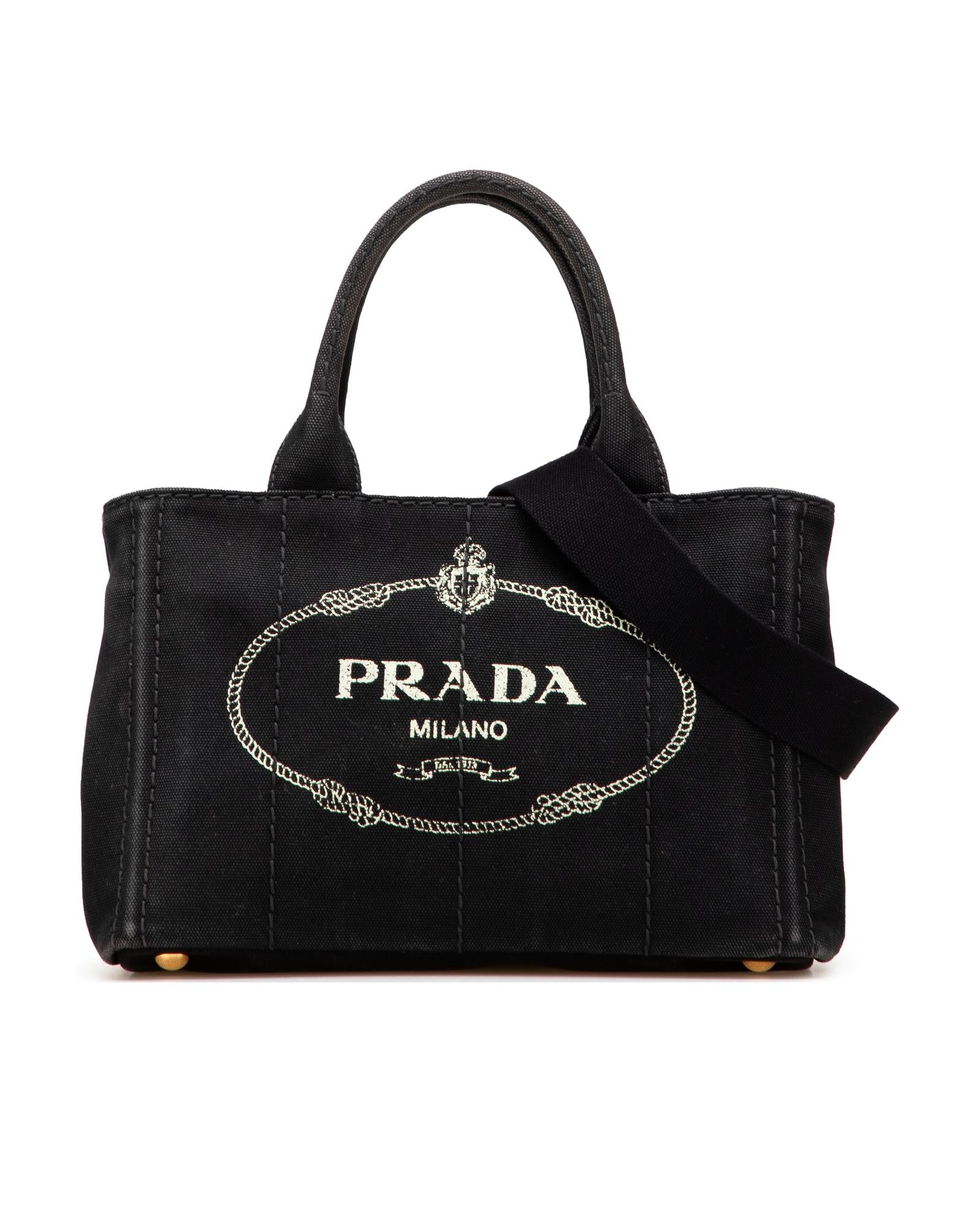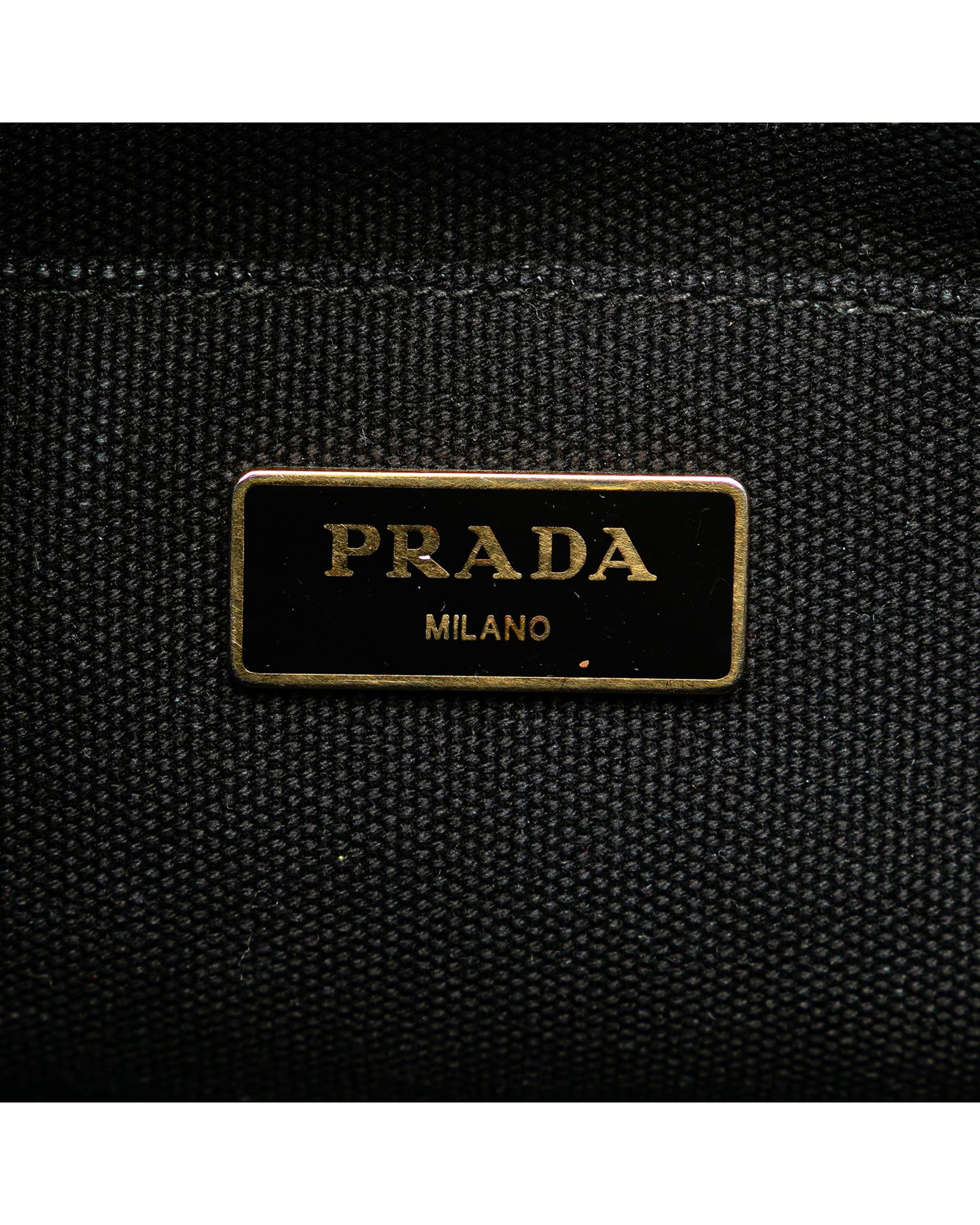 This satchel features a canvas body rolled canvas handles detachable flat strap an open top with side snap closures and interior zip and slip pockets.Brand: Prada