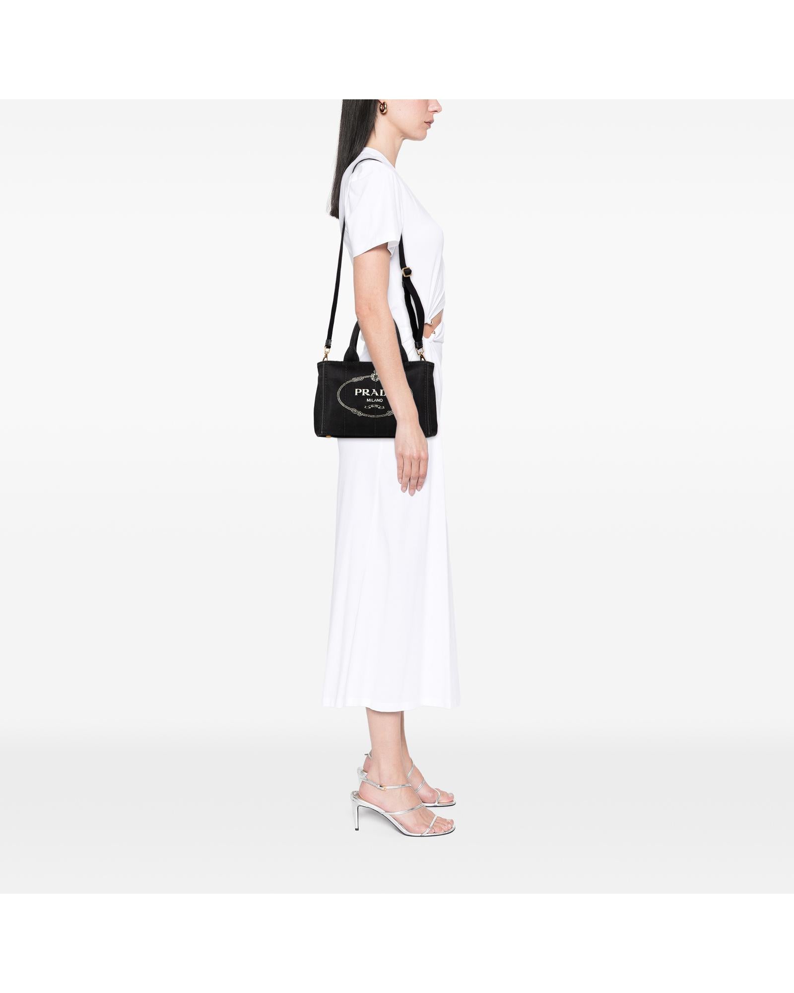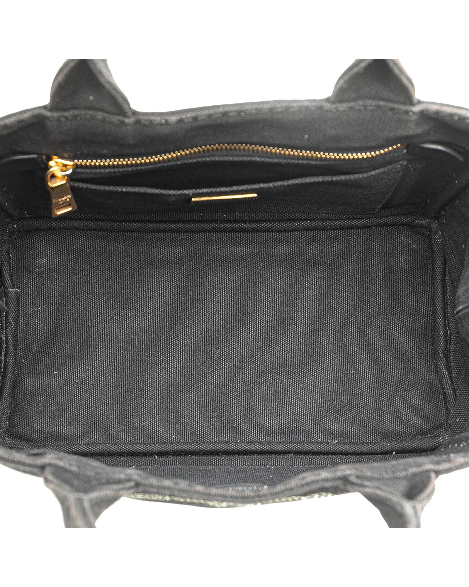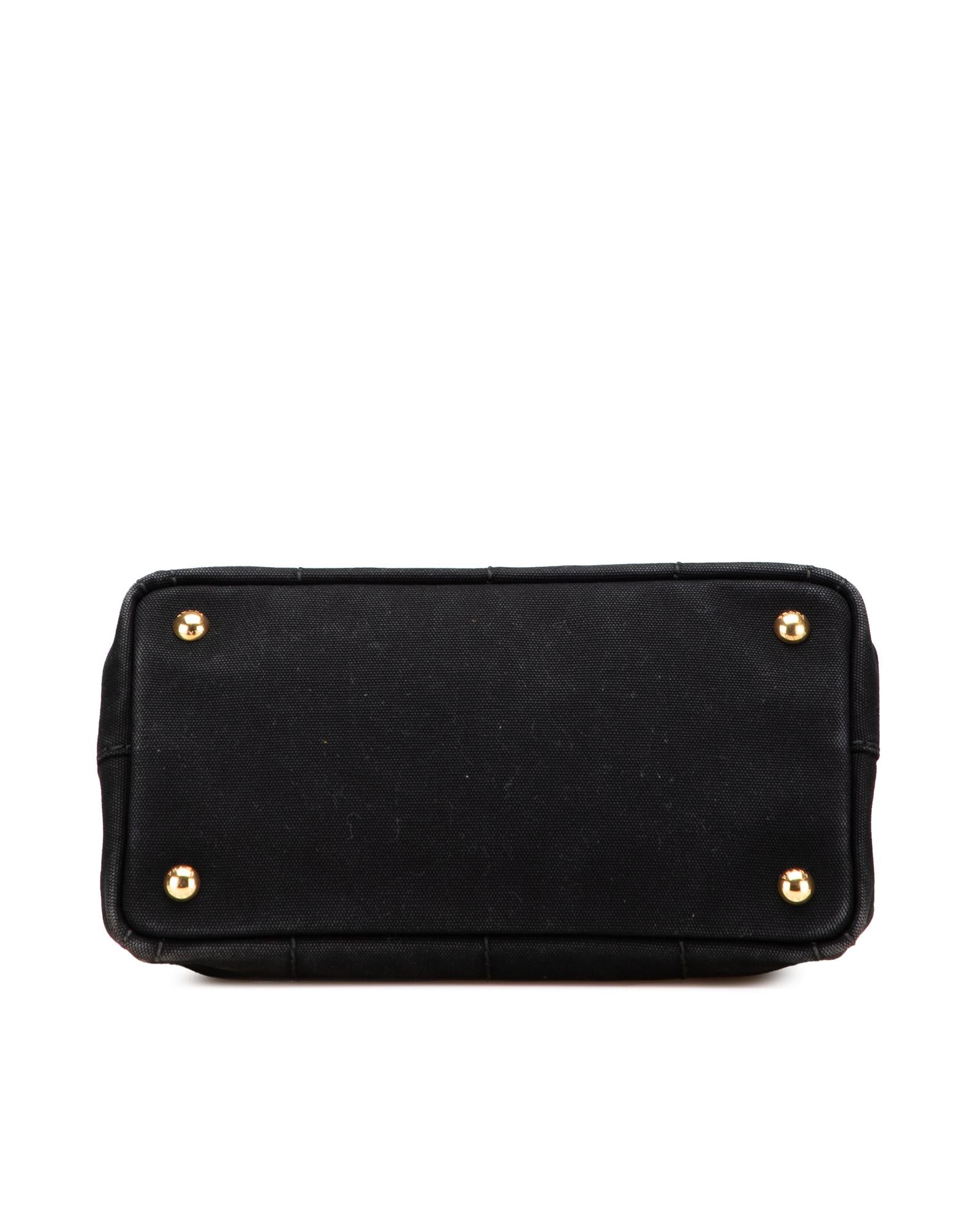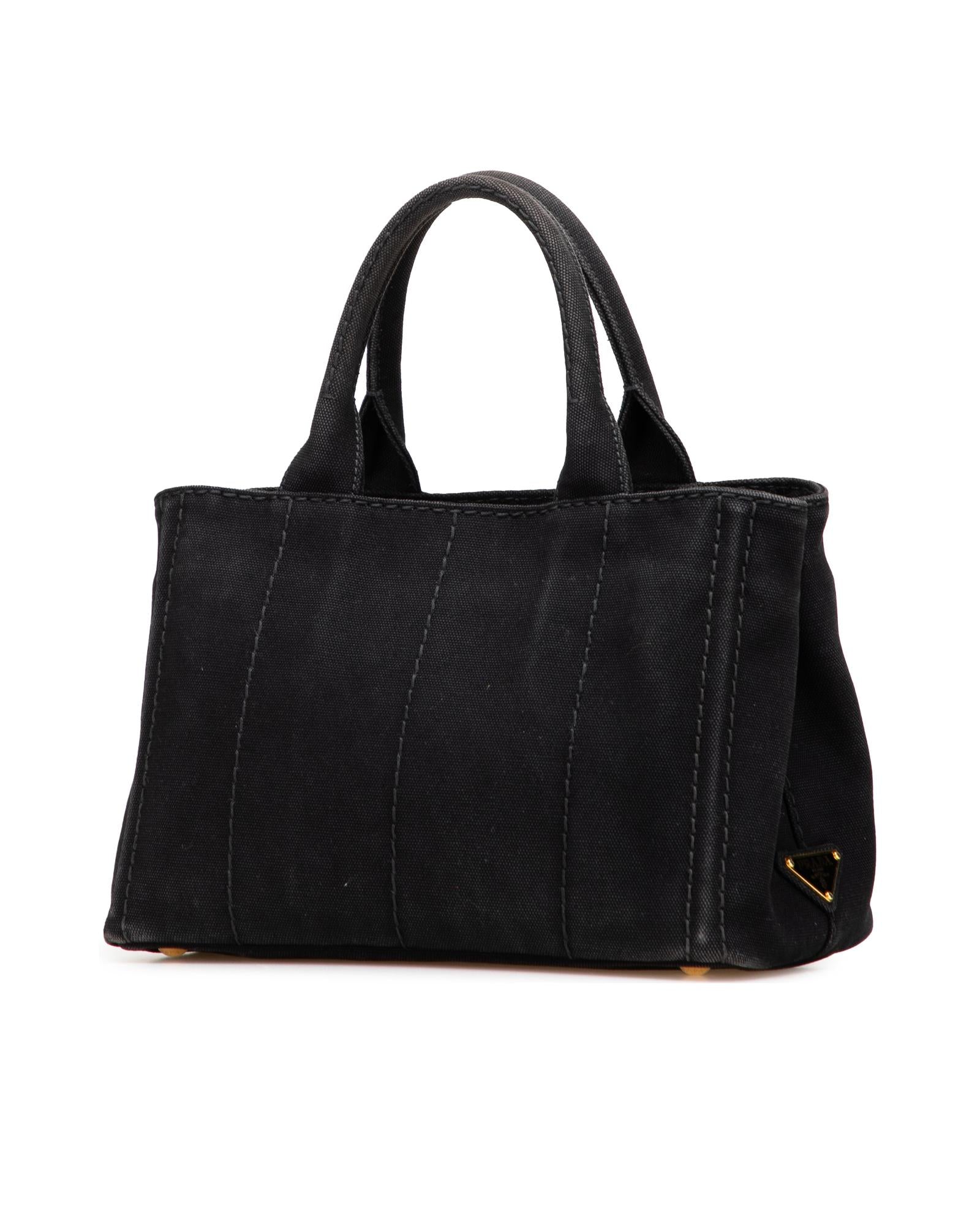 This satchel features a canvas body rolled canvas handles detachable flat strap an open top with side snap closures and interior zip and slip pockets.Brand: Prada