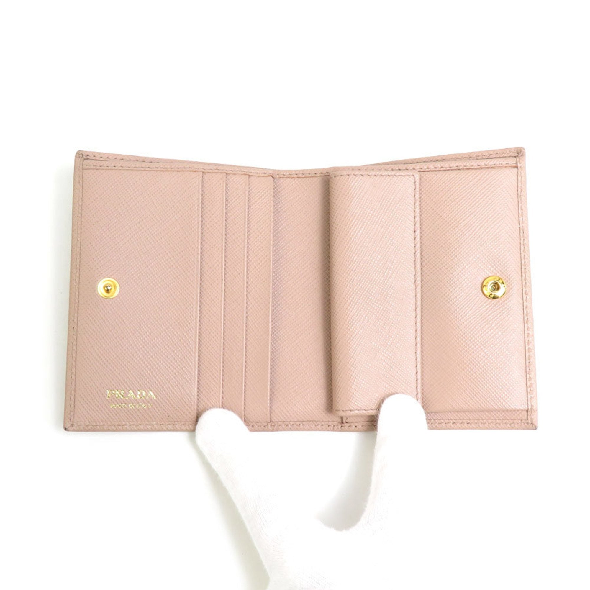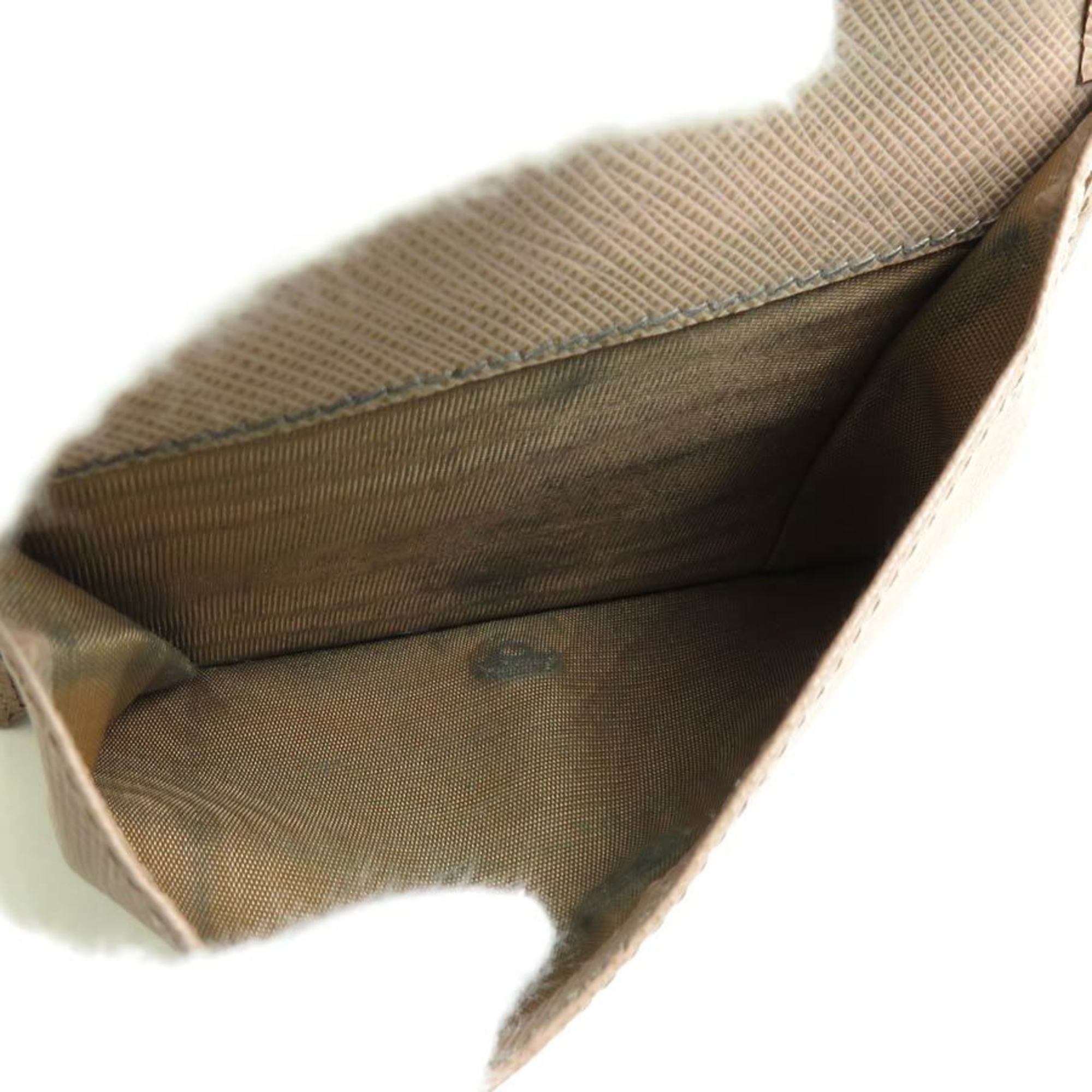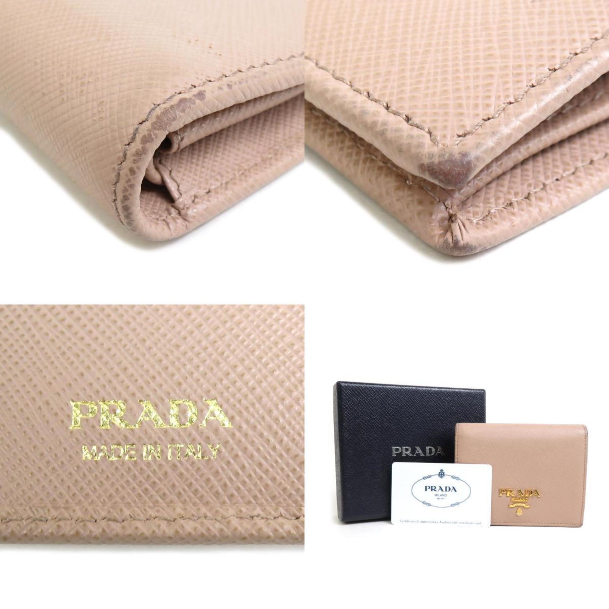 This Prada wallet is a bi-fold design crafted for women. Made from leather it features a stylish pink beige color showcasing Prada's commitment to quality materials and sophisticated design. The bi-fold style offers practicality and elegance making it a fashionable accessory for women who appreciate both functionality and luxury.