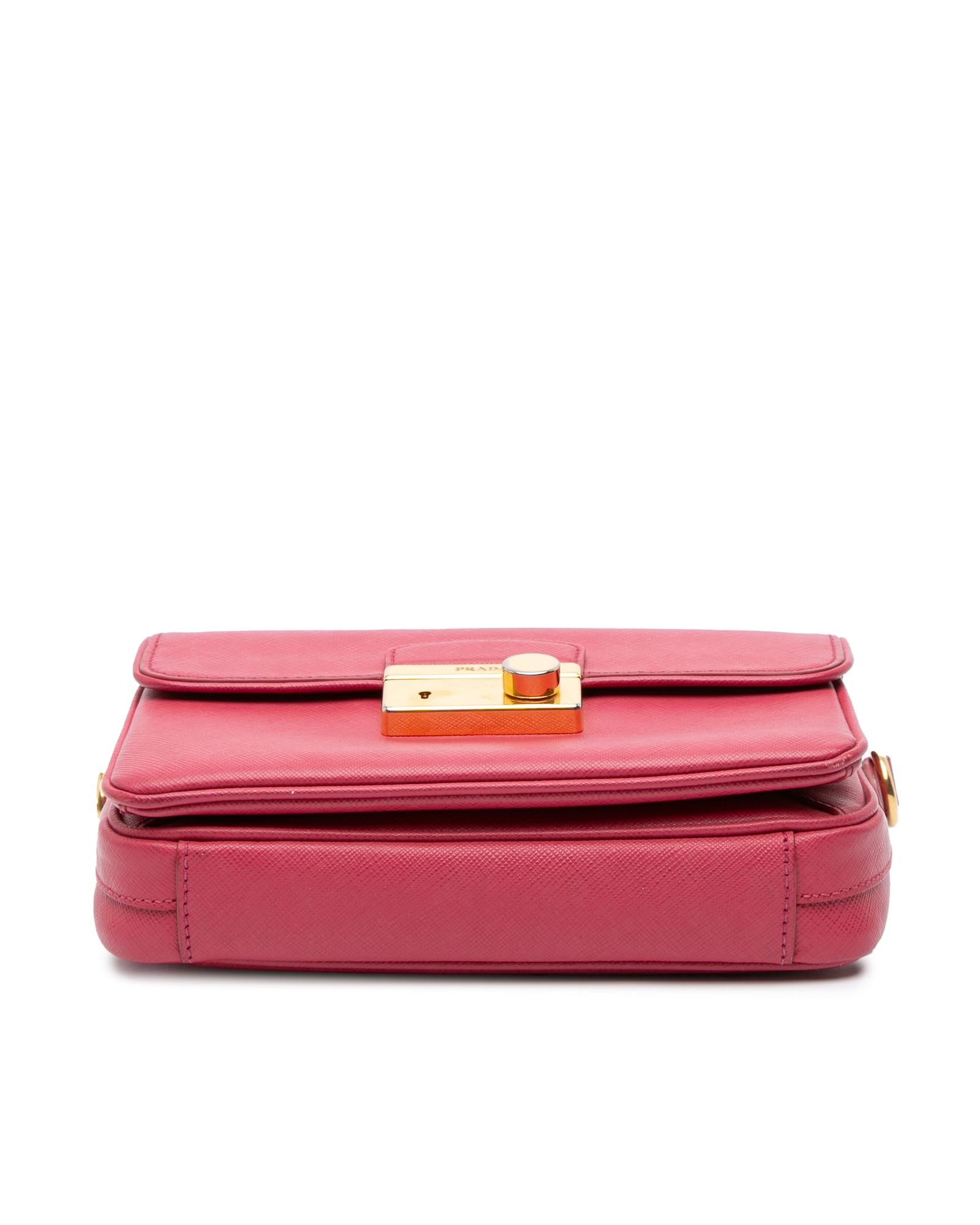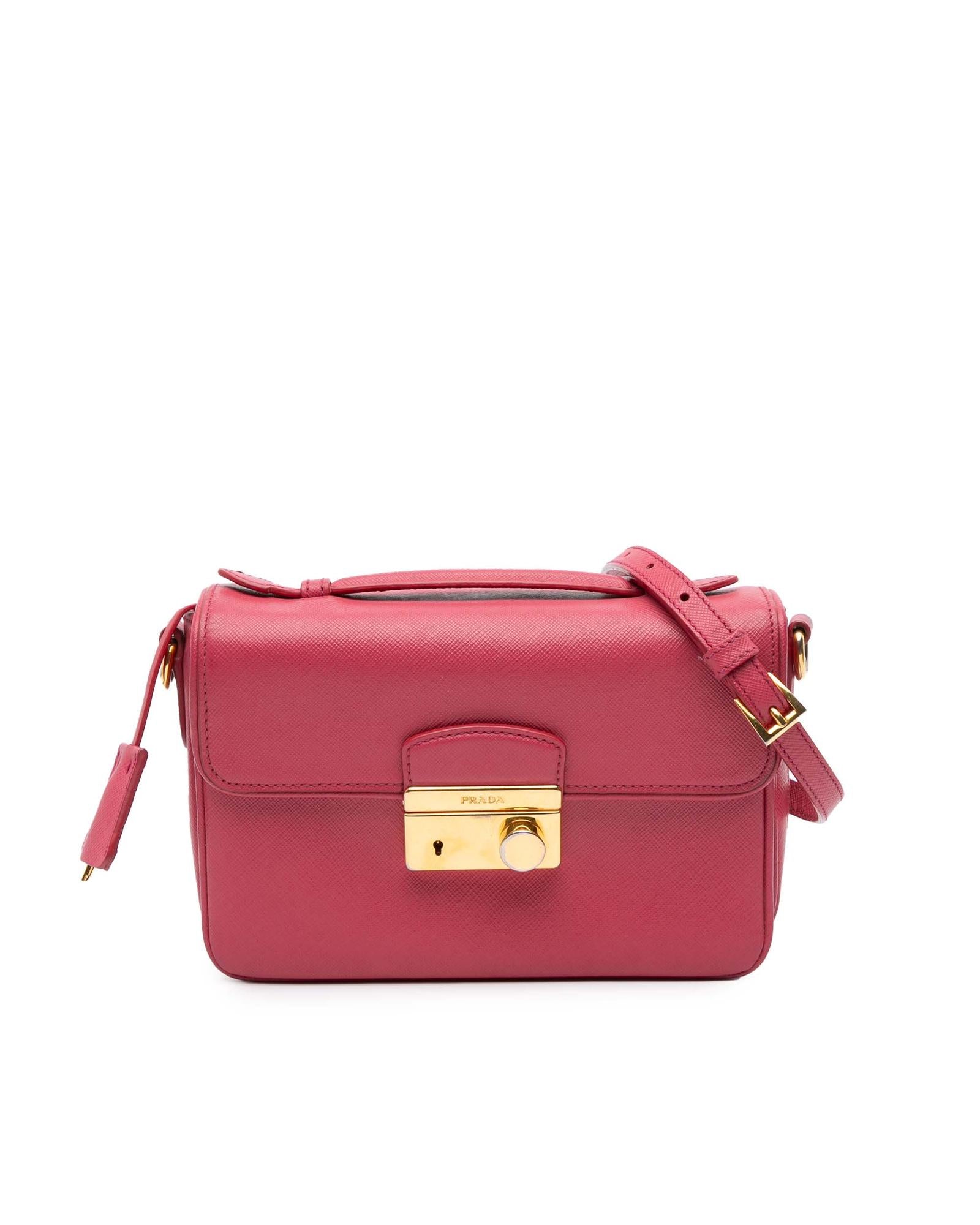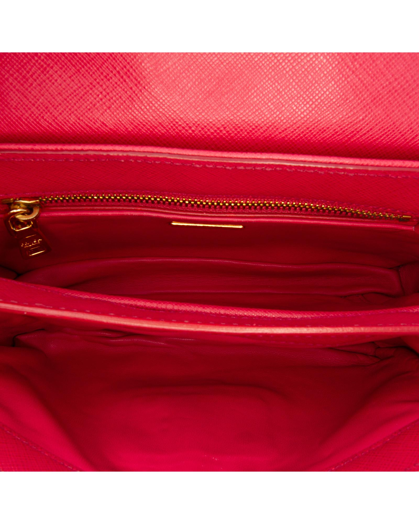 This satchel features a saffiano leather body a flat top handle an adjustable and detachable flat leather strap a flap with push lock closure an exterior slip pocket with magnetic snap closure and an interior zip pocket.Brand: Prada
