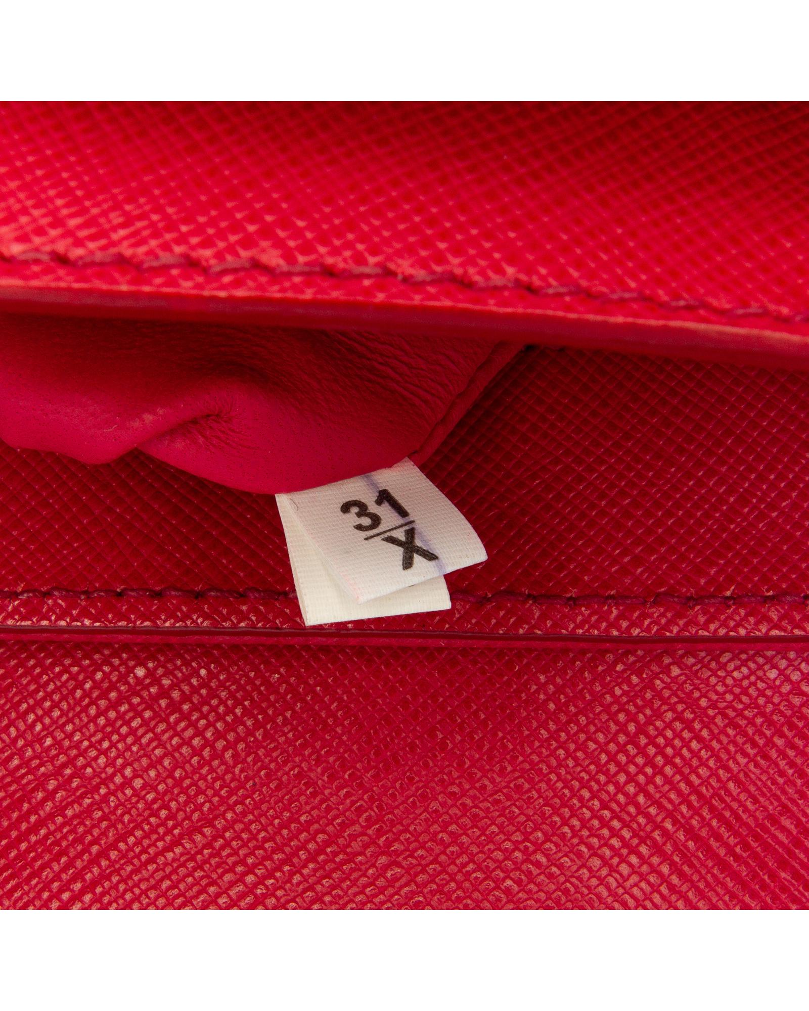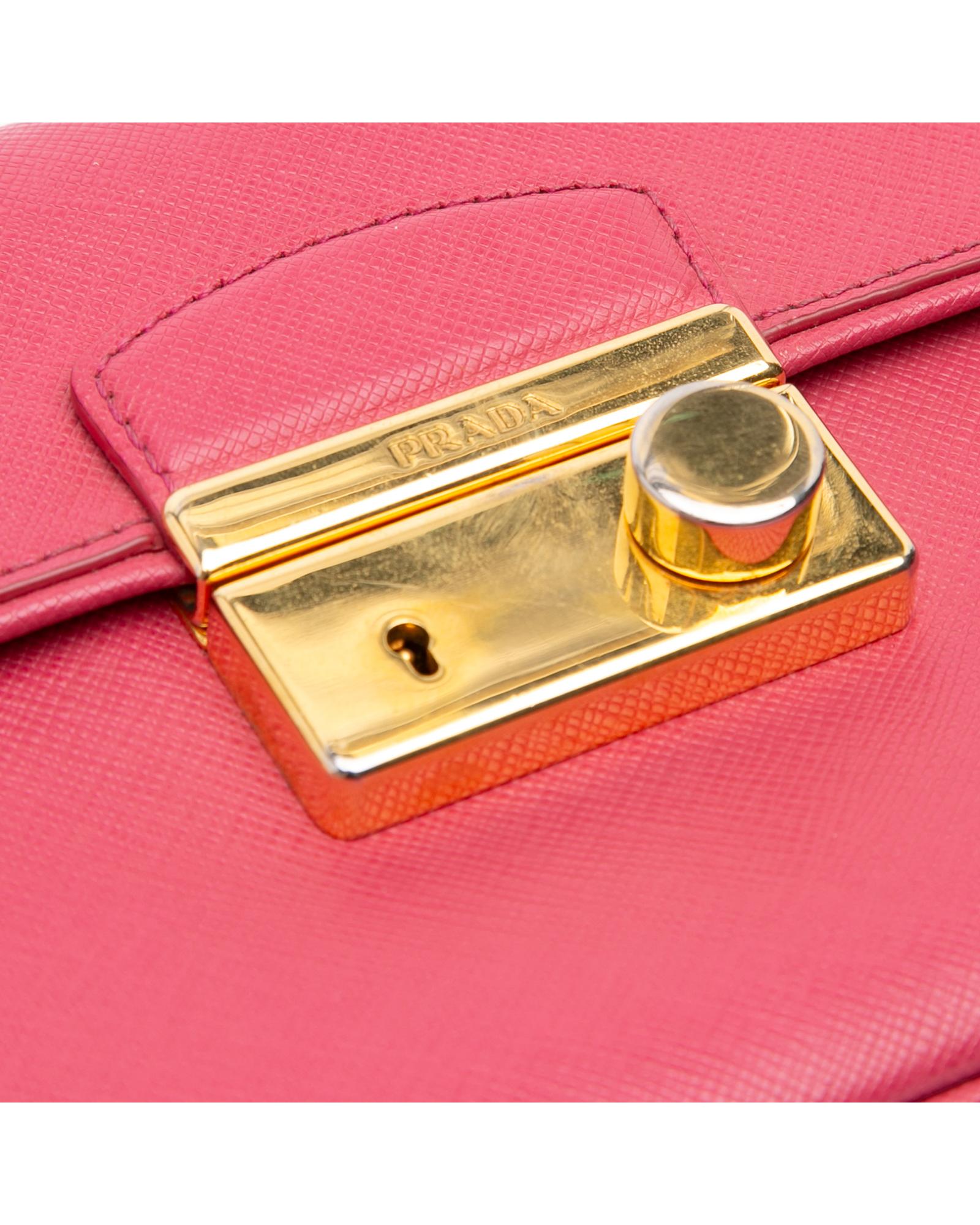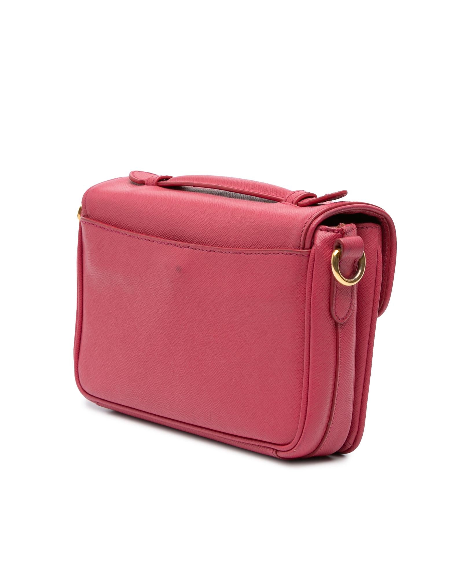 This satchel features a saffiano leather body a flat top handle an adjustable and detachable flat leather strap a flap with push lock closure an exterior slip pocket with magnetic snap closure and an interior zip pocket.Brand: Prada