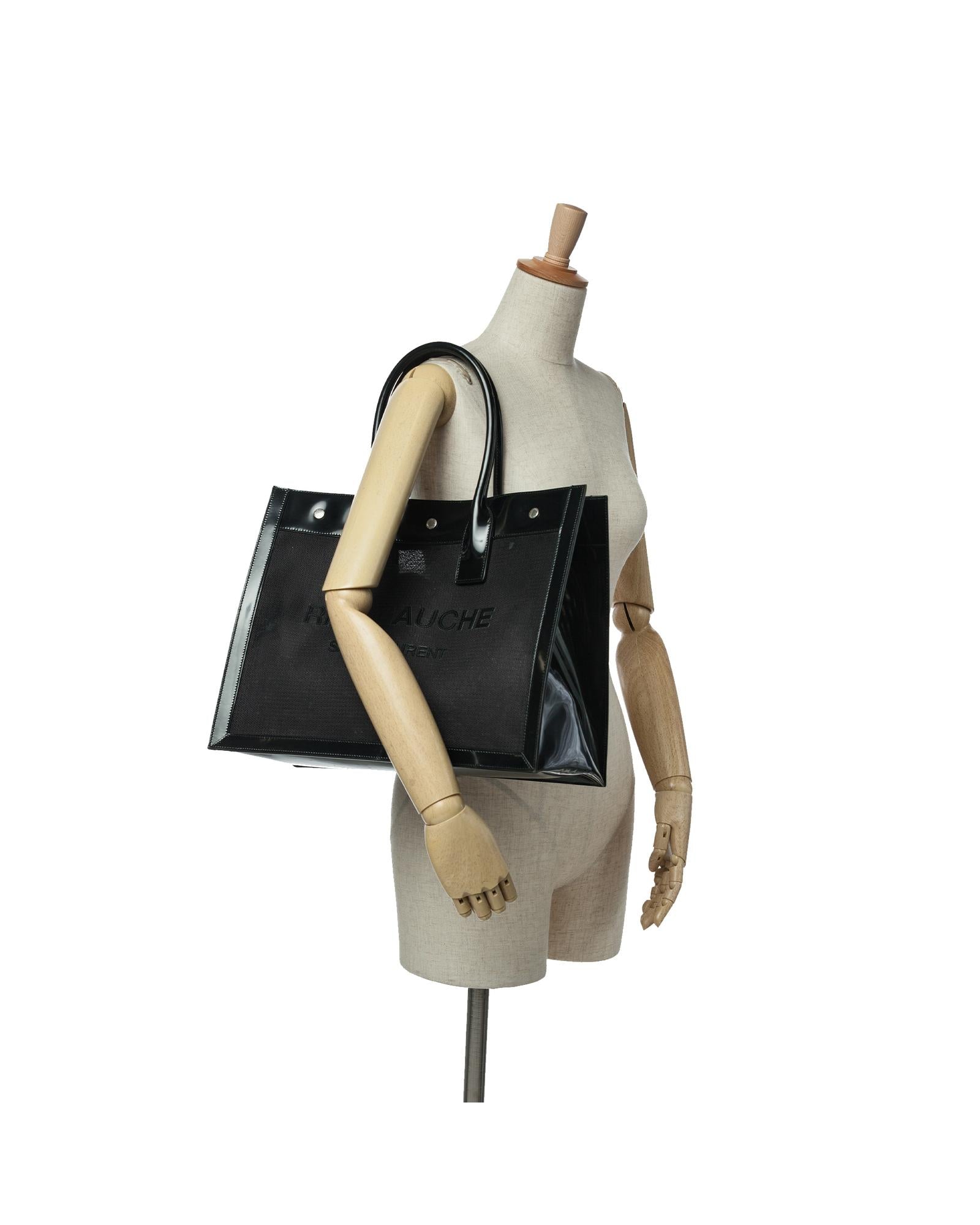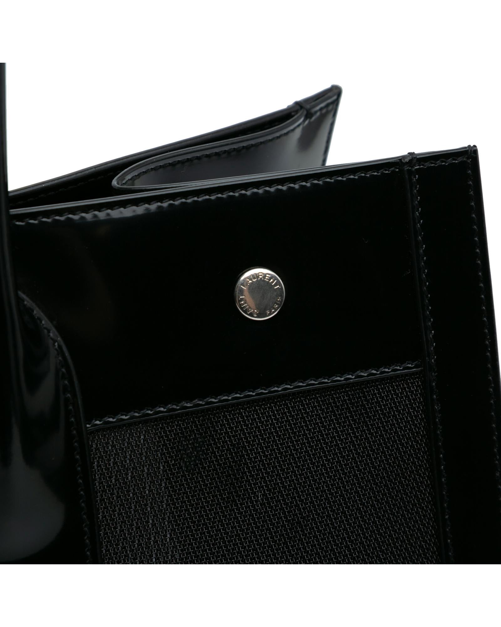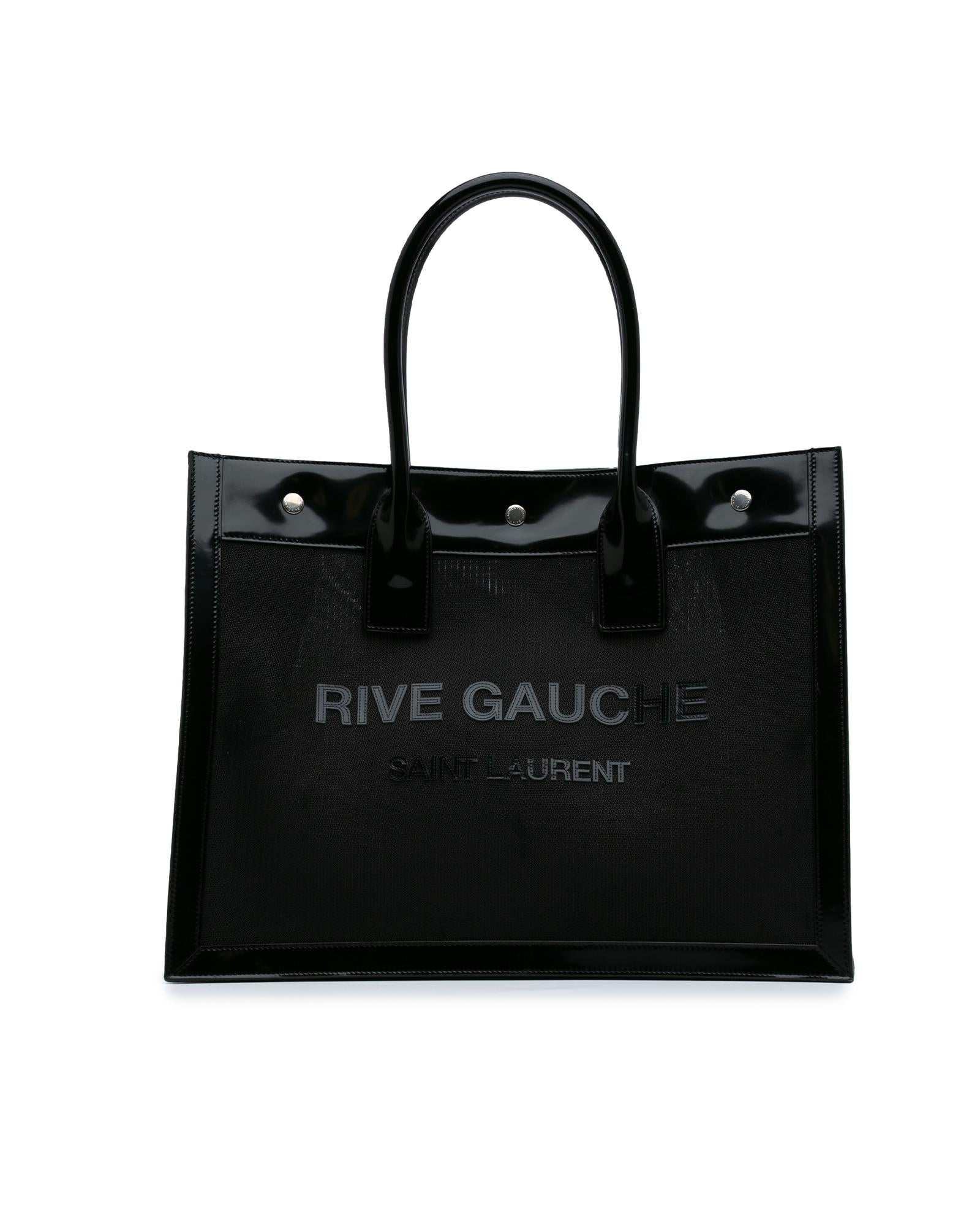 The Rive Gauche features a mesh body with patent leather trim rolled leather handles and an open top with snap button closures.Brand: Saint Laurent Vintage