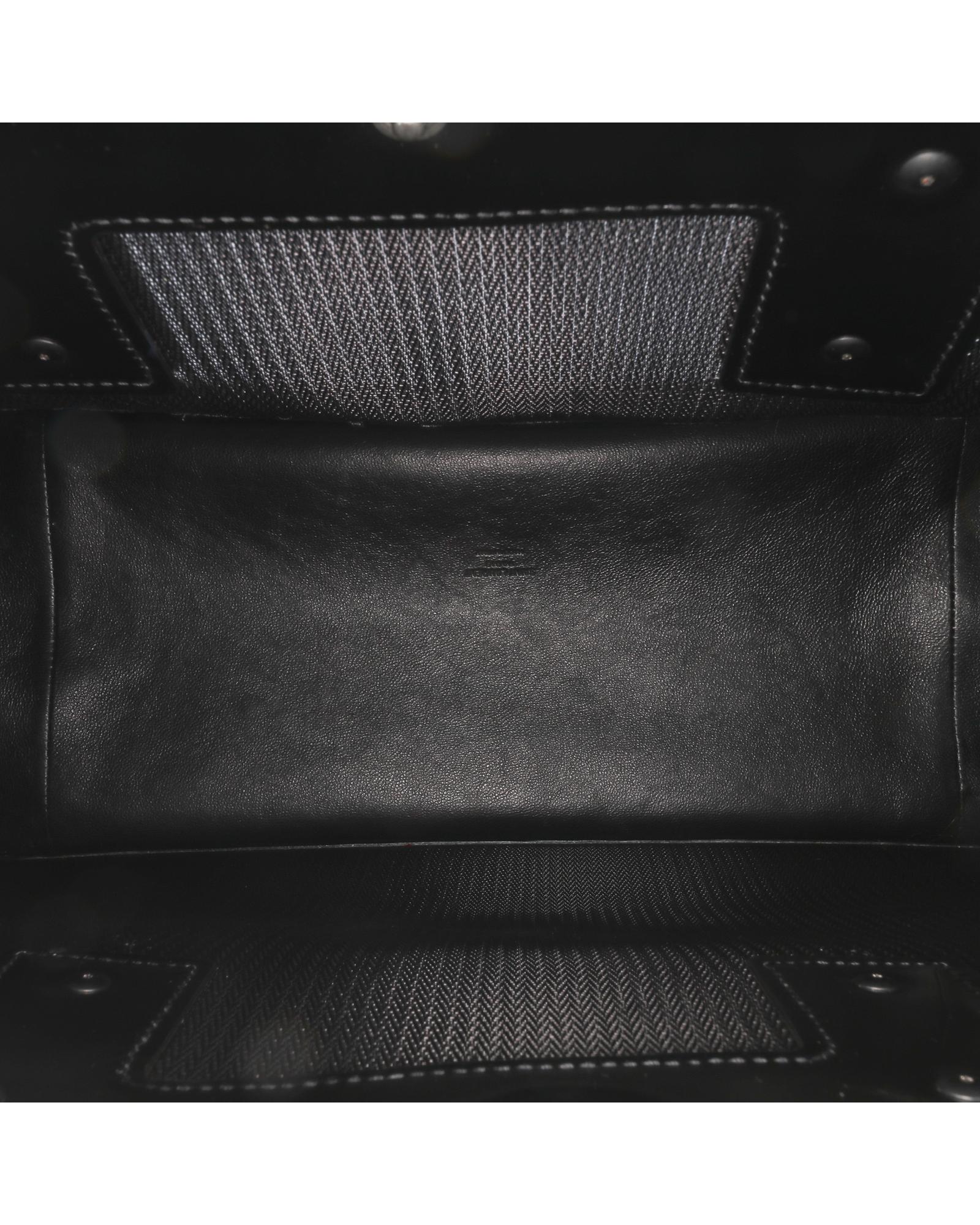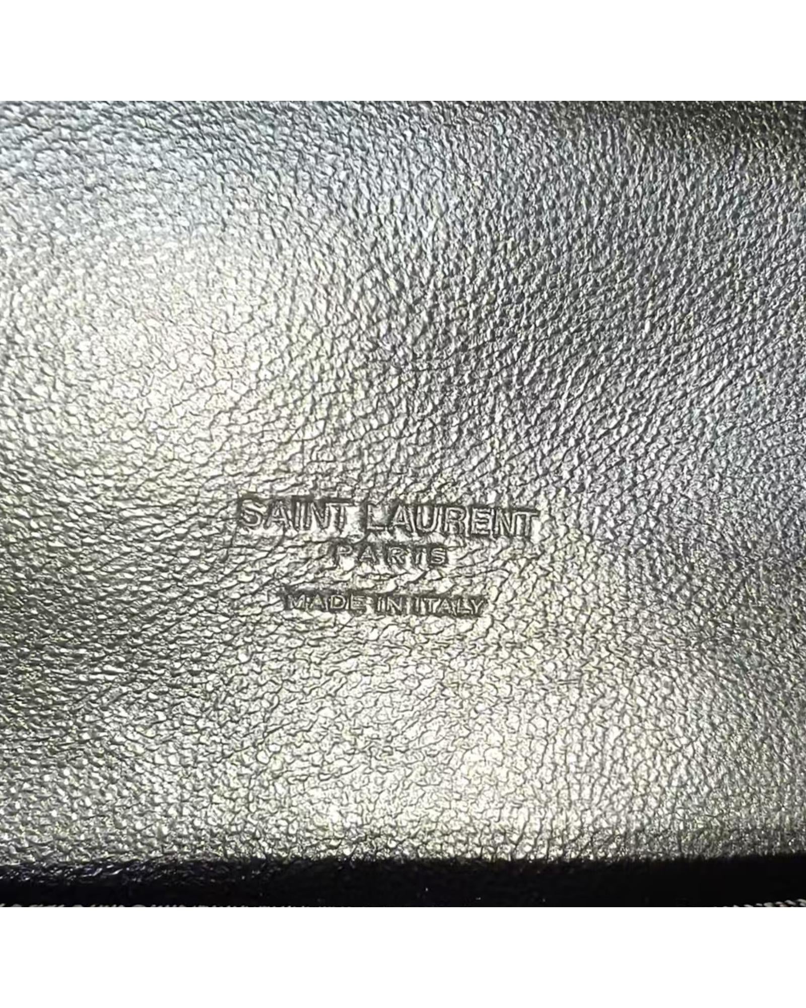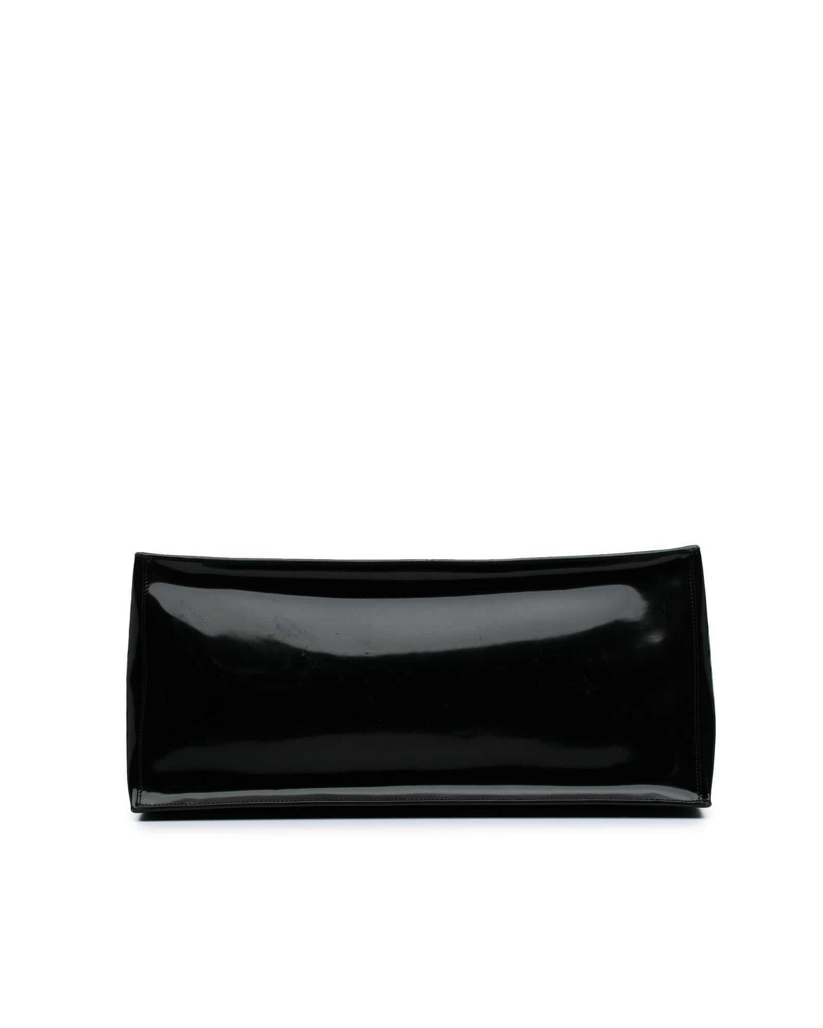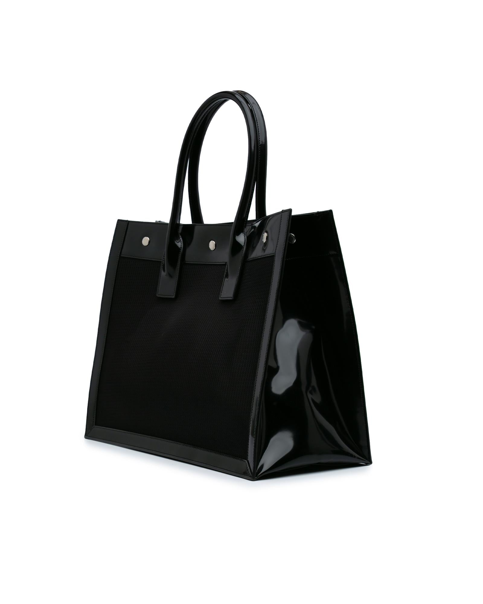The Rive Gauche features a mesh body with patent leather trim rolled leather handles and an open top with snap button closures.Brand: Saint Laurent Vintage