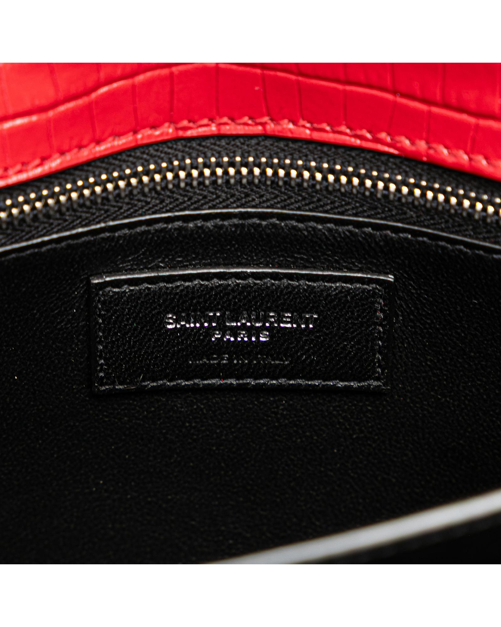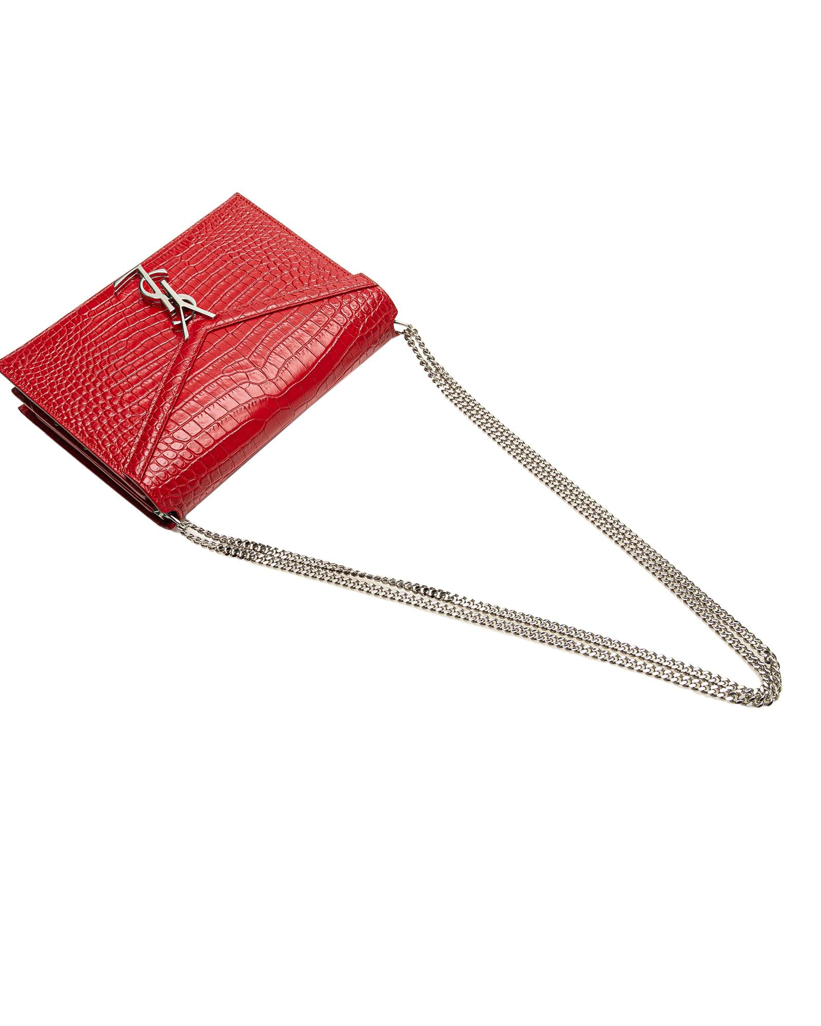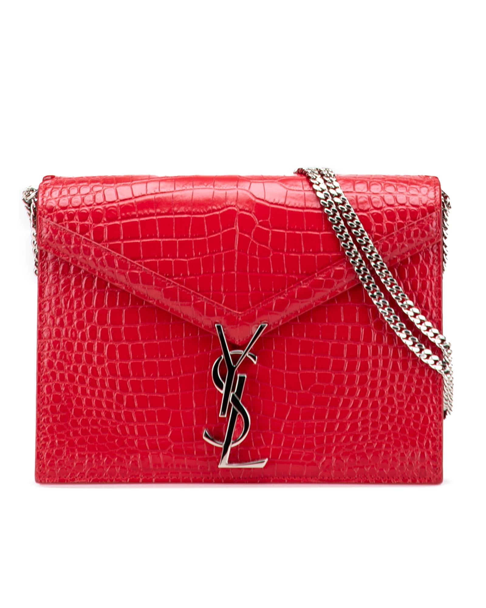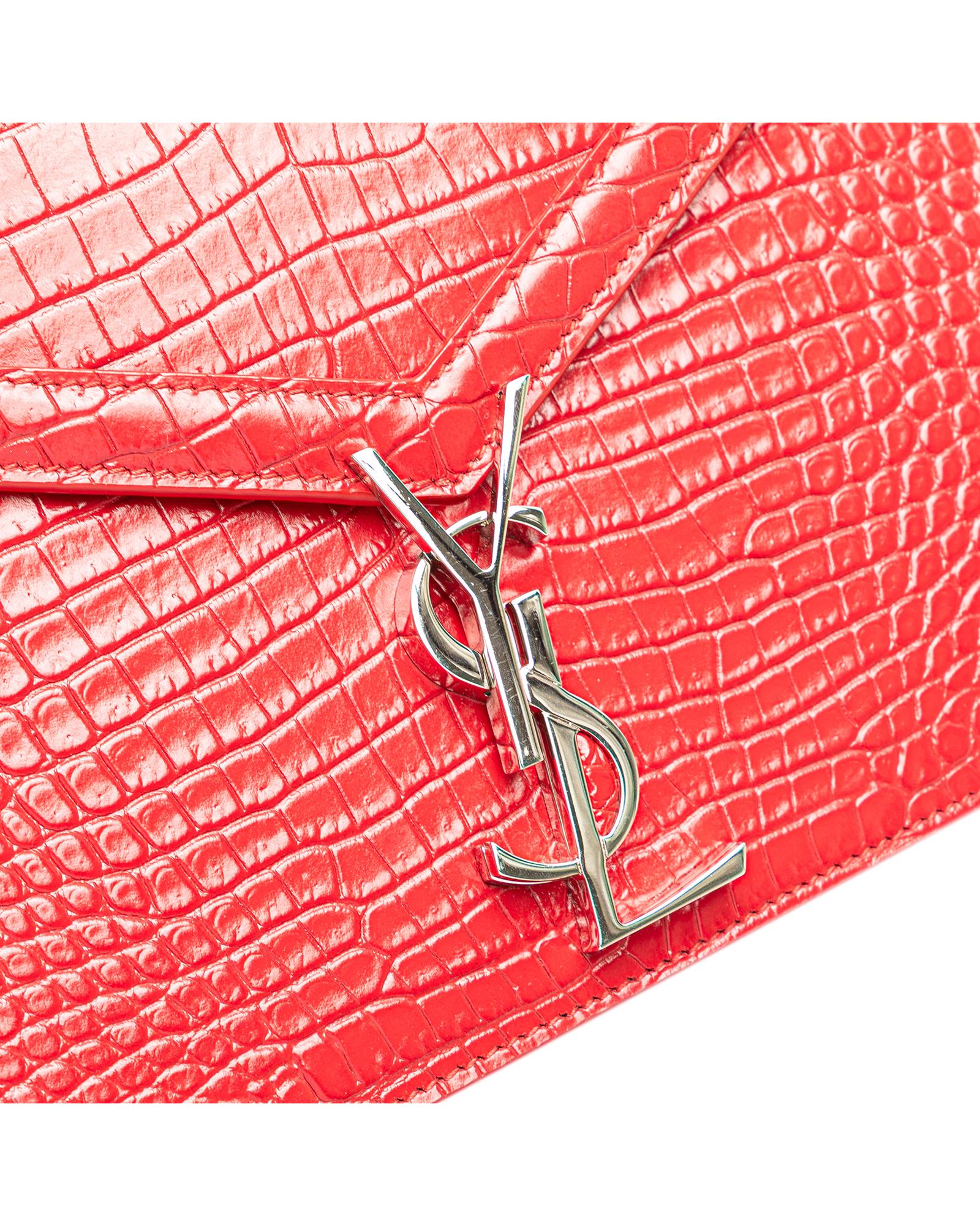 The Cassandra features an embossed leather body a gold tone chain strap a front flap with a metal YSL logo and magnetic closure and interior zip and slip pockets.Brand: Saint Laurent Vintage