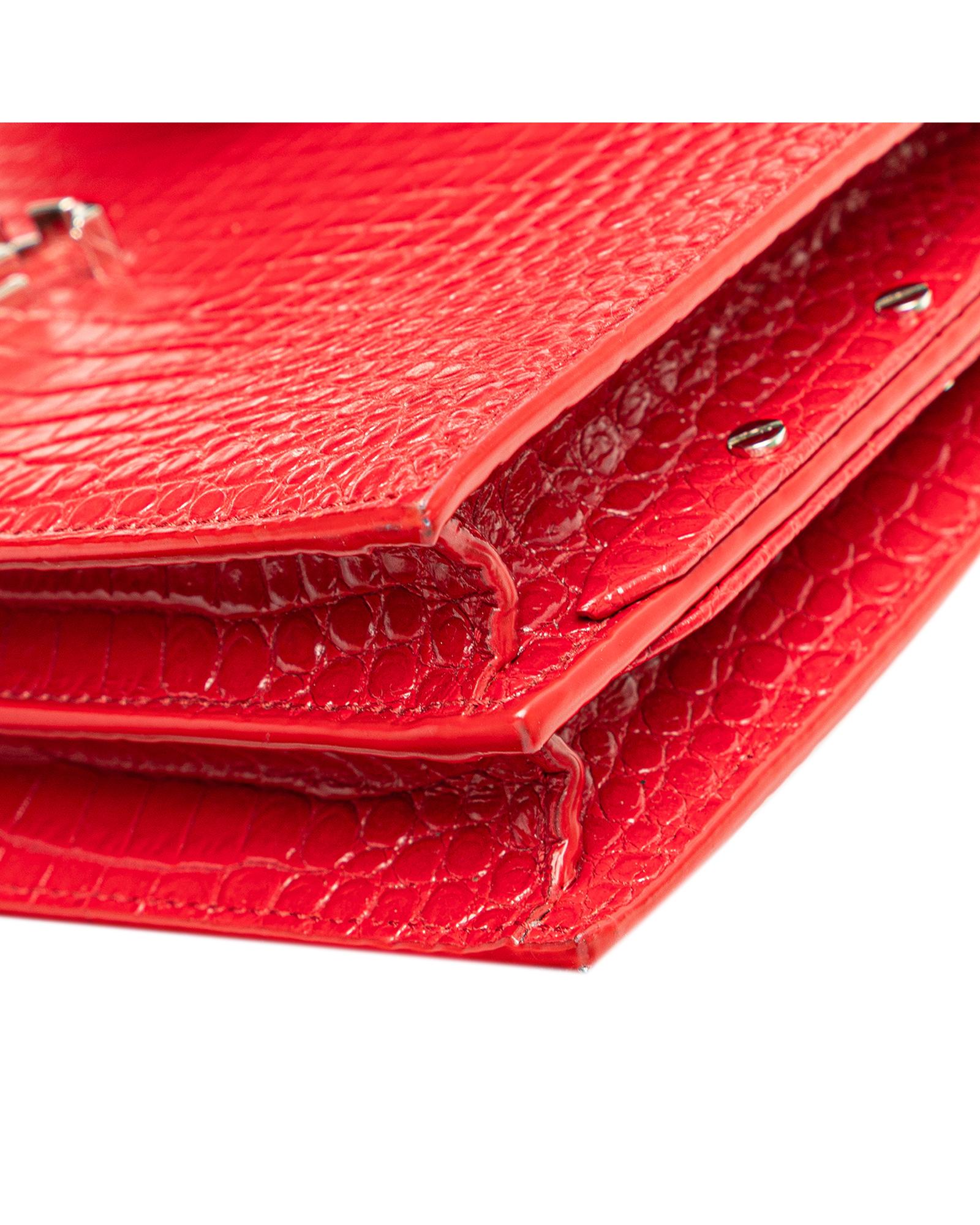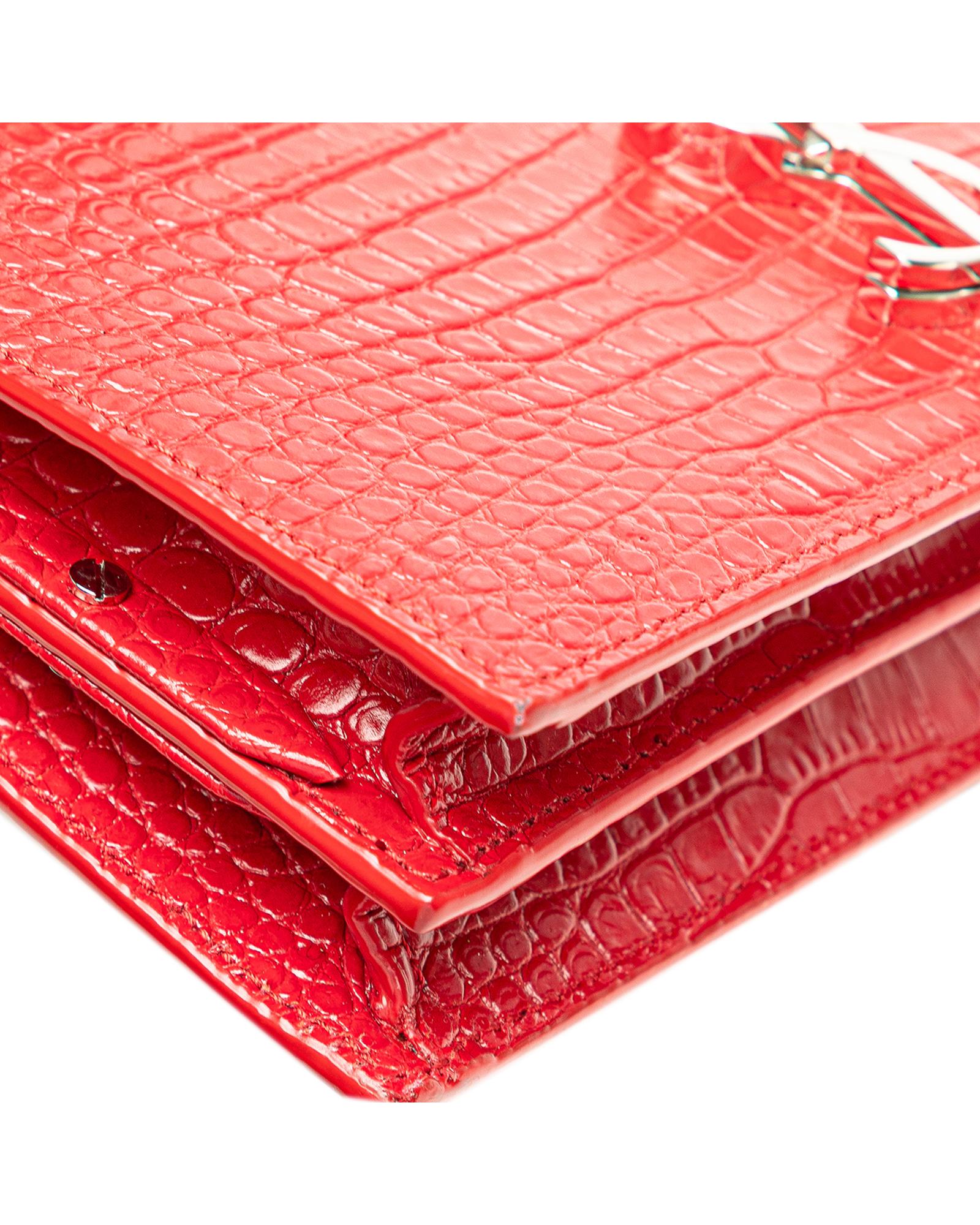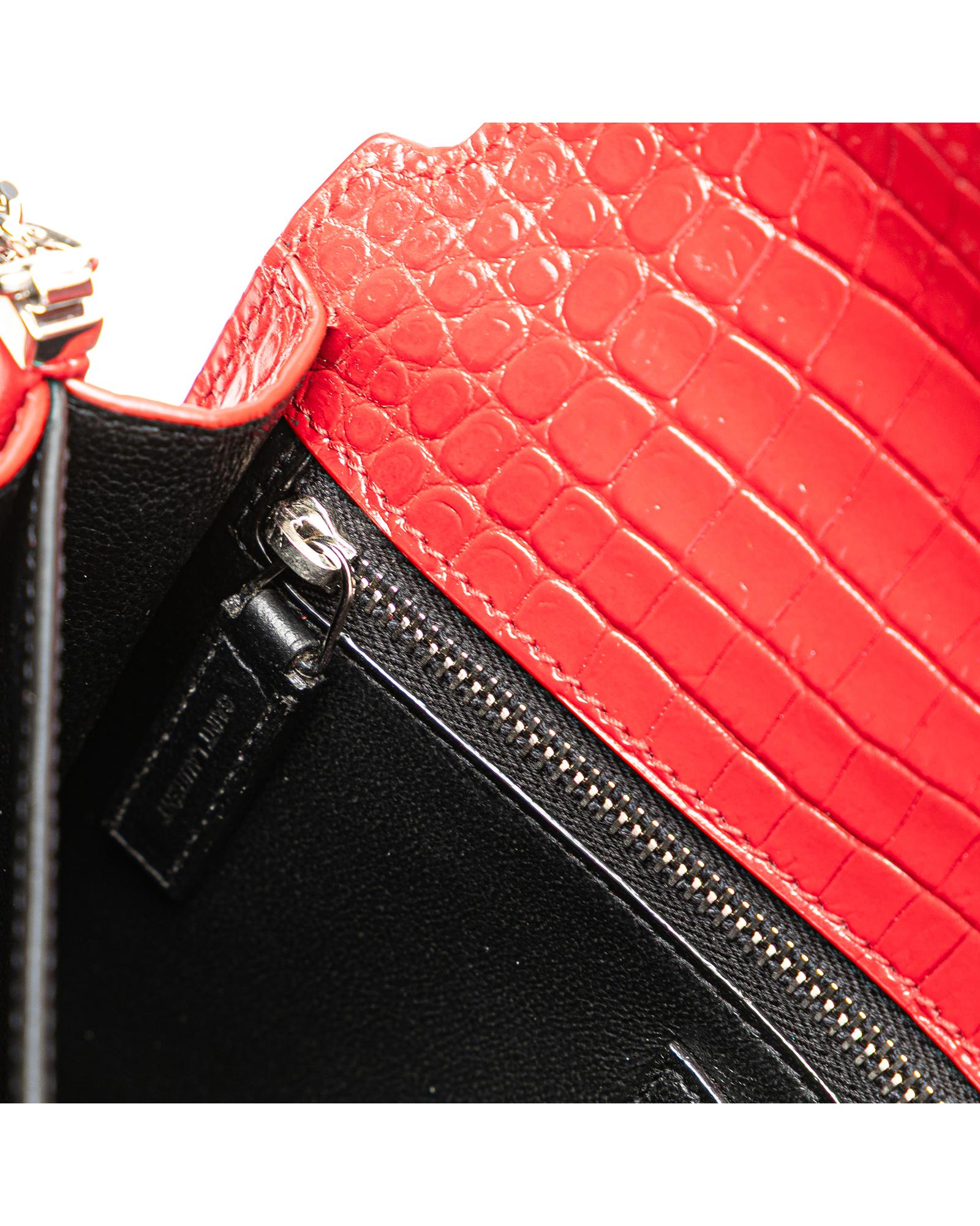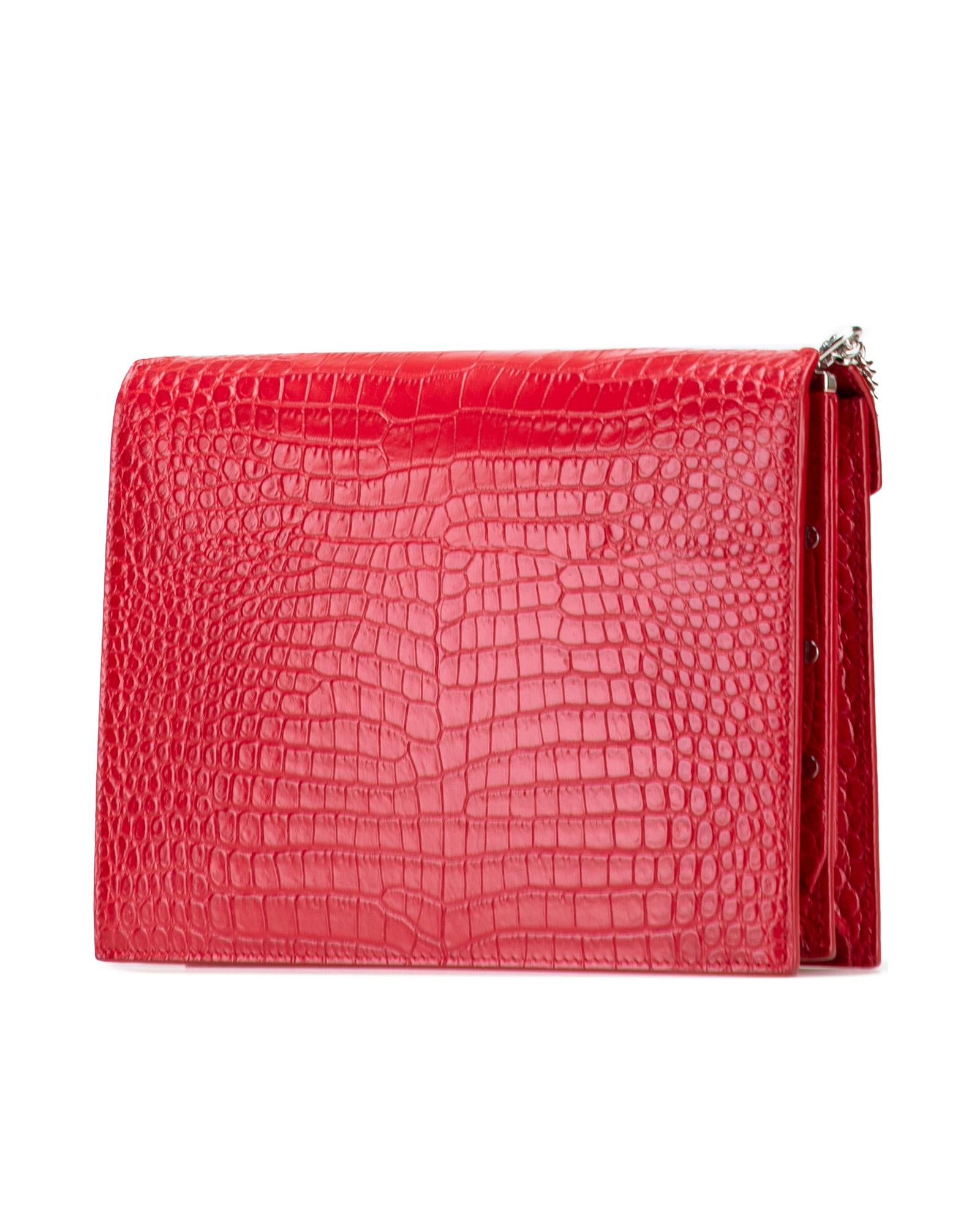 The Cassandra features an embossed leather body a gold tone chain strap a front flap with a metal YSL logo and magnetic closure and interior zip and slip pockets.Brand: Saint Laurent Vintage