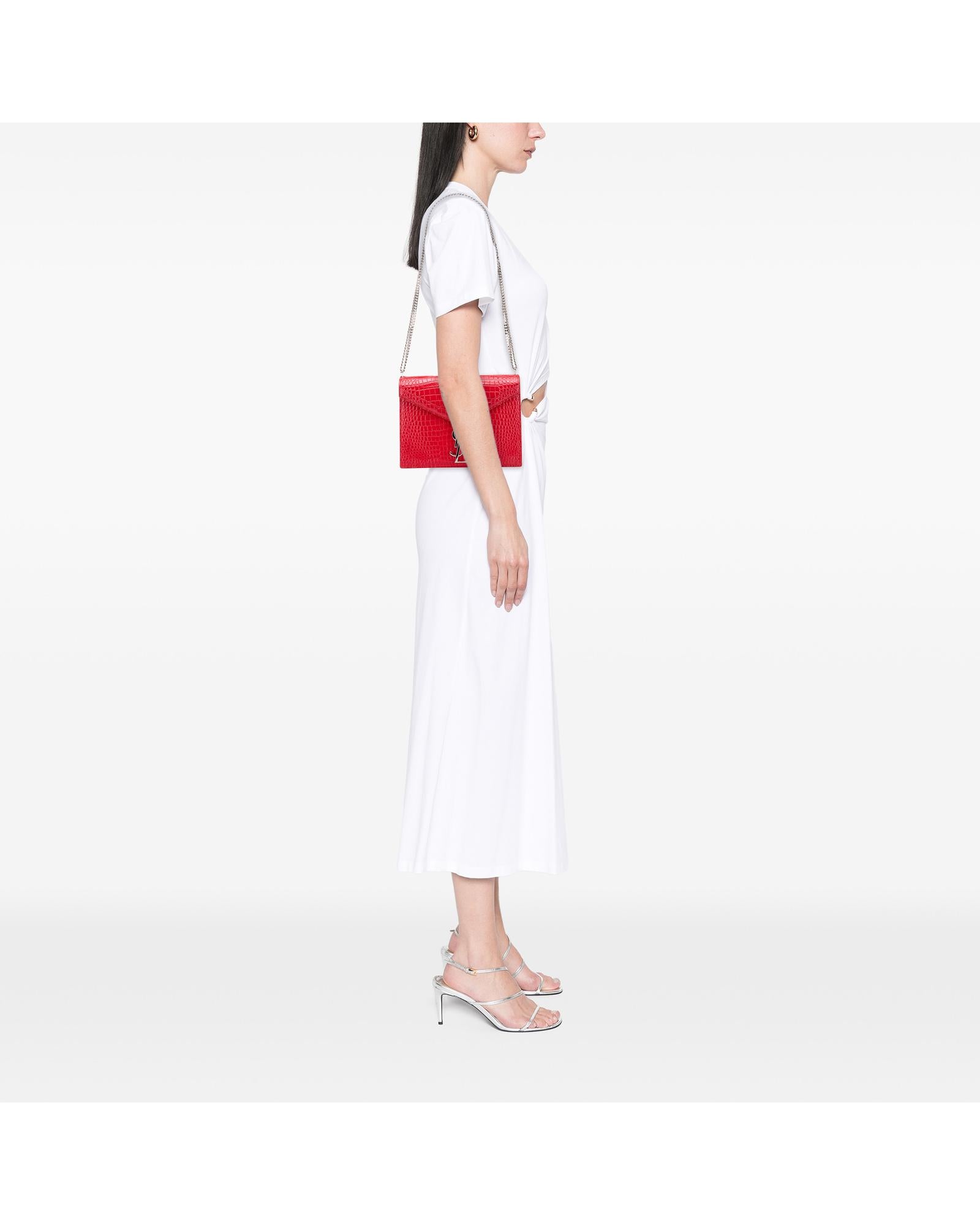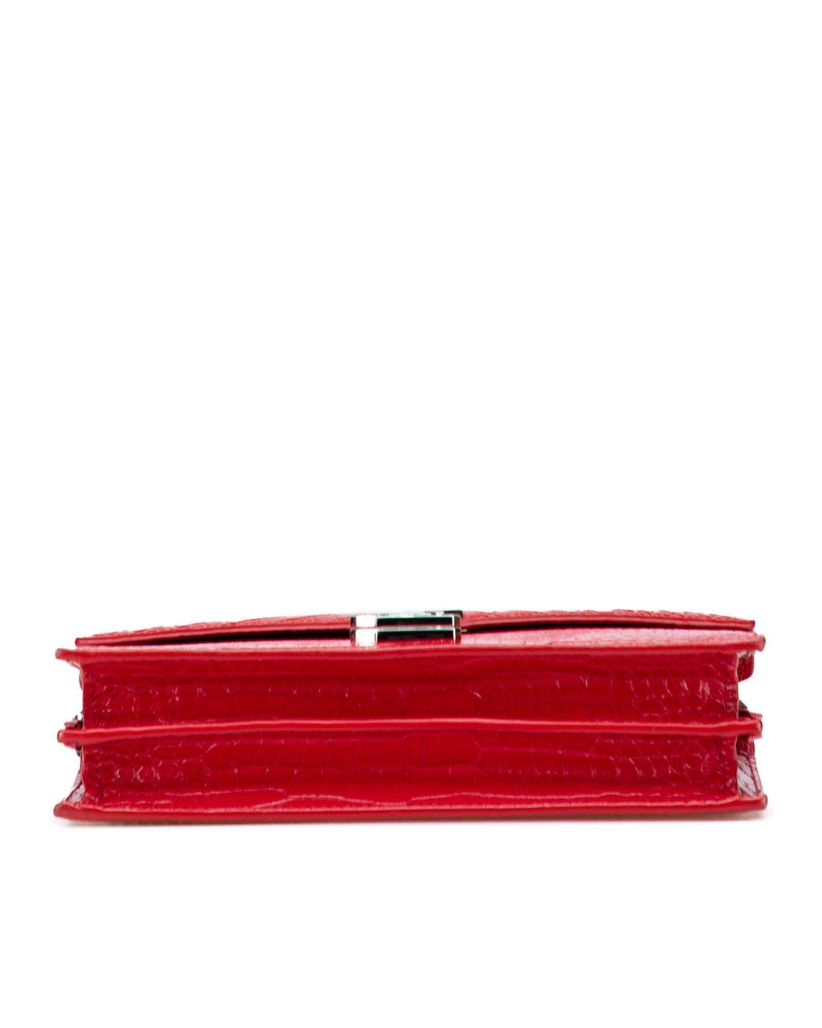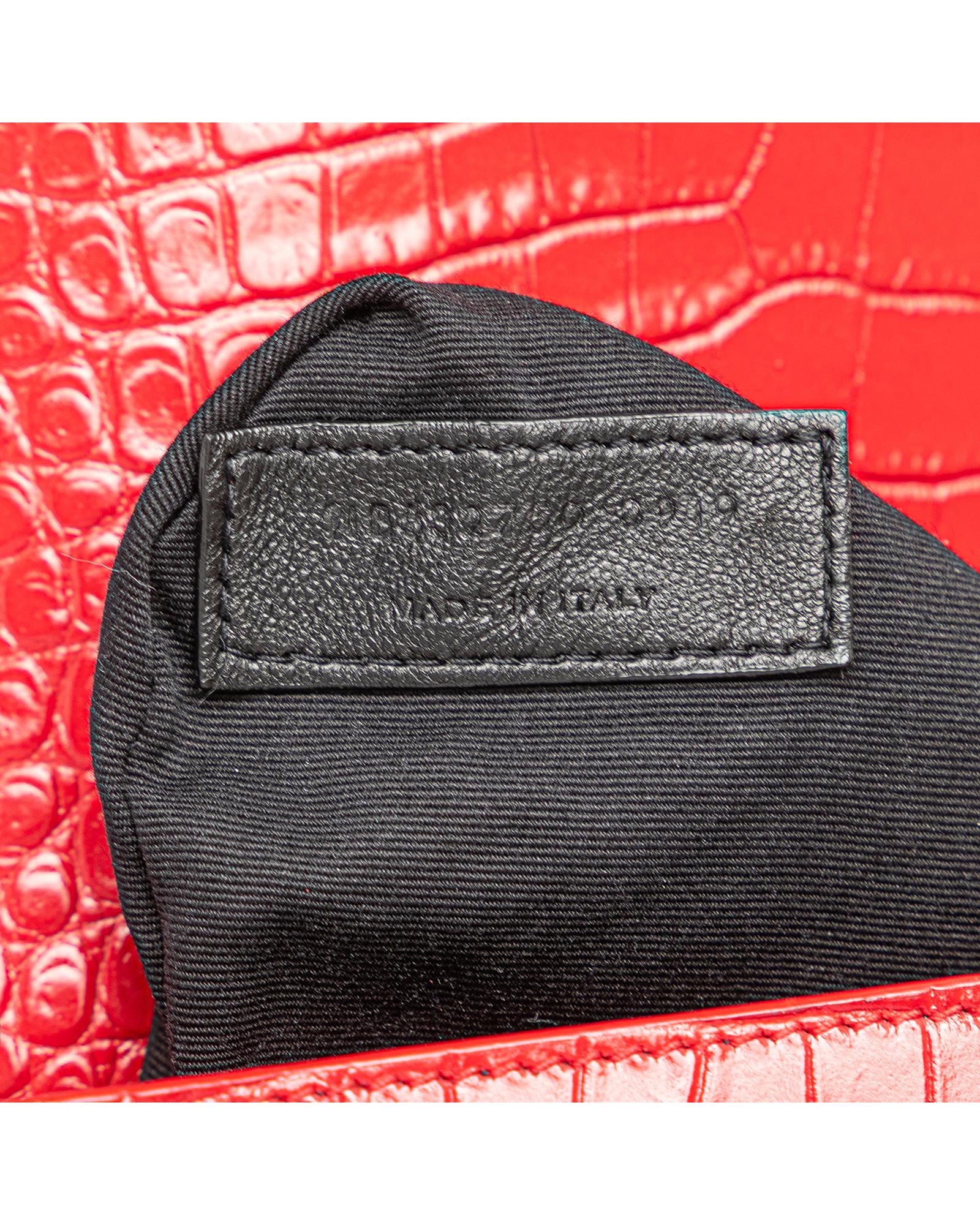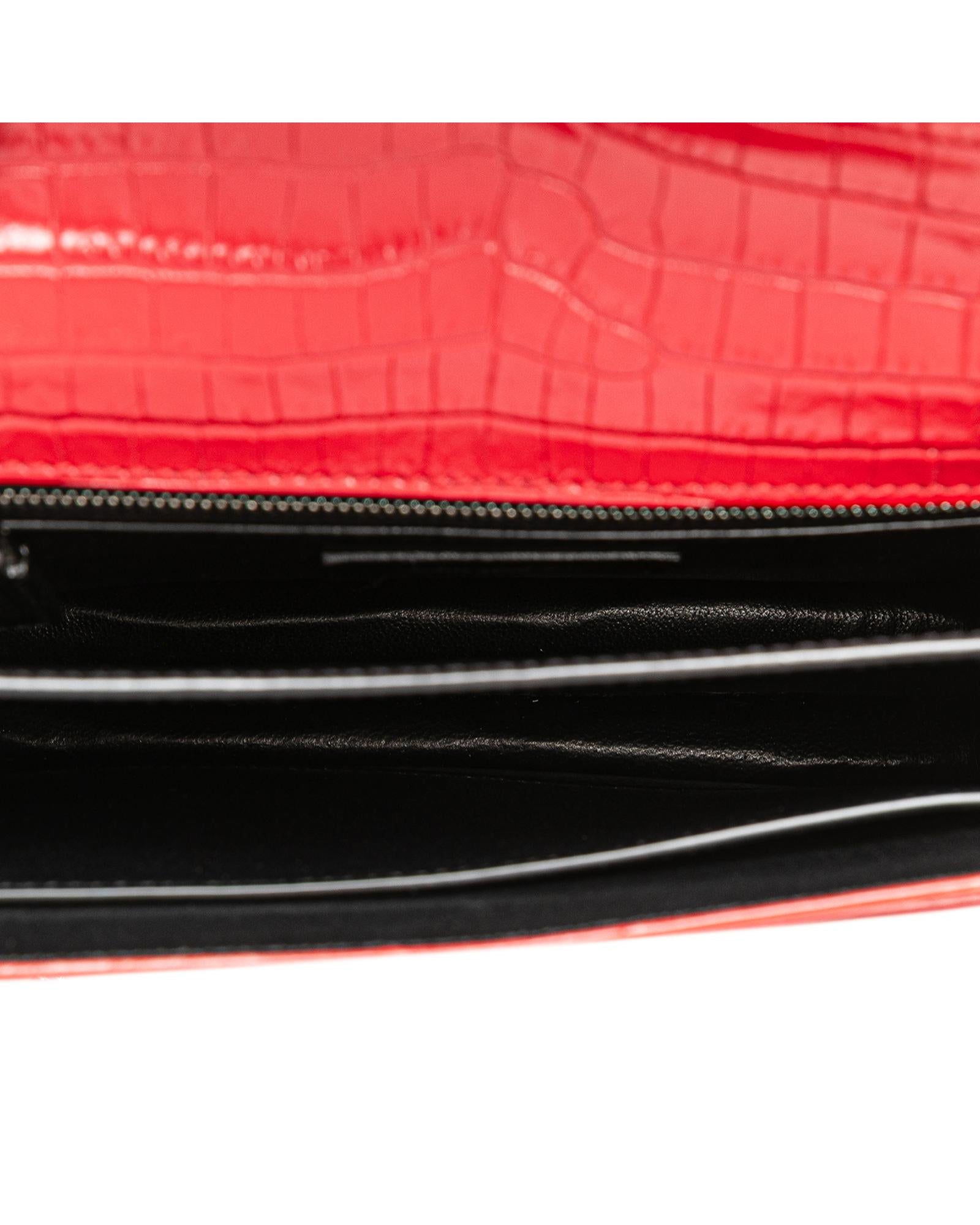 The Cassandra features an embossed leather body a gold tone chain strap a front flap with a metal YSL logo and magnetic closure and interior zip and slip pockets.Brand: Saint Laurent Vintage