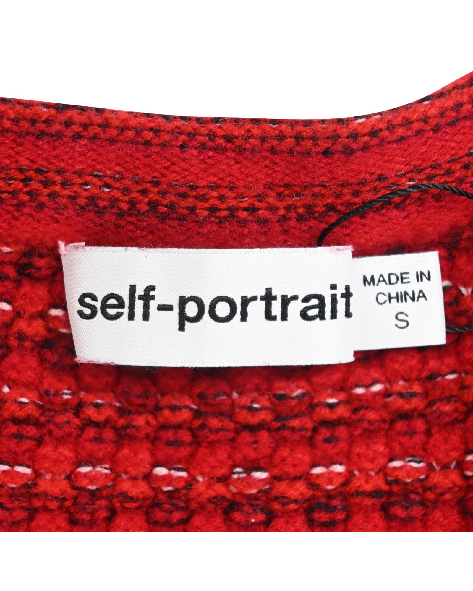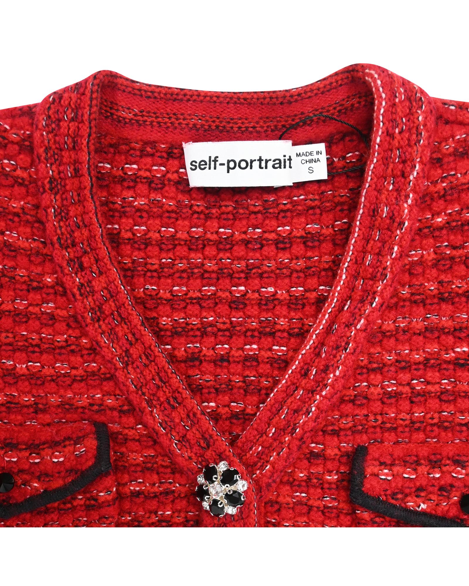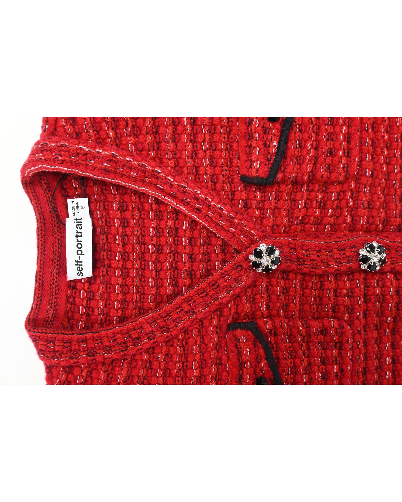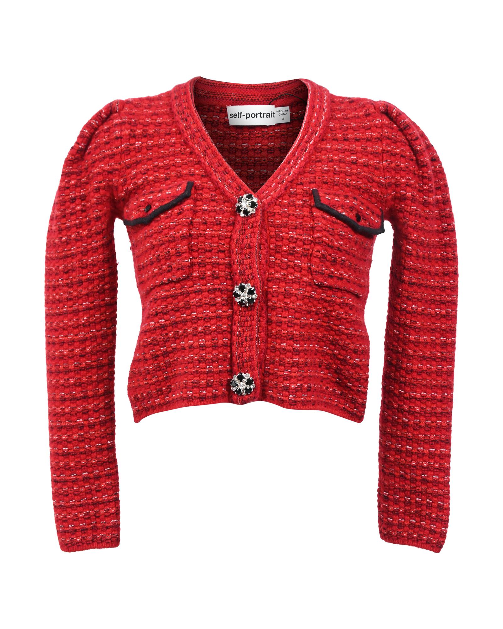 • Portrait Floral Diamante Button Melange Knit Cardigan In Red Wool