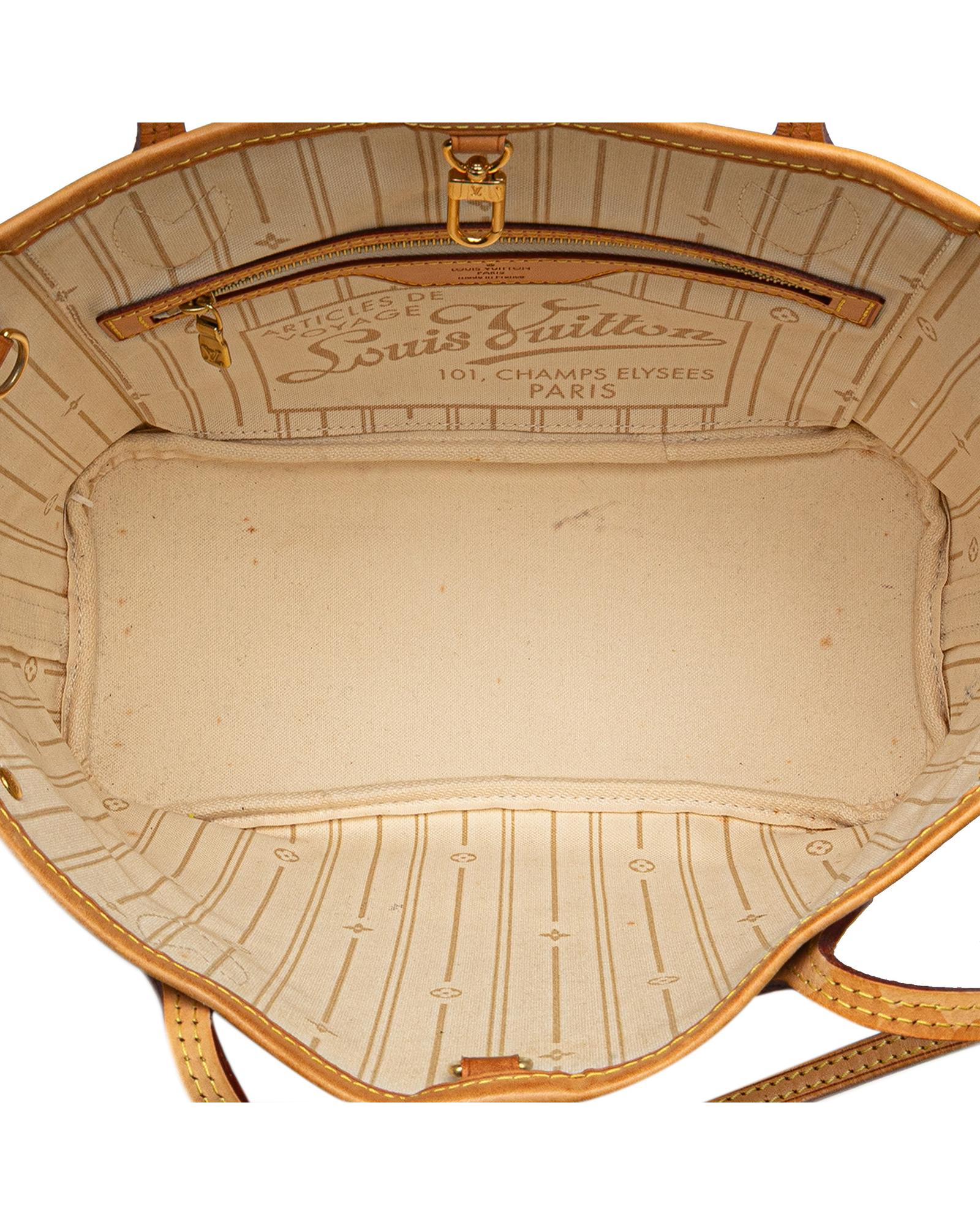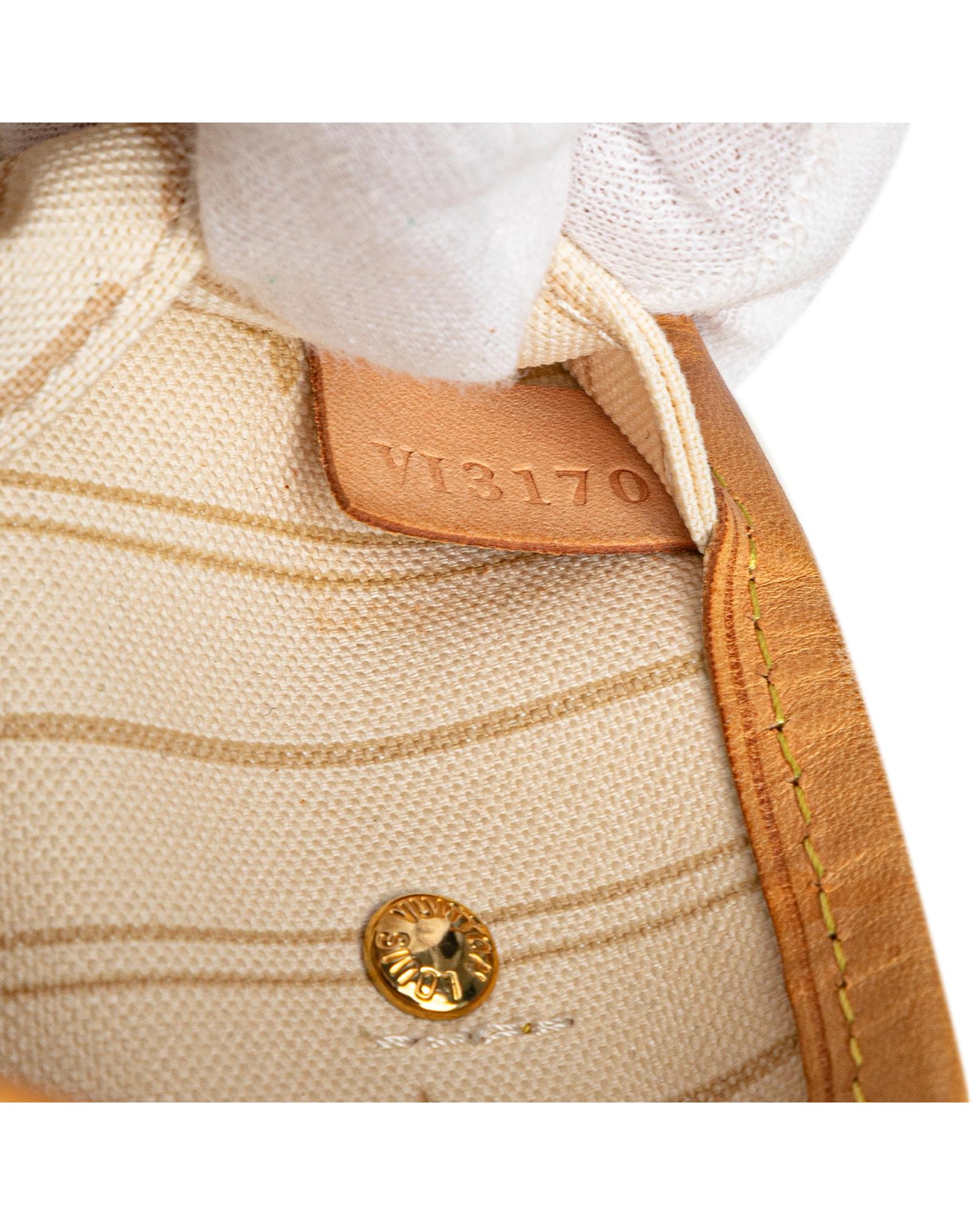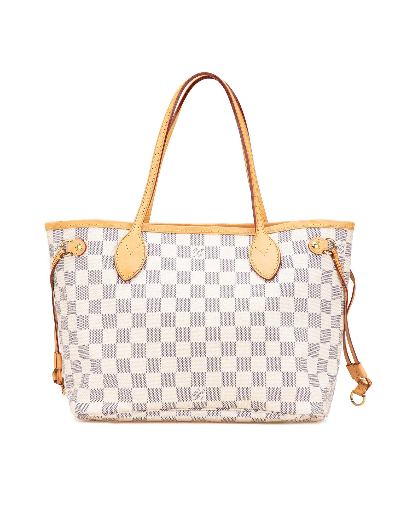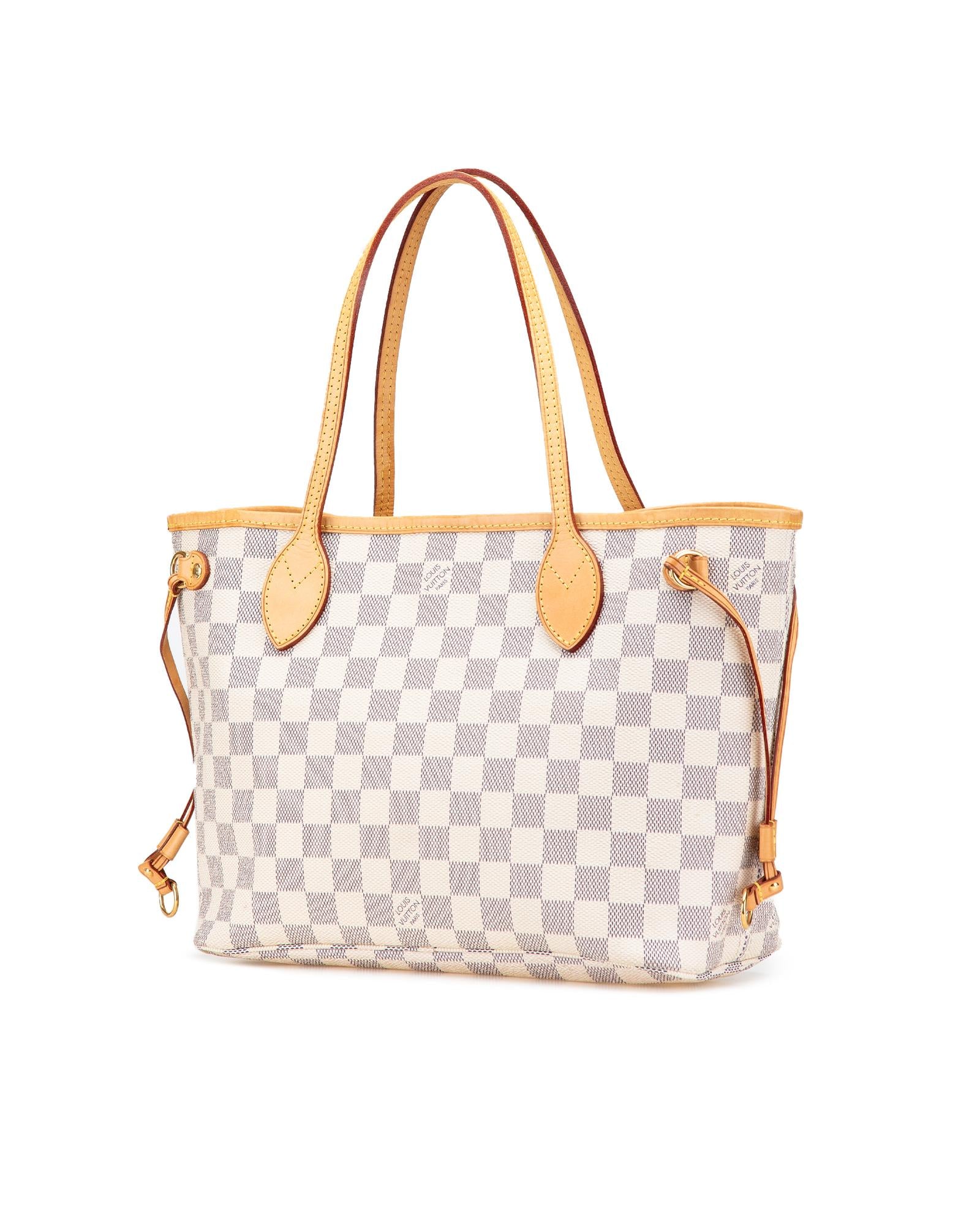 The Neverfull PM features a damier canvas body with vachetta leather trim flat vachetta leather straps an open top and an interior zip pocket.