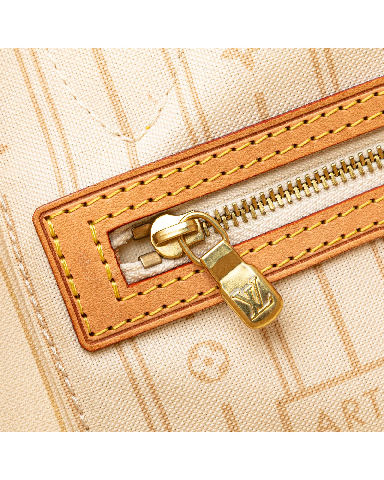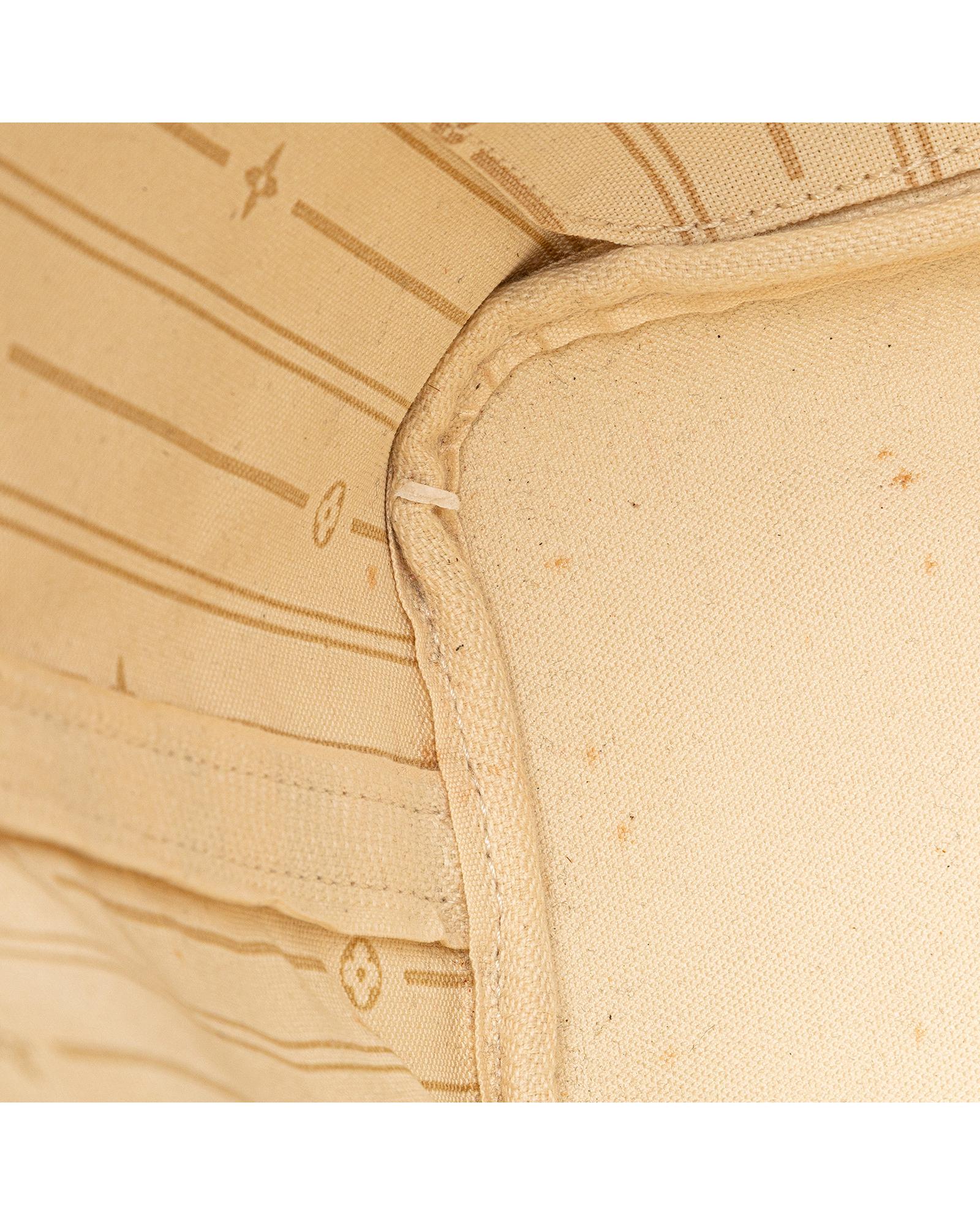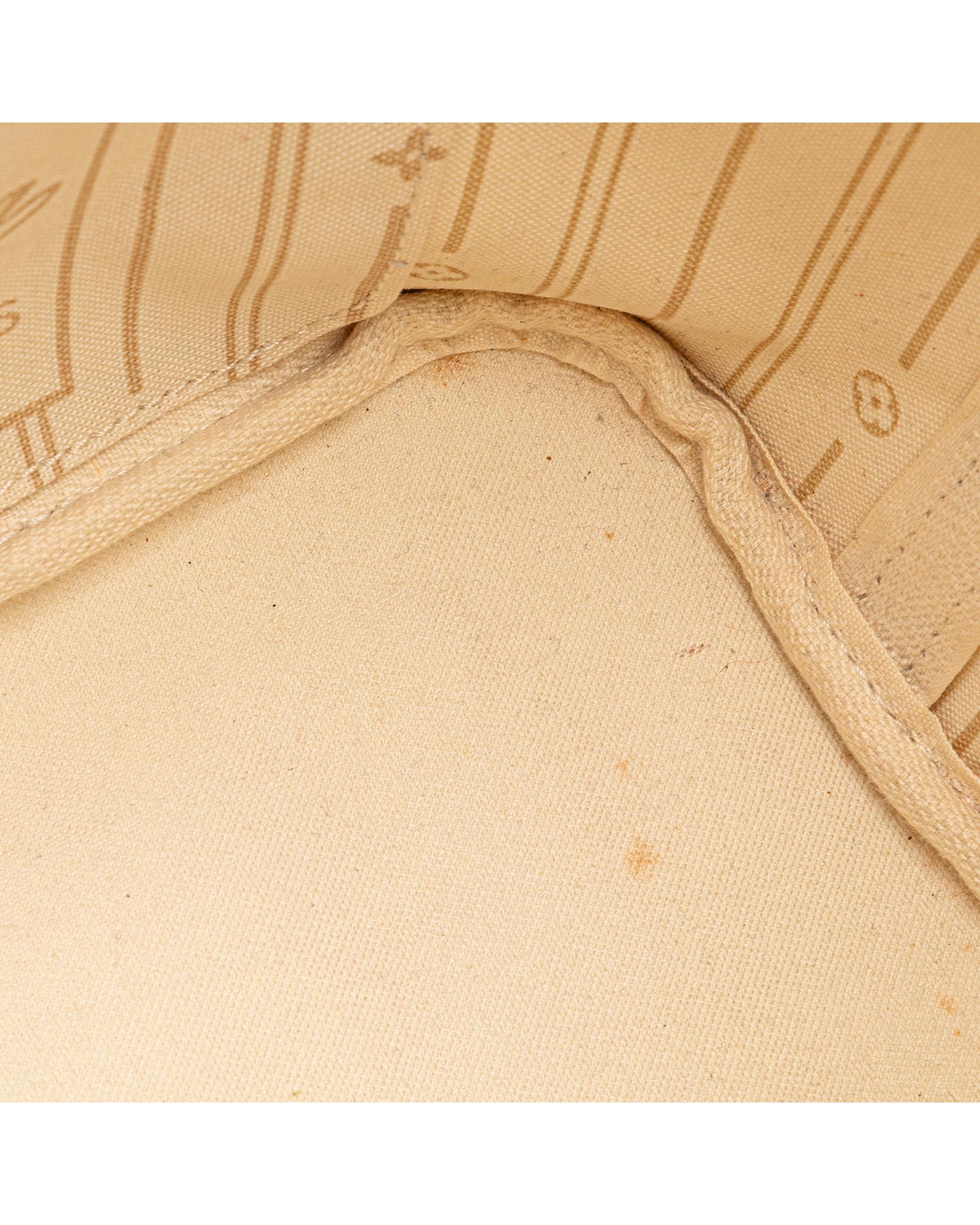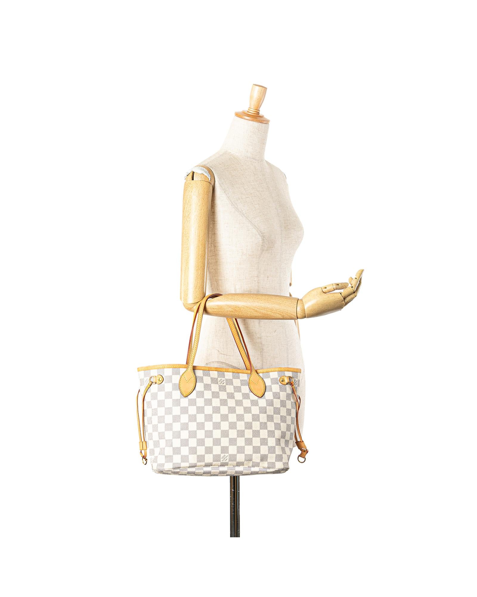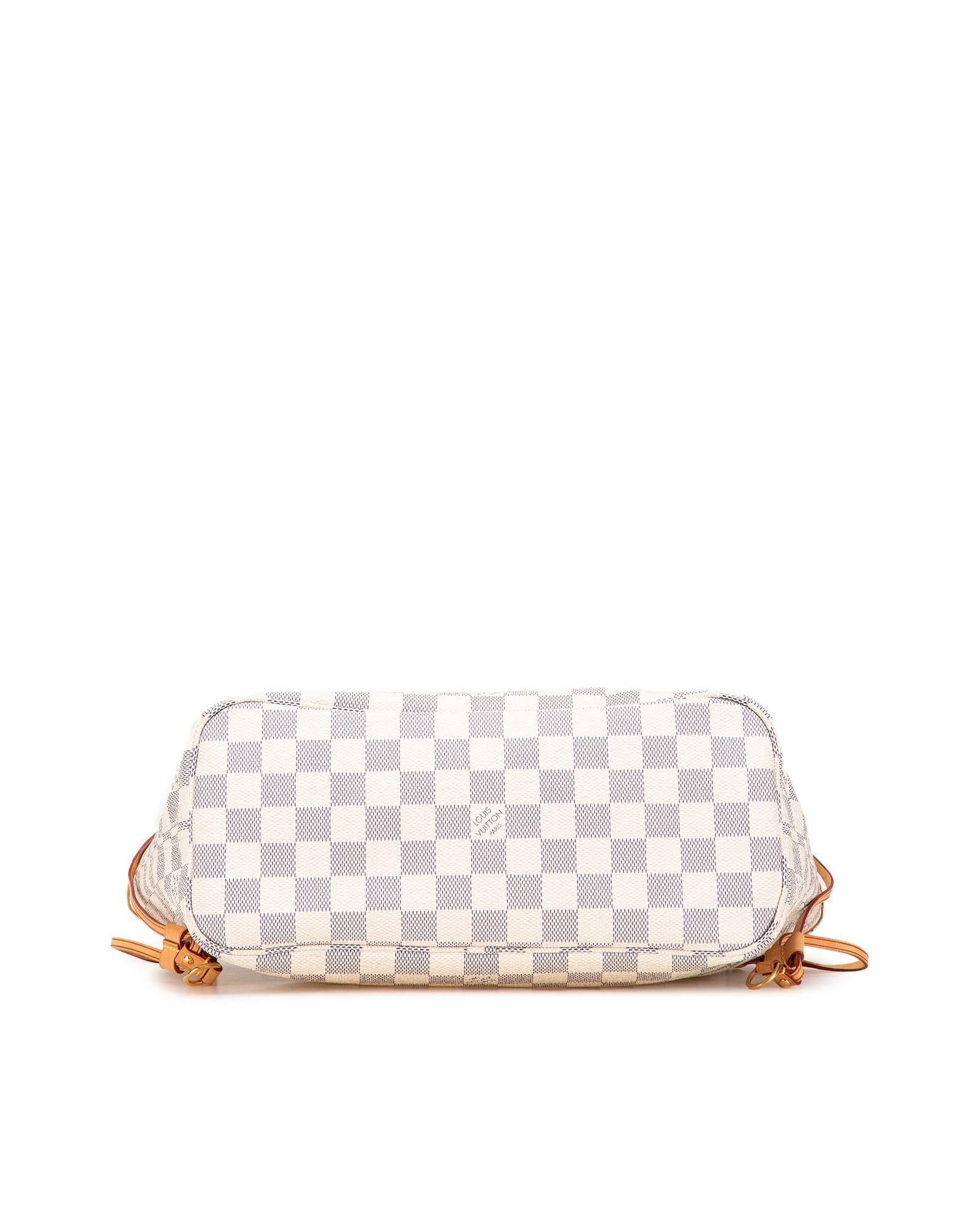 The Neverfull PM features a damier canvas body with vachetta leather trim flat vachetta leather straps an open top and an interior zip pocket.