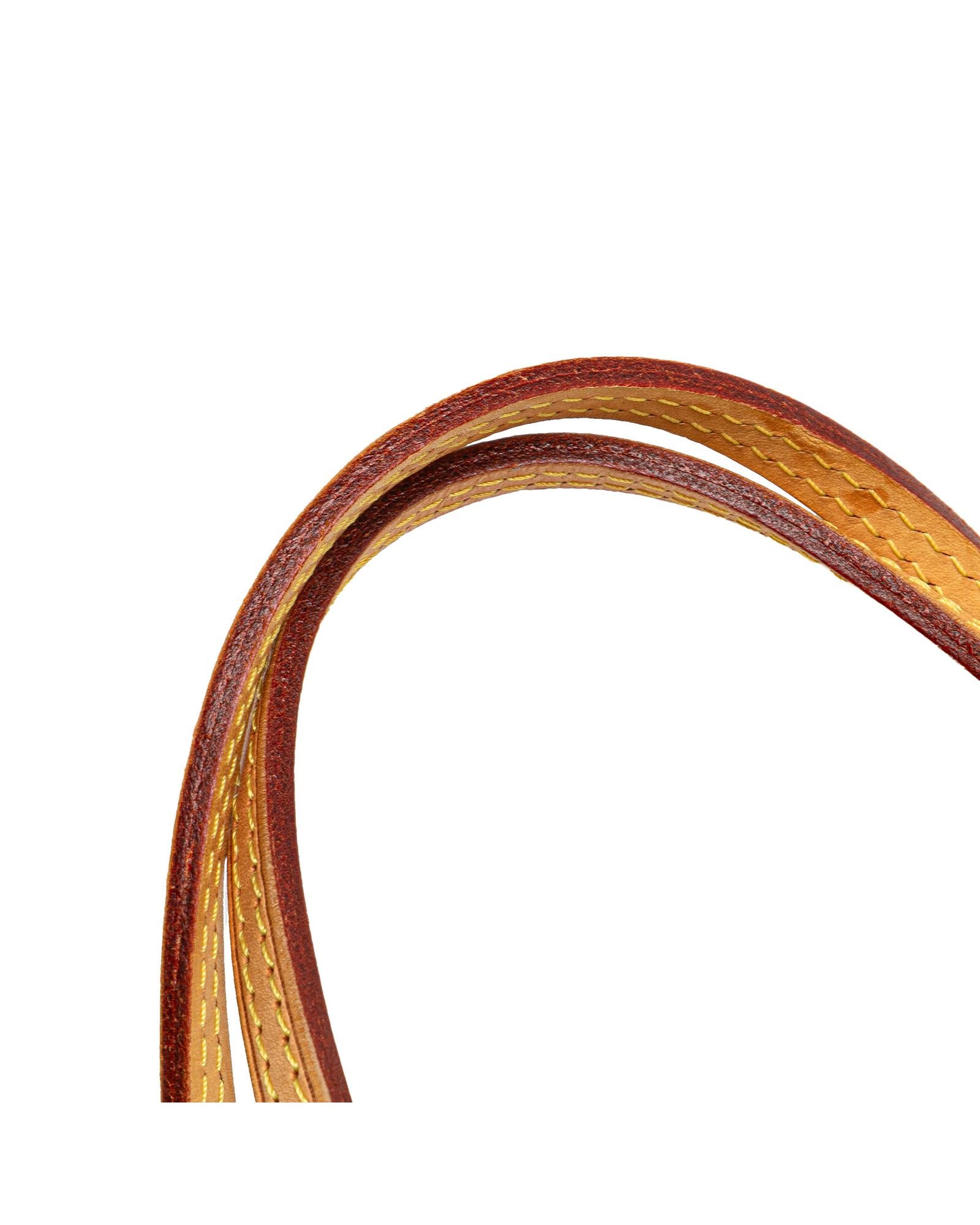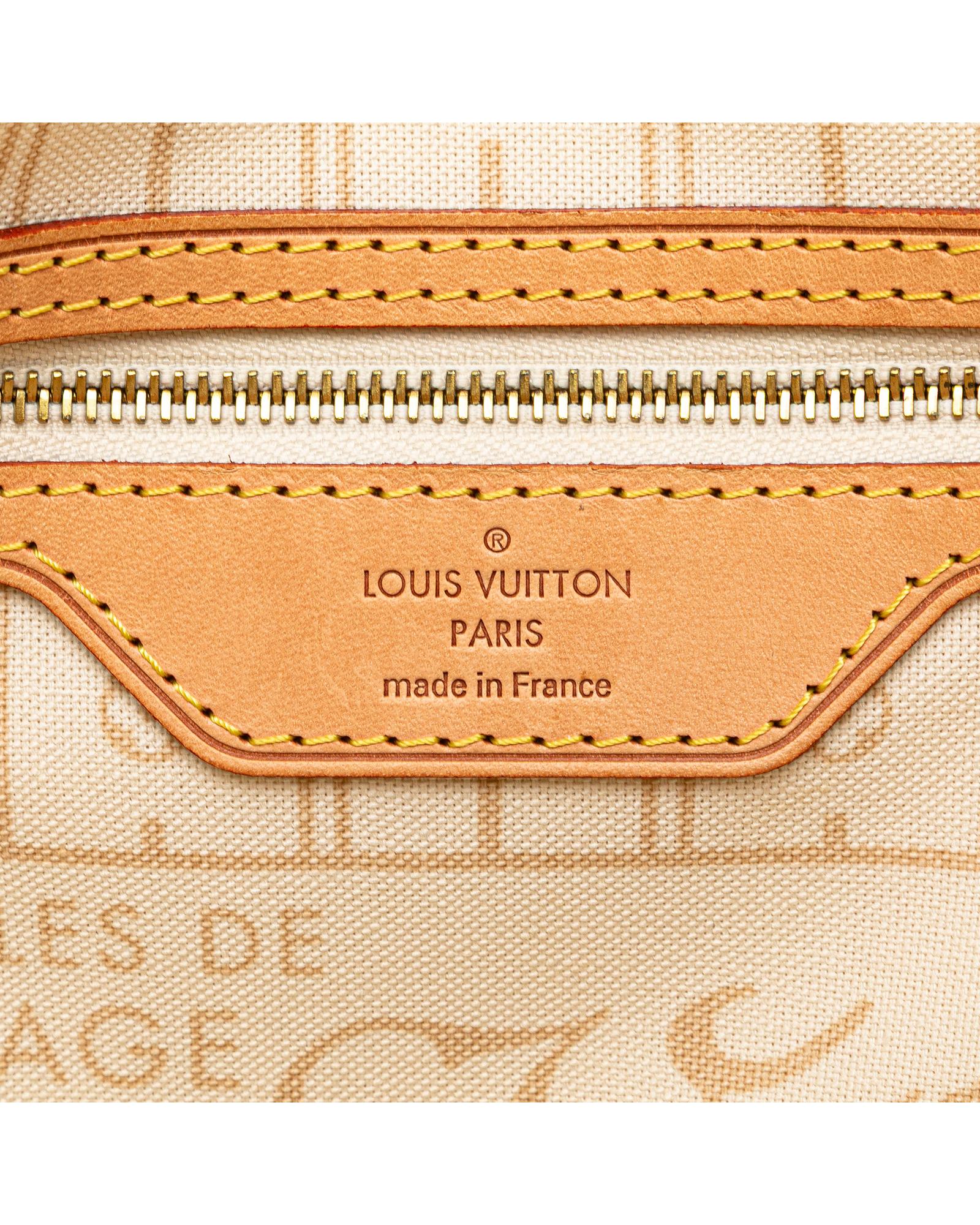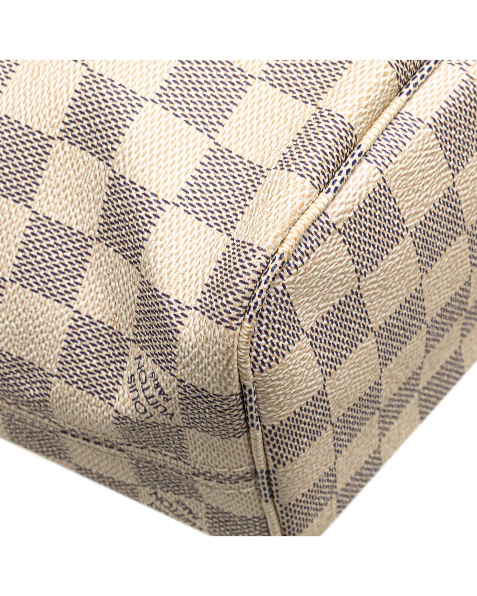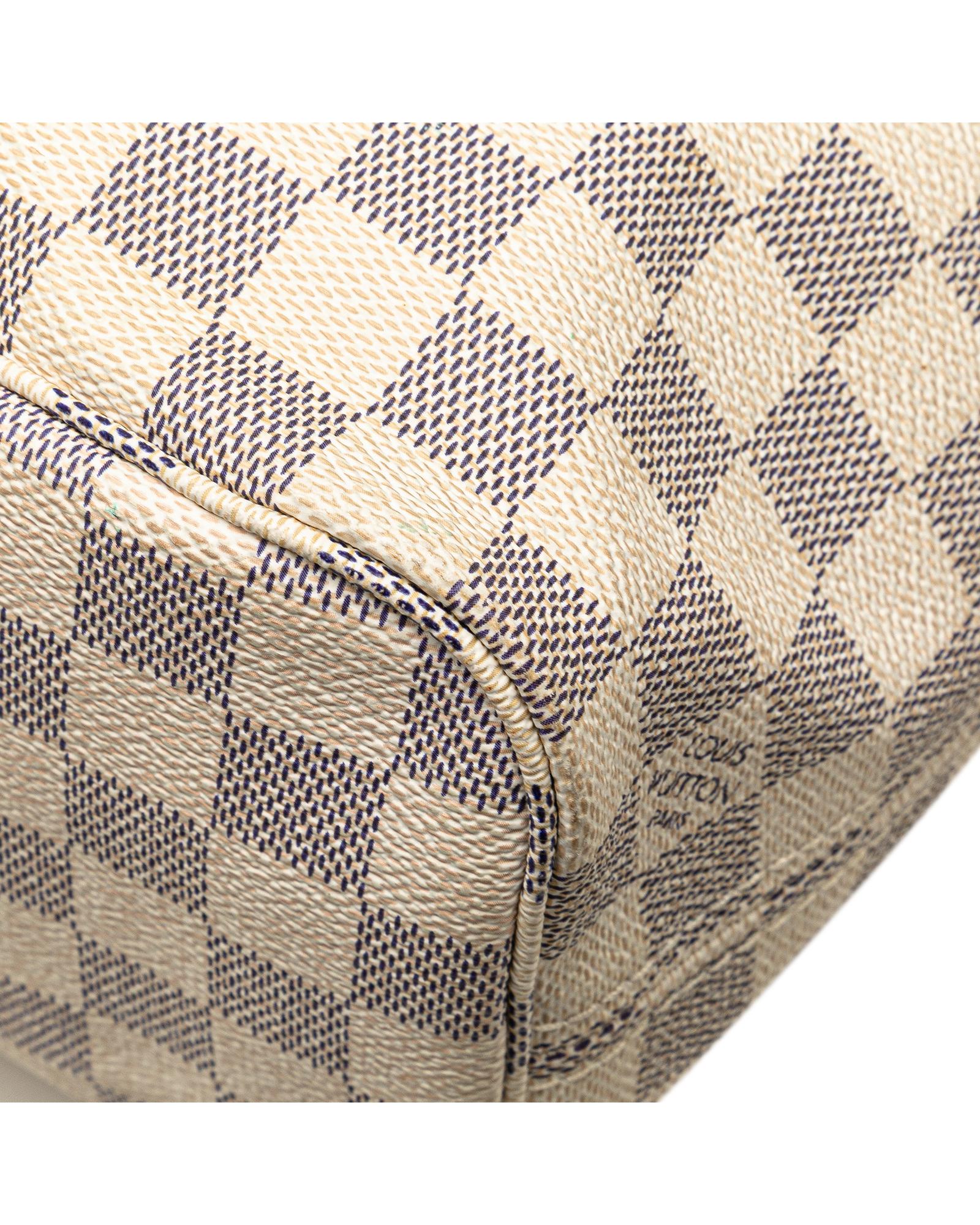 The Neverfull PM features a damier canvas body with vachetta leather trim flat vachetta leather straps an open top and an interior zip pocket.