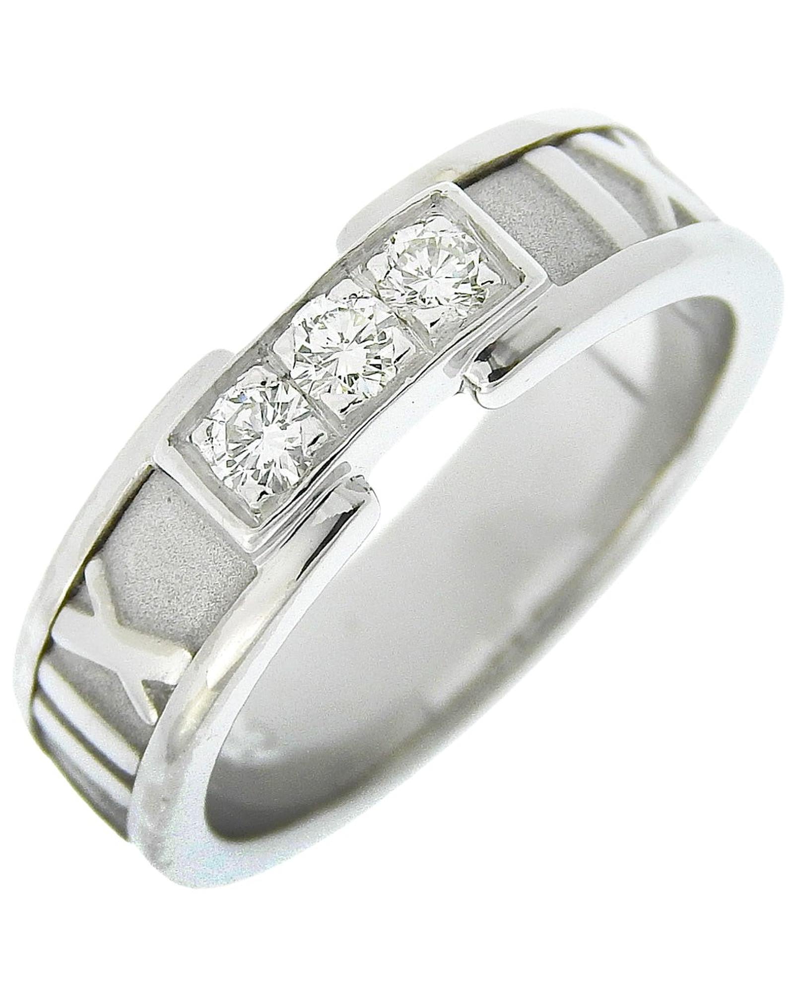 Brand: Tiffany & Co Model: Atlas Color: Silver Material: White Gold Inclusions: / Dimensions: [Weight] 7.3g Size 53 Ring width (minimum): 3.4mm Ring width (maximum): 5.4mm Ring inner diameter: 16.9mm Serial number: None Condition: AB - good condition. The Tiffany & Co. Atlas Ring crafted from K18 white gold adorned with sparkling diamonds elevates any ensemble with its elegant charm specifically designed for ladies. Despite a few minor scratches on its body the ring maintains its overall good condition adding a touch of sophistication to any wearer's style. We recommend that you look at all the pictures before making your purchase to ensure that you are satisfied with the condition of the item.