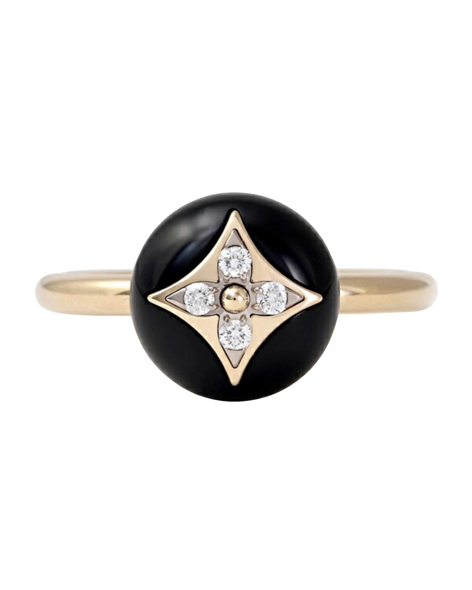This Color Blossom stacking ring is crafted in 18 karat white and yellow gold. The polished black onyx stone is set with an emblematic Monogram flower composed of four sparkling diamonds.