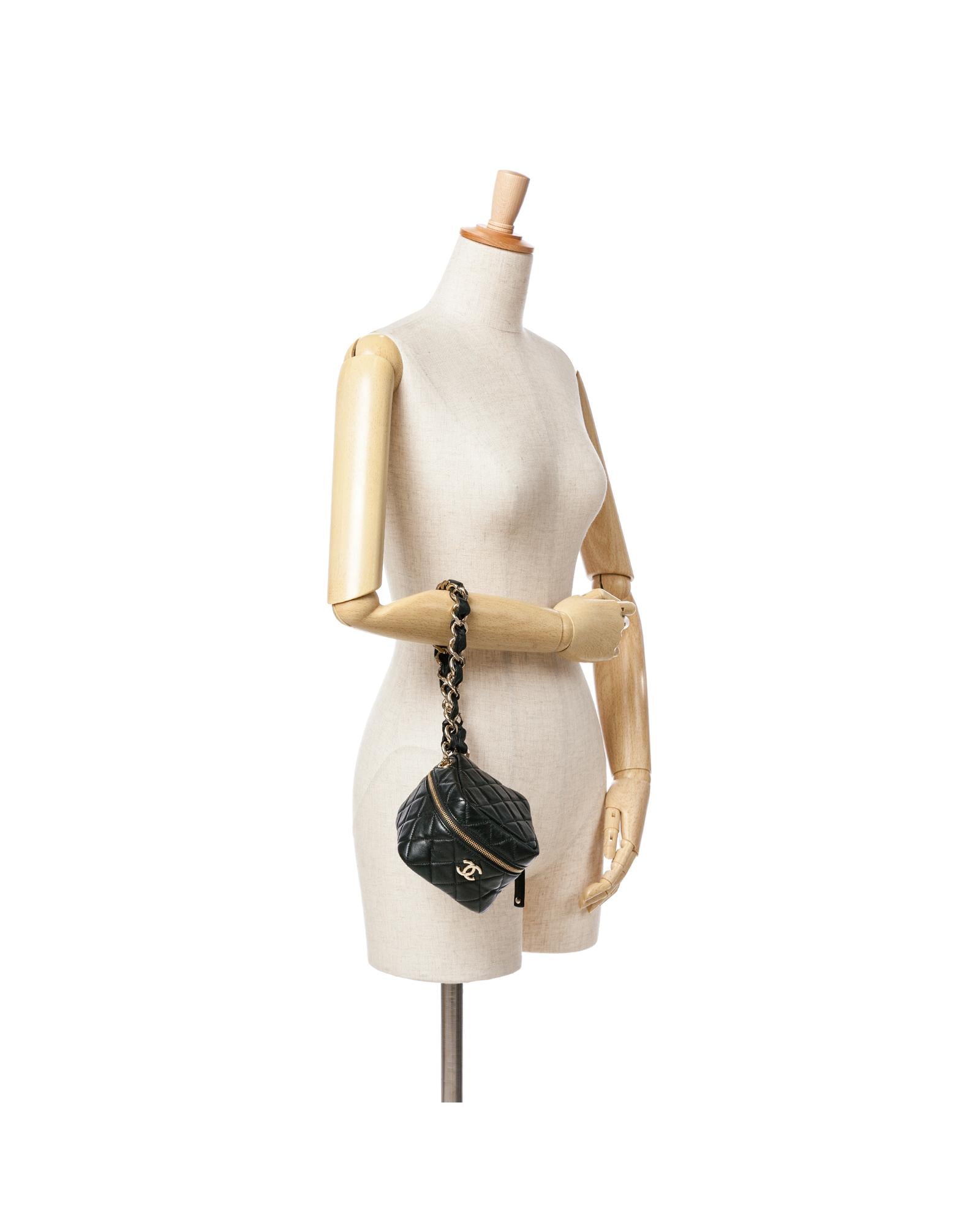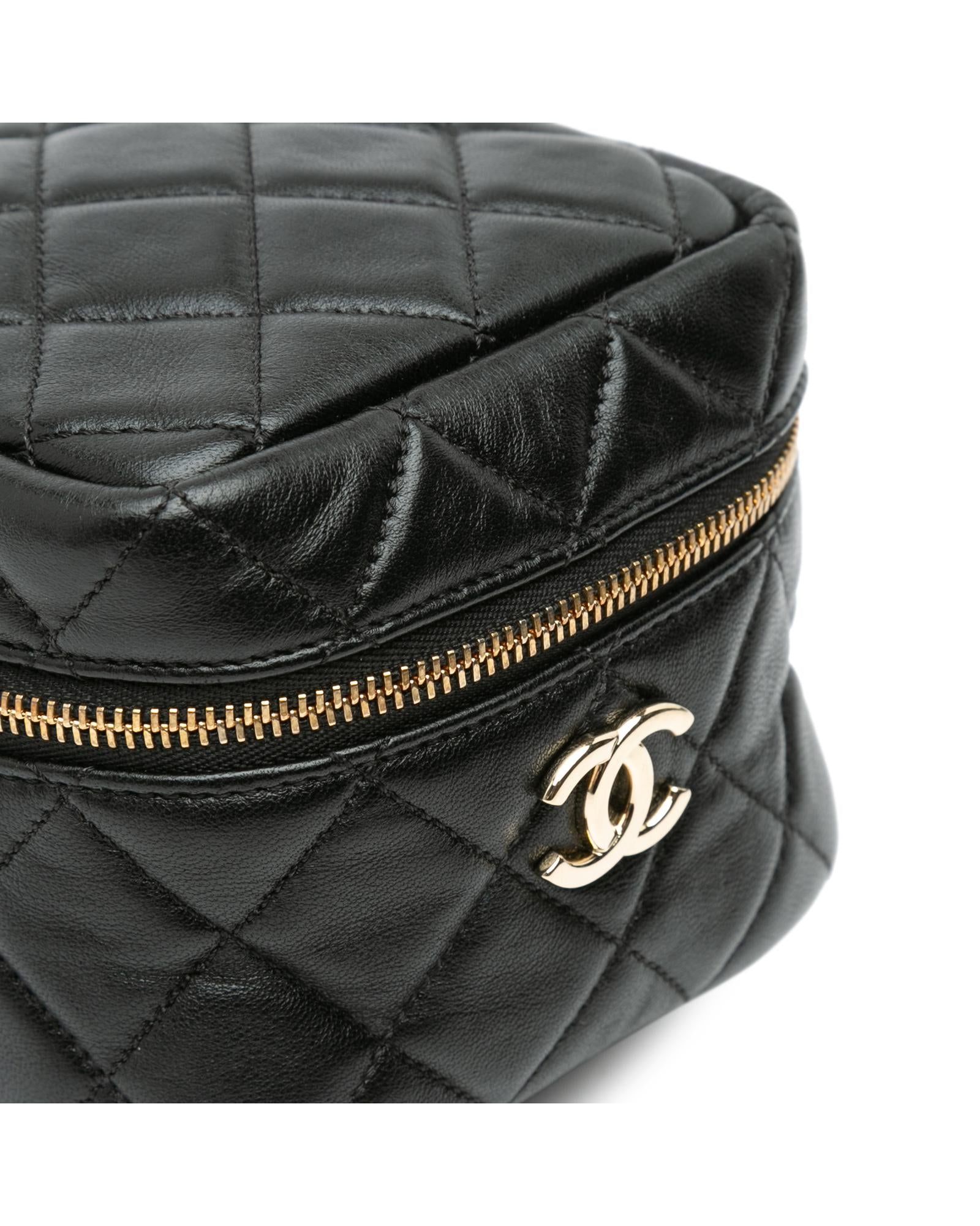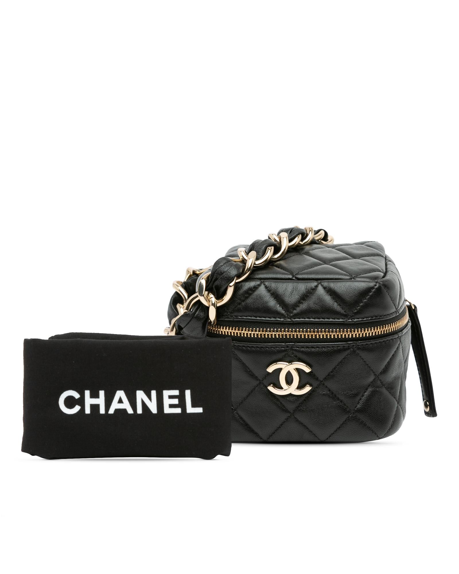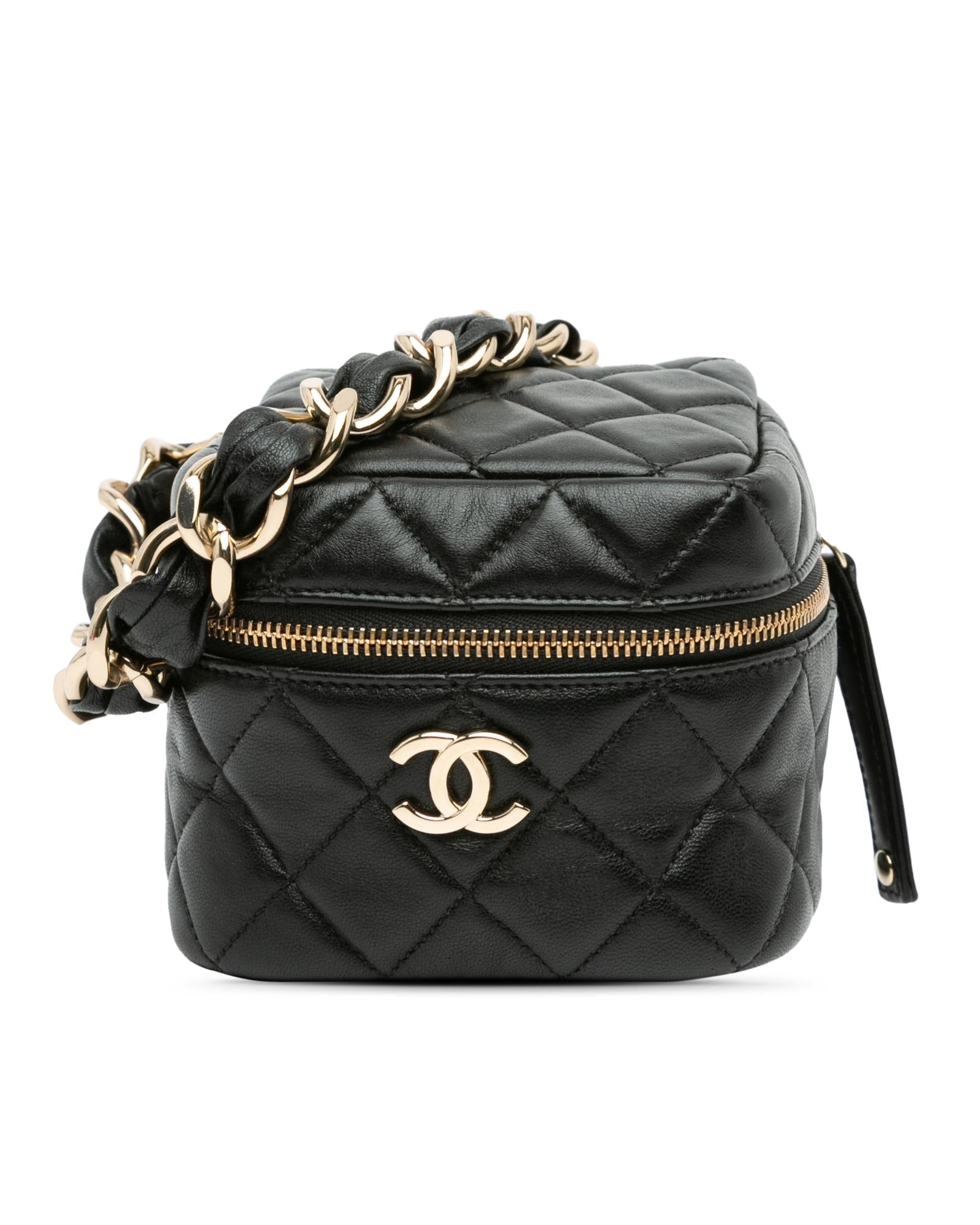 This vanity bag features a quilted lambskin leather body a leather woven chain strap and a zip-around closure.