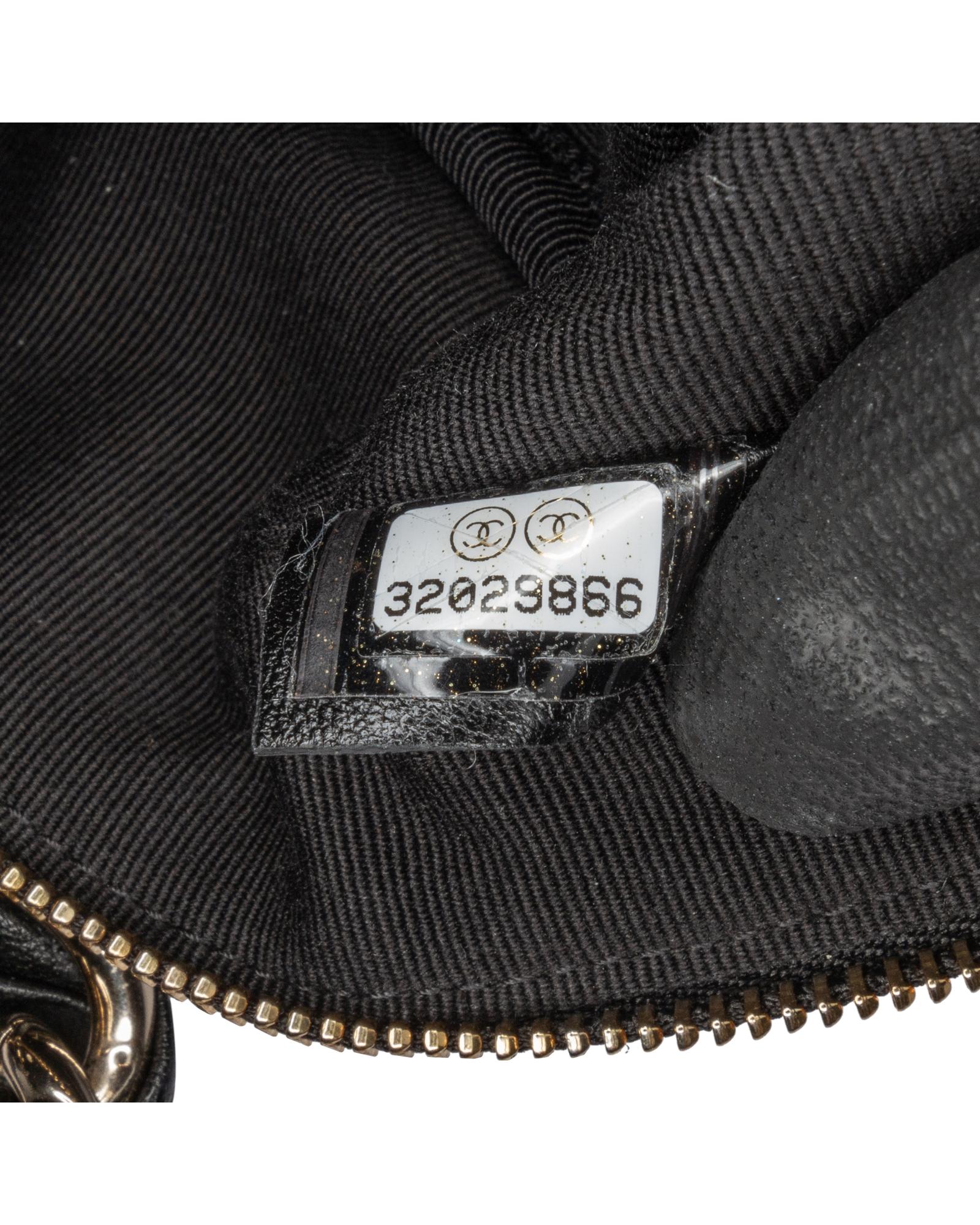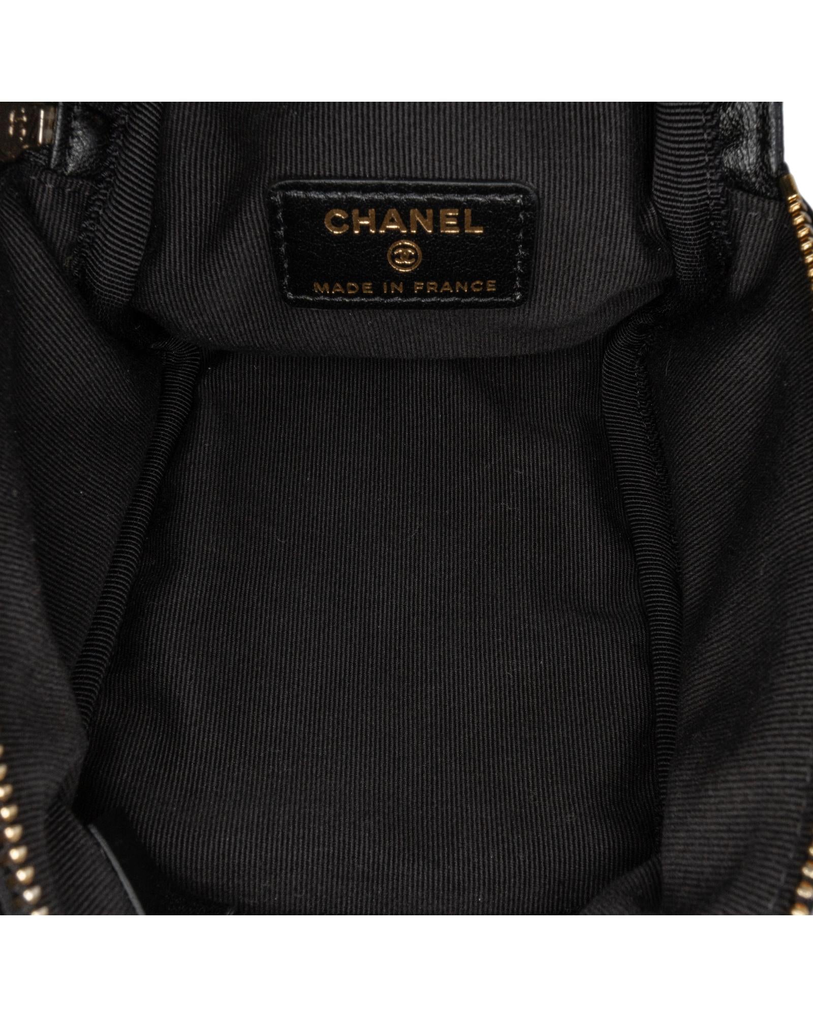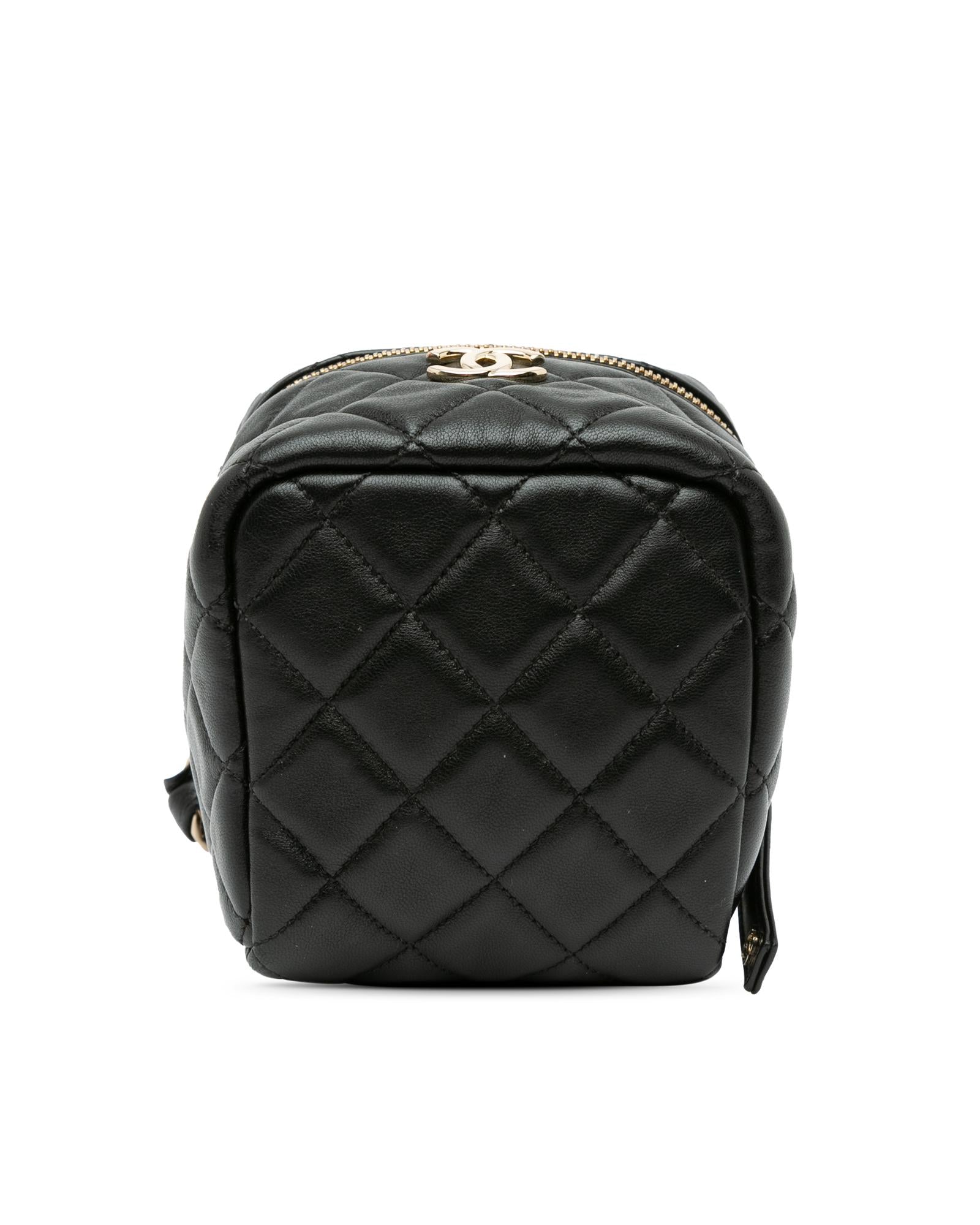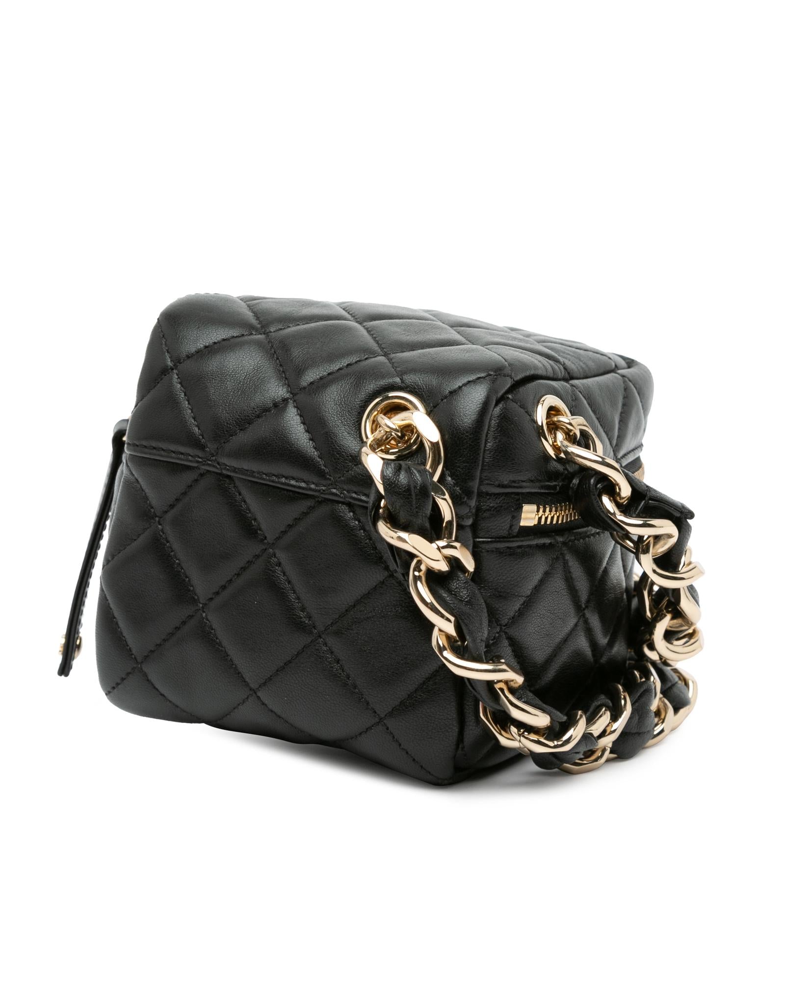 This vanity bag features a quilted lambskin leather body a leather woven chain strap and a zip-around closure.