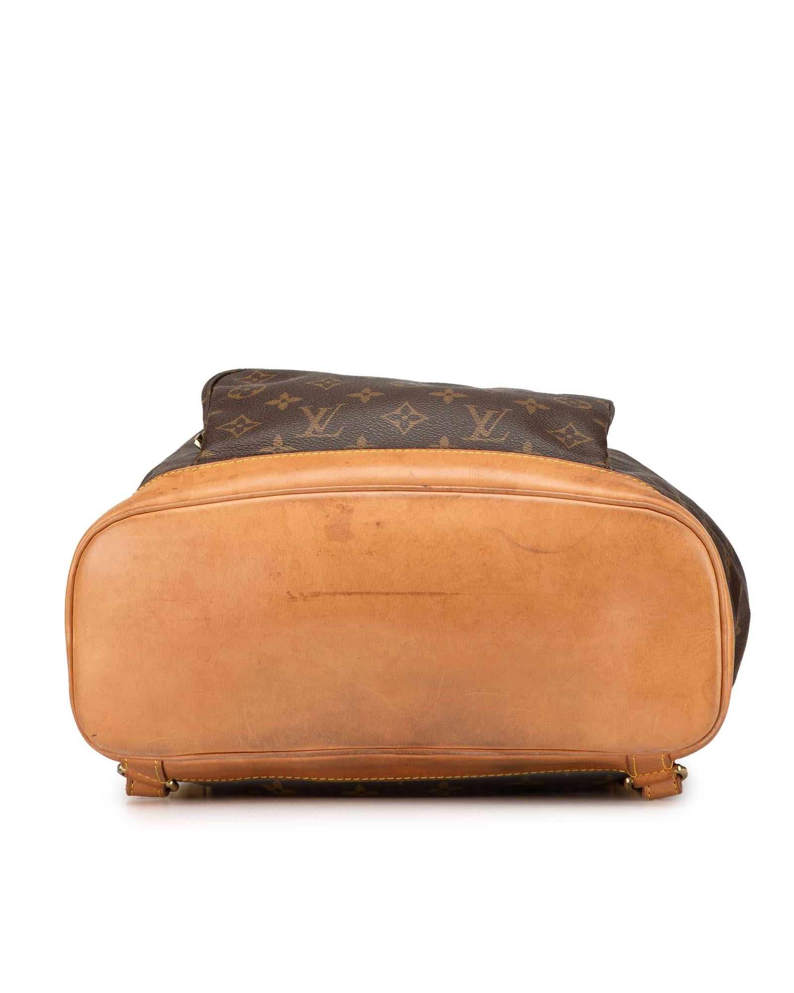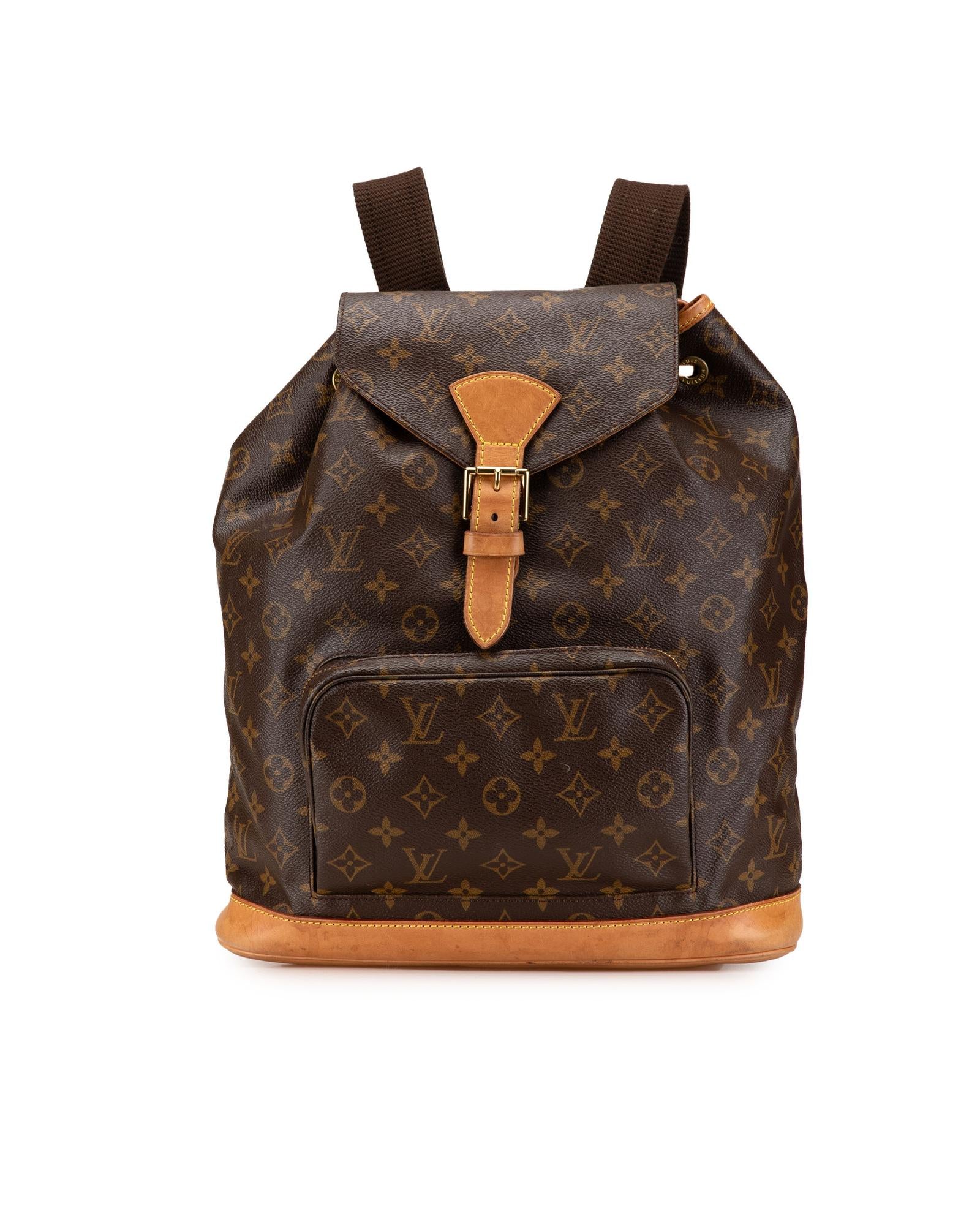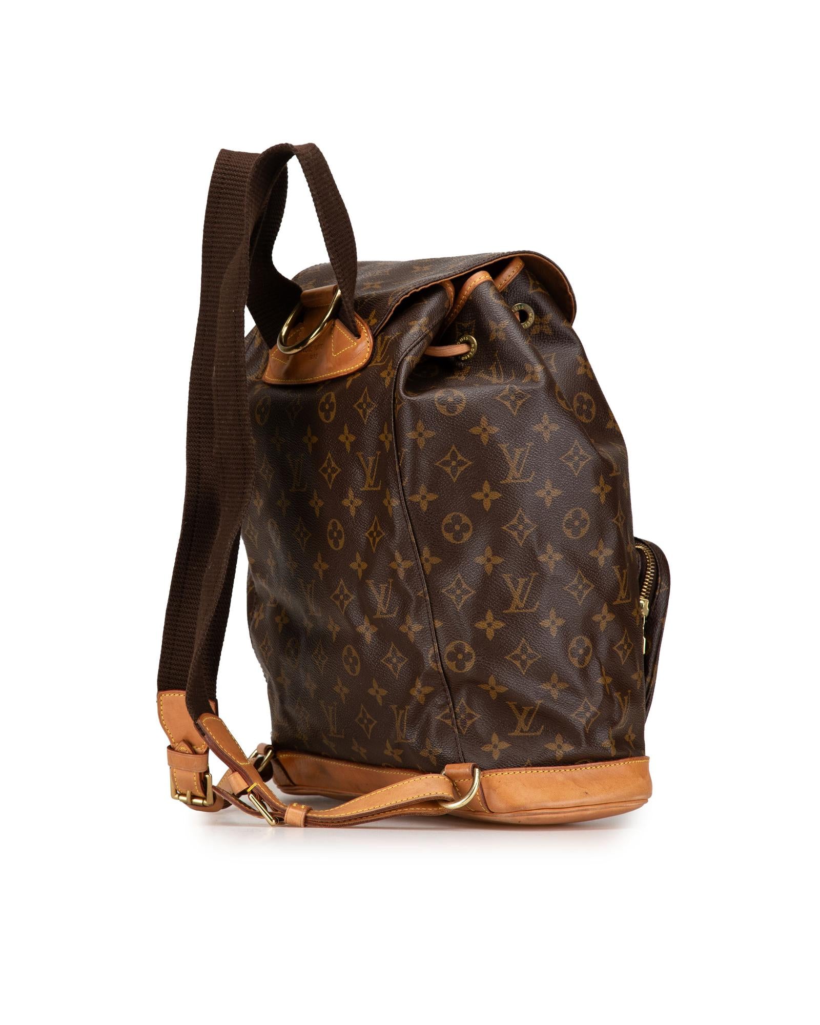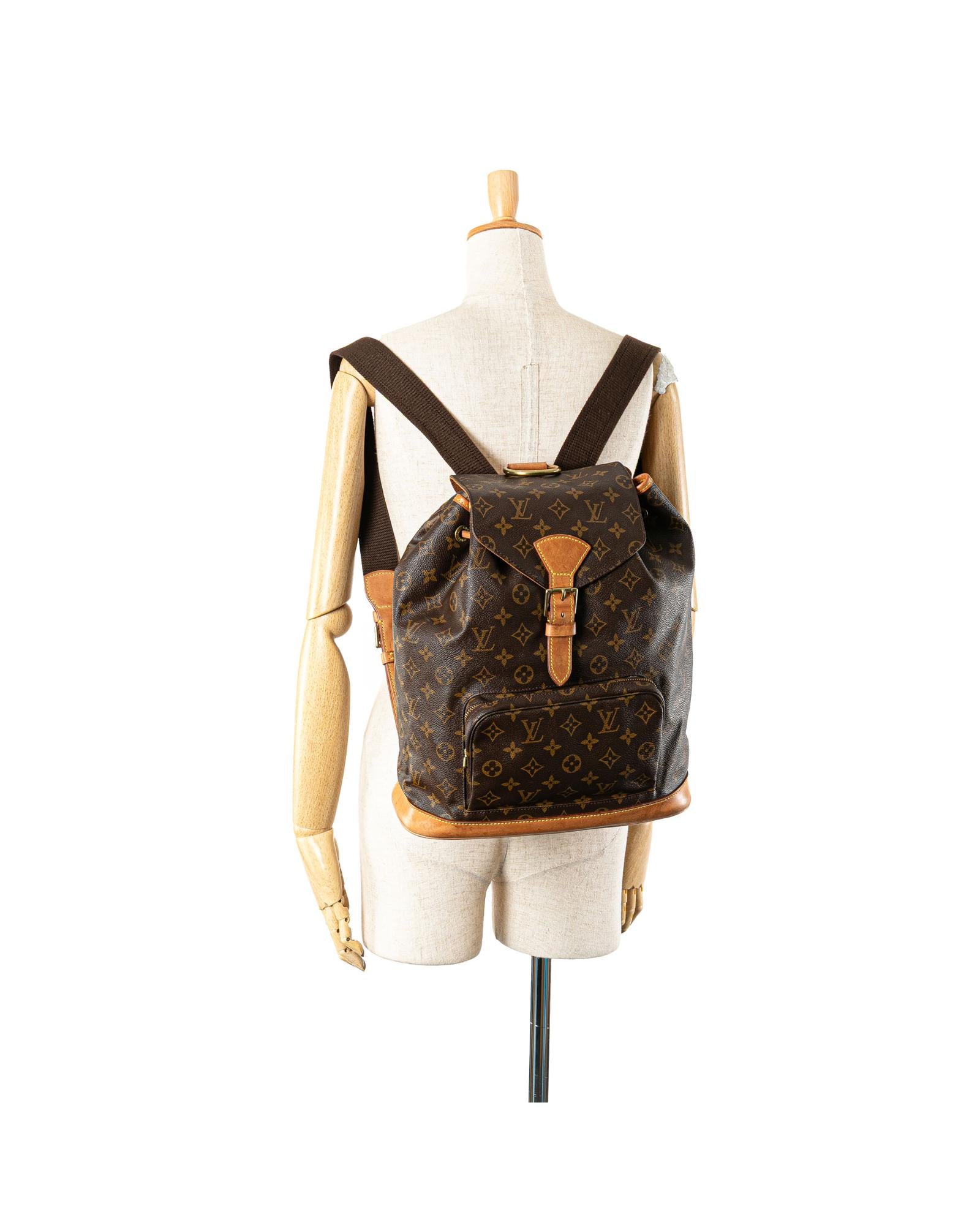 The Montsouris GM features a monogram canvas body with vachetta leather trim adjustable flat back straps a flap with belt buckle detail a top drawstring closure an exterior front zip pocket and an interior slip pocket.Brand: Louis Vuitton